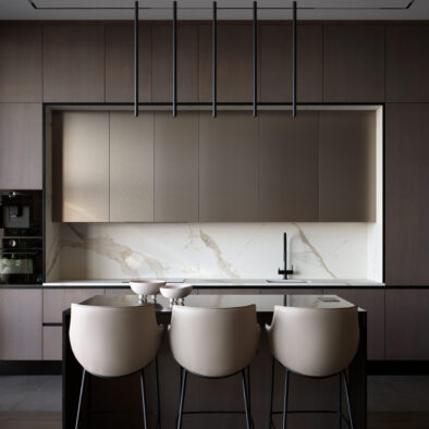 Особое внимание заслуживает профильная ручка, окрашенная в тон камня кухонного острова — она подчёркивает общий характер кухни и придаёт ей завершённый, дизайнерский вид. Такая деталь делает мебель не только эстетически привлекательной, но и удобной в использовании. Вся композиция выглядит дорого и сбалансированно: это кухня, где функциональность встречается с утончённым стилем, а каждый элемент продуман до мелочей, чтобы создать идеальное пространство для жизни и вдохновения.