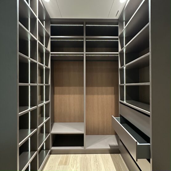 На фото крупная система хранения для наших заказчиков. Центральный остров на стадии монтажа. Верхняя часть покрыта стеклом, в ней размещены украшения и аксессуары. Отдельно стоящий остров – особенный вид удовольствия, который можно разместить в достаточно больших помещениях. В закрытых шкафах предусмотрены места для хранения верхней одежды, обуви, сумок и всех необходимых вещей.