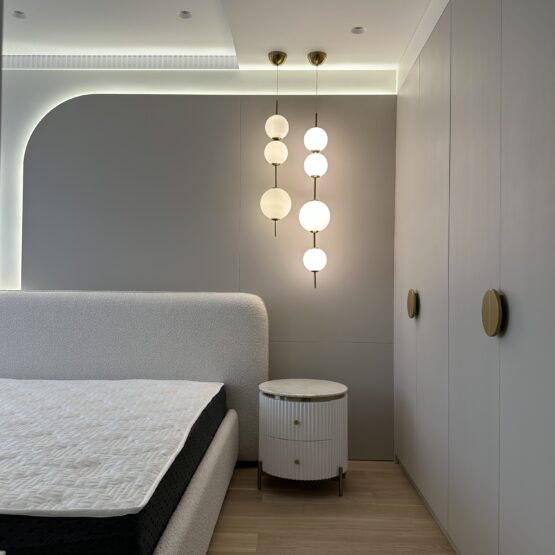Консоль – элегантный и компактный предмет интерьера. Она служит как туалетным столиком, так и элементом, связывающим стеновые панели. Мы подбирали оттенок шпона так, чтобы все элементы конструкции составляли единый гармоничный ансамбль.