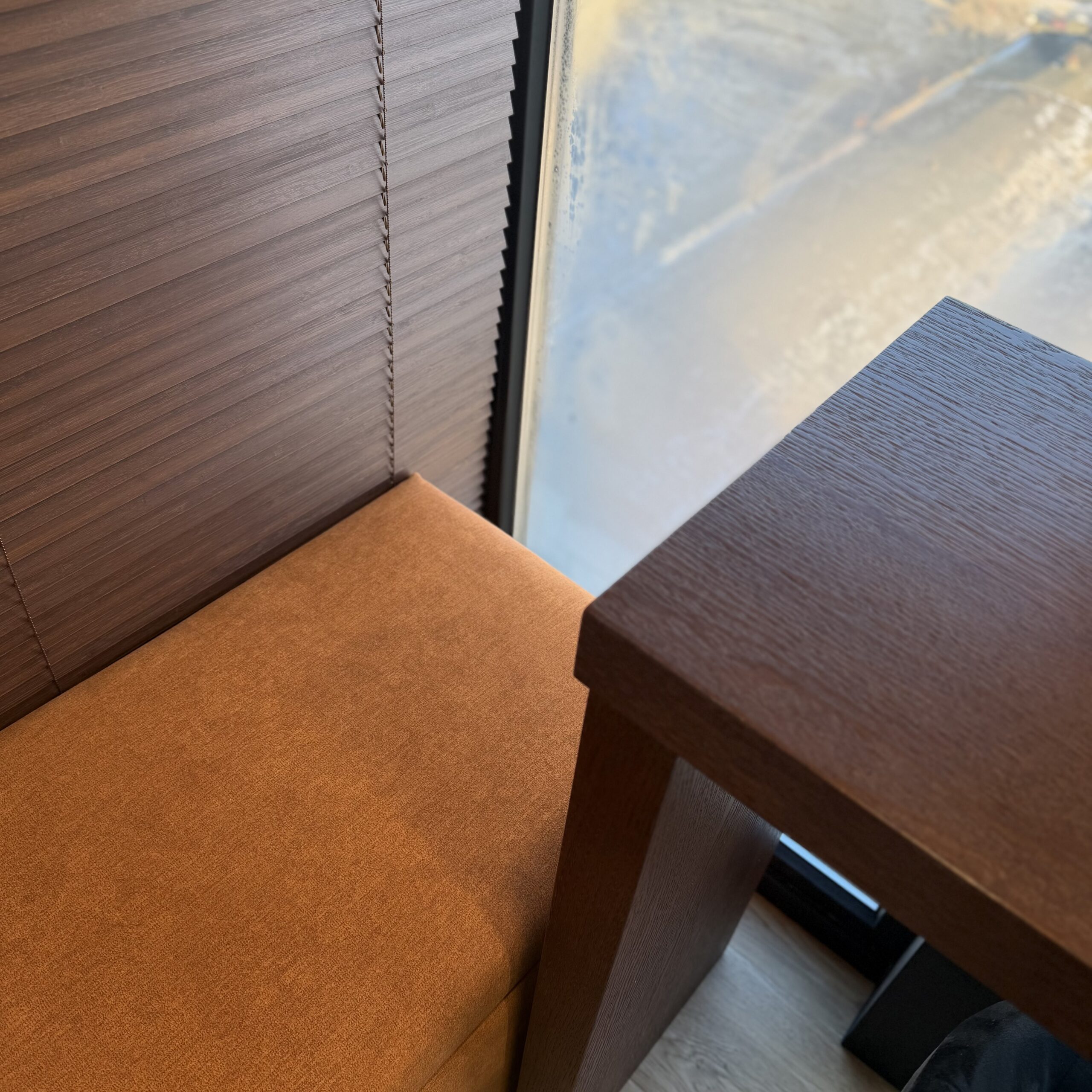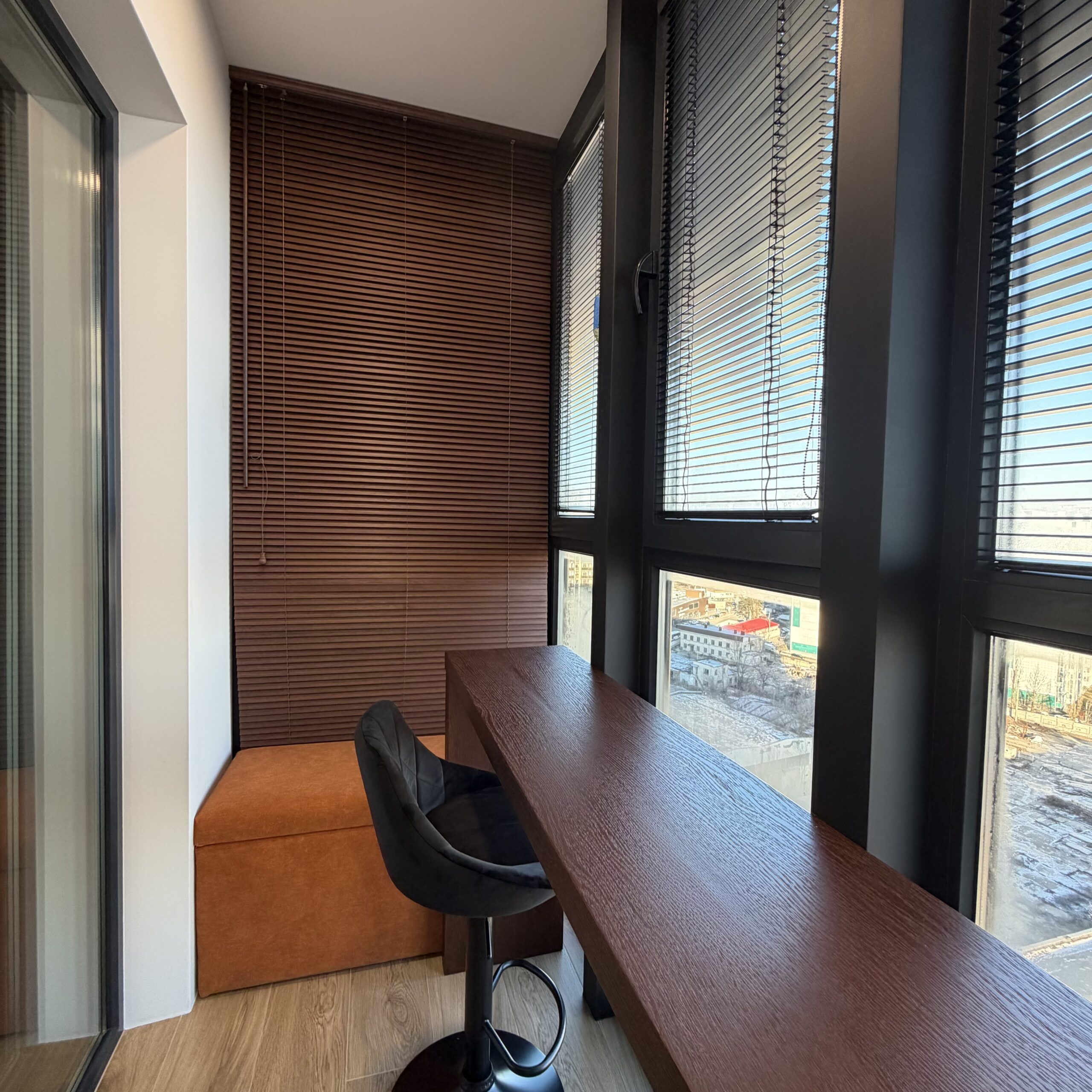 Компактное решение, которое превращает лоджию в полноценное место для отдыха. Барная стойка обшита шпоном дуба — тёплая текстура дерева добавляет глубину и делает пространство визуально дороже и спокойнее. Аккуратные стыки формируют цельный, собранный вид.