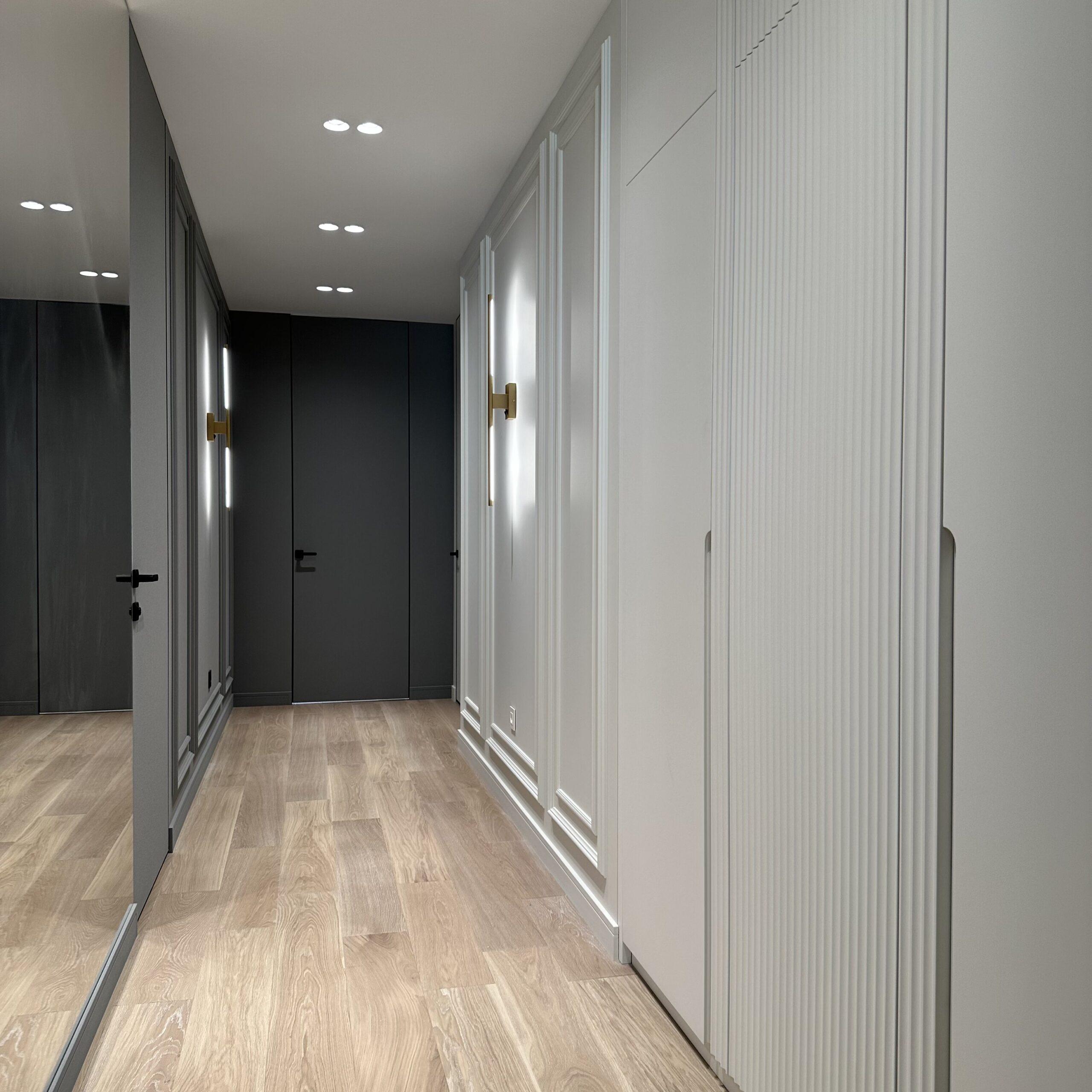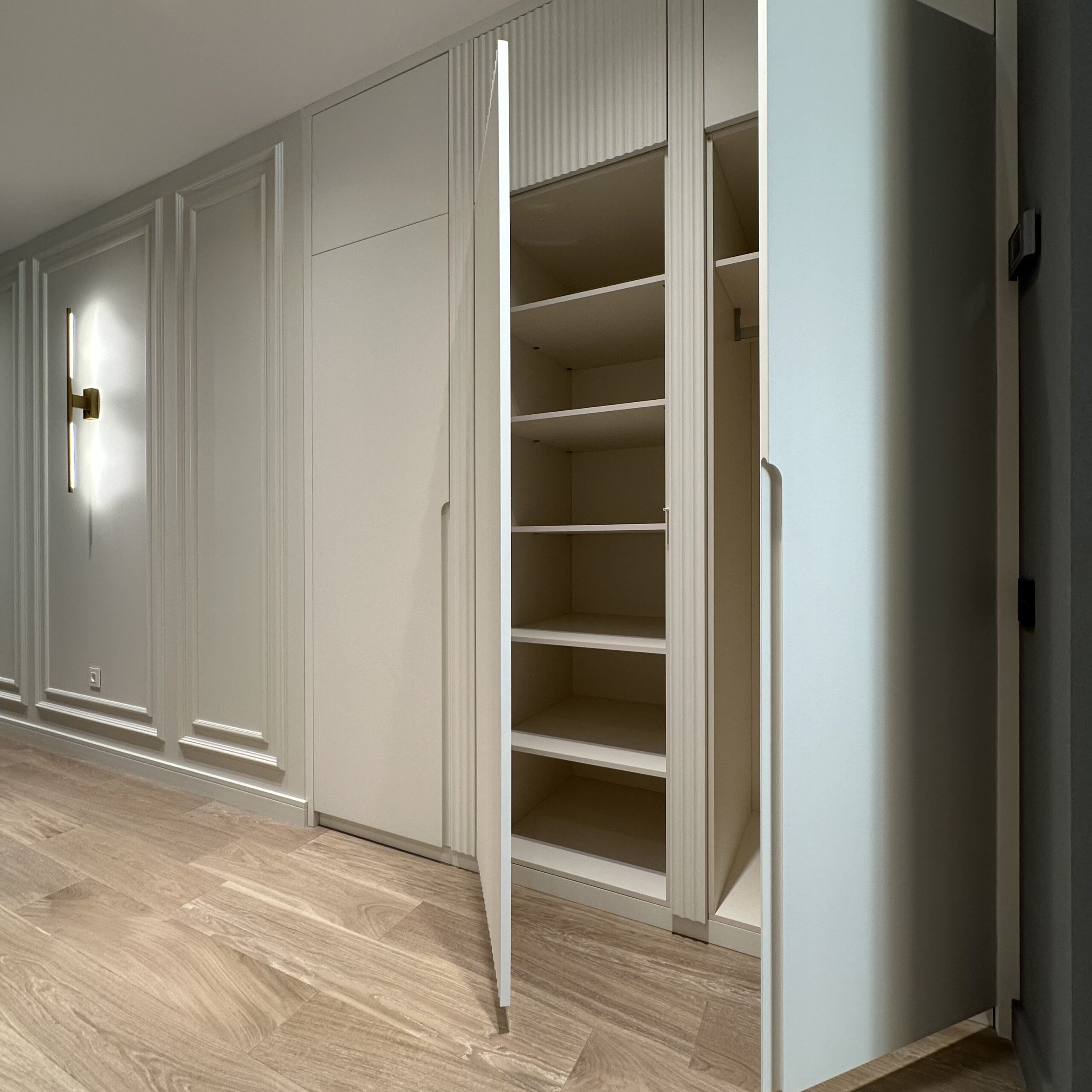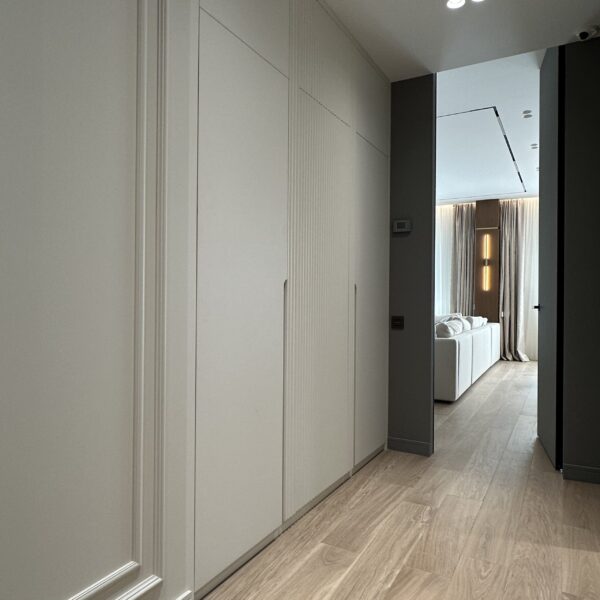 Встроенный шкаф современного дизайна, выполненный в тон стен, создаёт эффект невесомости и визуально растворяется в пространстве, сохраняя целостность интерьера. Тонкая фрезеровка фасадов и элегантные интегрированные ручки подчёркивают внимание к деталям и создают атмосферу премиального комфорта. Минималистичное исполнение без выступающих элементов не только обеспечивает безопасность, но и усиливает впечатление роскоши и безупречного качества. Продуманная до мелочей конструкция сочетает функциональность с визуальной лёгкостью, превращая шкаф в центральный элемент интерьера.