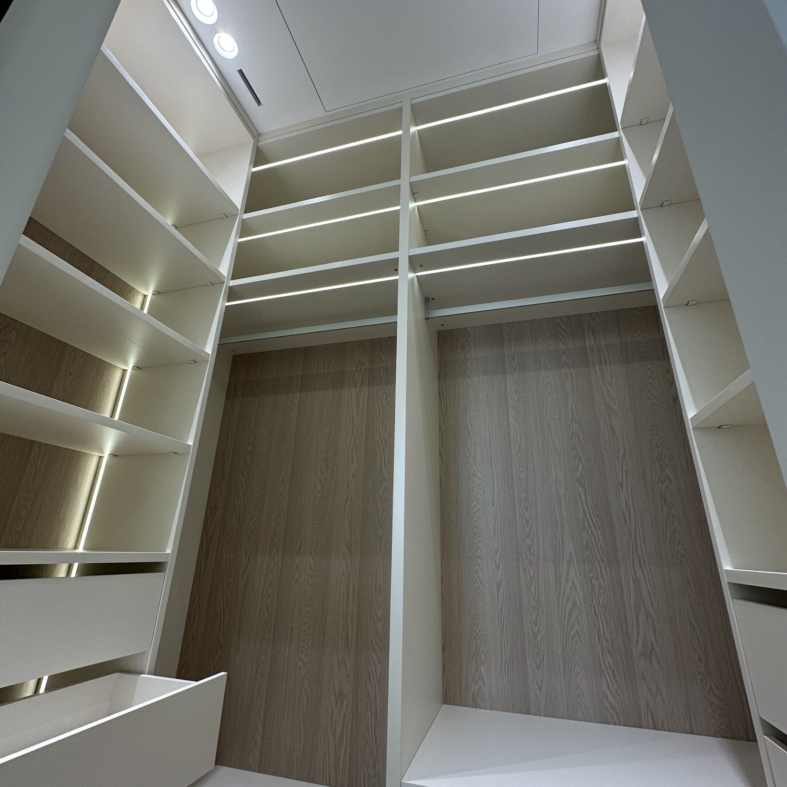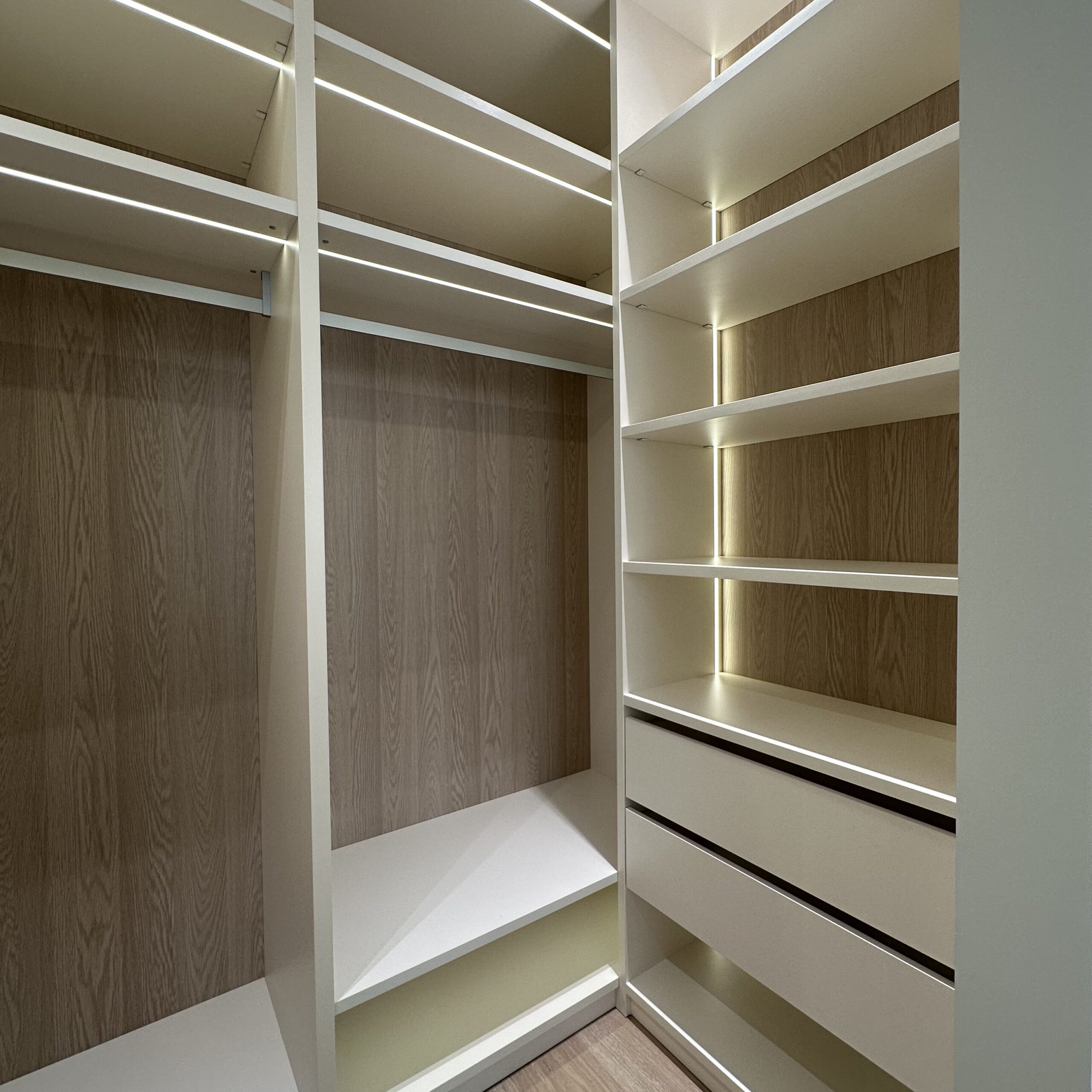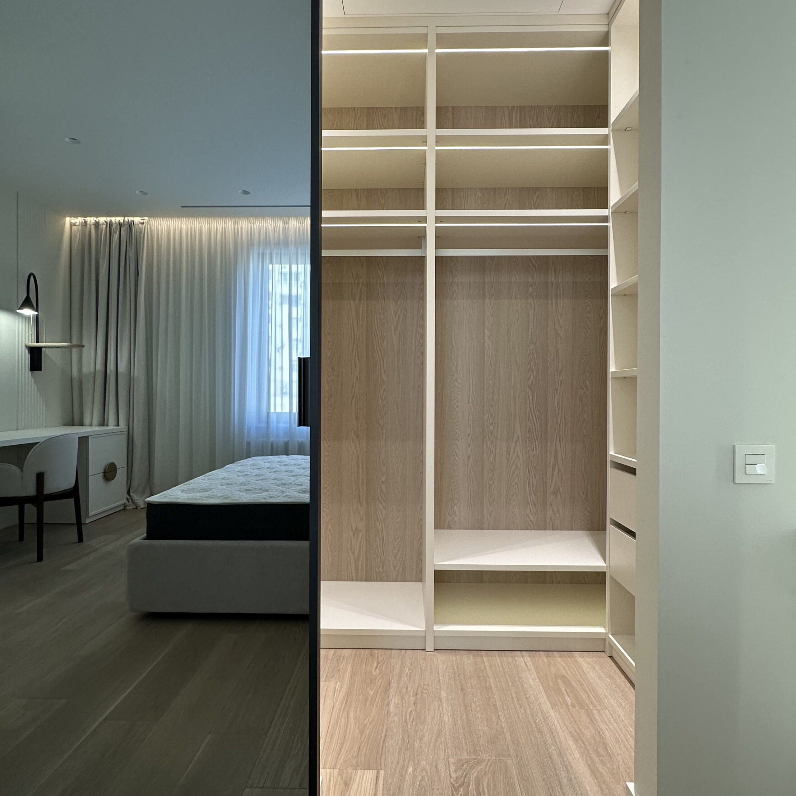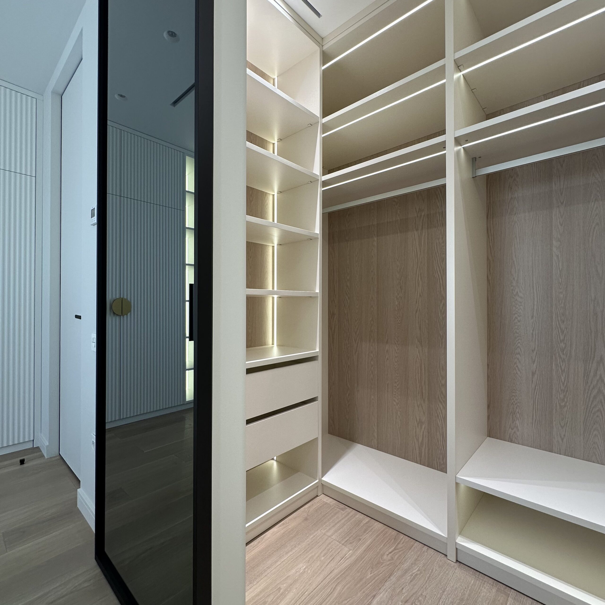 Гардеробная система с текстурой натурального дерева создаёт в детской тёплую и уютную атмосферу. Светлые фасады в тон стен визуально расширяют пространство, а мягкая встроенная подсветка делает интерьер особенно комфортным. Продуманная модульная конструкция включает вместительные полки с ограничителями, выдвижные ящики, отделения для сезонных вещей.