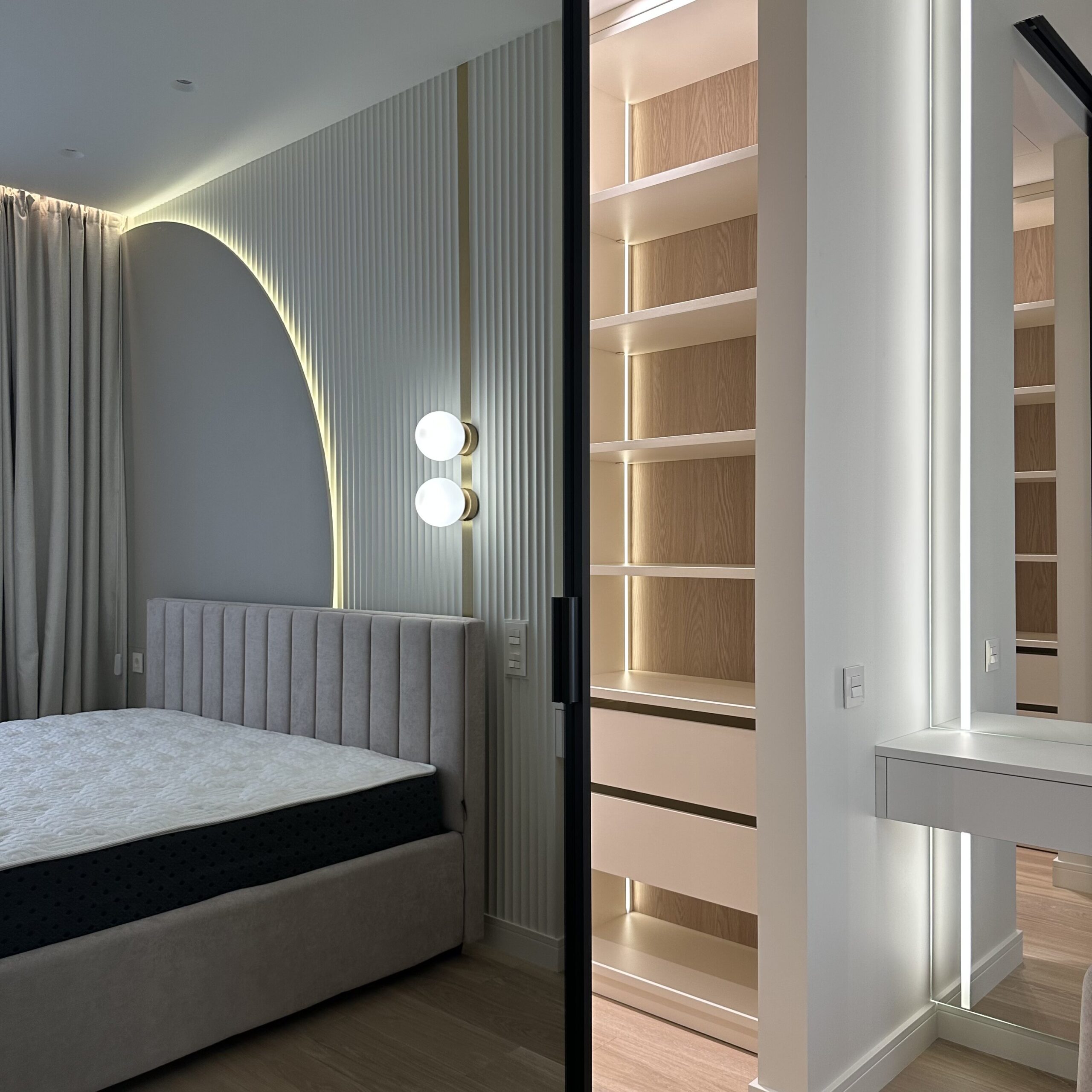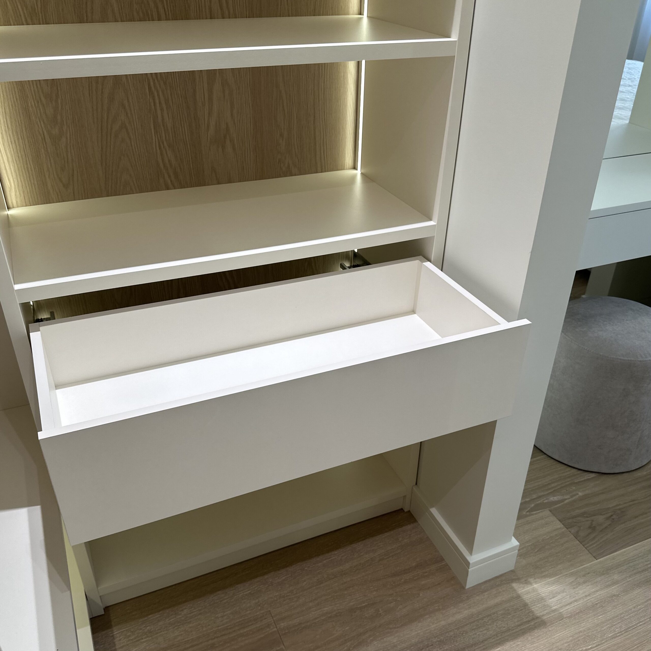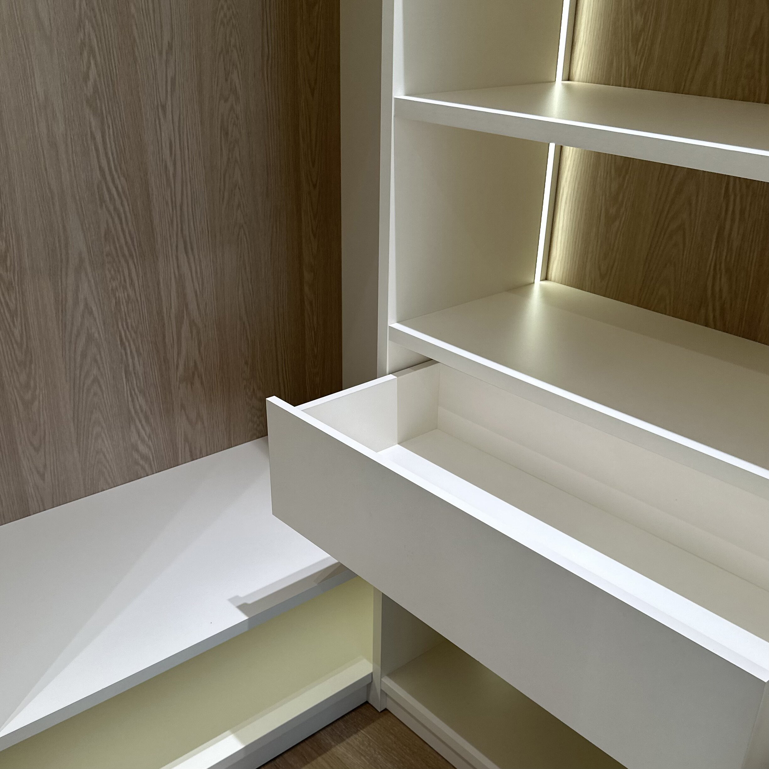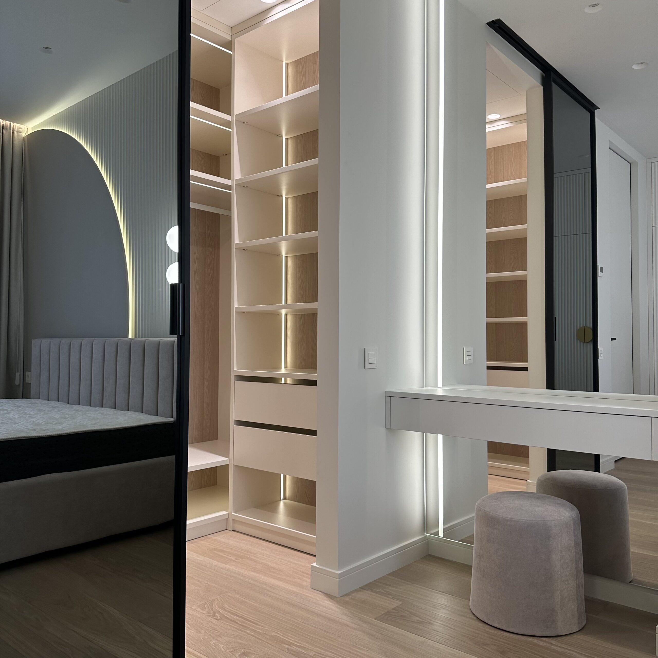 Гардеробная система с текстурой натурального дерева создаёт в детской тёплую и уютную атмосферу. Светлые фасады в тон стен визуально расширяют пространство, а мягкая встроенная подсветка делает интерьер особенно комфортным. Продуманная модульная конструкция включает вместительные полки с ограничителями, выдвижные ящики, отделения для сезонных вещей.