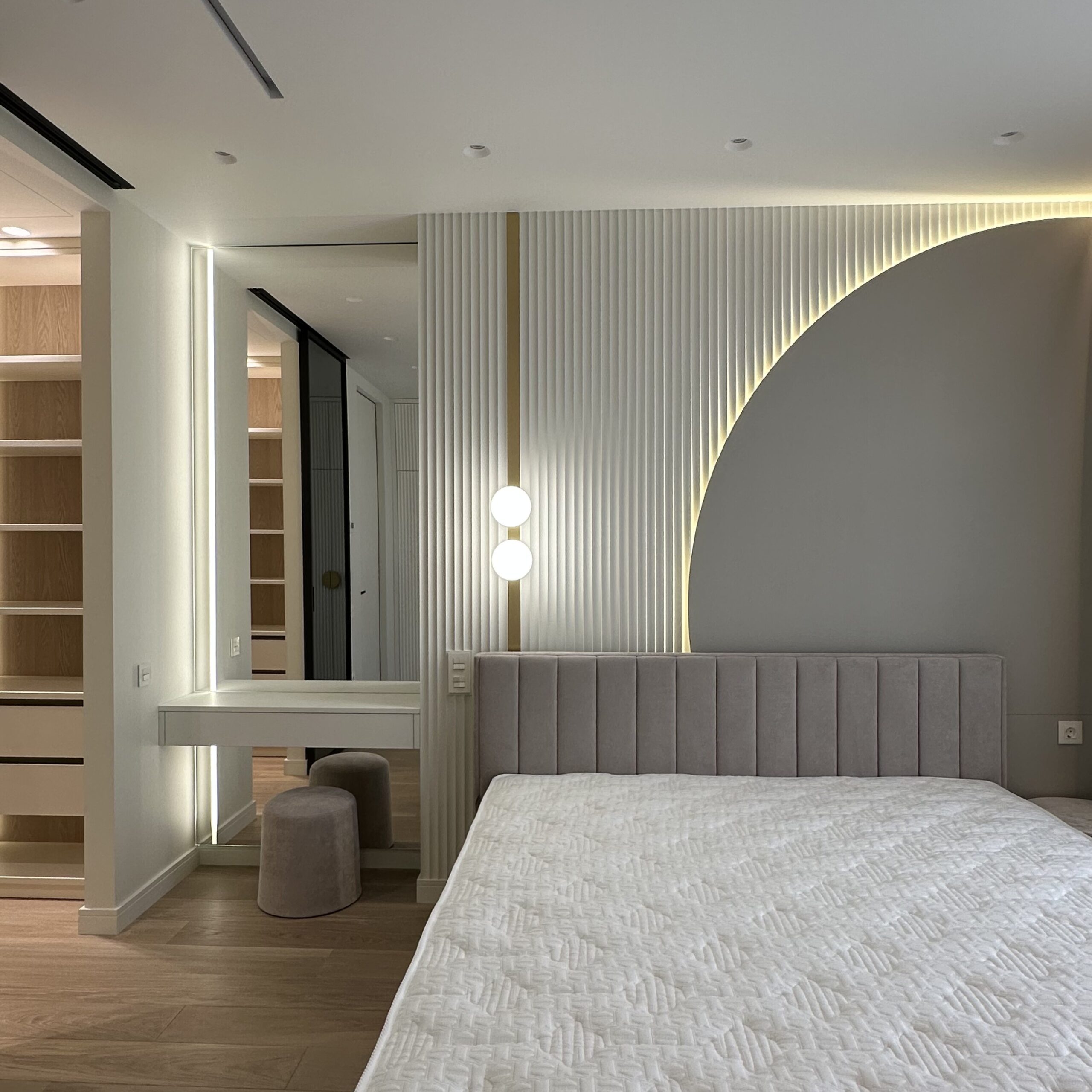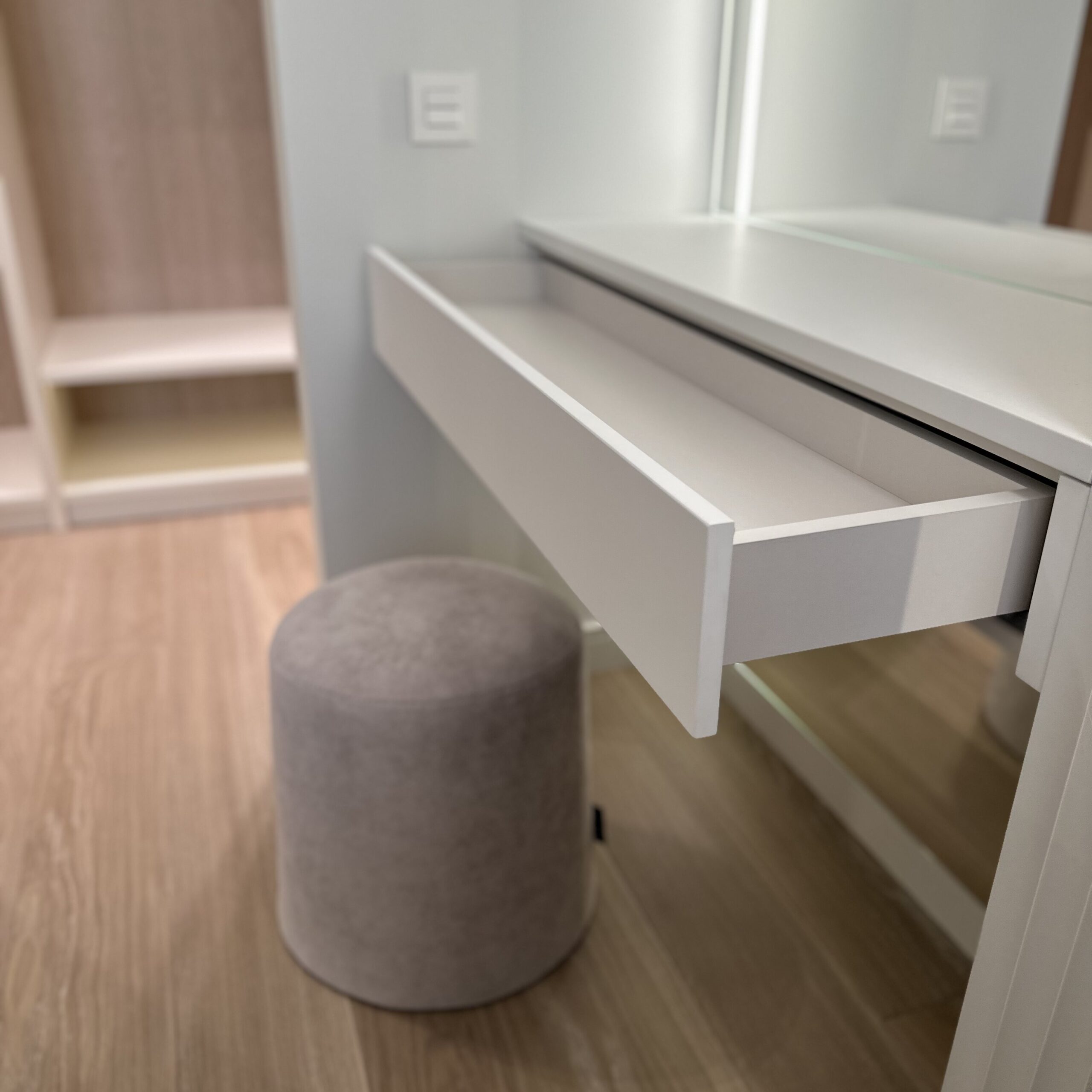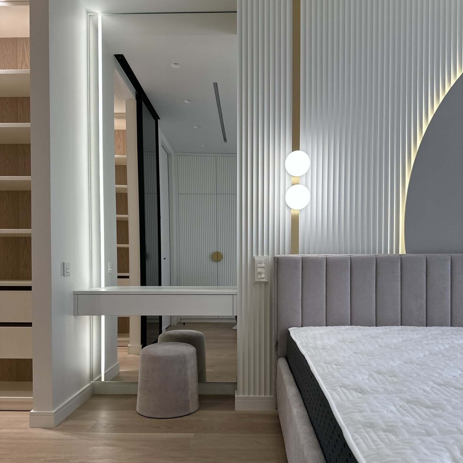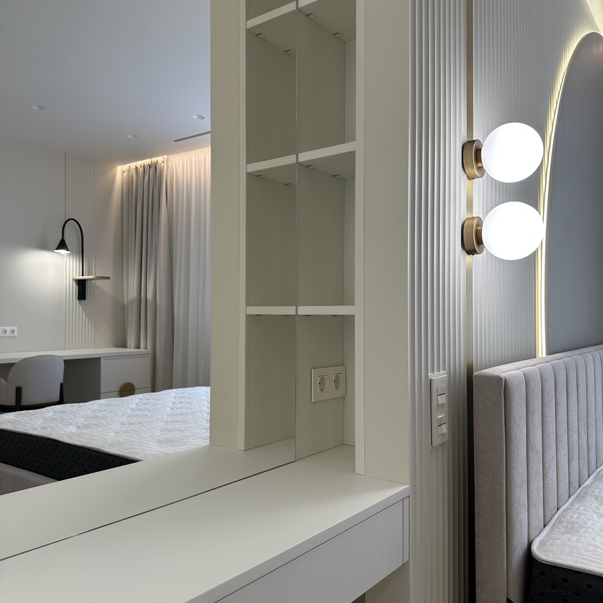 Гардеробная система с текстурой натурального дерева создаёт в детской тёплую и уютную атмосферу. Светлые фасады в тон стен визуально расширяют пространство, а мягкая встроенная подсветка делает интерьер особенно комфортным. Продуманная модульная конструкция включает вместительные полки с ограничителями, выдвижные ящики, отделения для сезонных вещей.