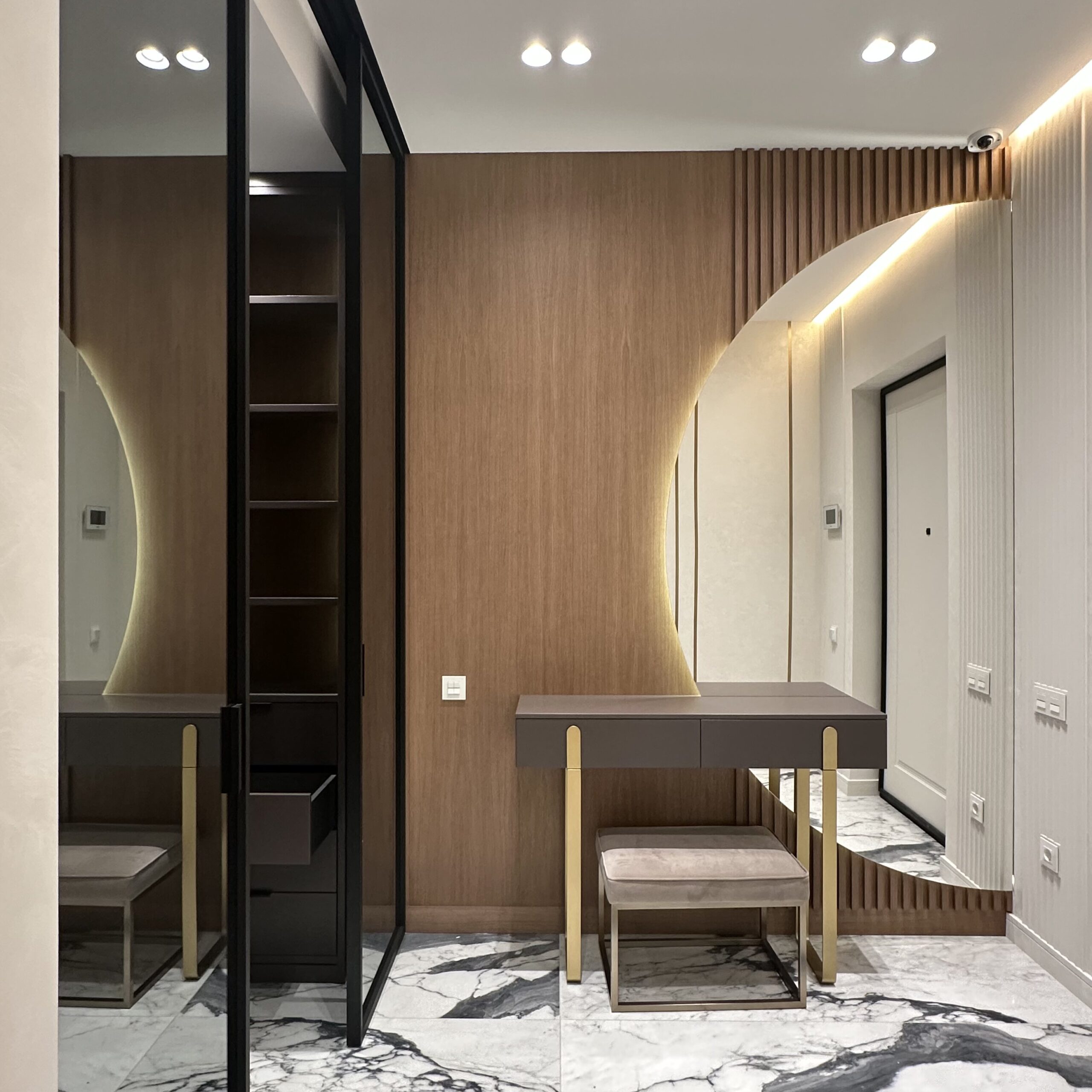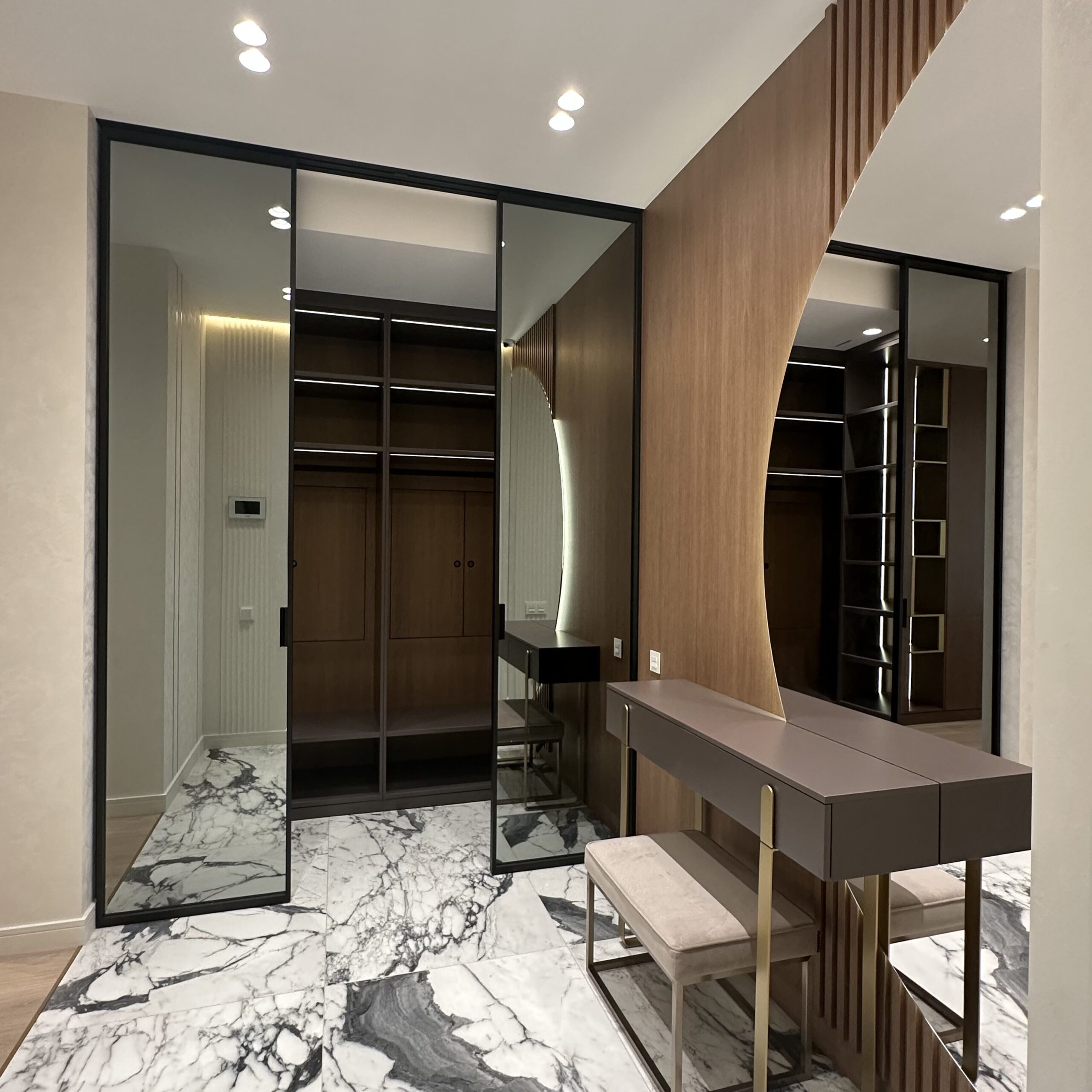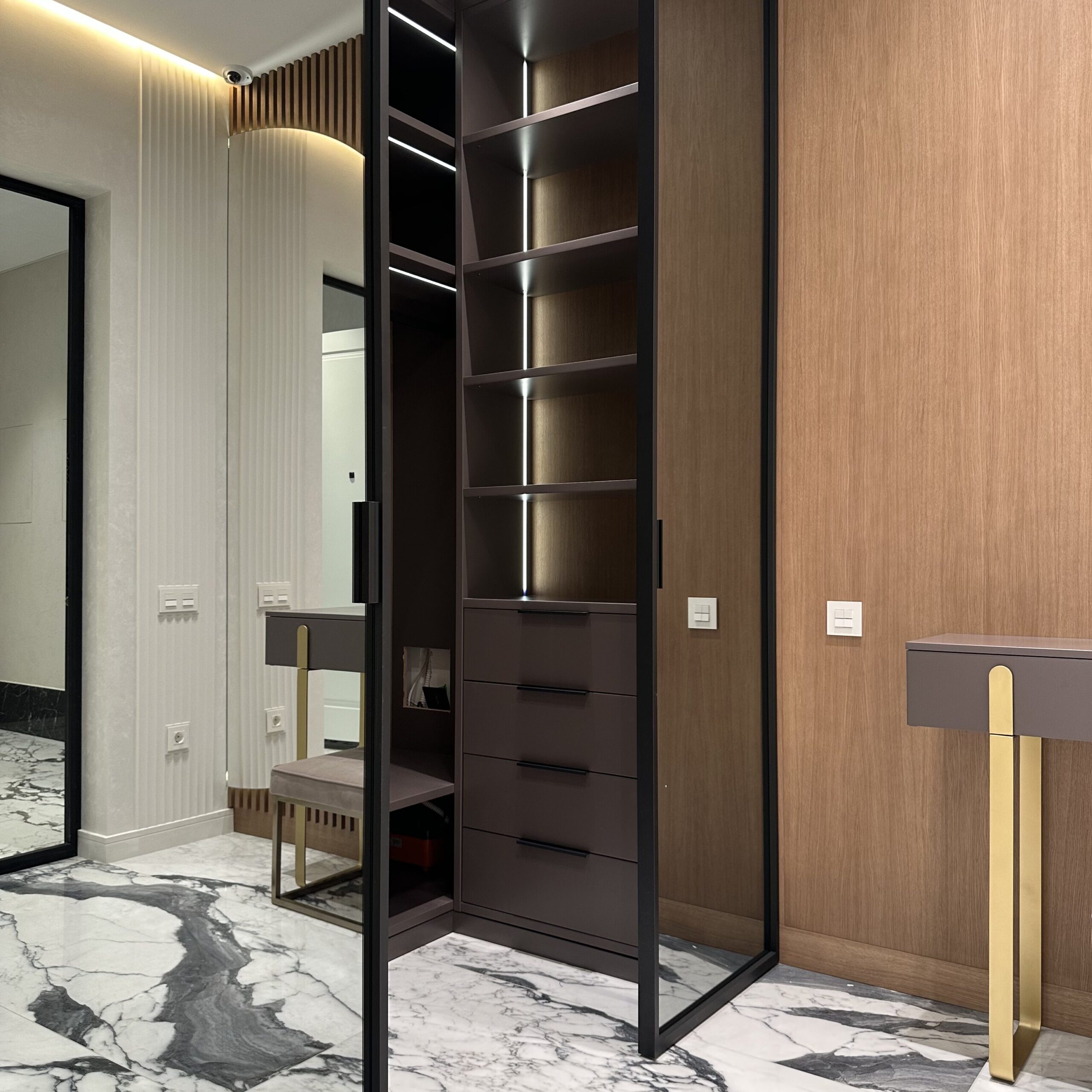 За безупречными внешними линиями скрывается продуманная система хранения с интегрированными элементами «умного дома», что позволяет сохранить чистоту дизайна. Эргономичная конструкция, мягкое освещение и безупречное исполнение превращают гардероб в центральный элемент интерьера, добавляющий пространству утончённости и комфорта.