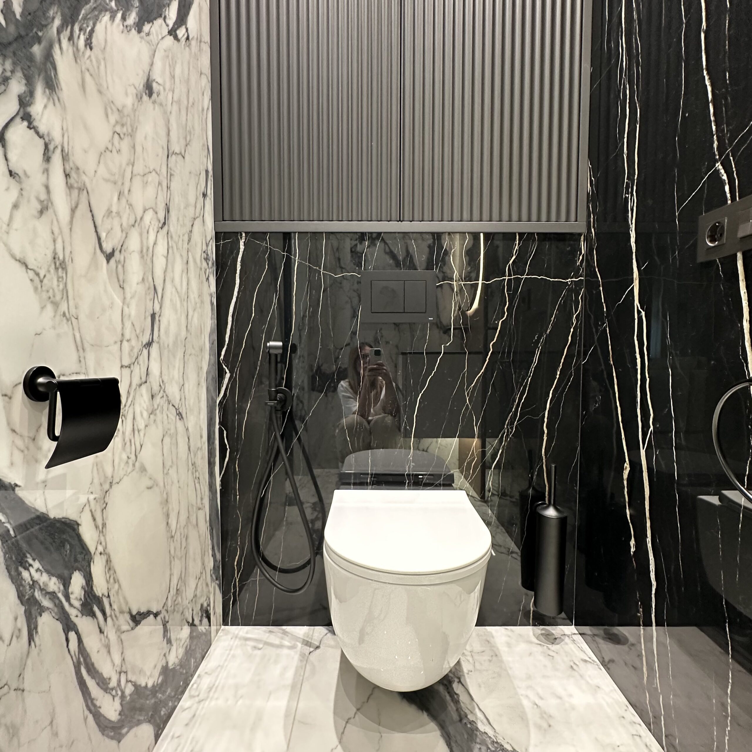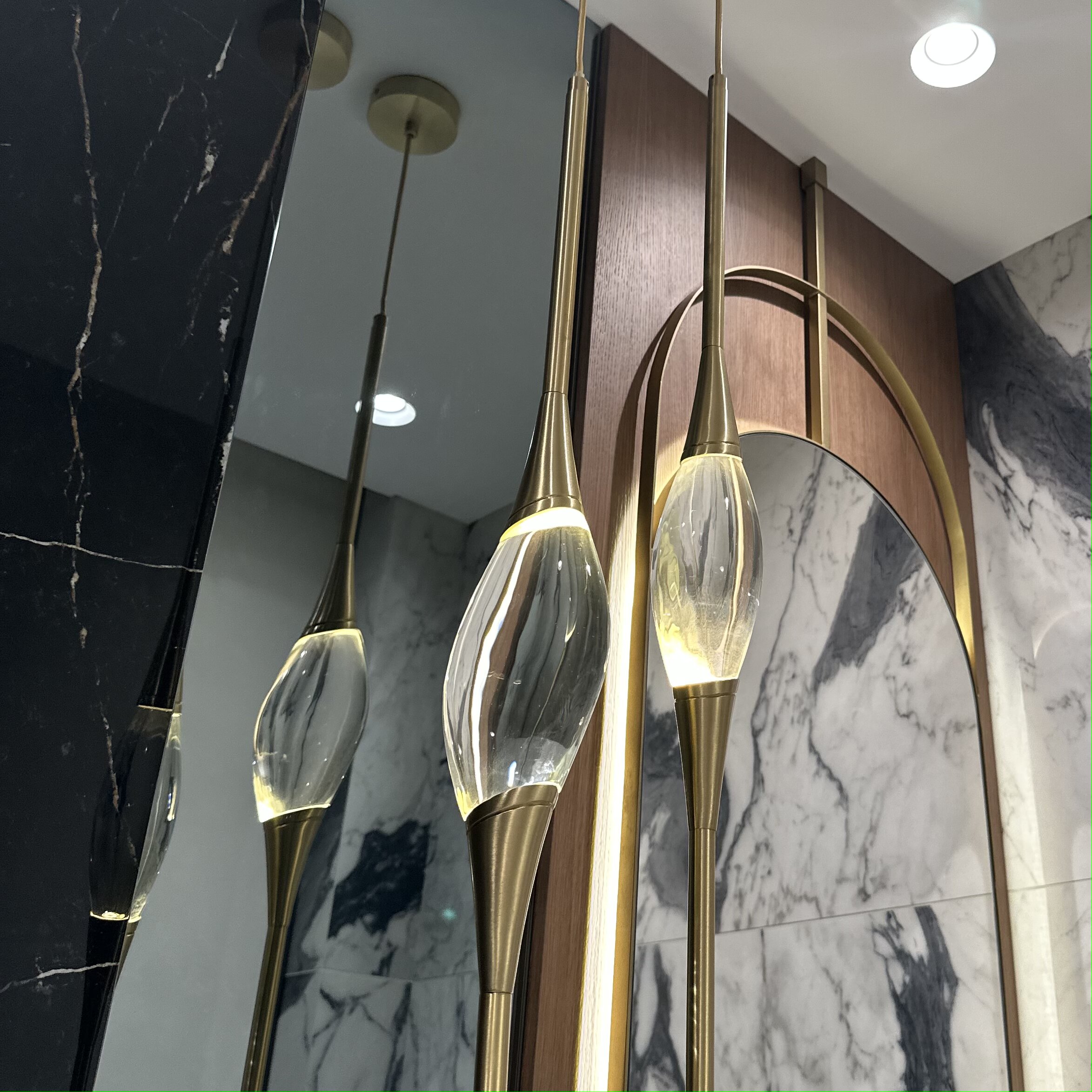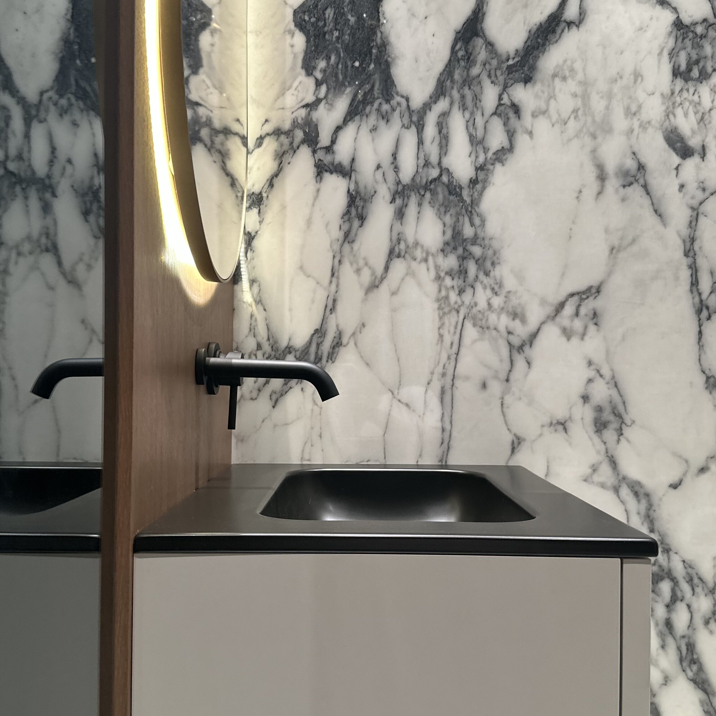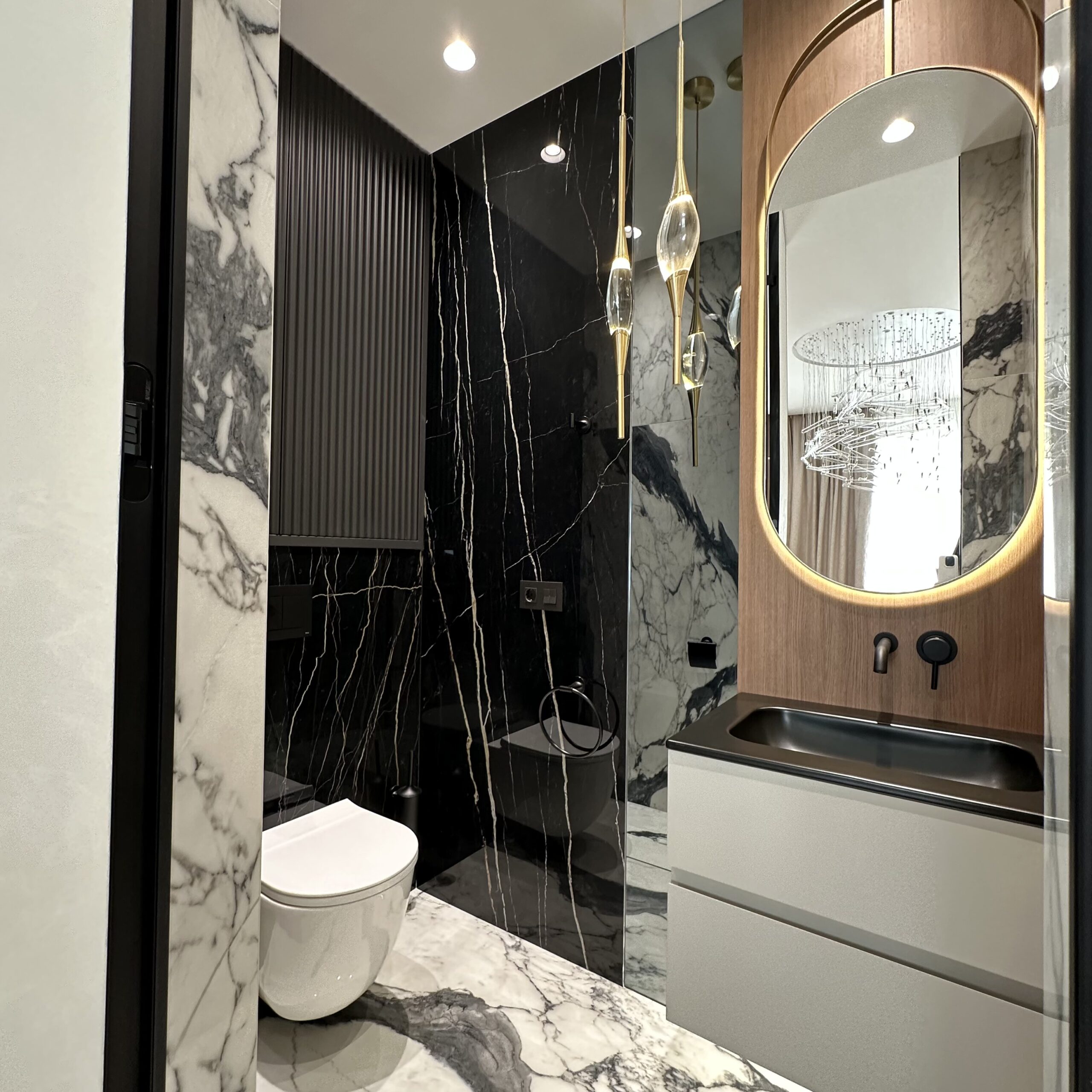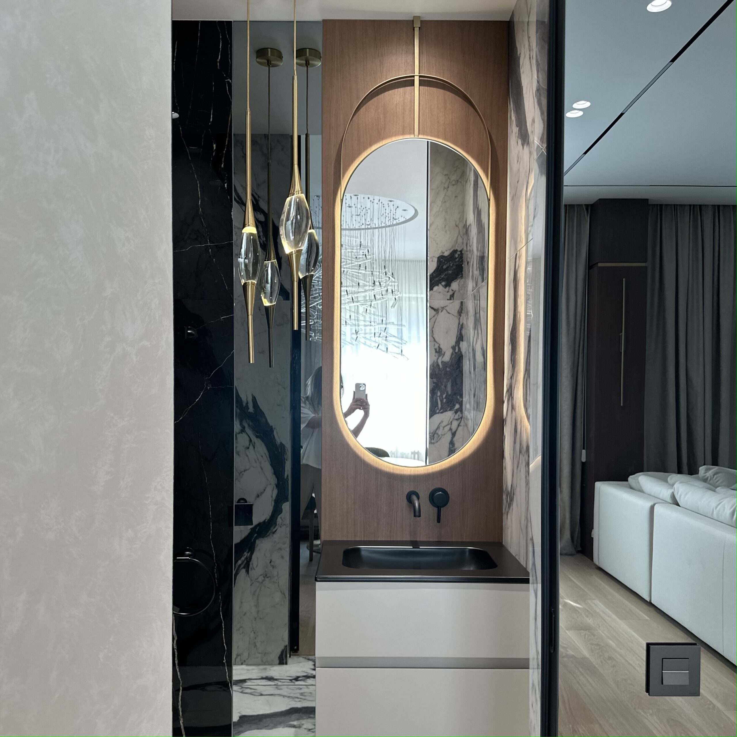 Изысканная композиция в интерьере складывается вокруг элегантного тандема: шпонированной панели и овального зеркала в благородной металлической раме, которые становятся настоящим центром притяжения пространства. Подвесная тумба с интегрированными ручками и утончённой фрезеровкой придаёт интерьеру современный характер, не утяжеляя его. Каждая деталь продумана до мелочей: мягкие линии шпона гармонично сочетаются с геометрией металлической оправы, а продуманное тёплое освещение деликатно подчёркивает все элементы композиции.