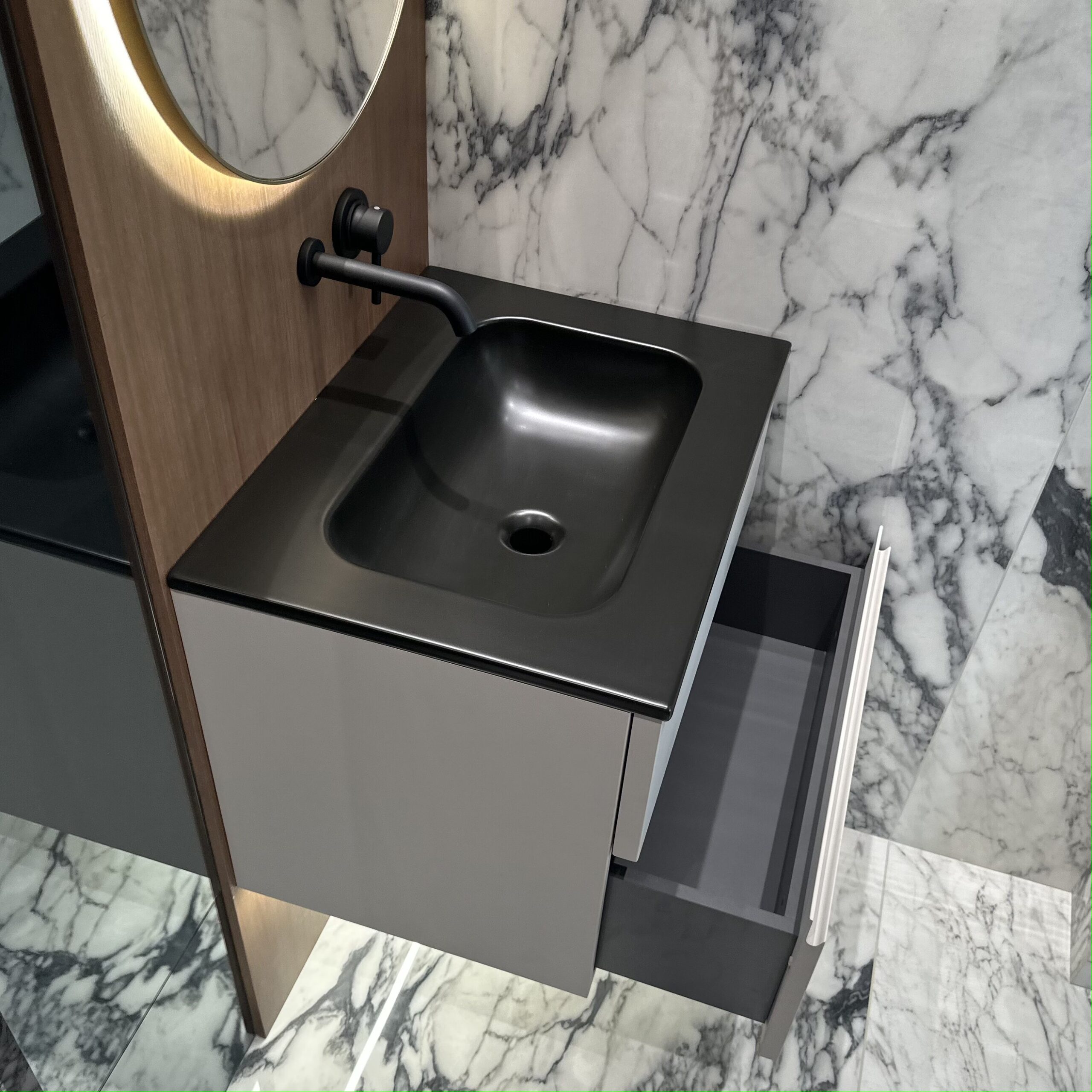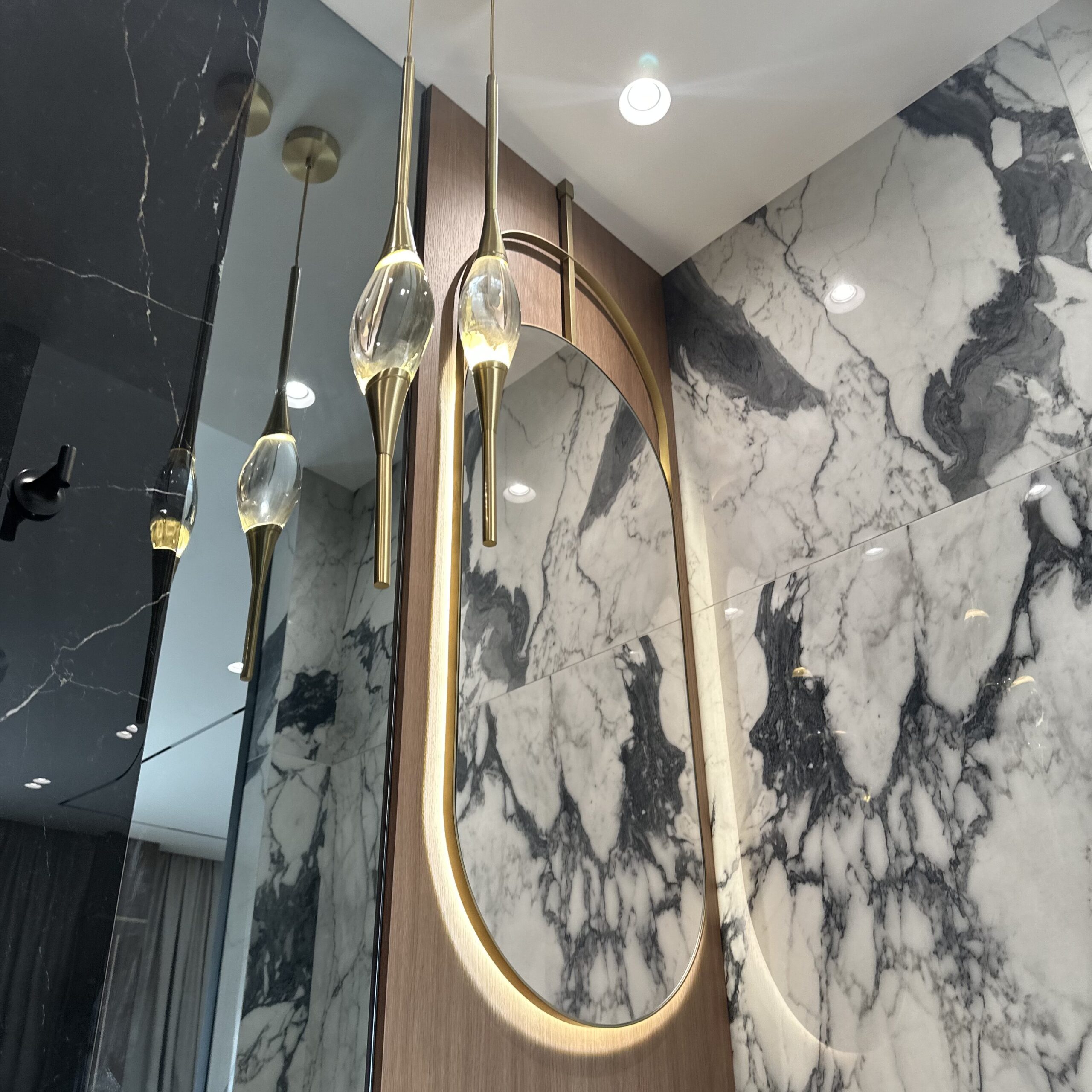 Изысканная композиция в интерьере складывается вокруг элегантного тандема: шпонированной панели и овального зеркала в благородной металлической раме, которые становятся настоящим центром притяжения пространства. Подвесная тумба с интегрированными ручками и утончённой фрезеровкой придаёт интерьеру современный характер, не утяжеляя его. Каждая деталь продумана до мелочей: мягкие линии шпона гармонично сочетаются с геометрией металлической оправы, а продуманное тёплое освещение деликатно подчёркивает все элементы композиции.