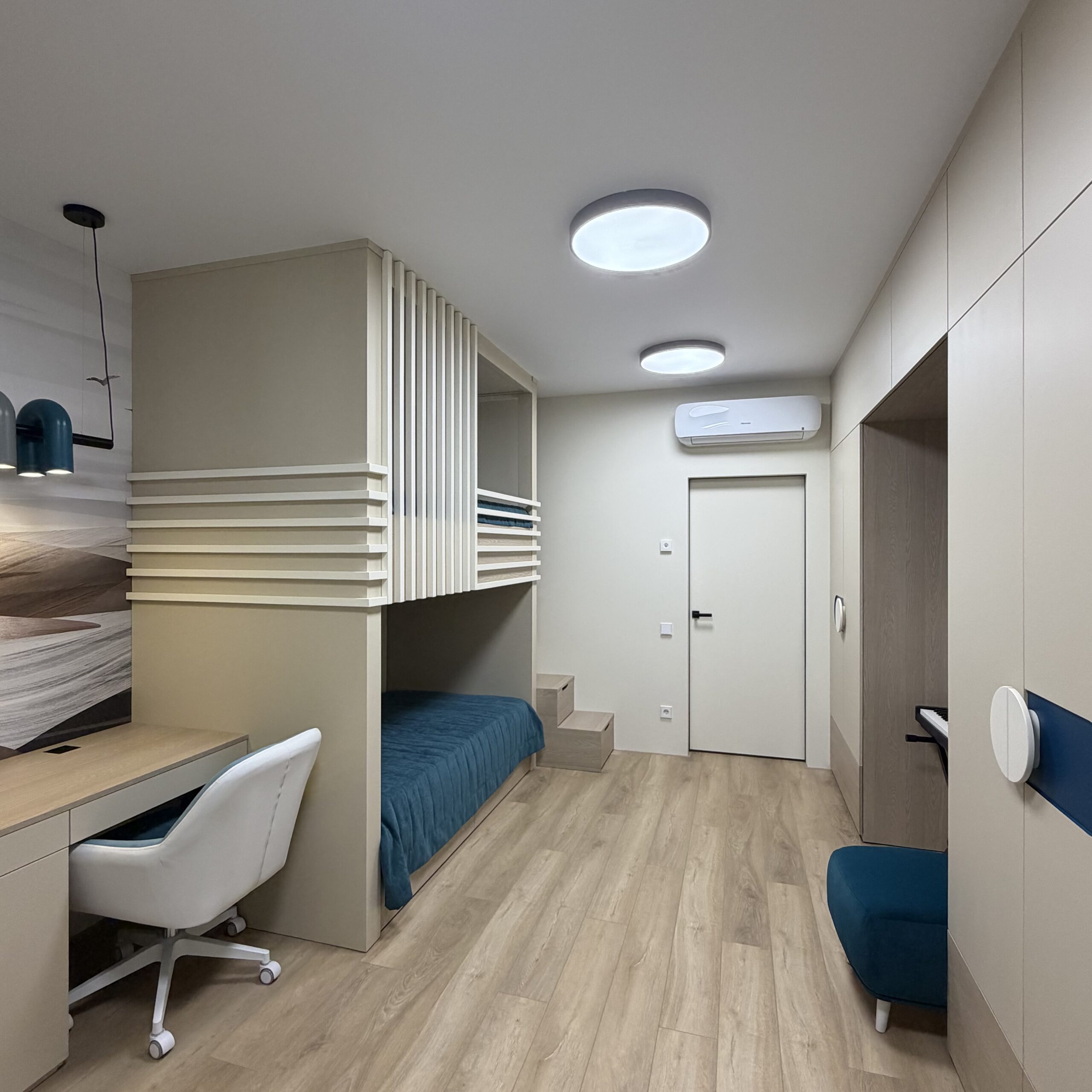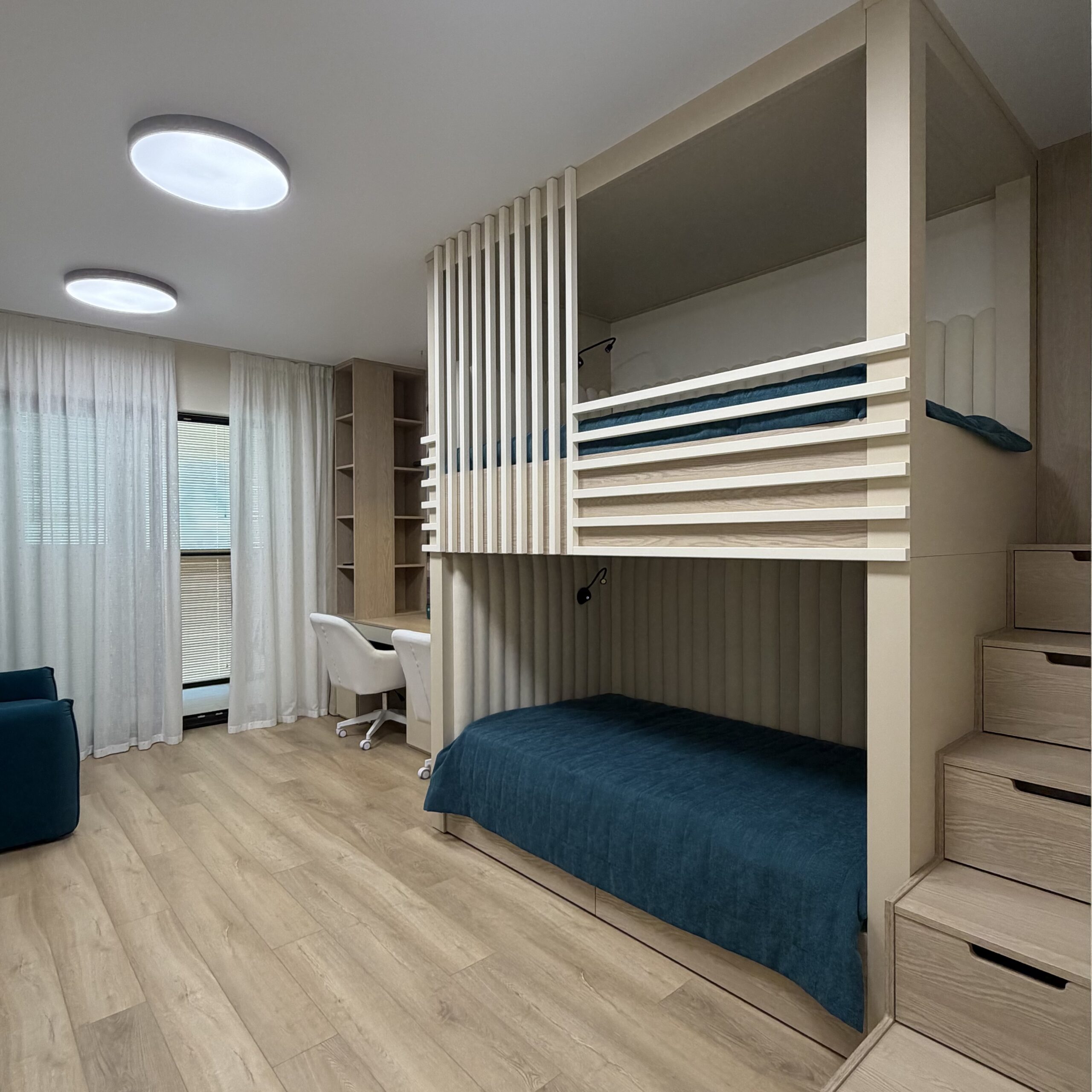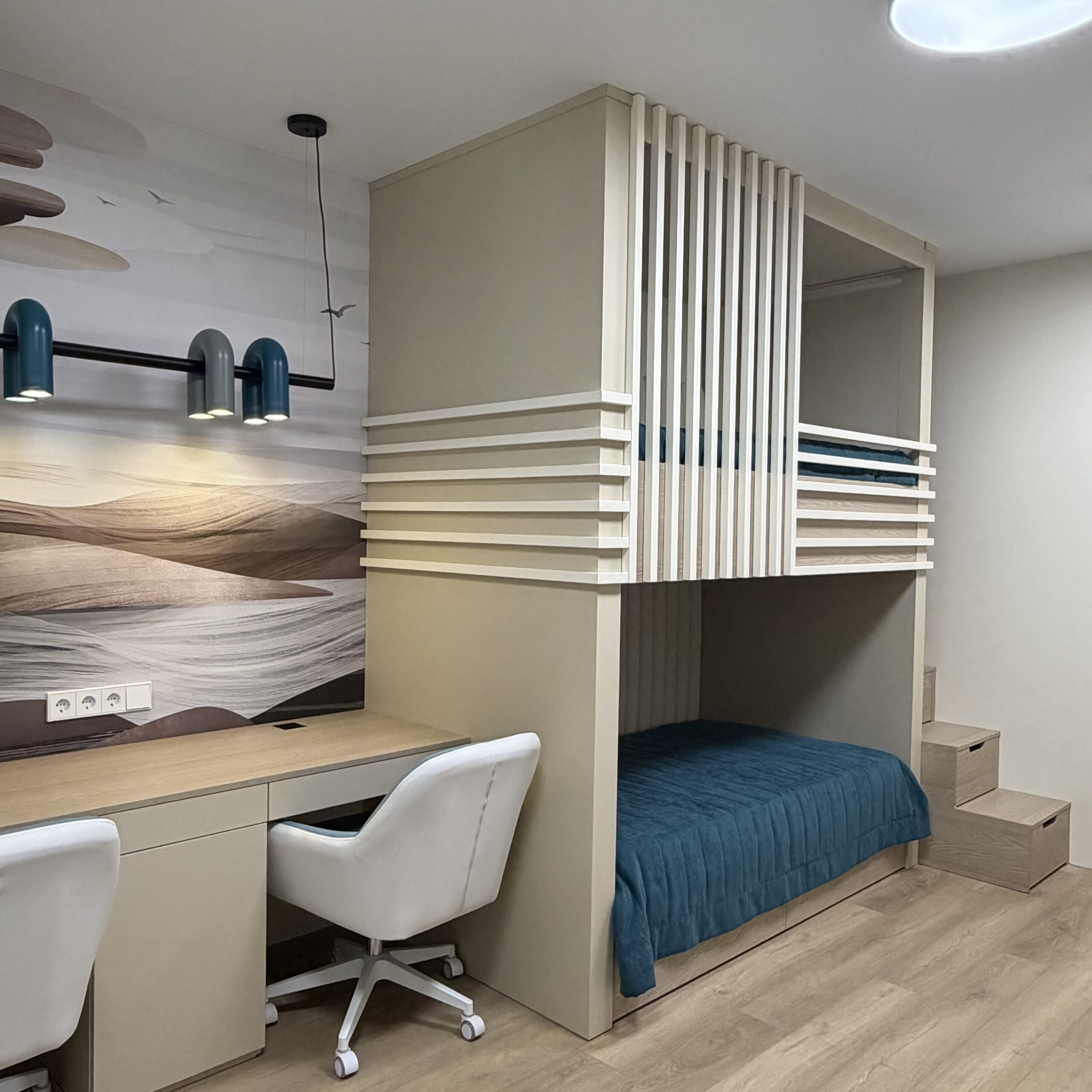 Продуманное решение для детской, где каждый элемент работает на комфорт и порядок. Два полноценных спальных места объединены в цельную конструкцию, которая экономит пространство и делает комнату визуально чище и организованнее.