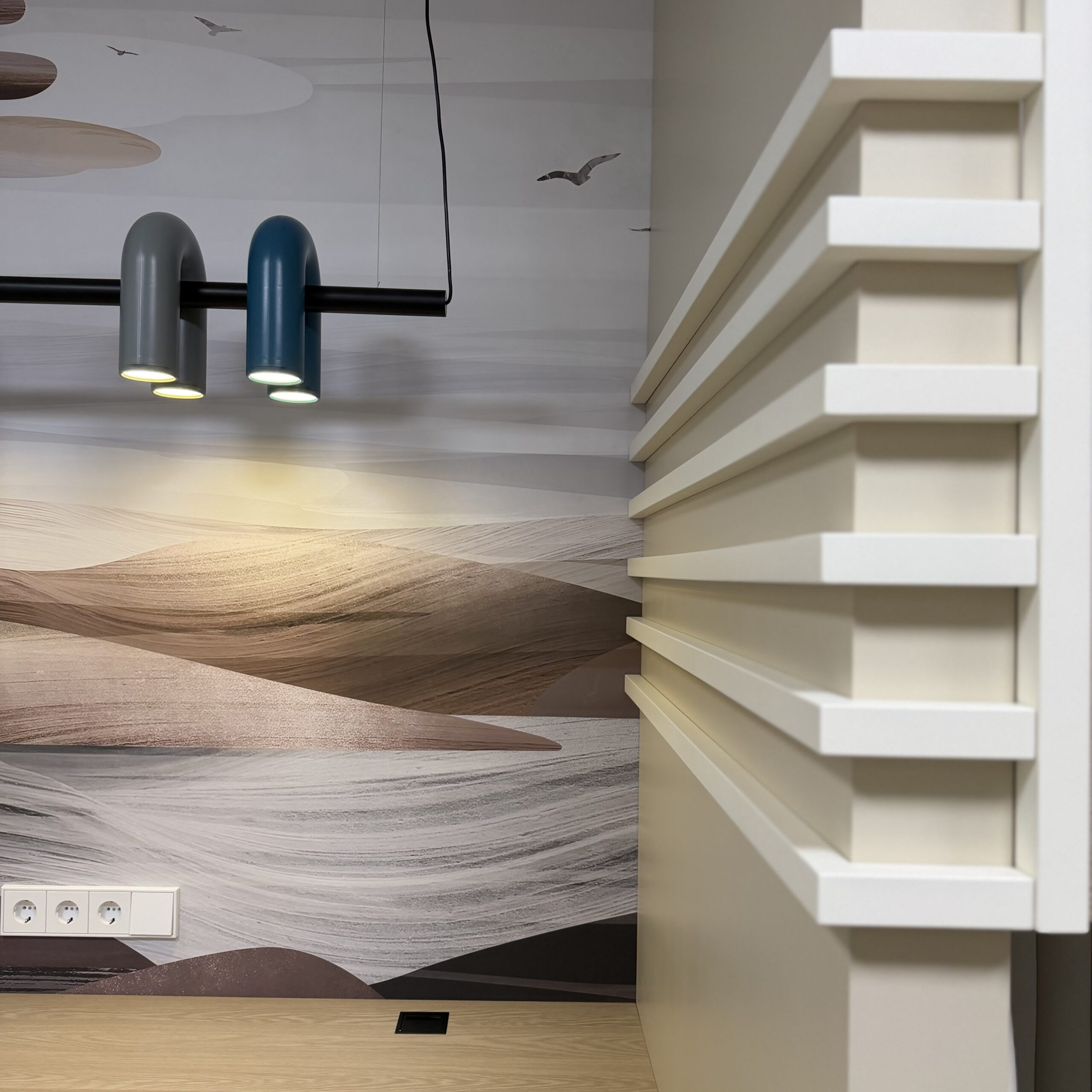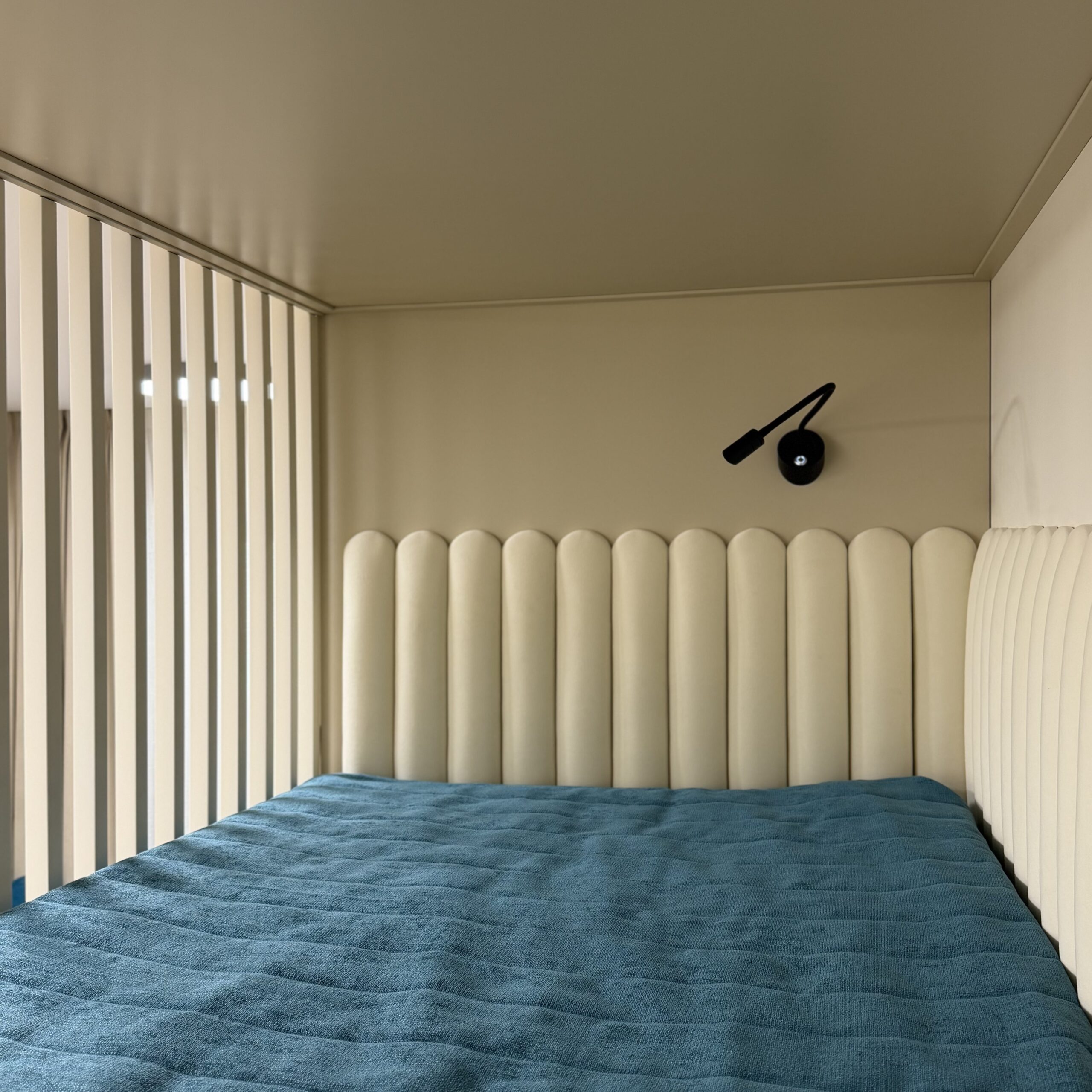 Лестница на второй уровень выполнена в виде системы шкафов — это не просто подъём, а полноценное хранение для вещей, игрушек и повседневных мелочей. Всё под рукой и на своих местах. Мягкие панели добавляют уюта и обеспечивают безопасность, создавая комфортную среду для отдыха и сна.