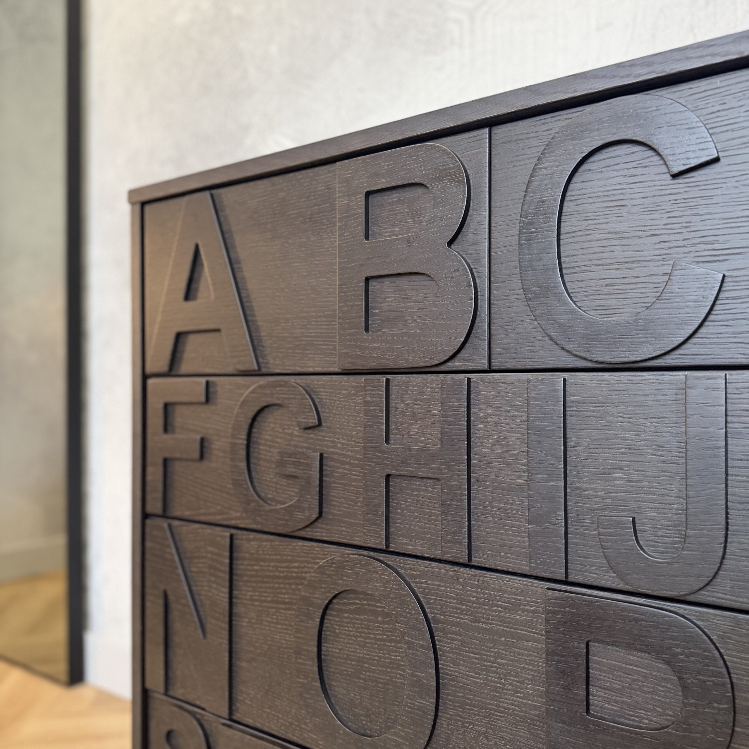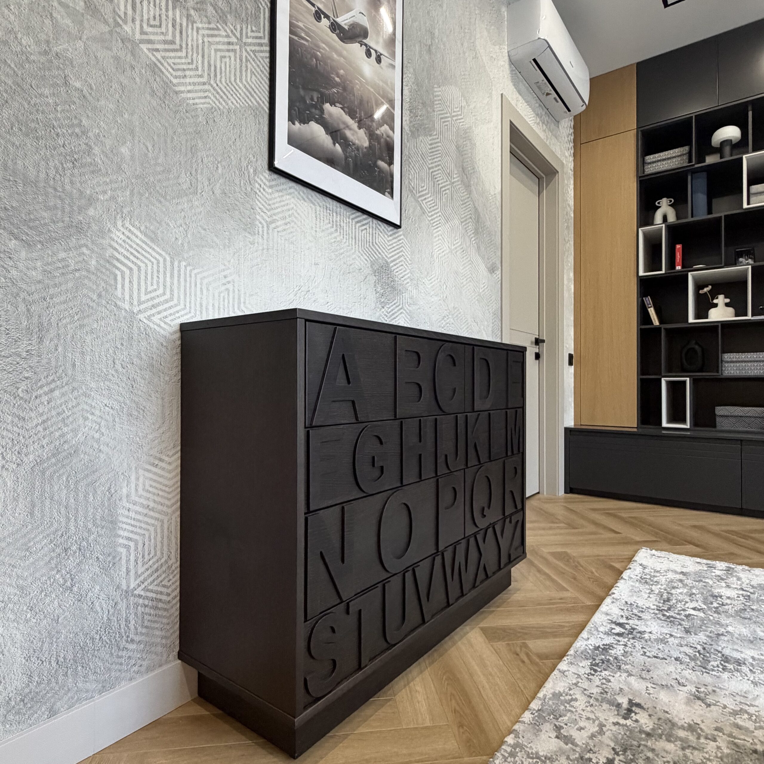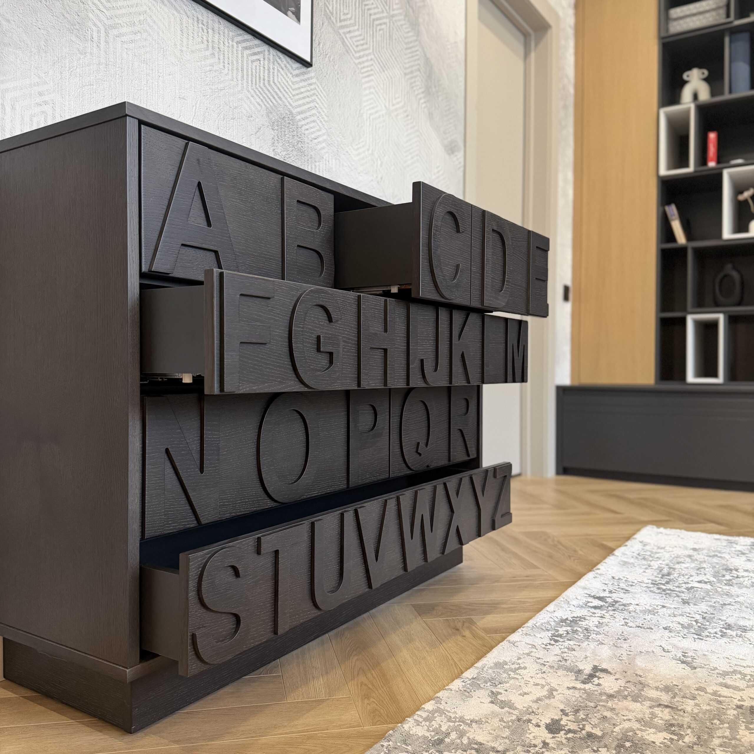 Комод в шпоне дуба с объёмными буквами из массива — выразительный акцент, в котором натуральный материал работает на глубину образа. Тёплая текстура дуба раскрывается в спокойной геометрии формы, а рельефные буквы на фасаде добавляют индивидуальность и характер, превращая предмет в полноценный элемент композиции.