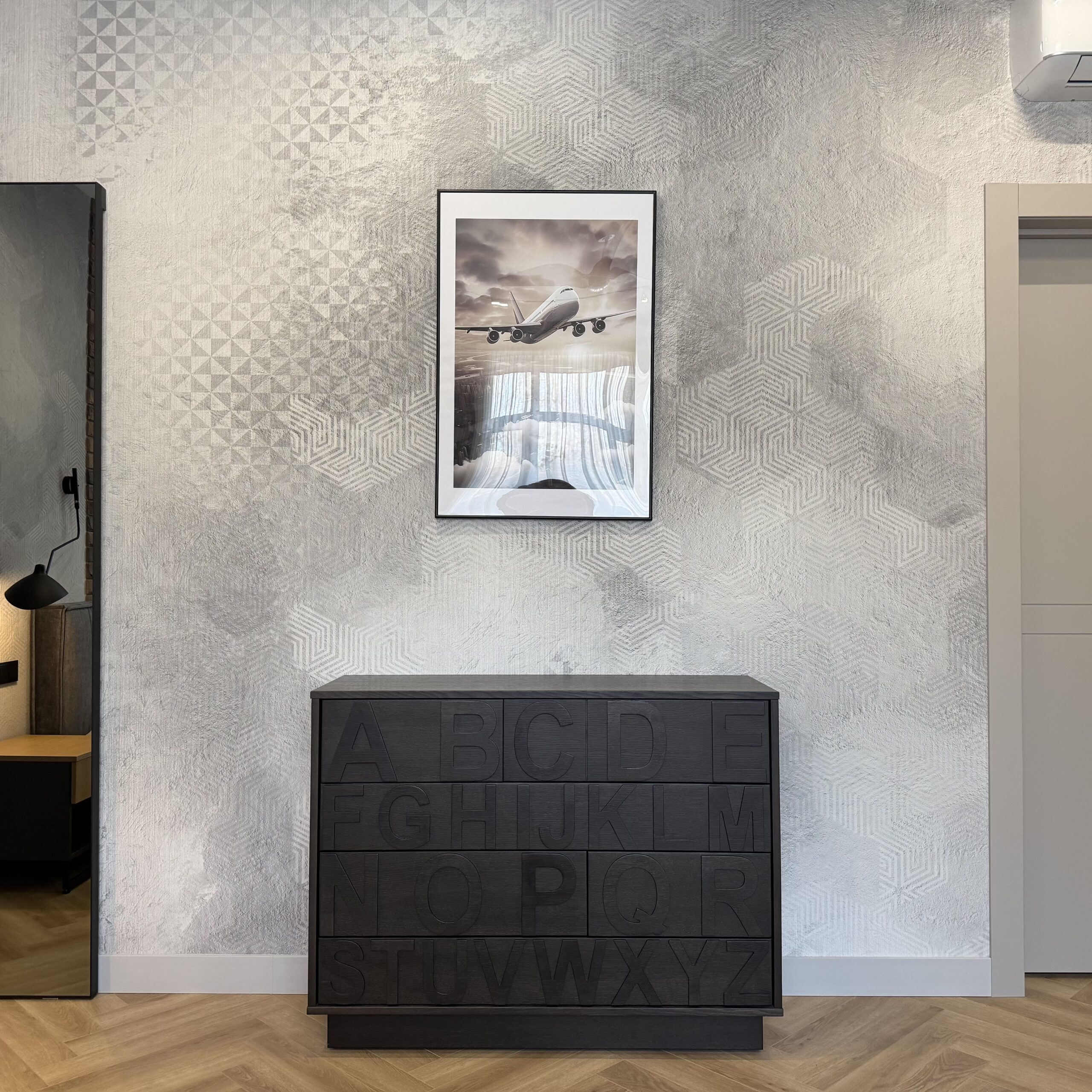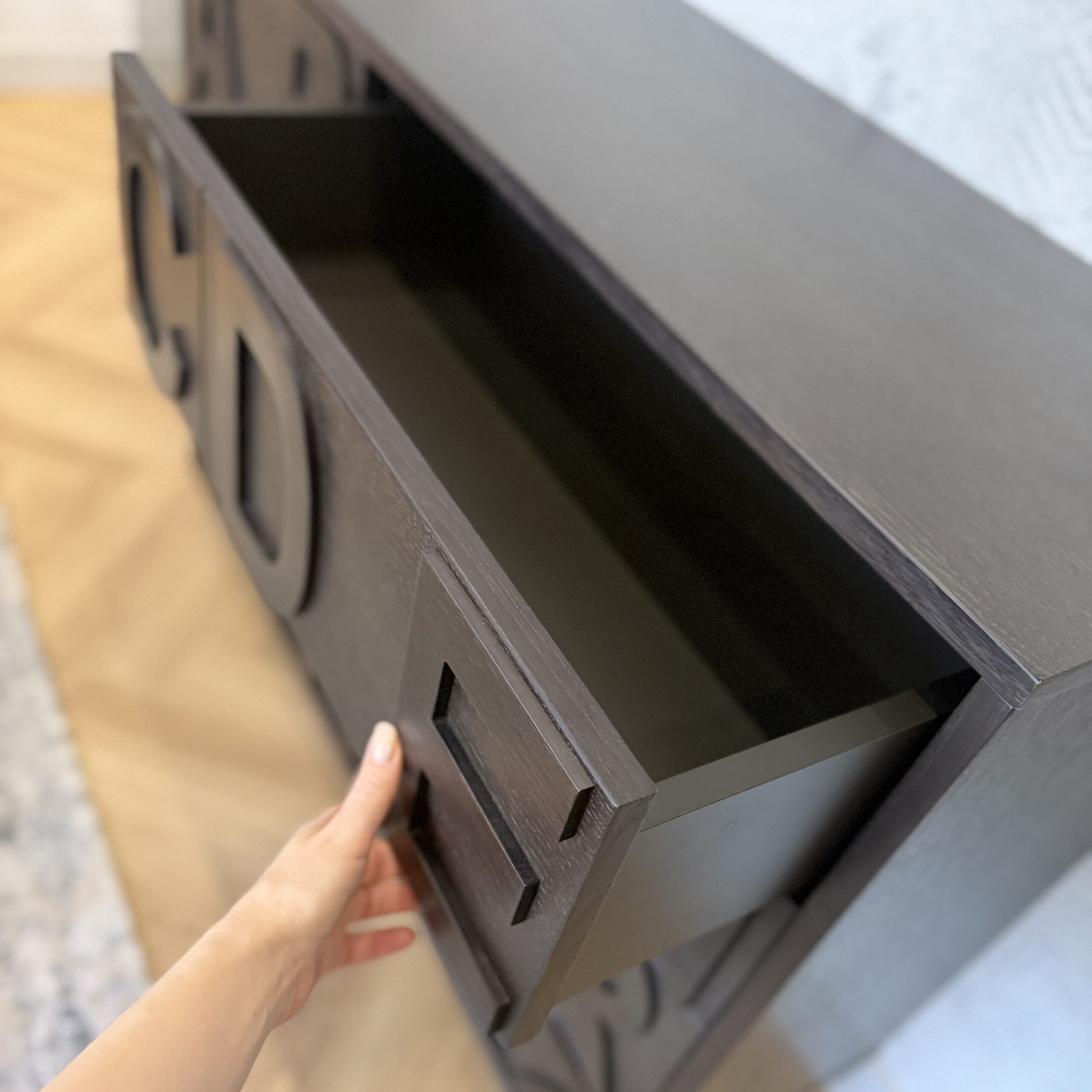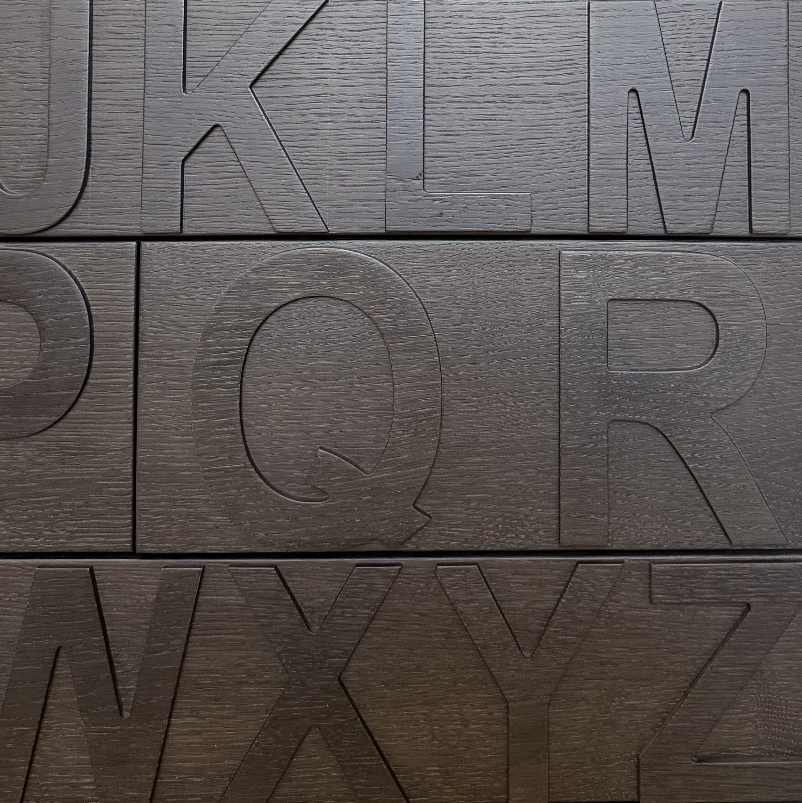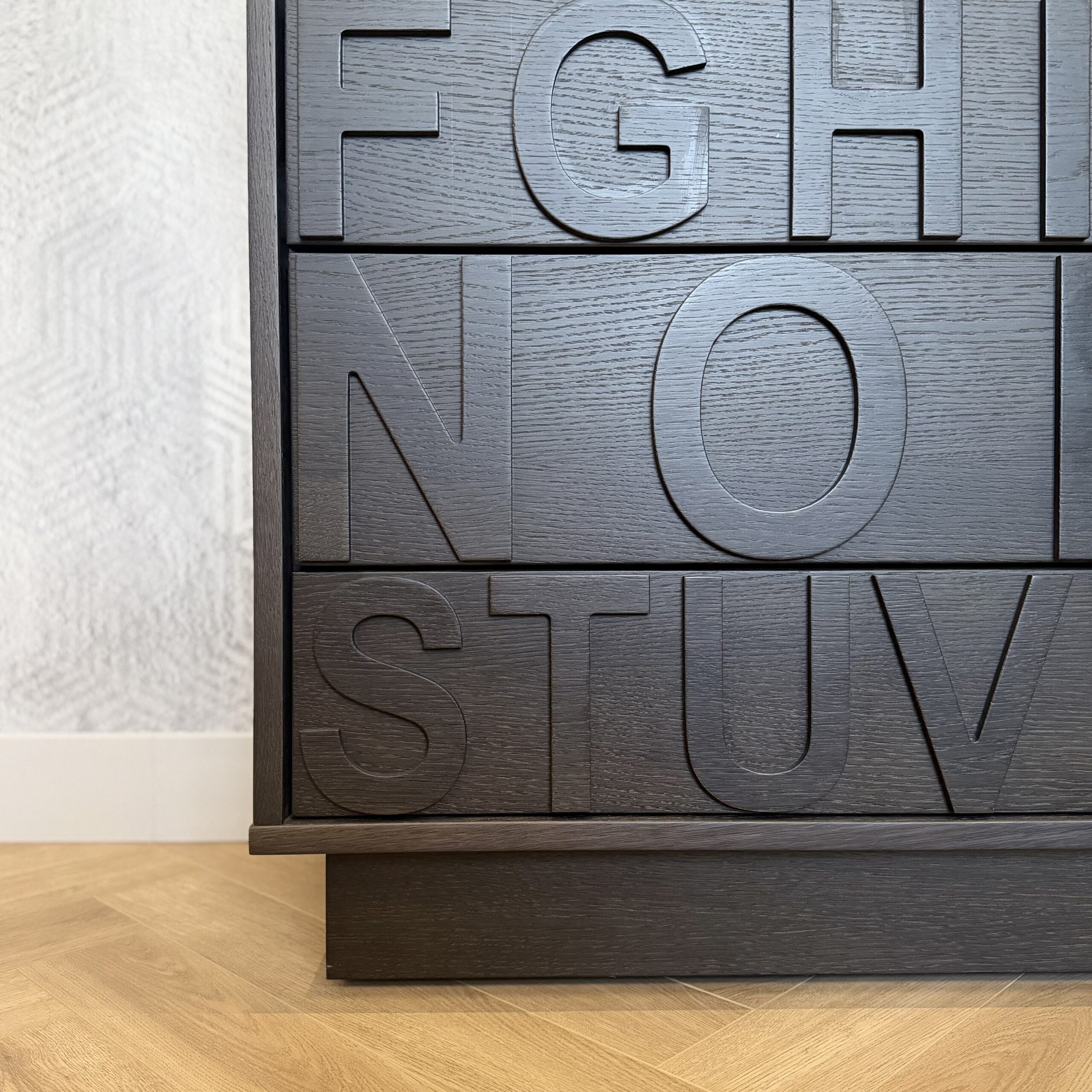 Комод в шпоне дуба с объёмными буквами из массива — выразительный акцент, в котором натуральный материал работает на глубину образа. Тёплая текстура дуба раскрывается в спокойной геометрии формы, а рельефные буквы на фасаде добавляют индивидуальность и характер, превращая предмет в полноценный элемент композиции.