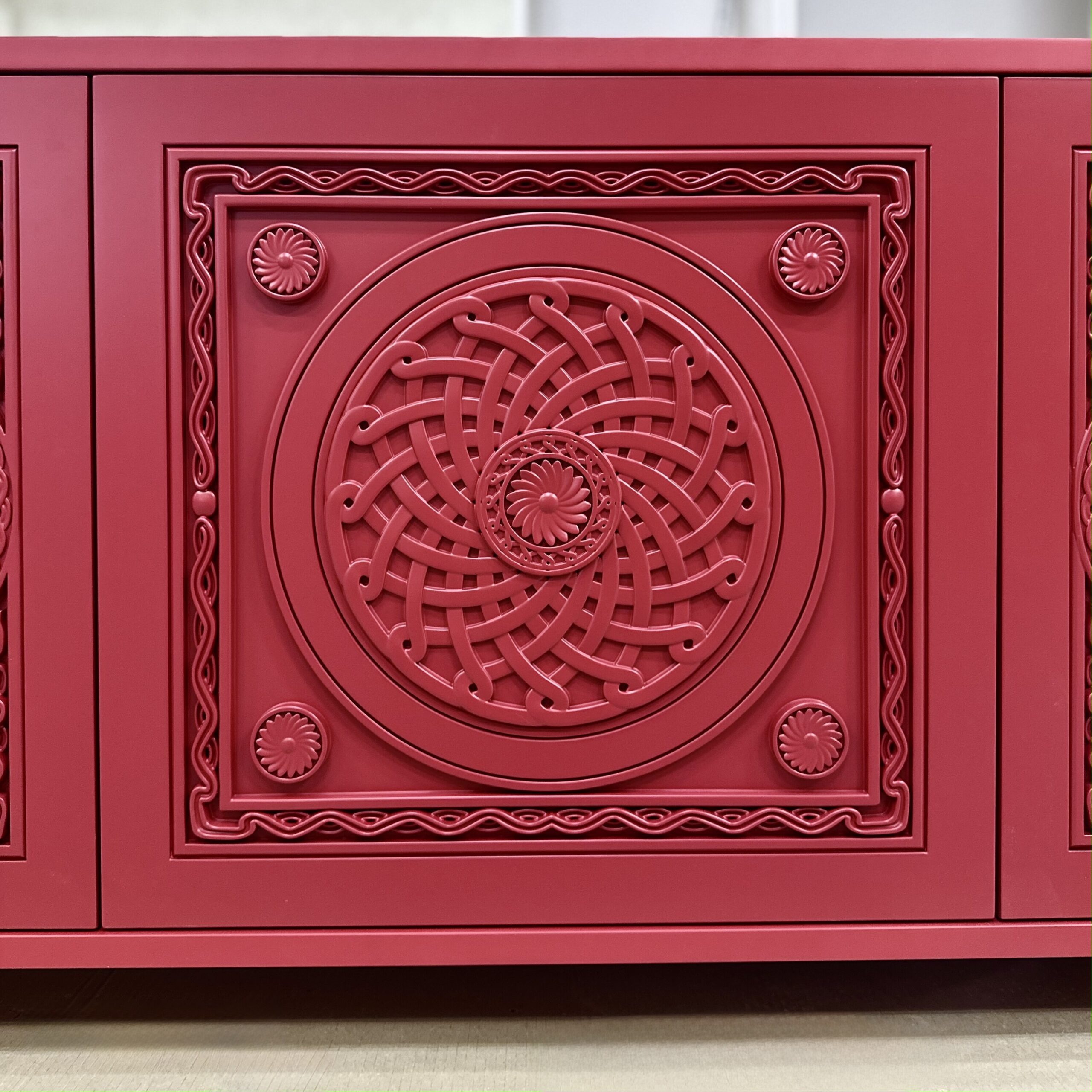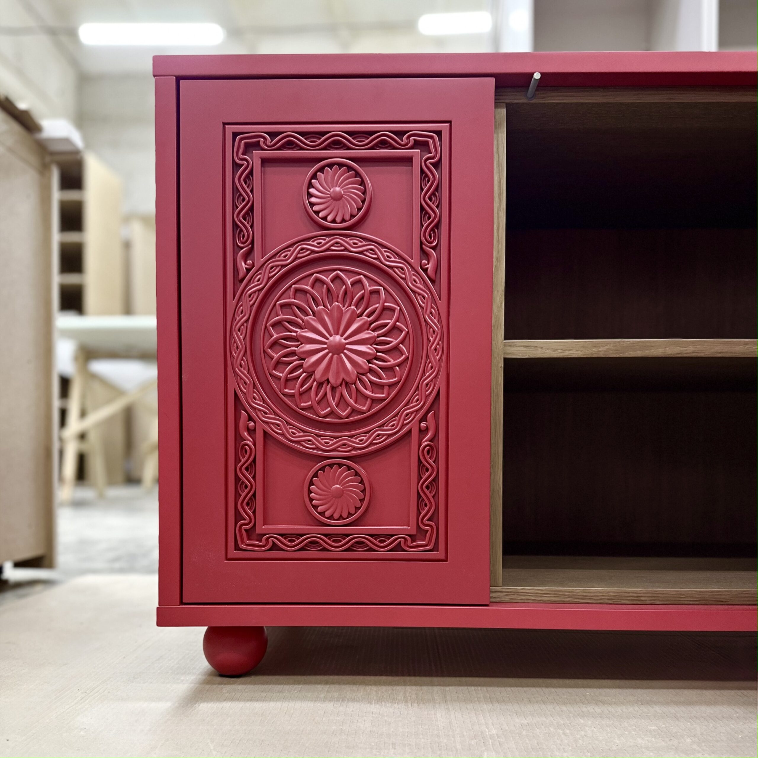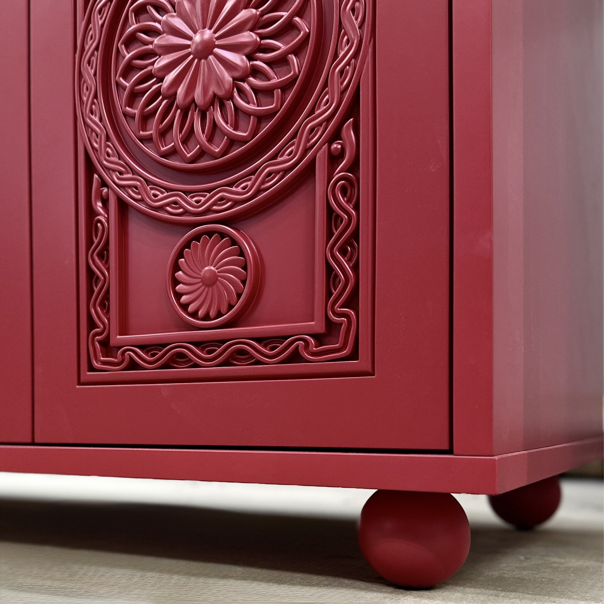 Элегантный комод в русском традиционном стиле — воплощение мастерства и богатого культурного наследия. Фасады украшены изысканным резным орнаментом, вдохновлённым народными мотивами, символизирующими гармонию и достаток. Глубокий красный цвет придаёт изделию торжественный и выразительный характер, делая его центральным элементом любого интерьера.