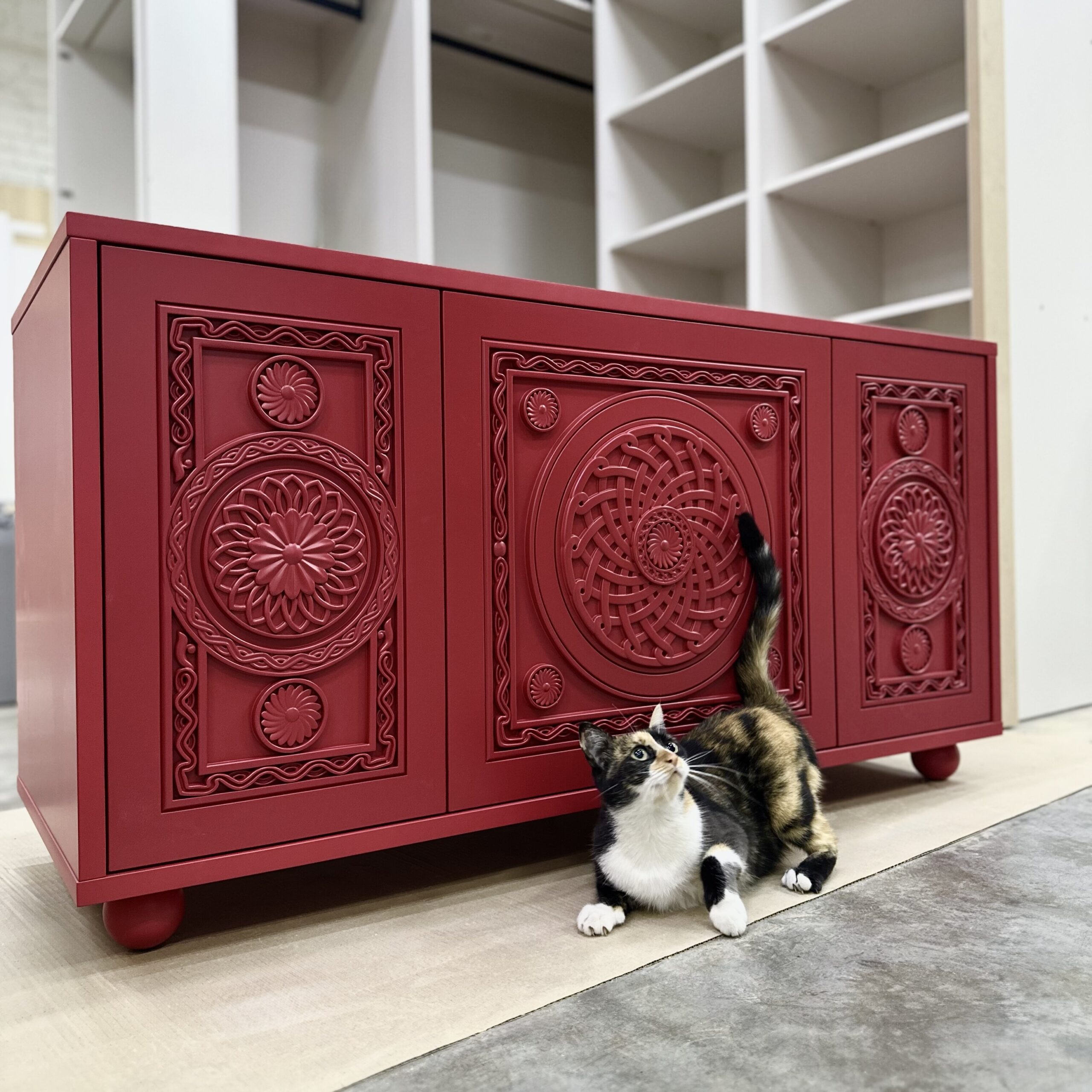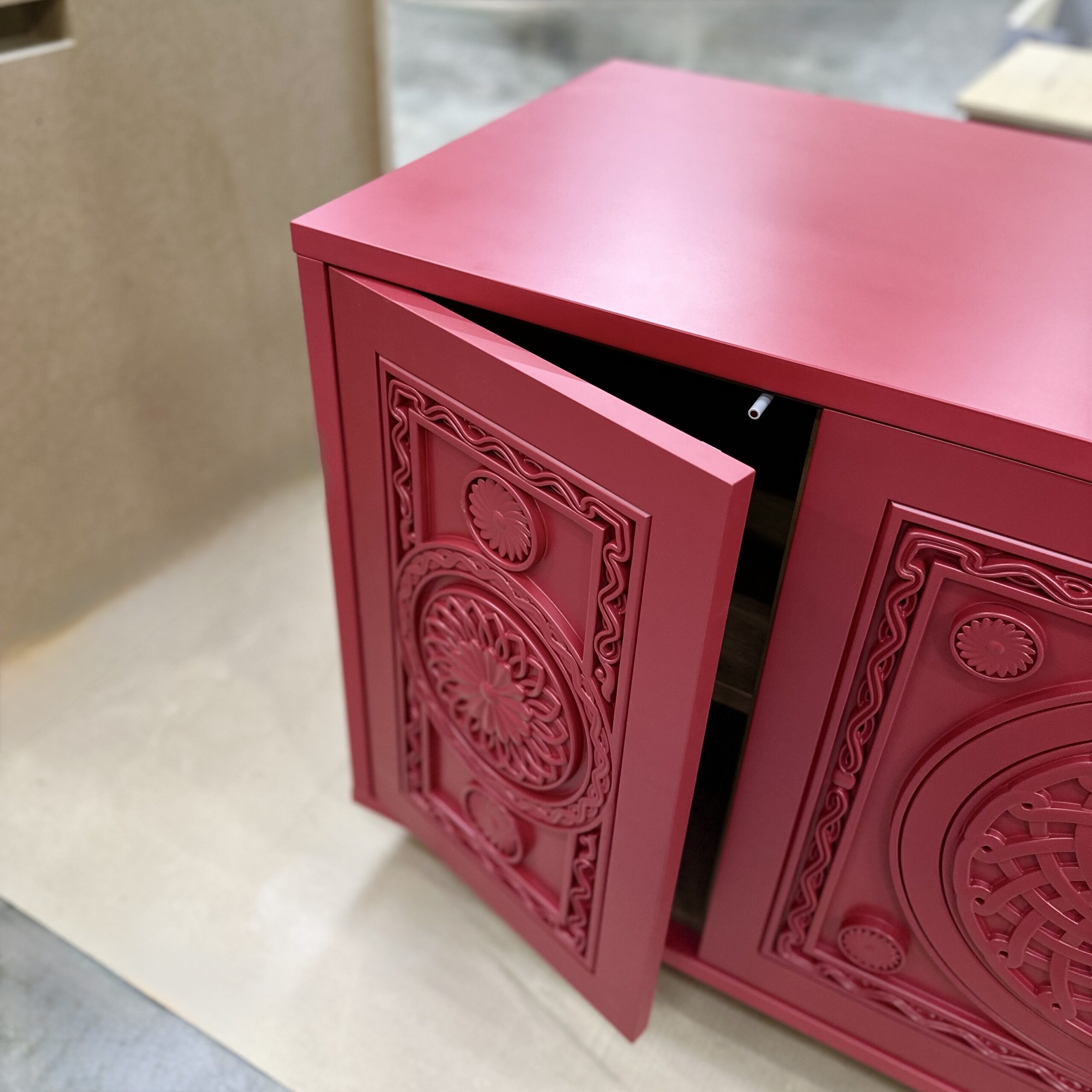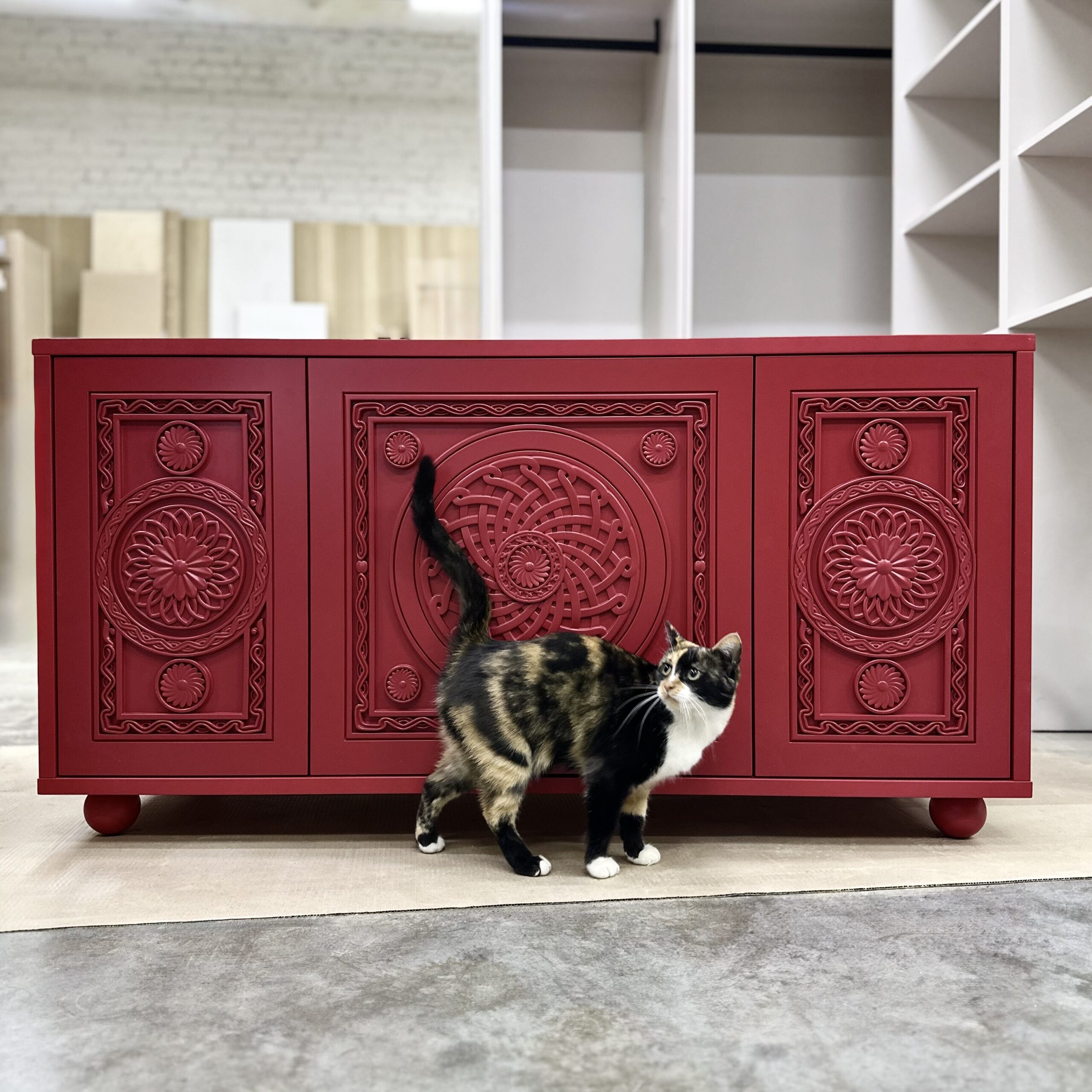 Элегантный комод в русском традиционном стиле — воплощение мастерства и богатого культурного наследия. Фасады украшены изысканным резным орнаментом, вдохновлённым народными мотивами, символизирующими гармонию и достаток. Глубокий красный цвет придаёт изделию торжественный и выразительный характер, делая его центральным элементом любого интерьера.