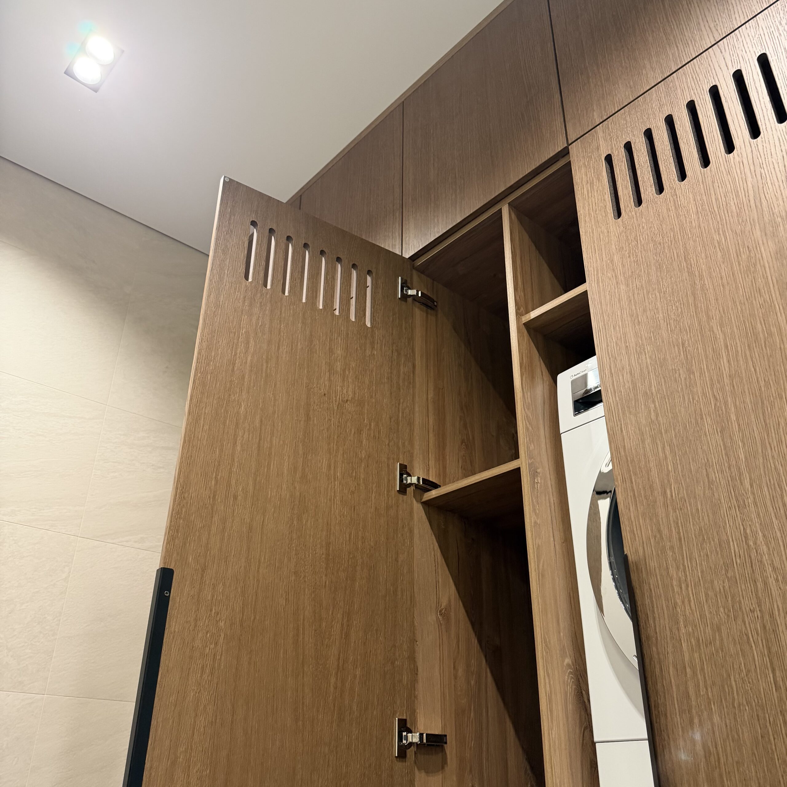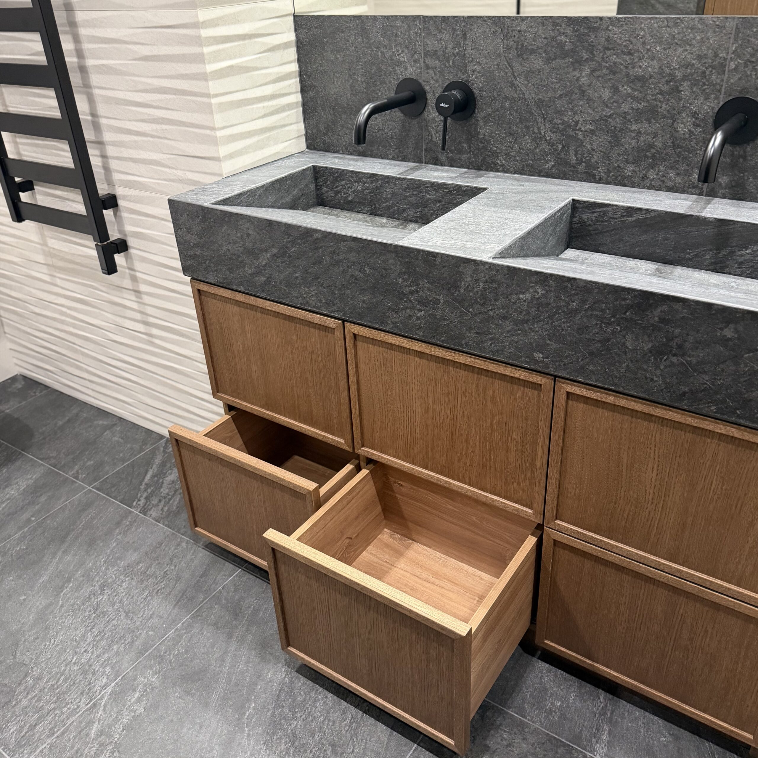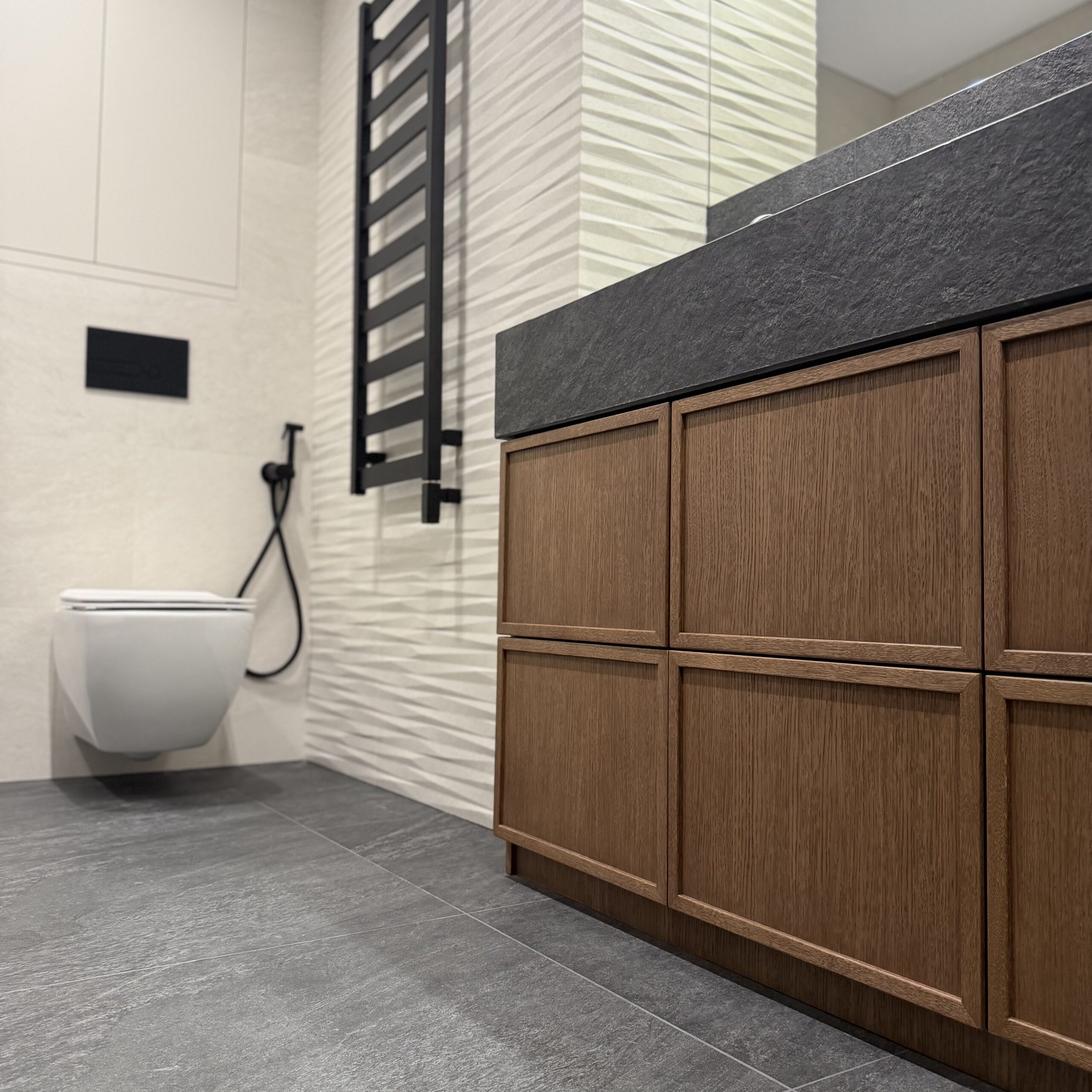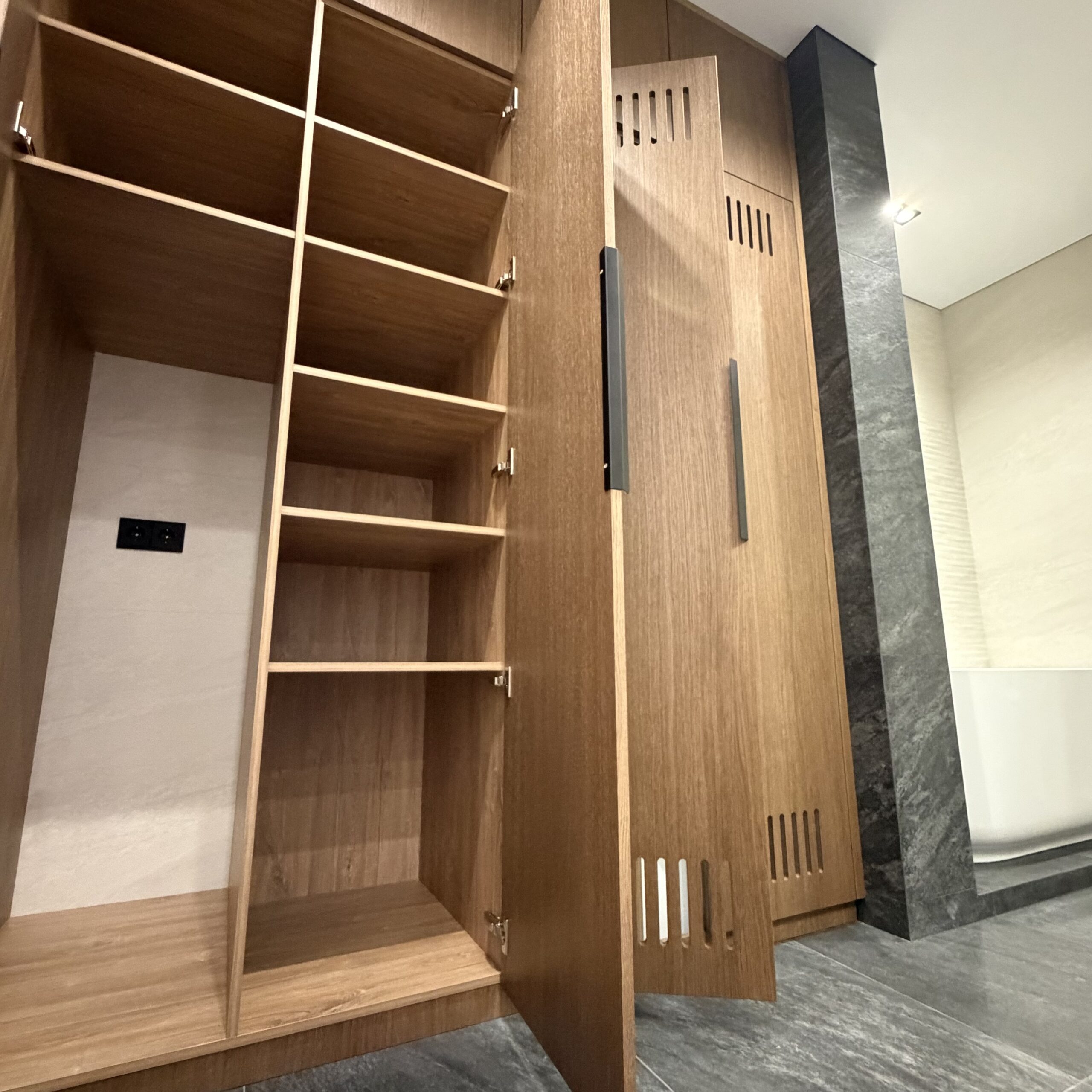 Цельная композиция, где каждая деталь подчинена чистоте линий и логике пространства. Тумба под раковину выполнена в шпоне дуба с рамкой из массива — чёткая геометрия, выразительная текстура и ощущение основательности. Рядом — шкаф для хранения в том же шпоне, с деликатной фрезеровкой, которая обеспечивает естественную вентиляцию и сохраняет аккуратный внешний вид.