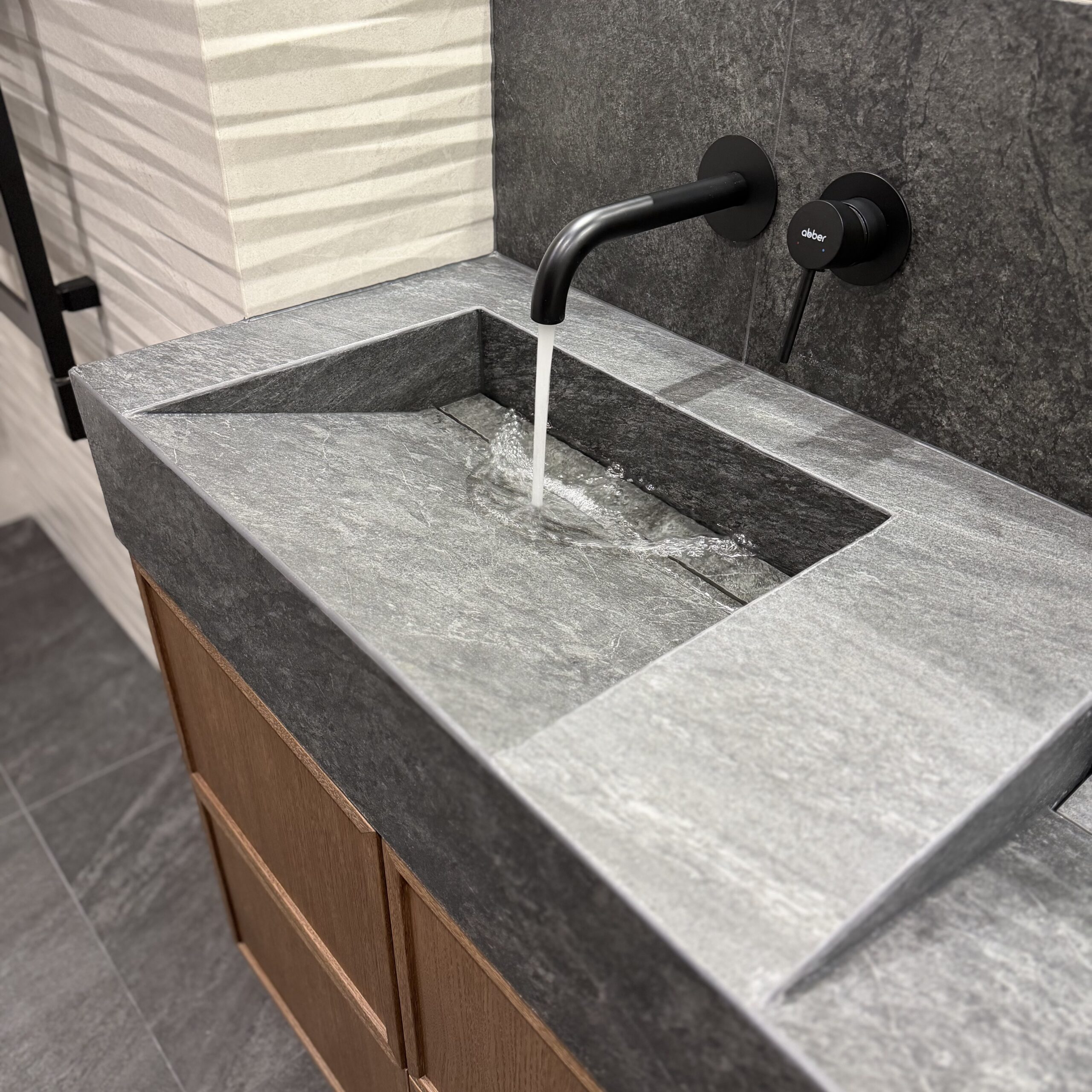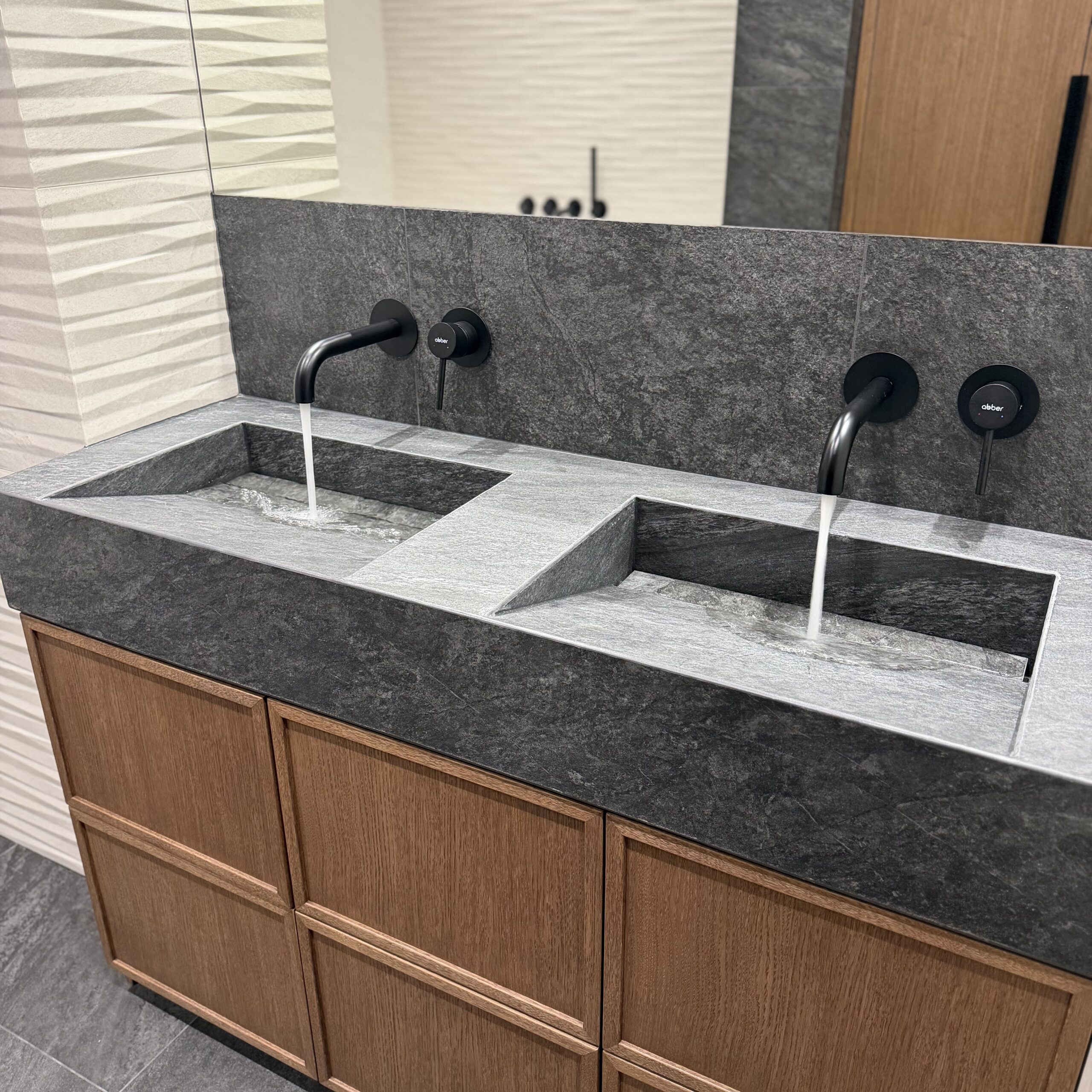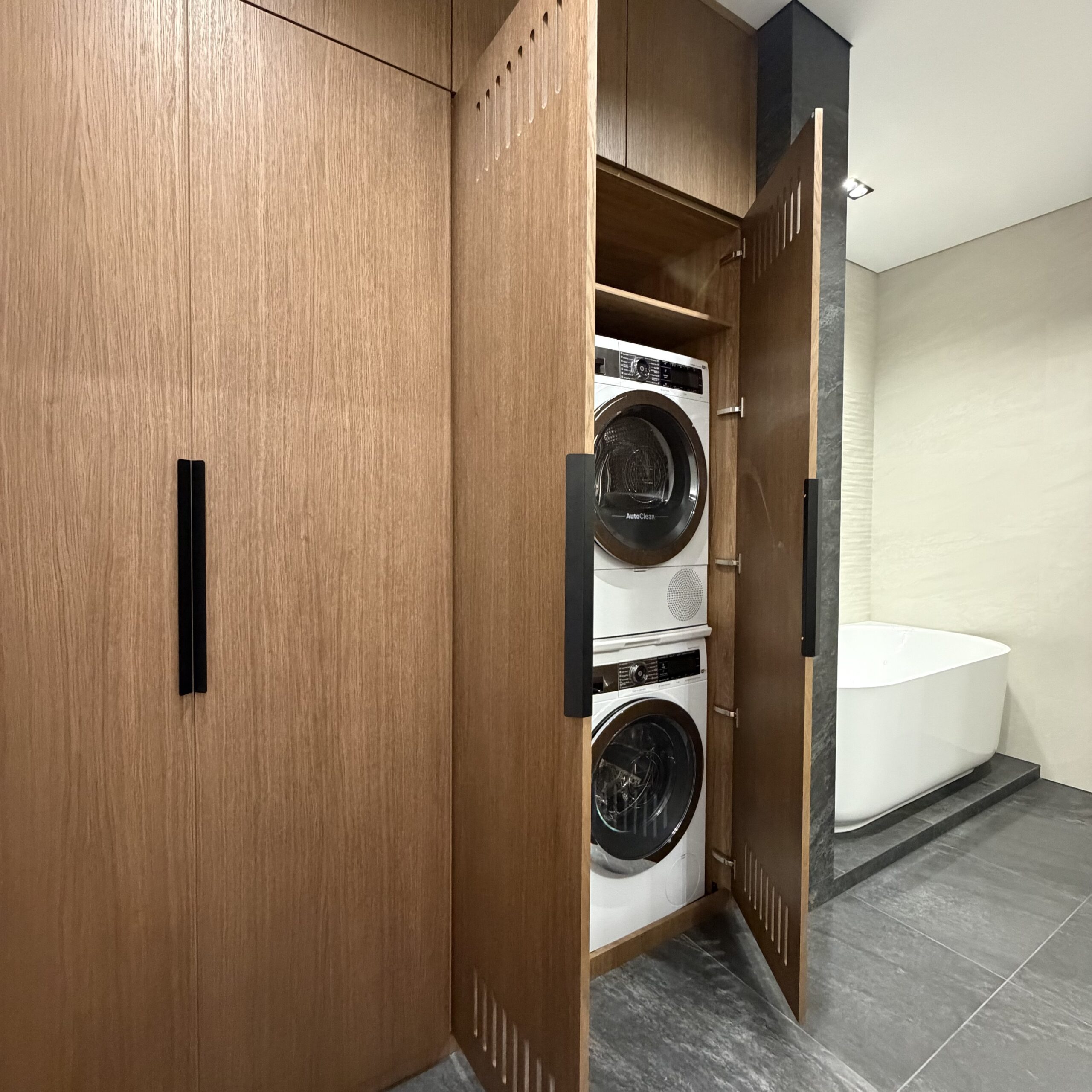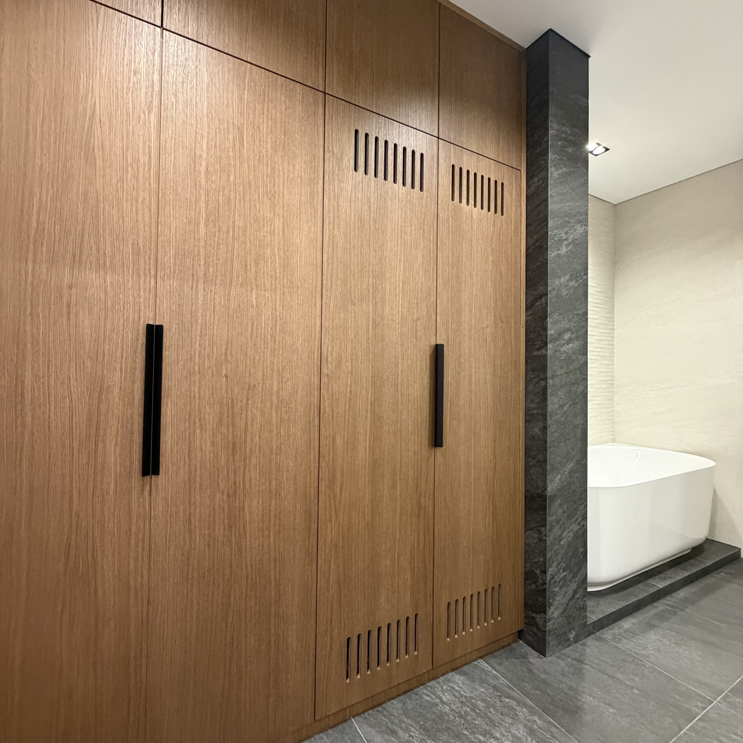 Цельная композиция, где каждая деталь подчинена чистоте линий и логике пространства. Тумба под раковину выполнена в шпоне дуба с рамкой из массива — чёткая геометрия, выразительная текстура и ощущение основательности. Рядом — шкаф для хранения в том же шпоне, с деликатной фрезеровкой, которая обеспечивает естественную вентиляцию и сохраняет аккуратный внешний вид.