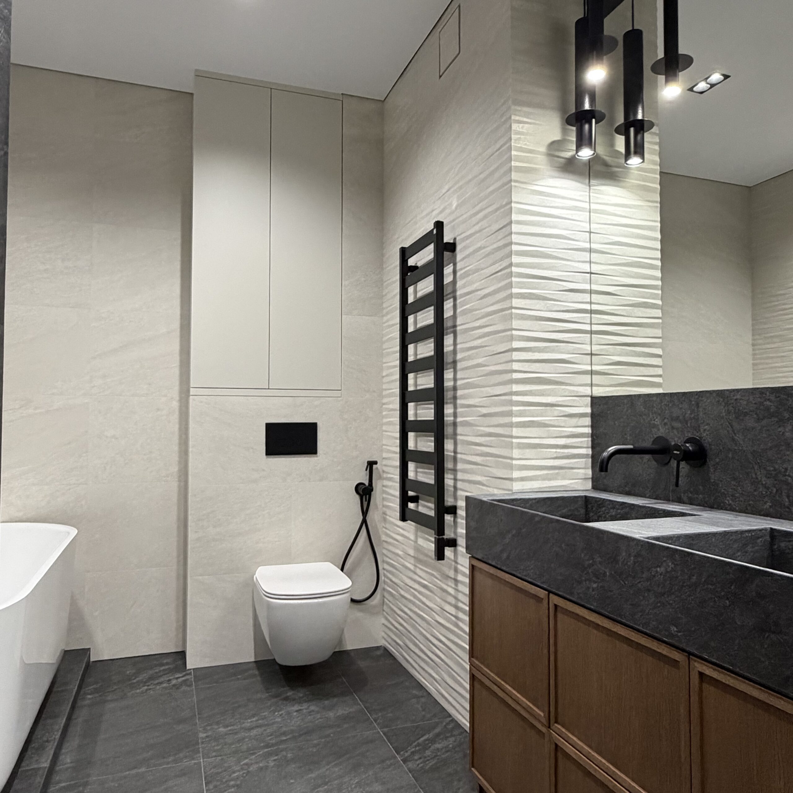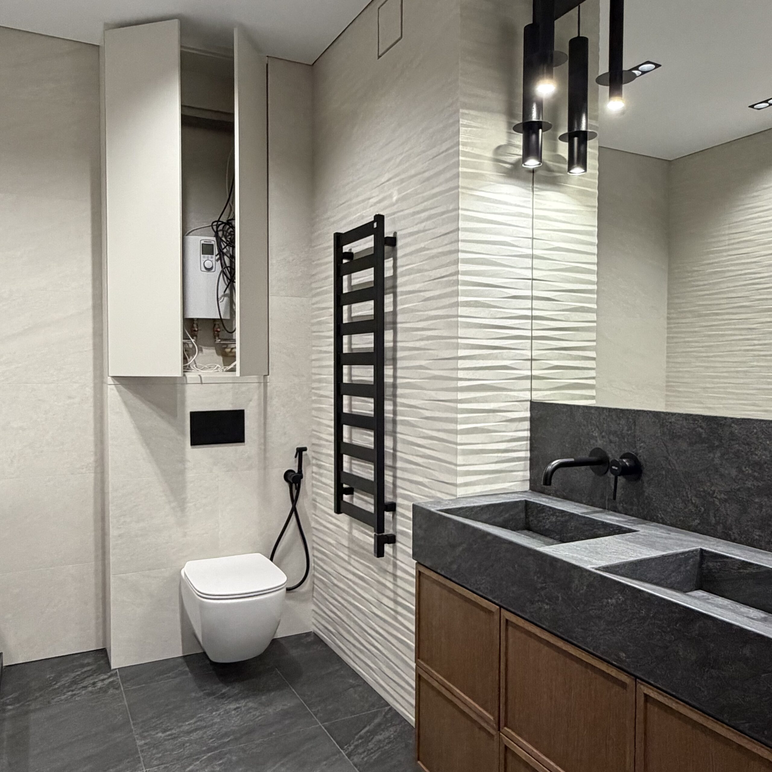 Встроенный шкаф в эмали скрывает коммуникации, оставляя интерьер визуально чистым и собранным. Все элементы точно интегрированы, без лишних деталей снаружи — только спокойные плоскости и выверенные пропорции.