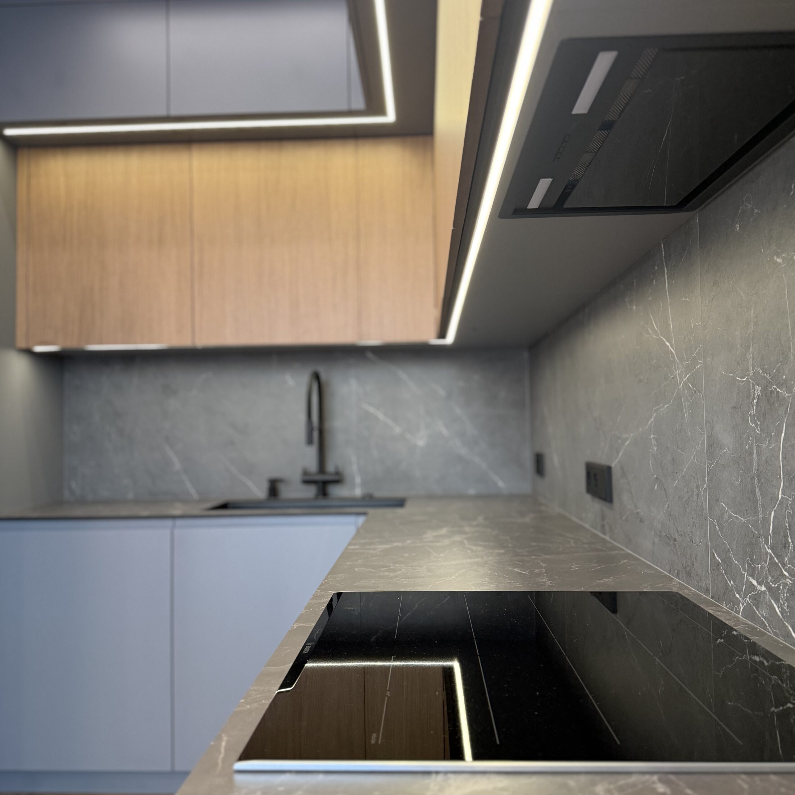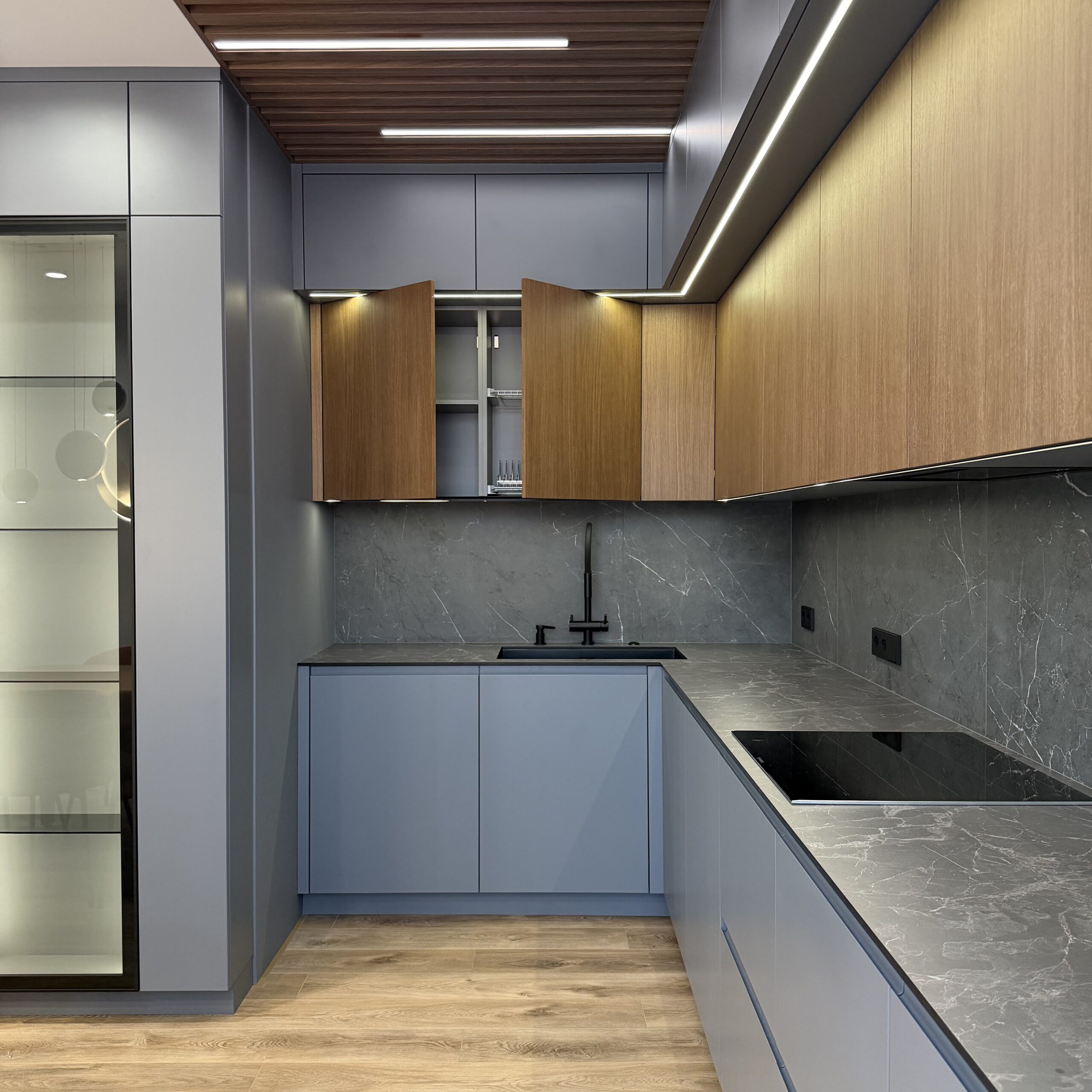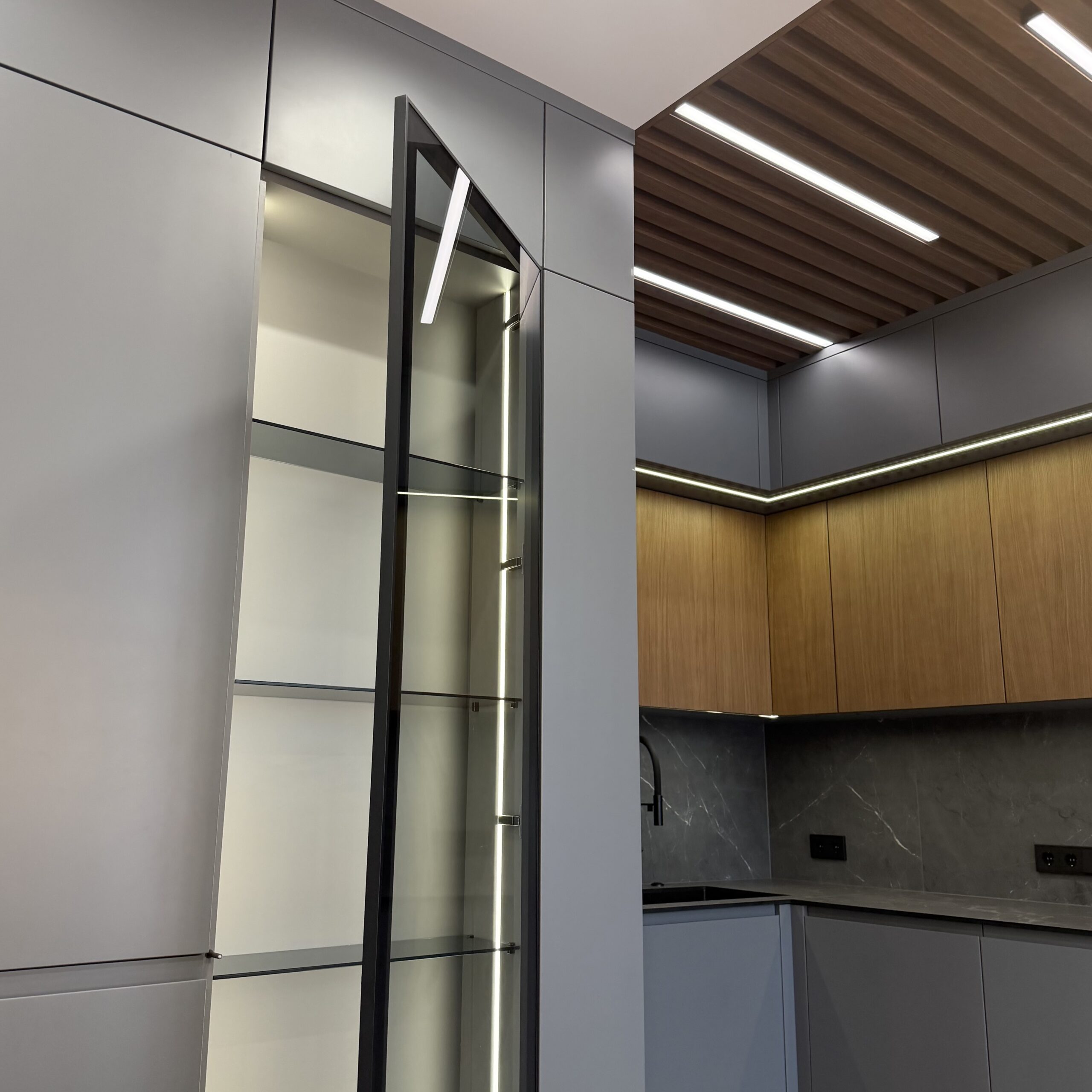 Вся техника интегрирована и скрыта — холодильник растворяется в линии фасадов, сохраняя безупречную целостность. Подсветка в рабочей зоне и витрине добавляет мягкое свечение, подчёркивая фактуры и создавая ощущение глубины и объёма.