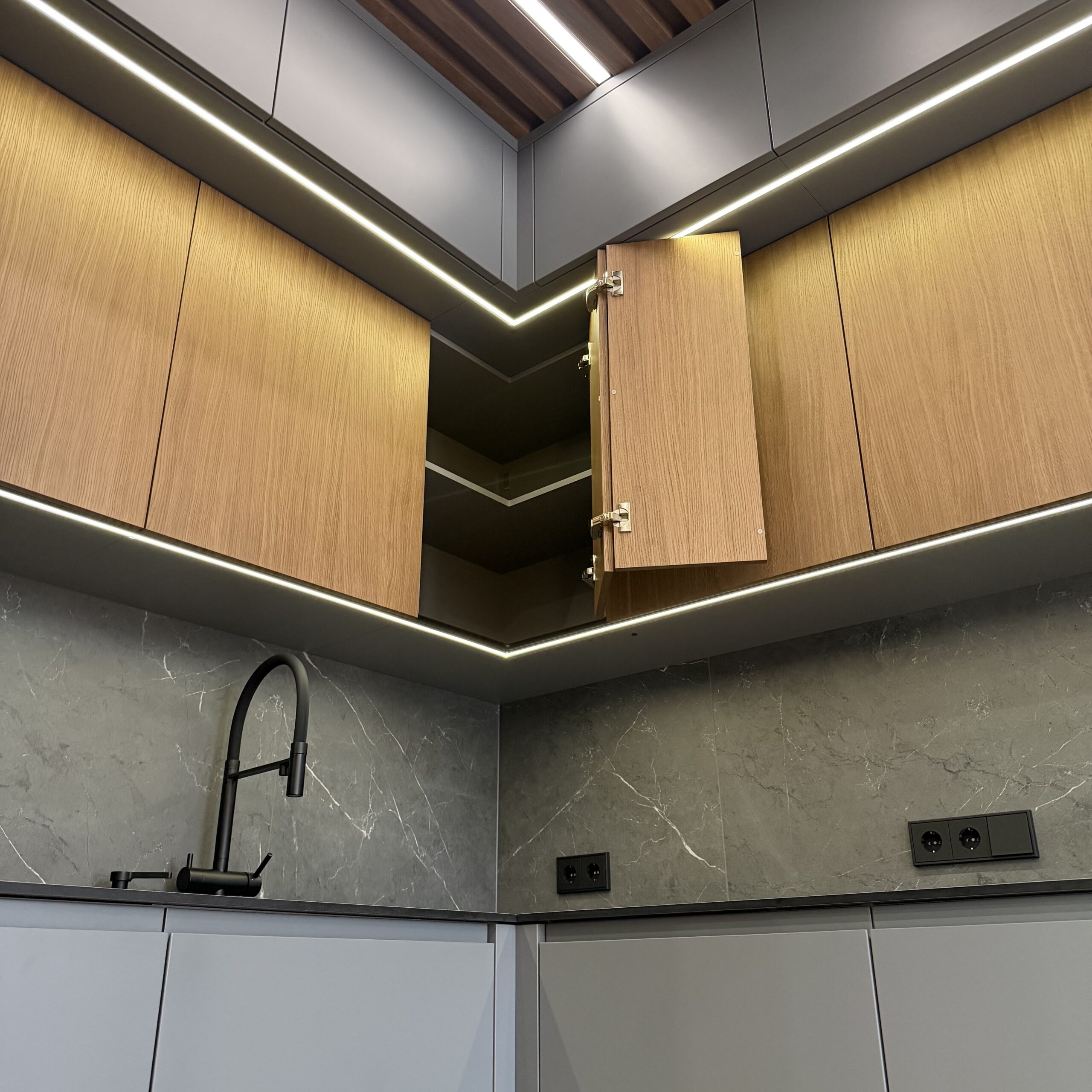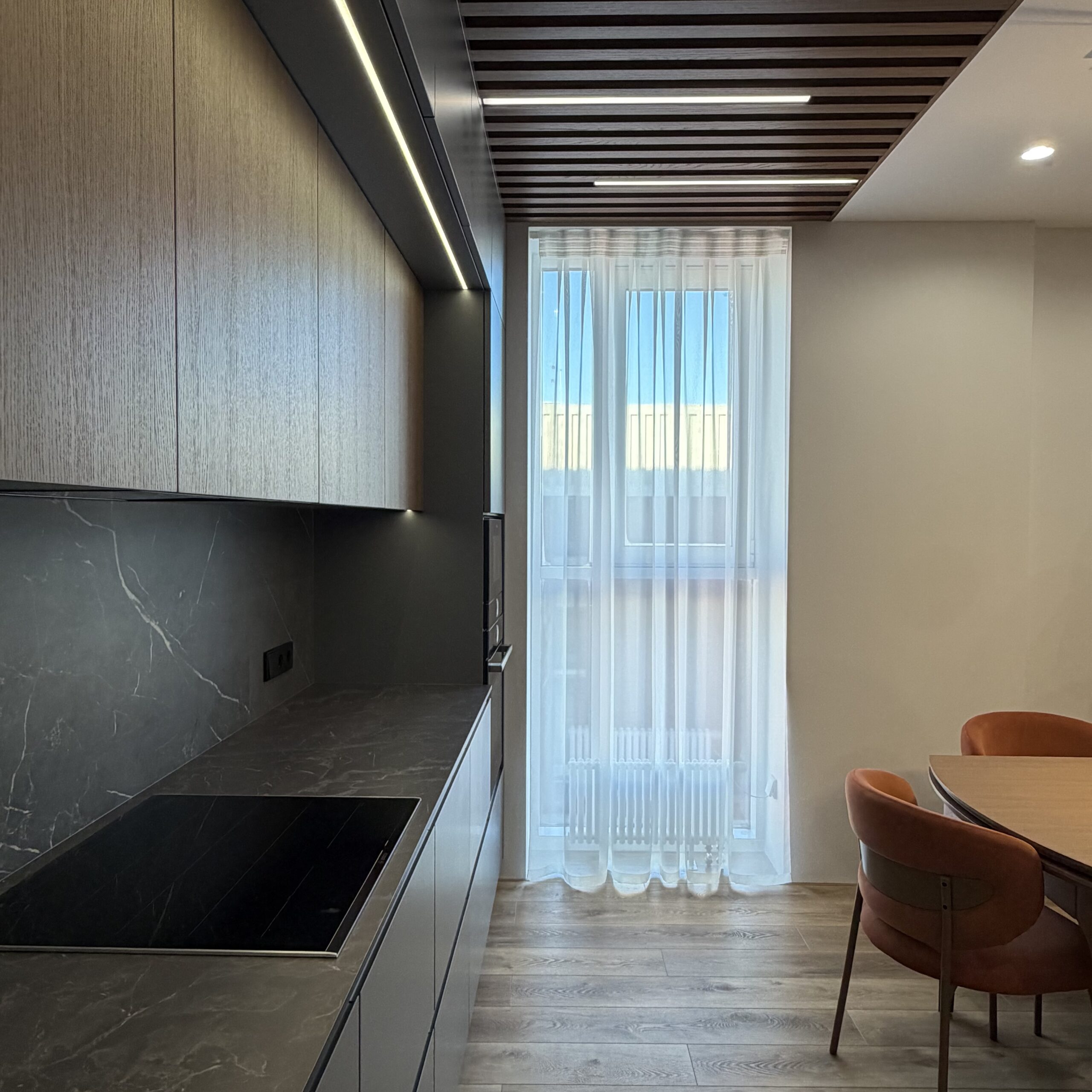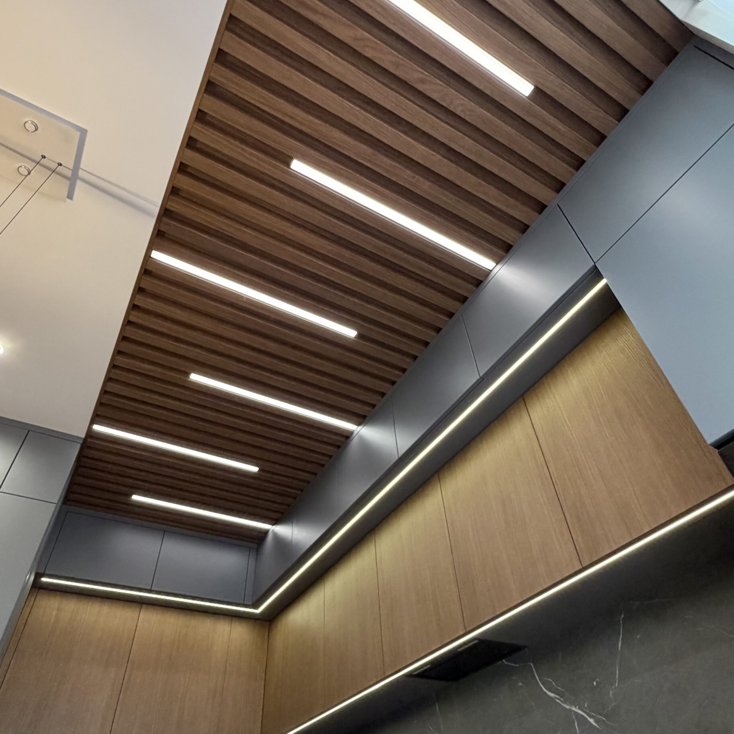 Кухня в ансамбле с потолком из шпона дуба / проект №124