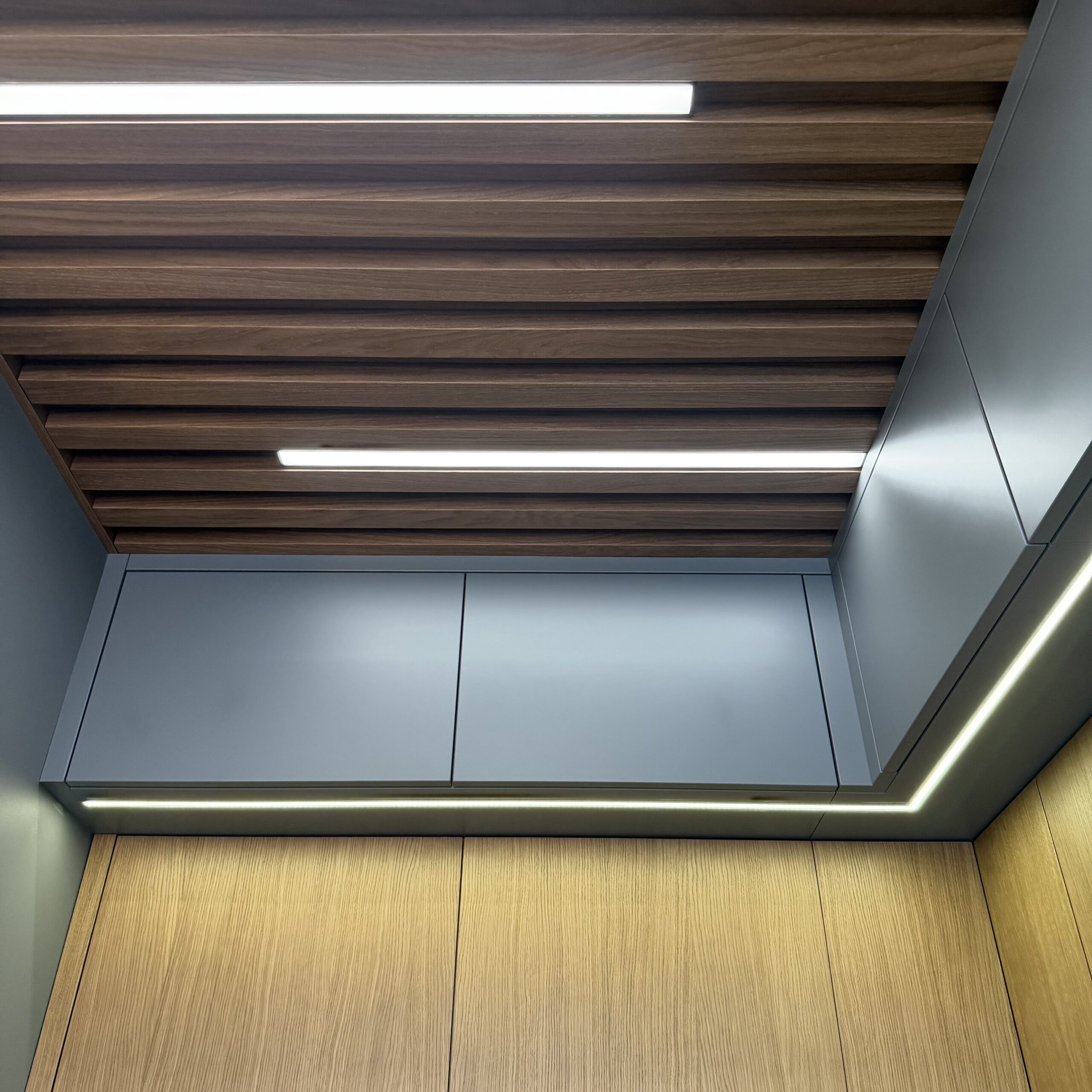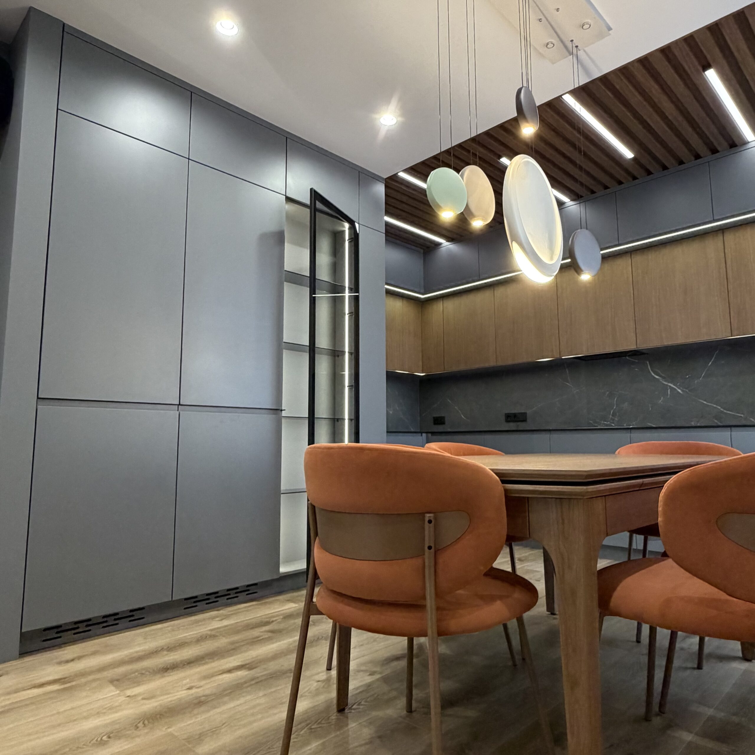 Цельная, выверенная композиция с чистым, дорогим силуэтом. Фасады из МДФ в шпоне и эмали создают благородный контраст: тёплая глубина дерева и гладкие матовые поверхности формируют спокойный, статусный интерьер.