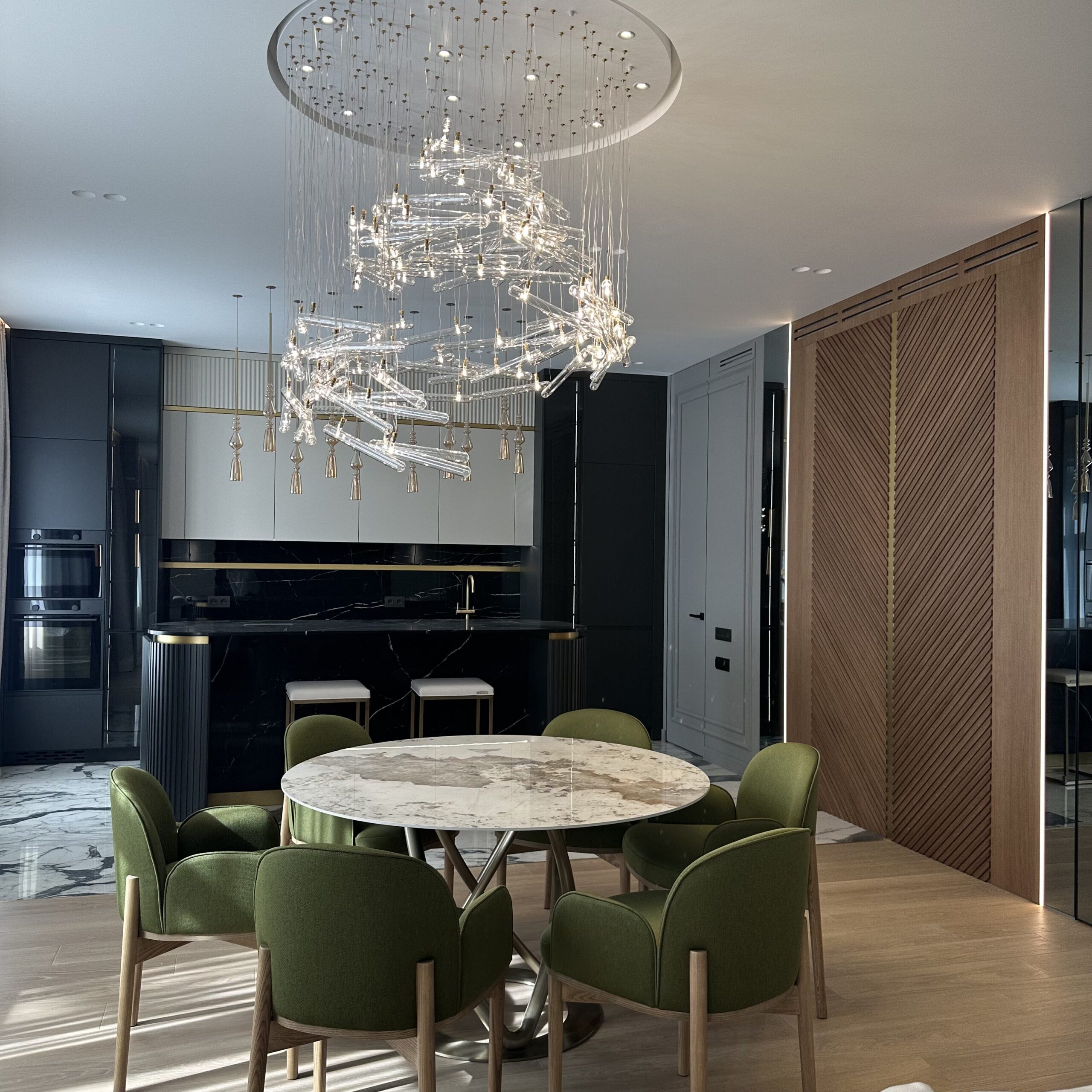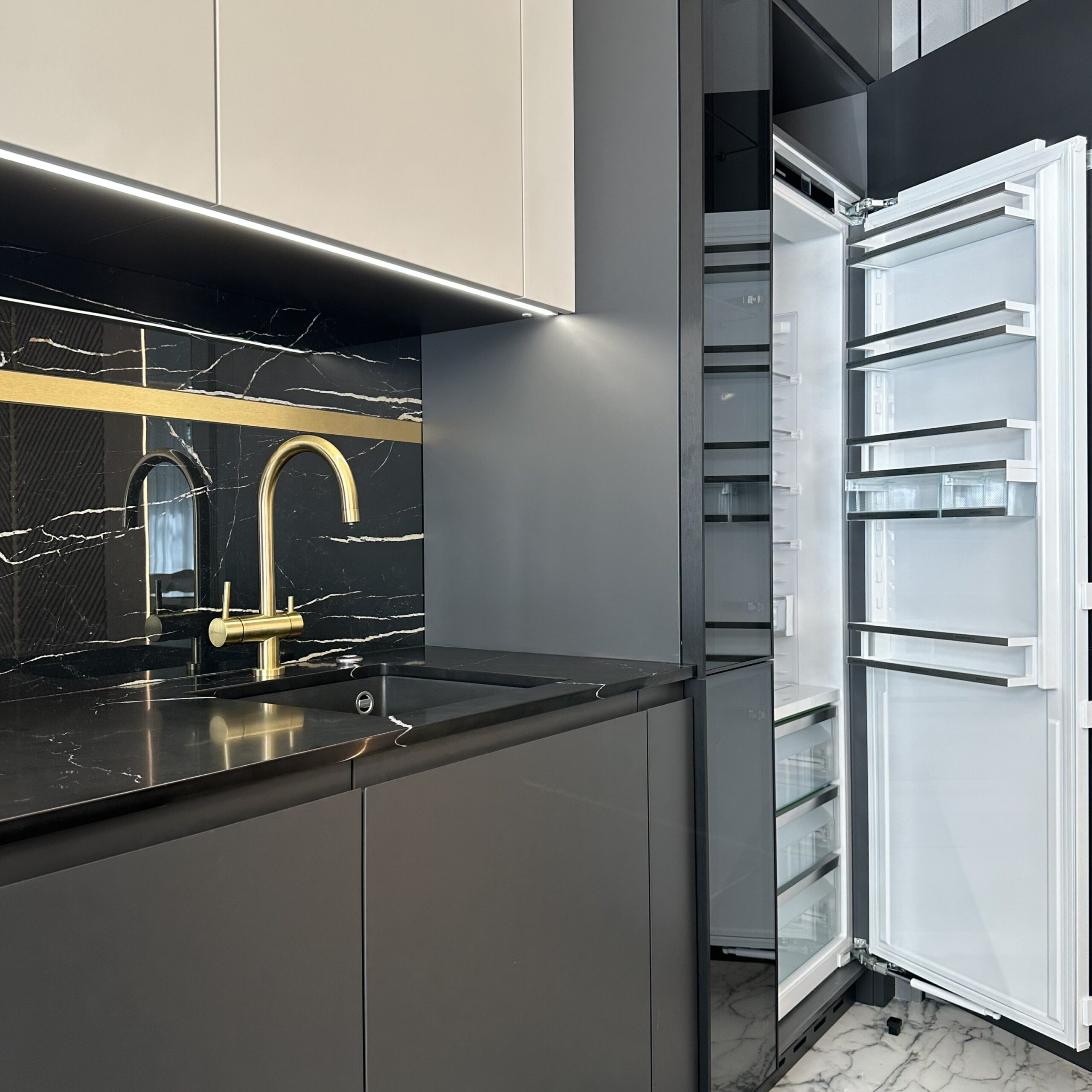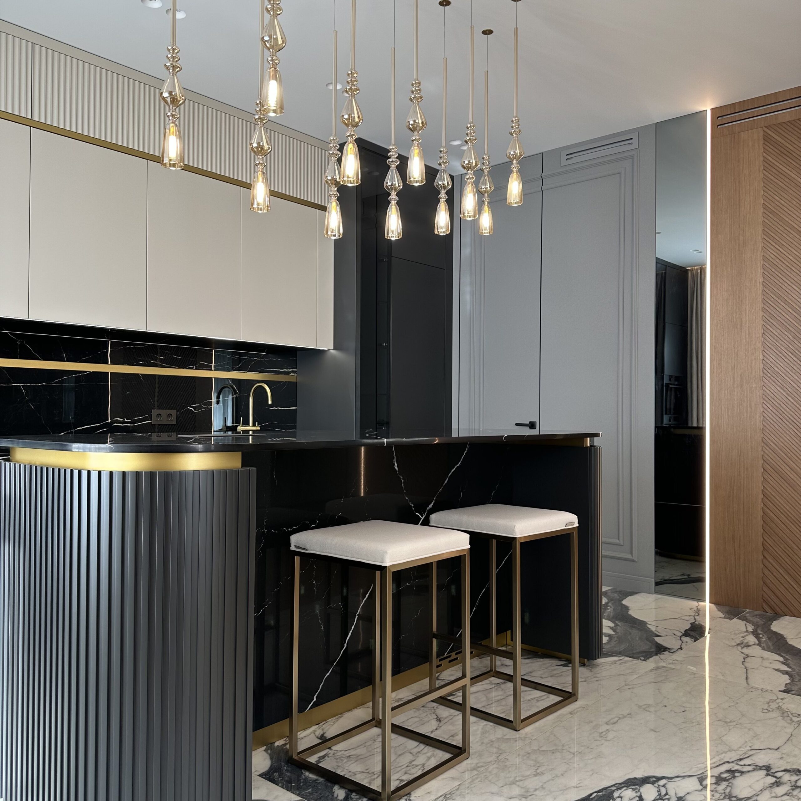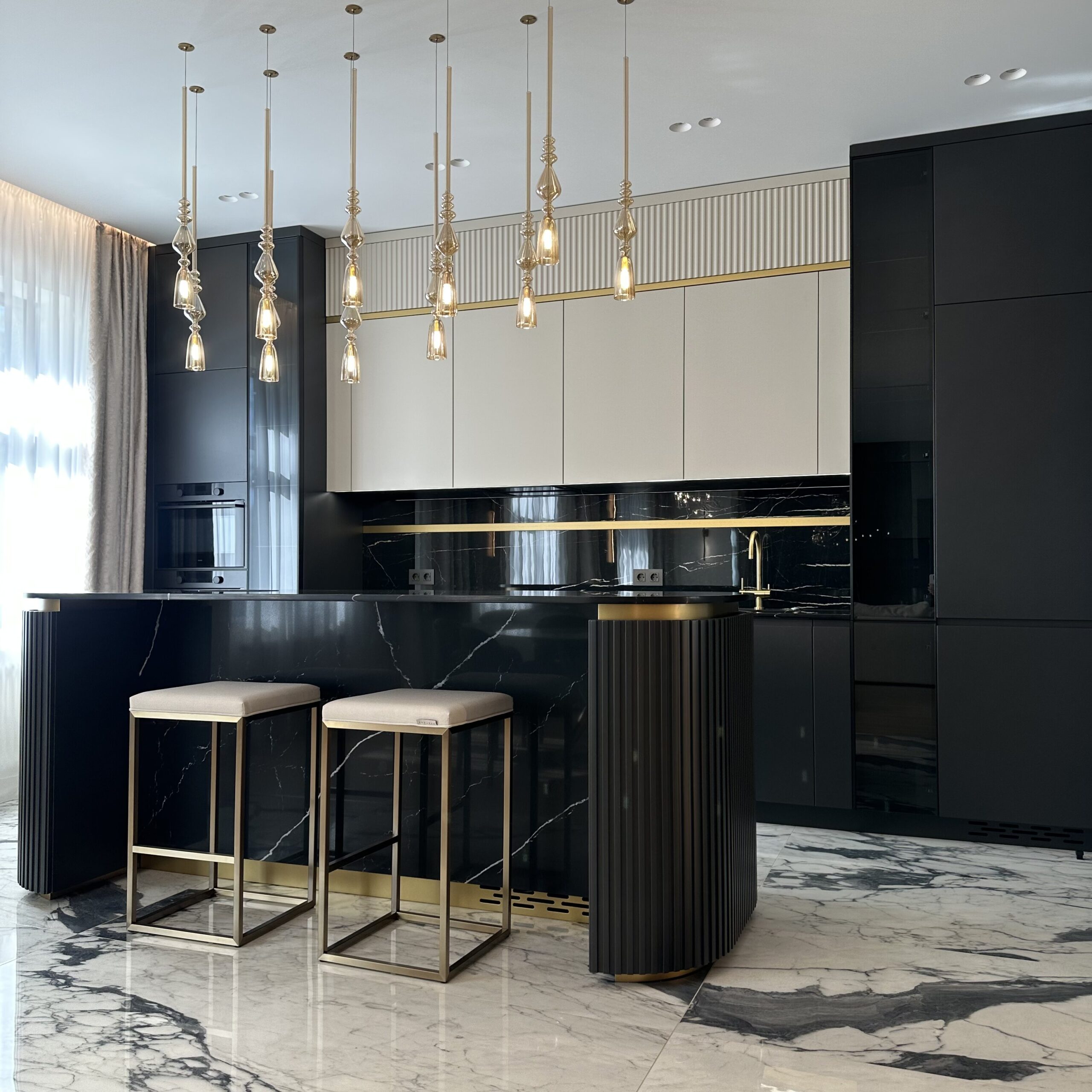 Кухонный остров с утончённой латунной вставкой и витринами из благородного тонированного стекла становится истинным сердцем кухонного пространства. Фасадная часть с изящной фрезеровкой создаёт неповторимую игру света и тени, придавая интерьеру глубину и структурность. Кварцевая столешница, словно драгоценный камень, подчёркивает благородство форм и добавляет композиции особую торжественность. Благородный блеск металла в сочетании с плавными, отточенными линиями рождает атмосферу современной неоклассики, где каждая деталь говорит о безупречном вкусе и статусе.