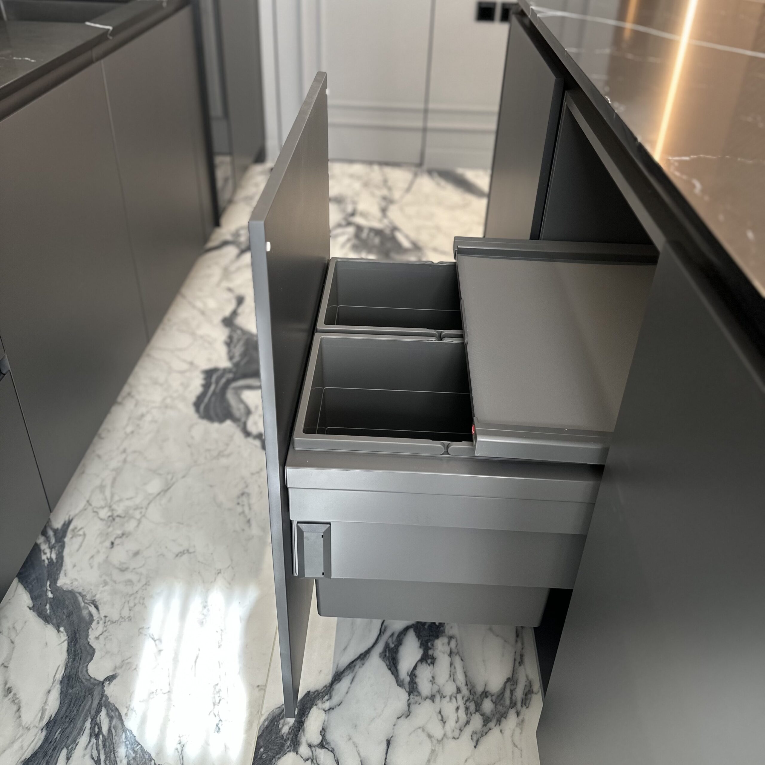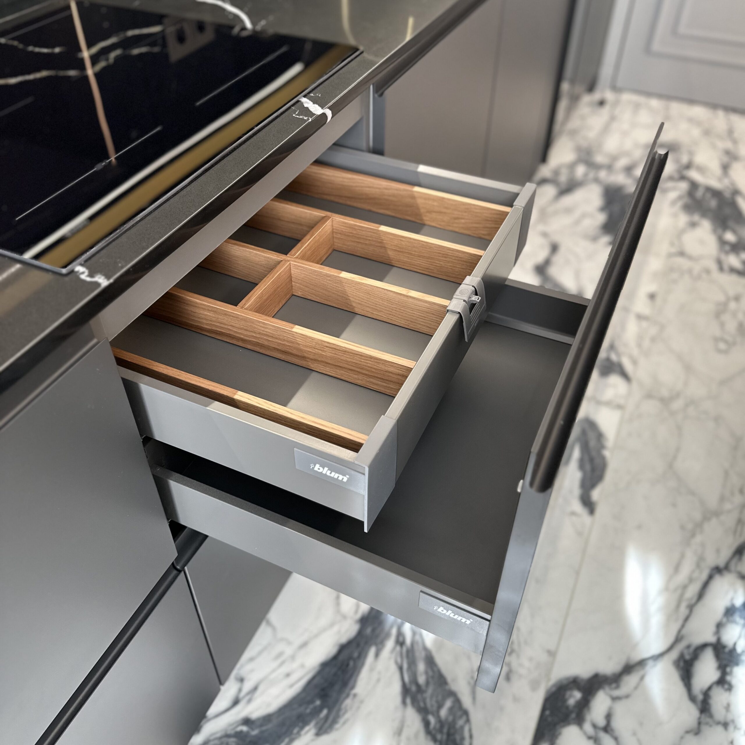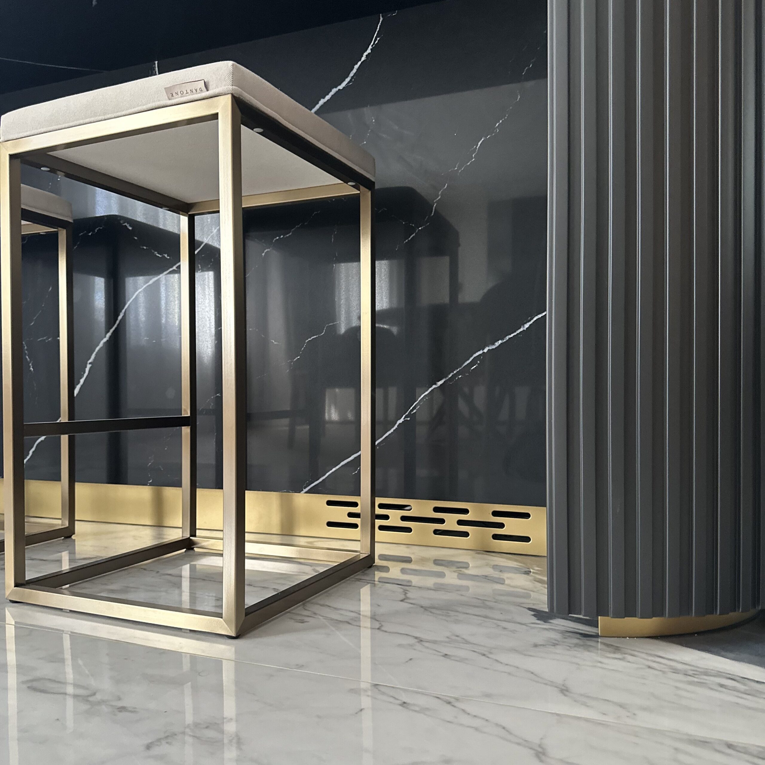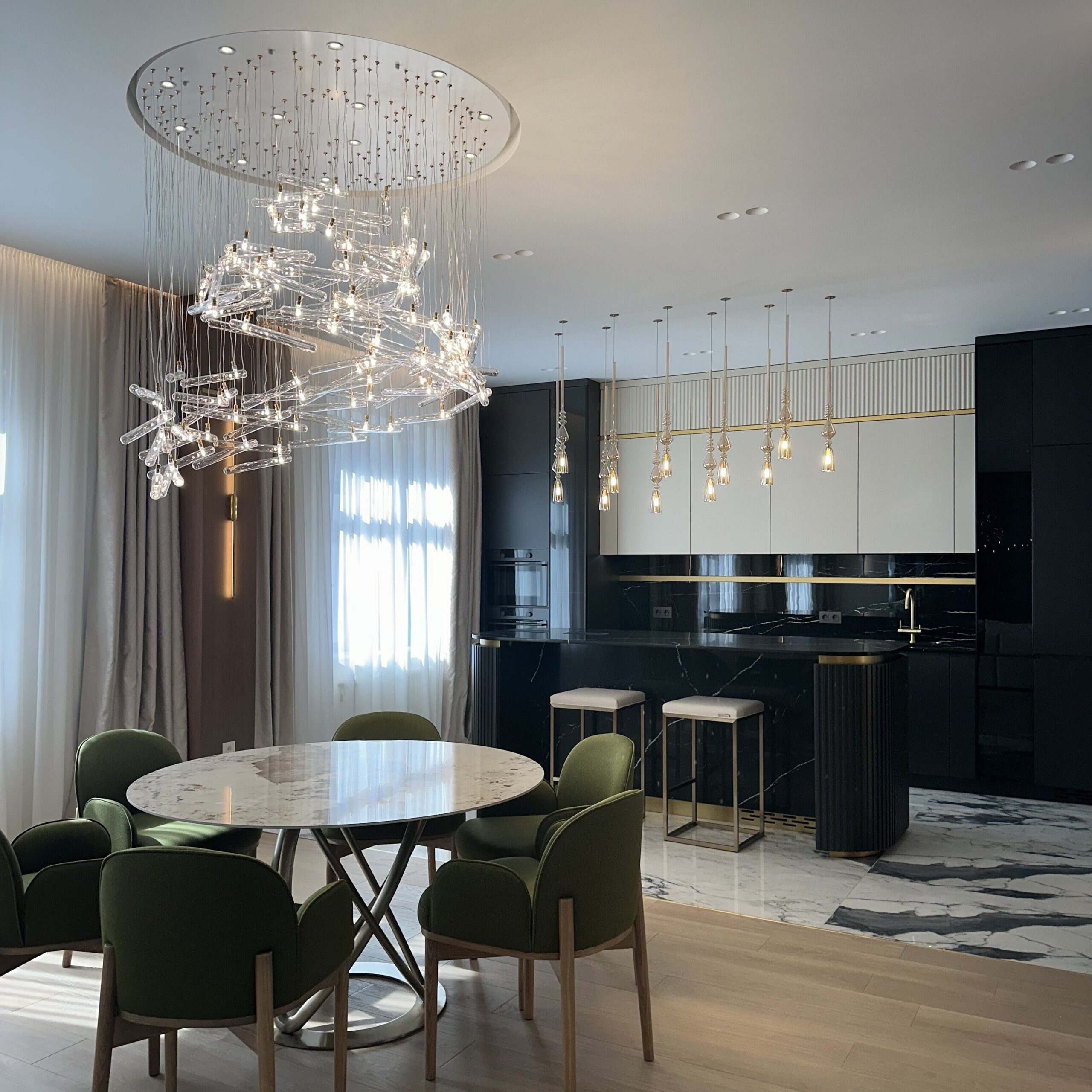Кухонный остров с утончённой латунной вставкой и витринами из благородного тонированного стекла становится истинным сердцем кухонного пространства. Фасадная часть с изящной фрезеровкой создаёт неповторимую игру света и тени, придавая интерьеру глубину и структурность. Кварцевая столешница, словно драгоценный камень, подчёркивает благородство форм и добавляет композиции особую торжественность. Благородный блеск металла в сочетании с плавными, отточенными линиями рождает атмосферу современной неоклассики, где каждая деталь говорит о безупречном вкусе и статусе.