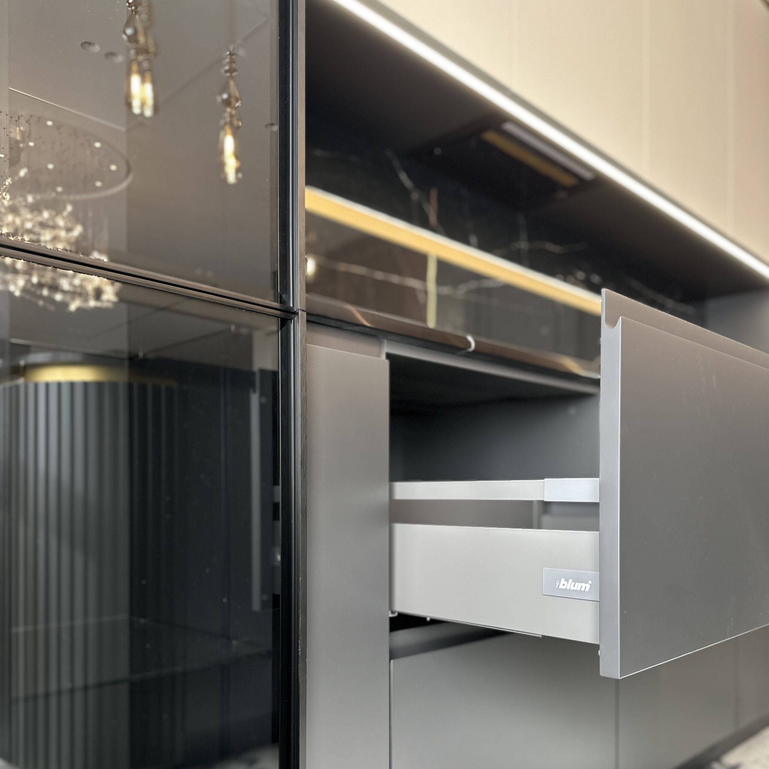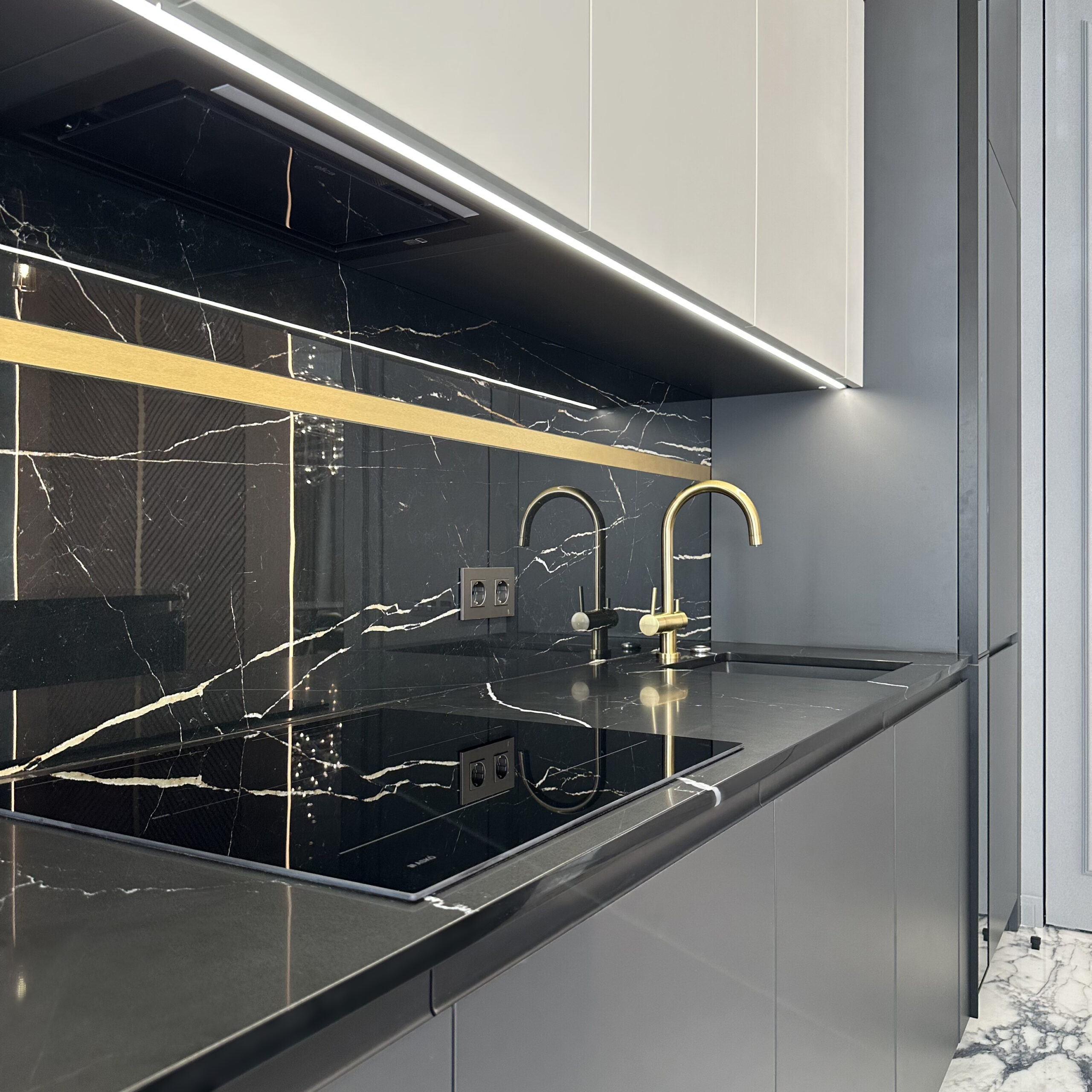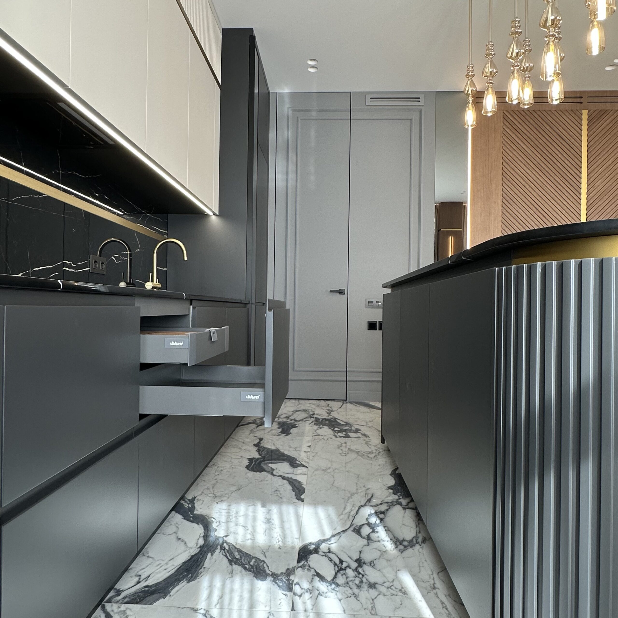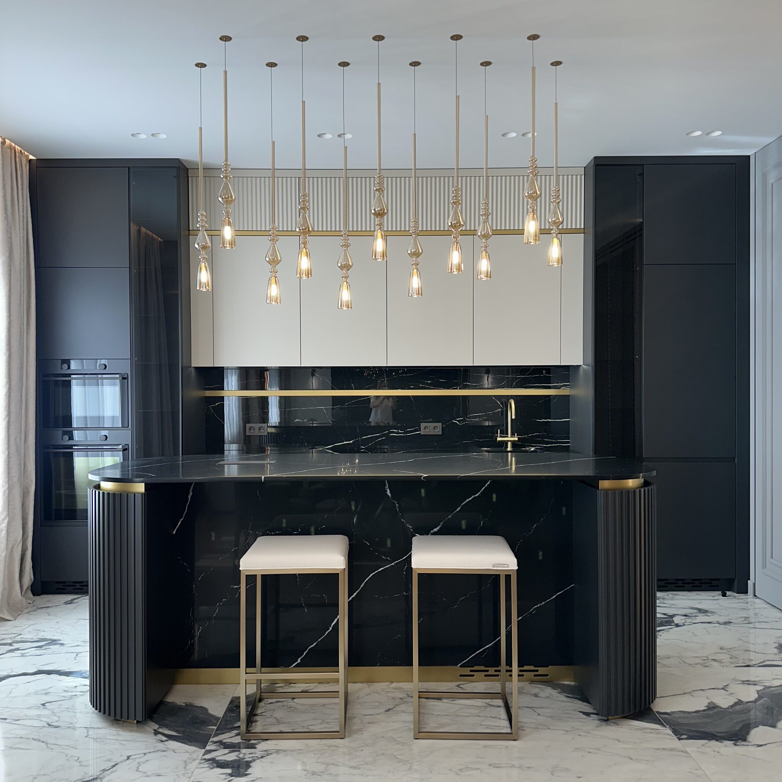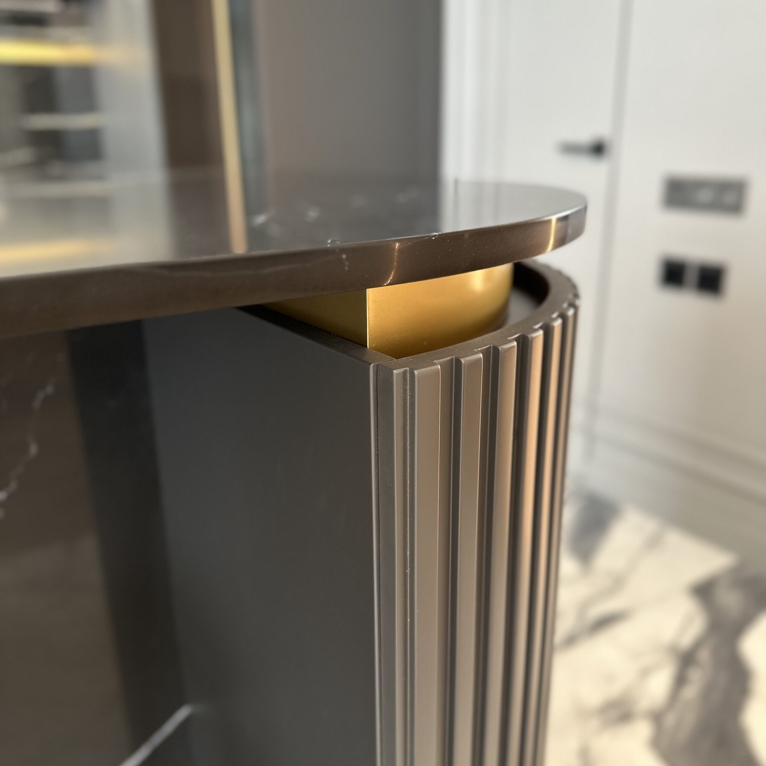 Кухонный остров с утончённой латунной вставкой и витринами из благородного тонированного стекла становится истинным сердцем кухонного пространства. Фасадная часть с изящной фрезеровкой создаёт неповторимую игру света и тени, придавая интерьеру глубину и структурность. Кварцевая столешница, словно драгоценный камень, подчёркивает благородство форм и добавляет композиции особую торжественность. Благородный блеск металла в сочетании с плавными, отточенными линиями рождает атмосферу современной неоклассики, где каждая деталь говорит о безупречном вкусе и статусе.