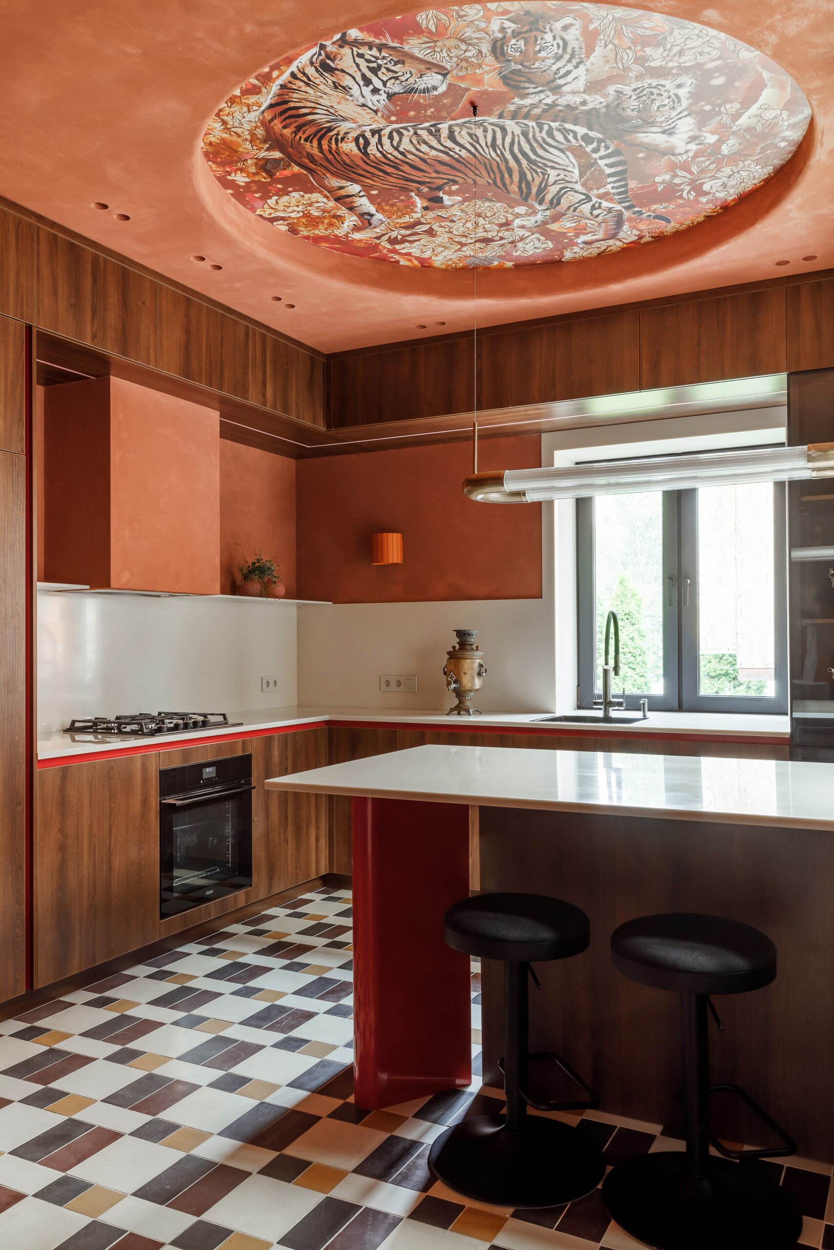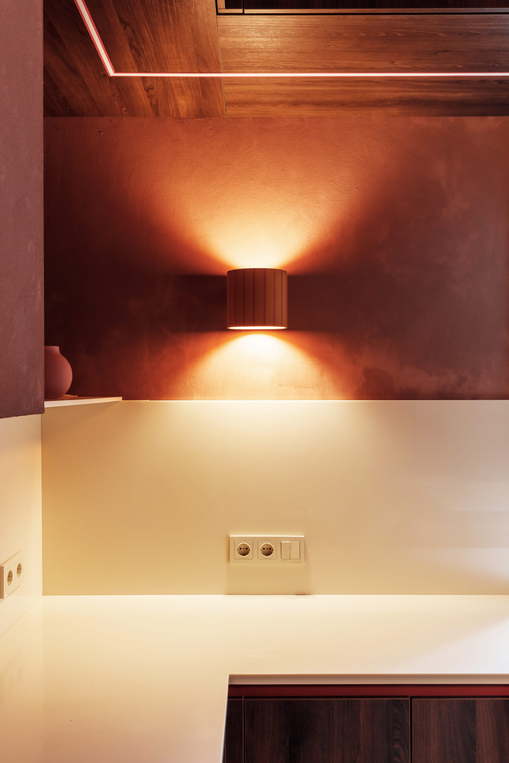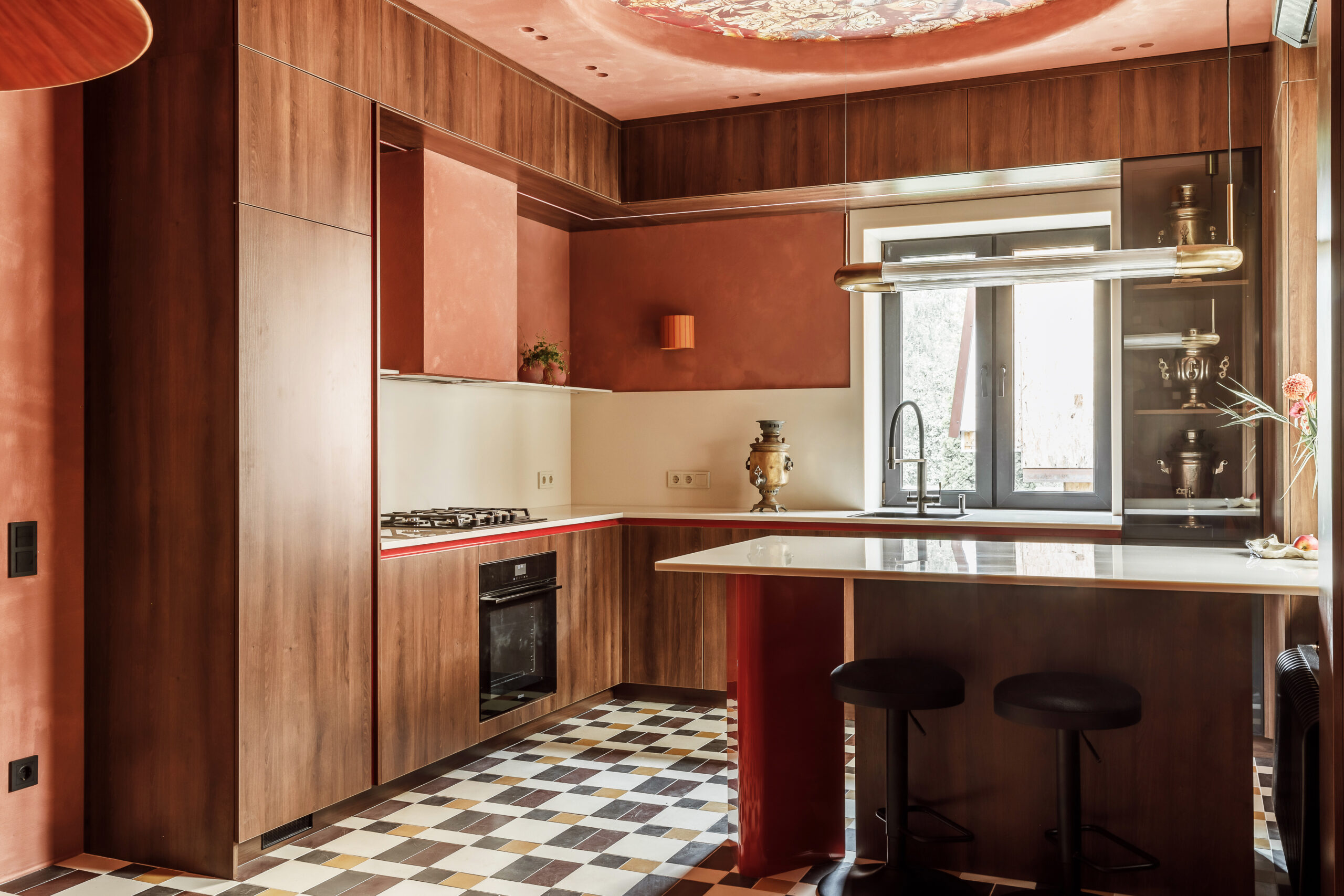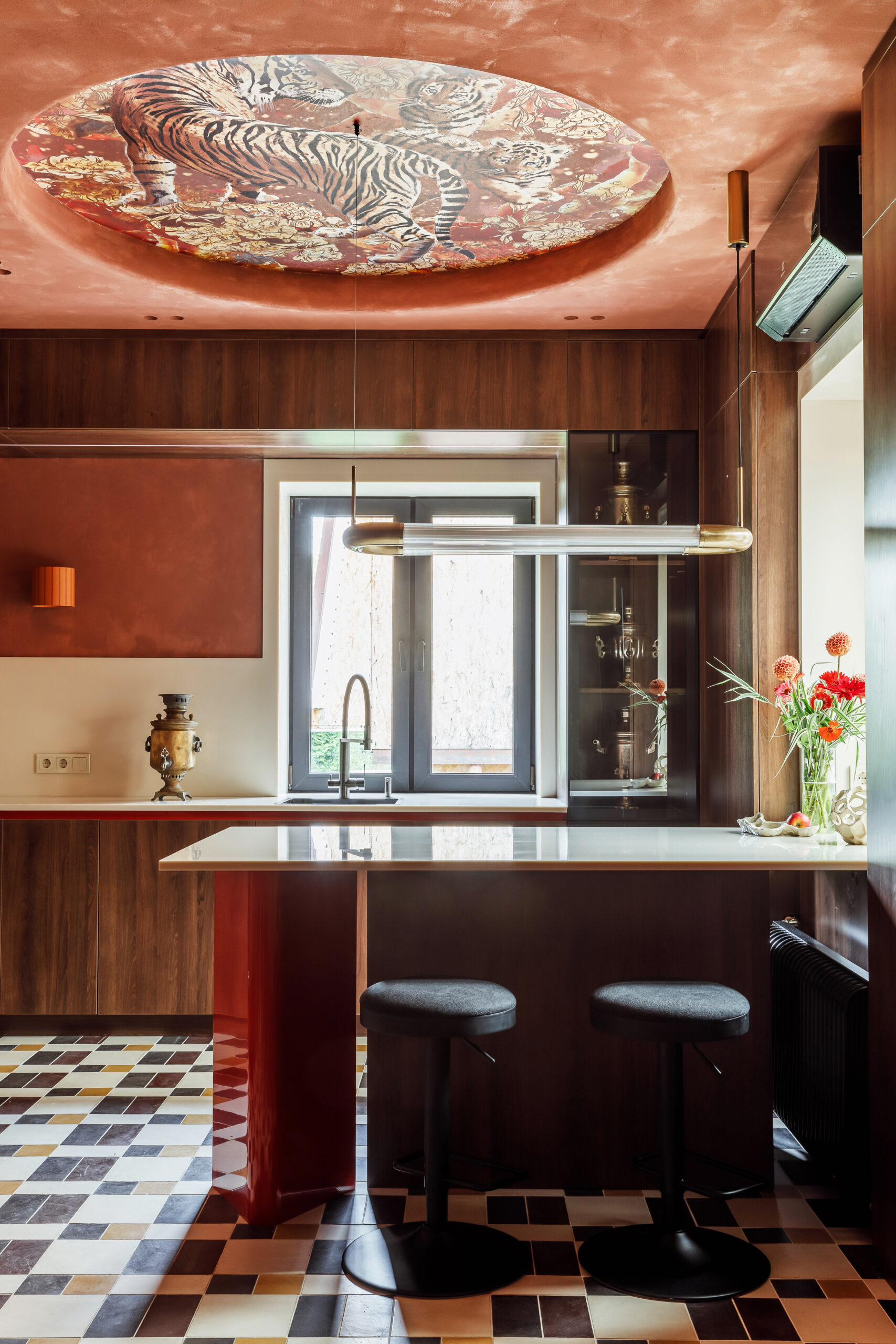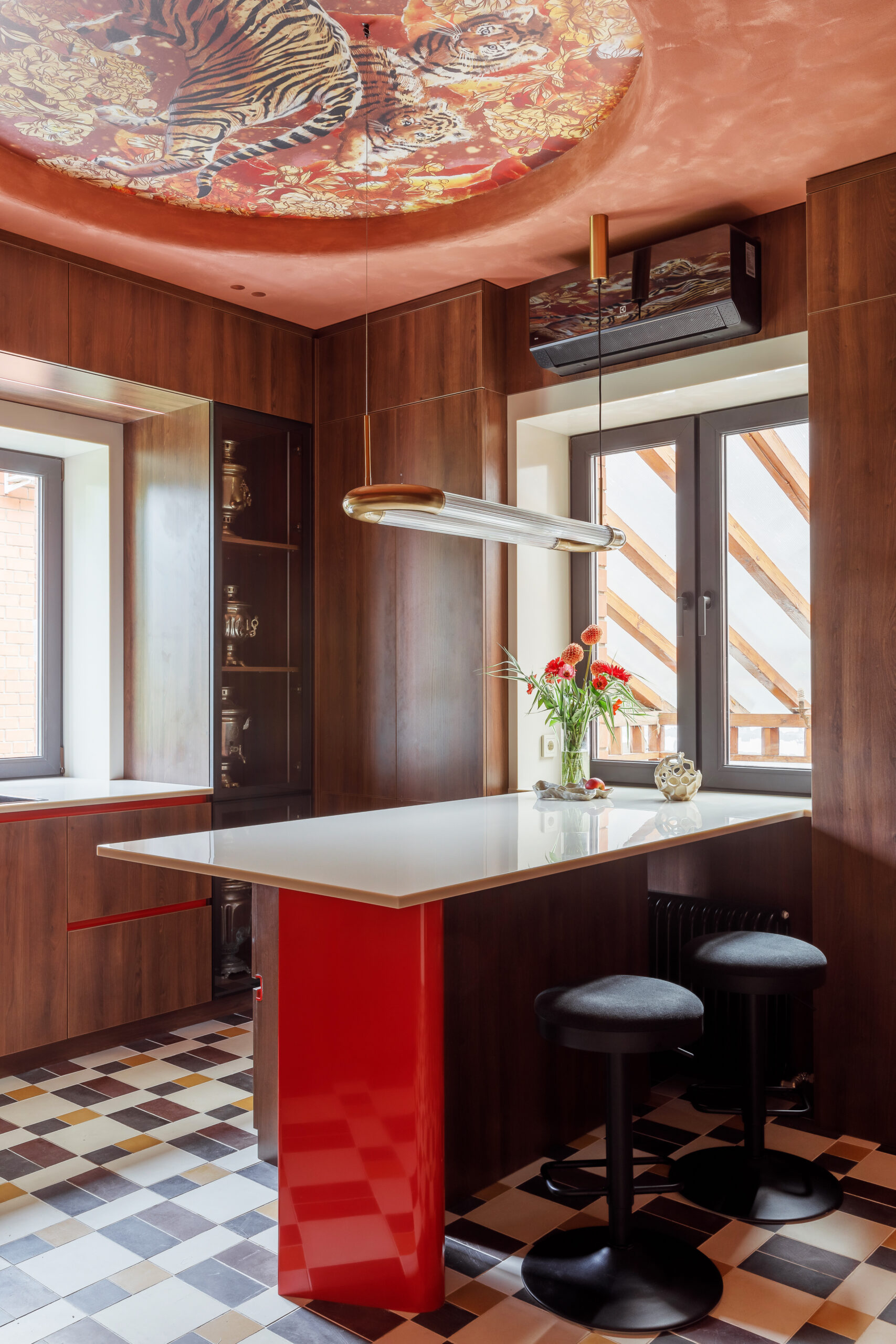 Особое внимание заслуживает профильная ручка, окрашенная в тон камня кухонного острова — она подчёркивает общий характер кухни и придаёт ей завершённый, дизайнерский вид. Такая деталь делает мебель не только эстетически привлекательной, но и удобной в использовании. Вся композиция выглядит дорого и сбалансированно: это кухня, где функциональность встречается с утончённым стилем, а каждый элемент продуман до мелочей, чтобы создать идеальное пространство для жизни и вдохновения.