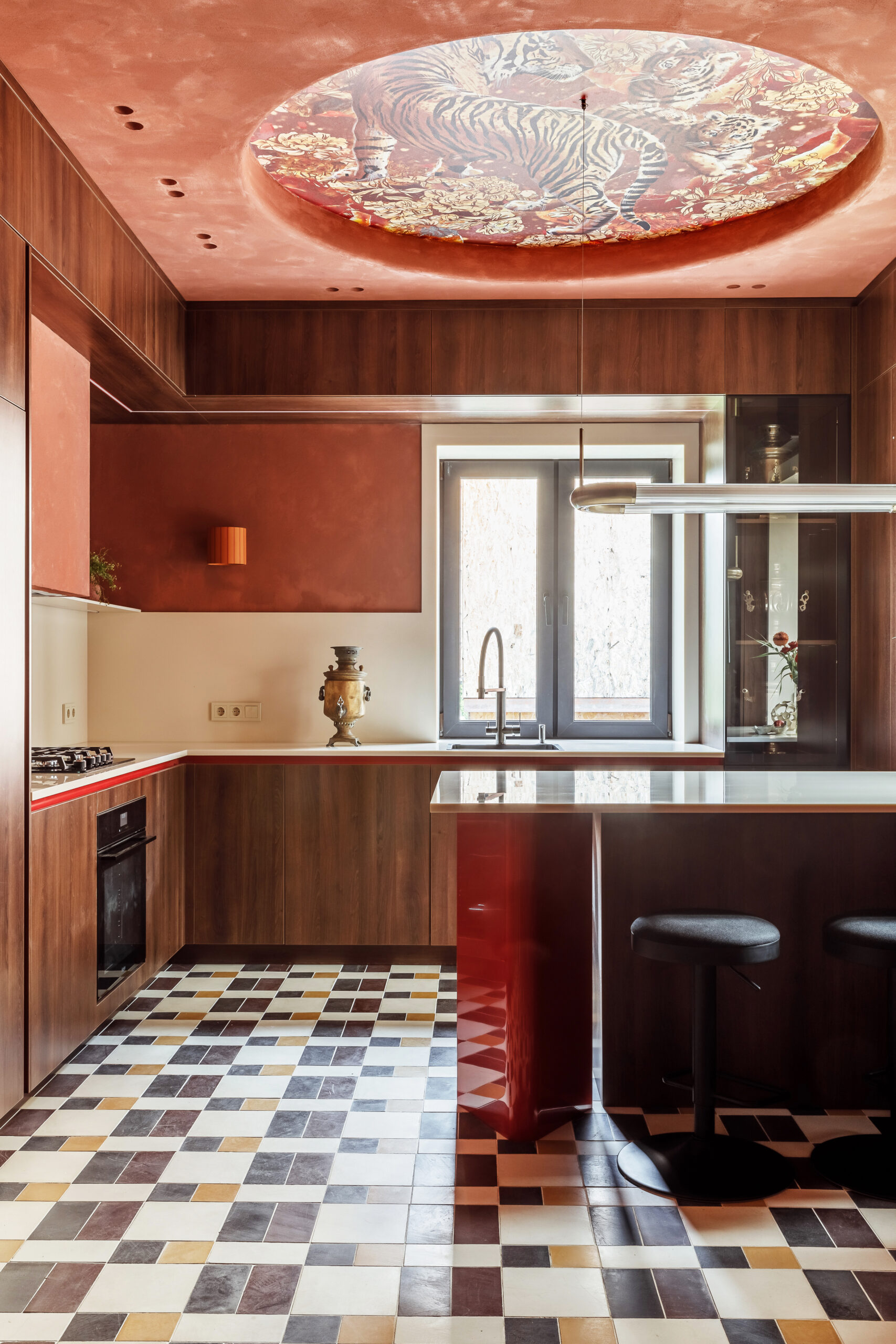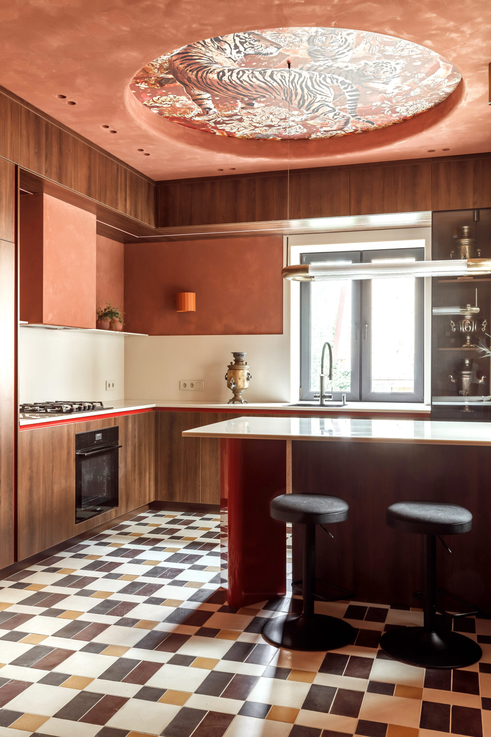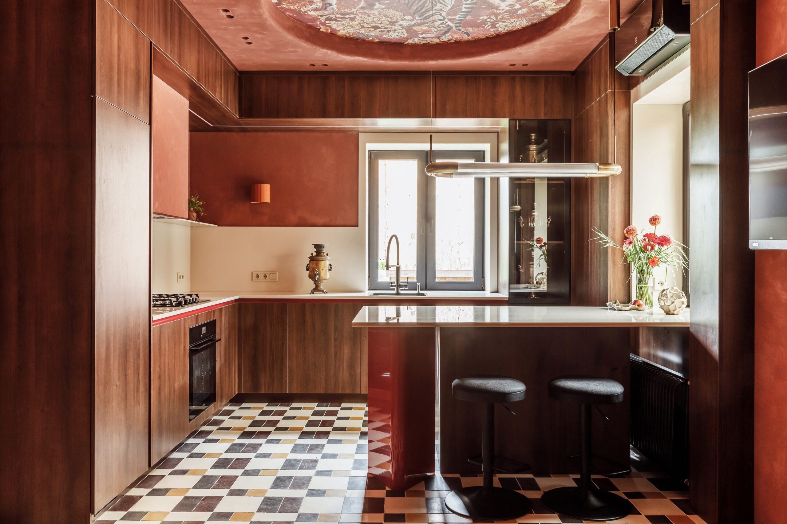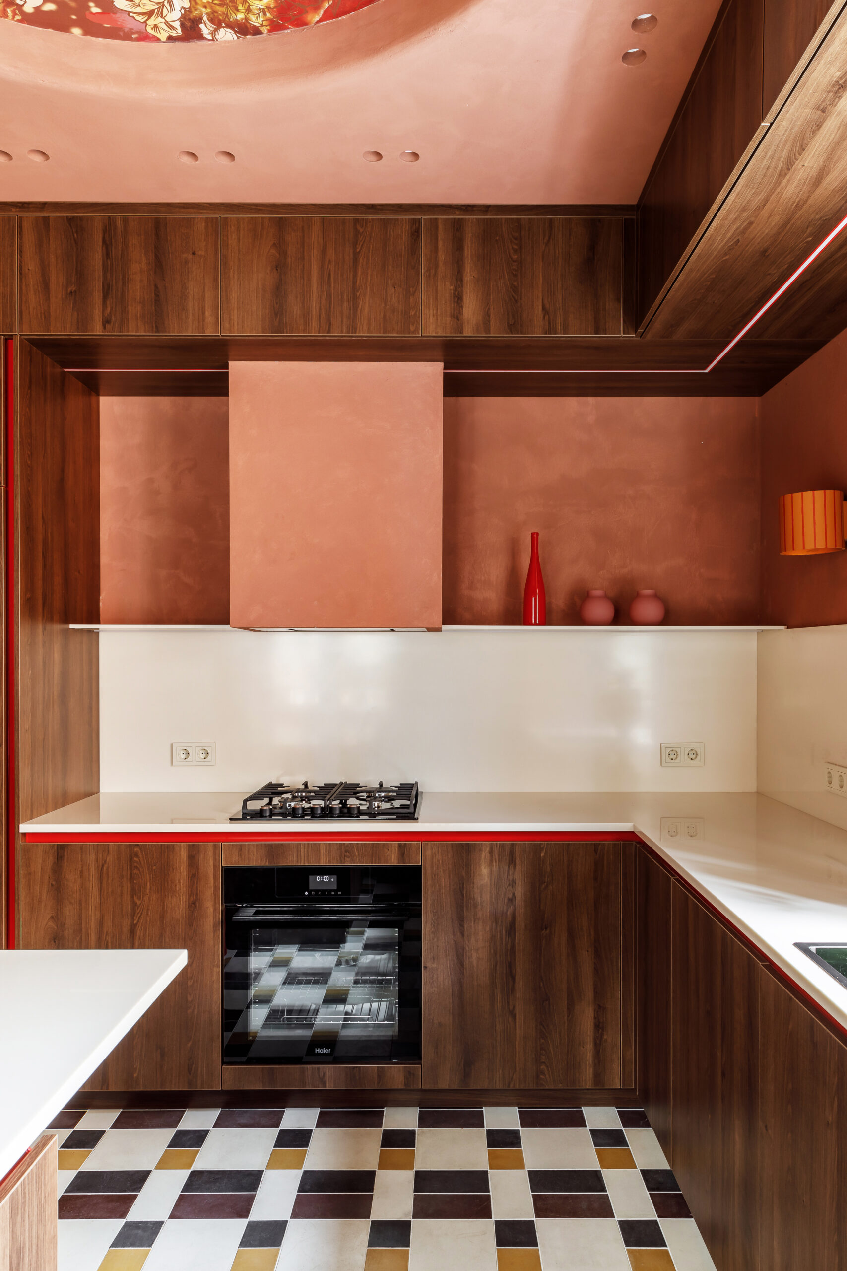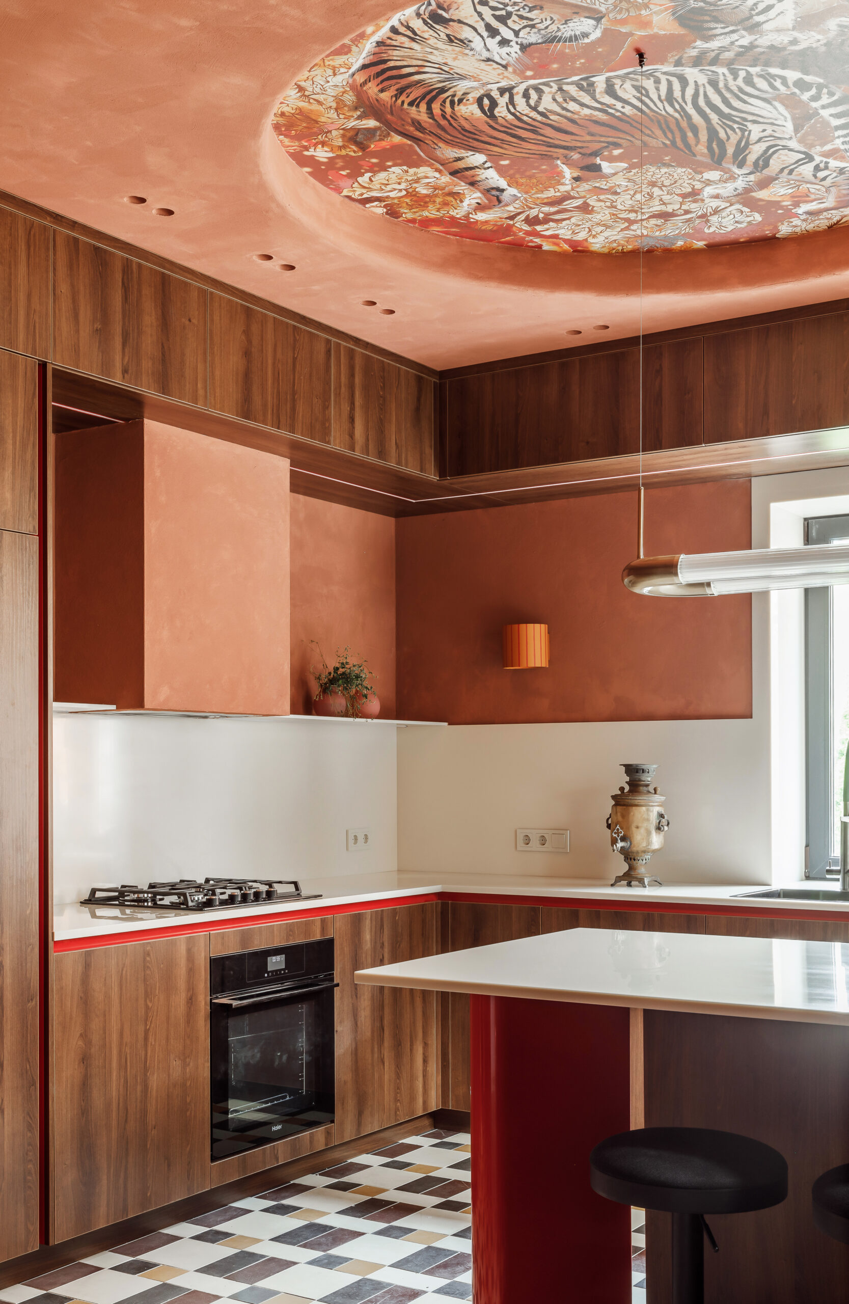 Особое внимание заслуживает профильная ручка, окрашенная в тон камня кухонного острова — она подчёркивает общий характер кухни и придаёт ей завершённый, дизайнерский вид. Такая деталь делает мебель не только эстетически привлекательной, но и удобной в использовании. Вся композиция выглядит дорого и сбалансированно: это кухня, где функциональность встречается с утончённым стилем, а каждый элемент продуман до мелочей, чтобы создать идеальное пространство для жизни и вдохновения.