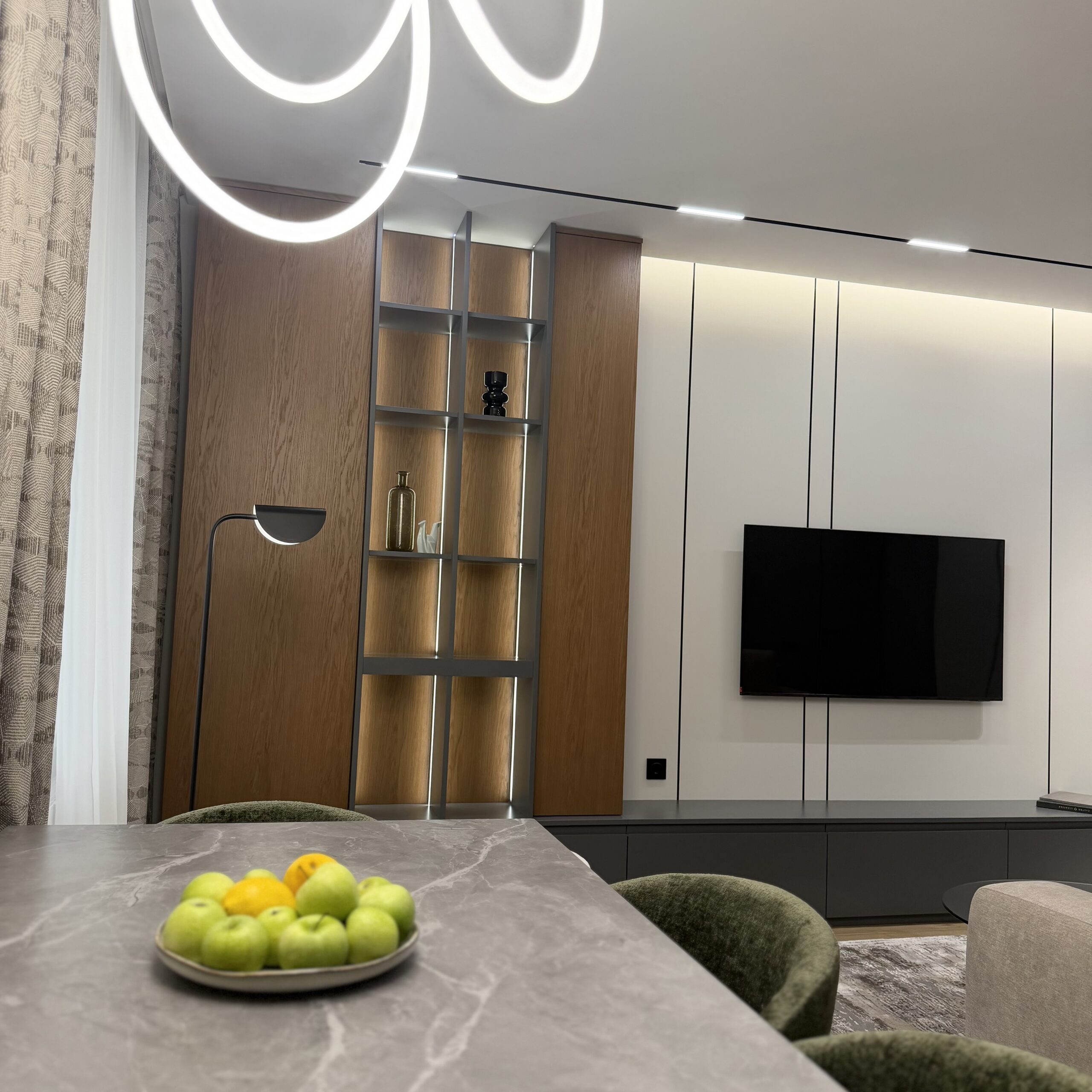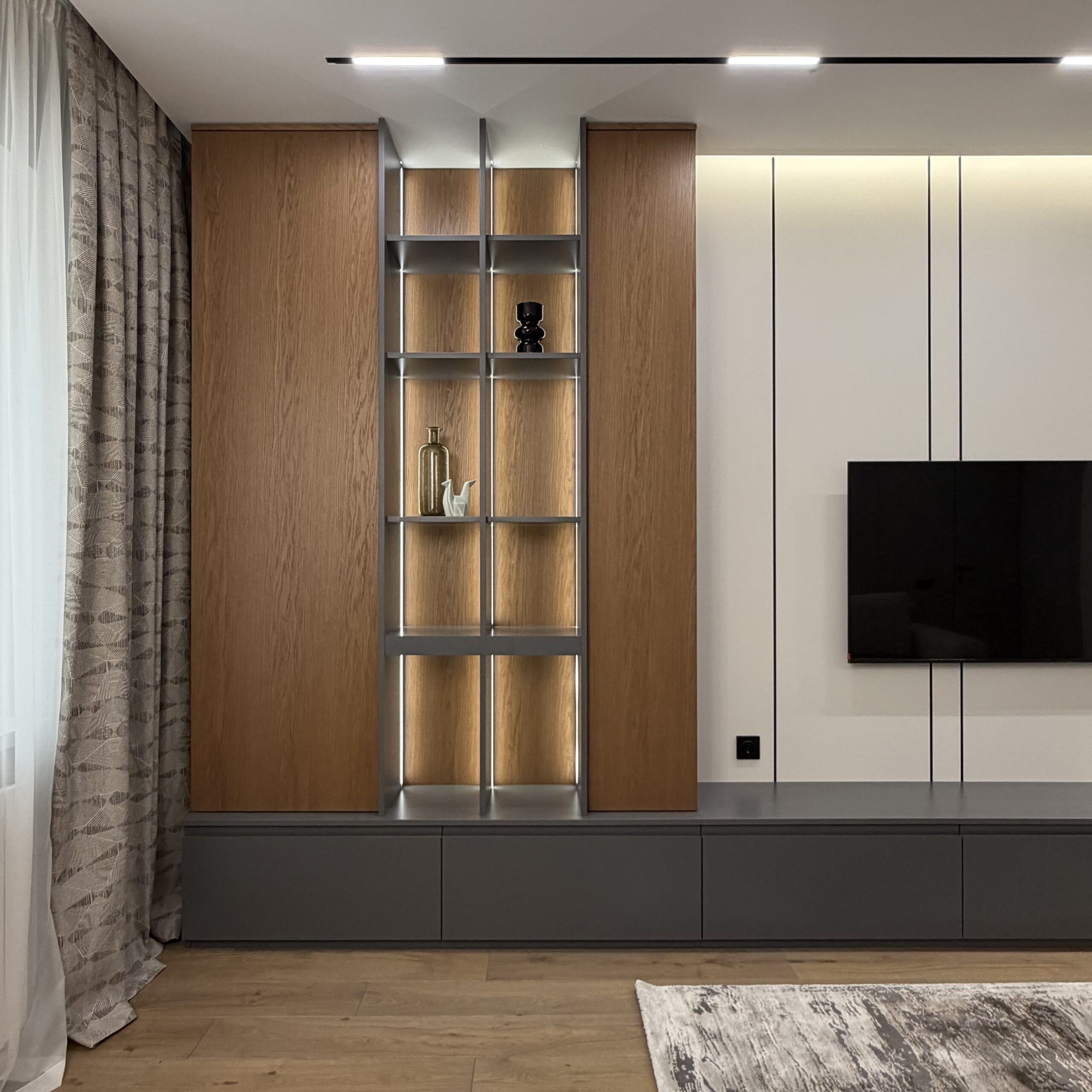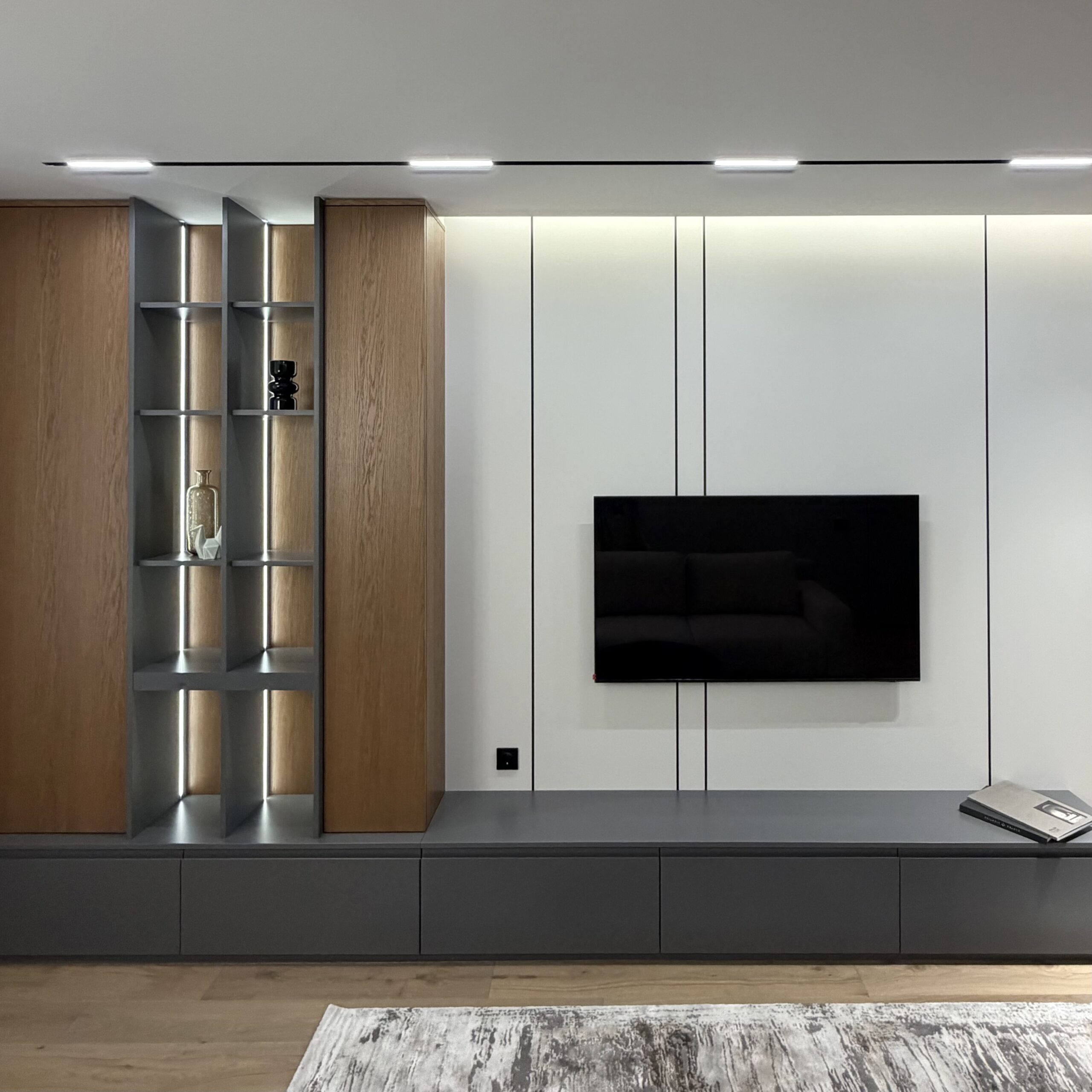 Гостиная выстроена как единая система хранения и медиа-зона, где всё подчинено чистоте композиции и продуманной функциональности. Тумба под ТВ и боковой шкаф образуют цельный объём, в котором сочетаются МДФ в шпоне и МДФ в эмали — баланс тепла натуральной текстуры и гладкой, современной поверхности.