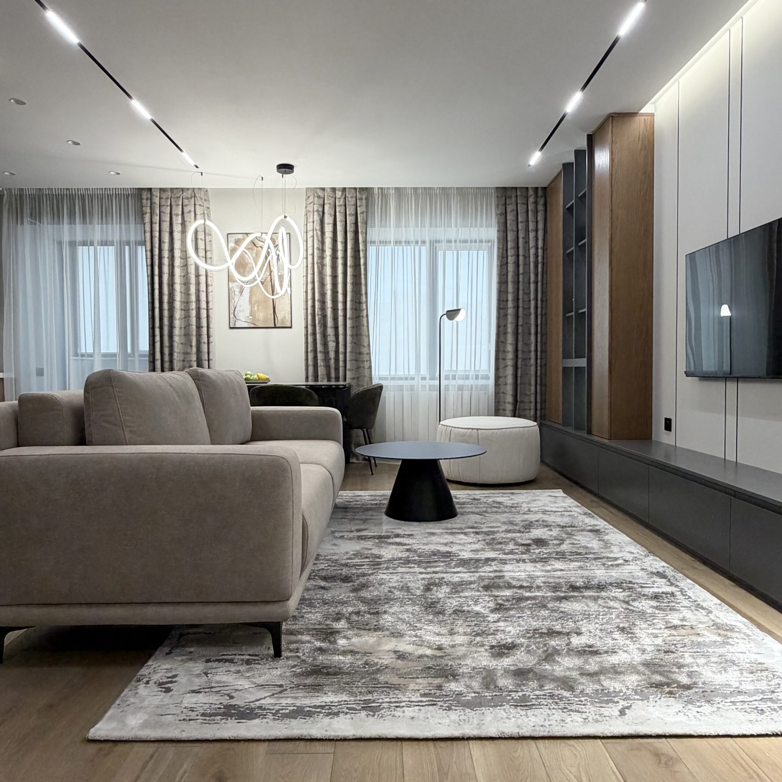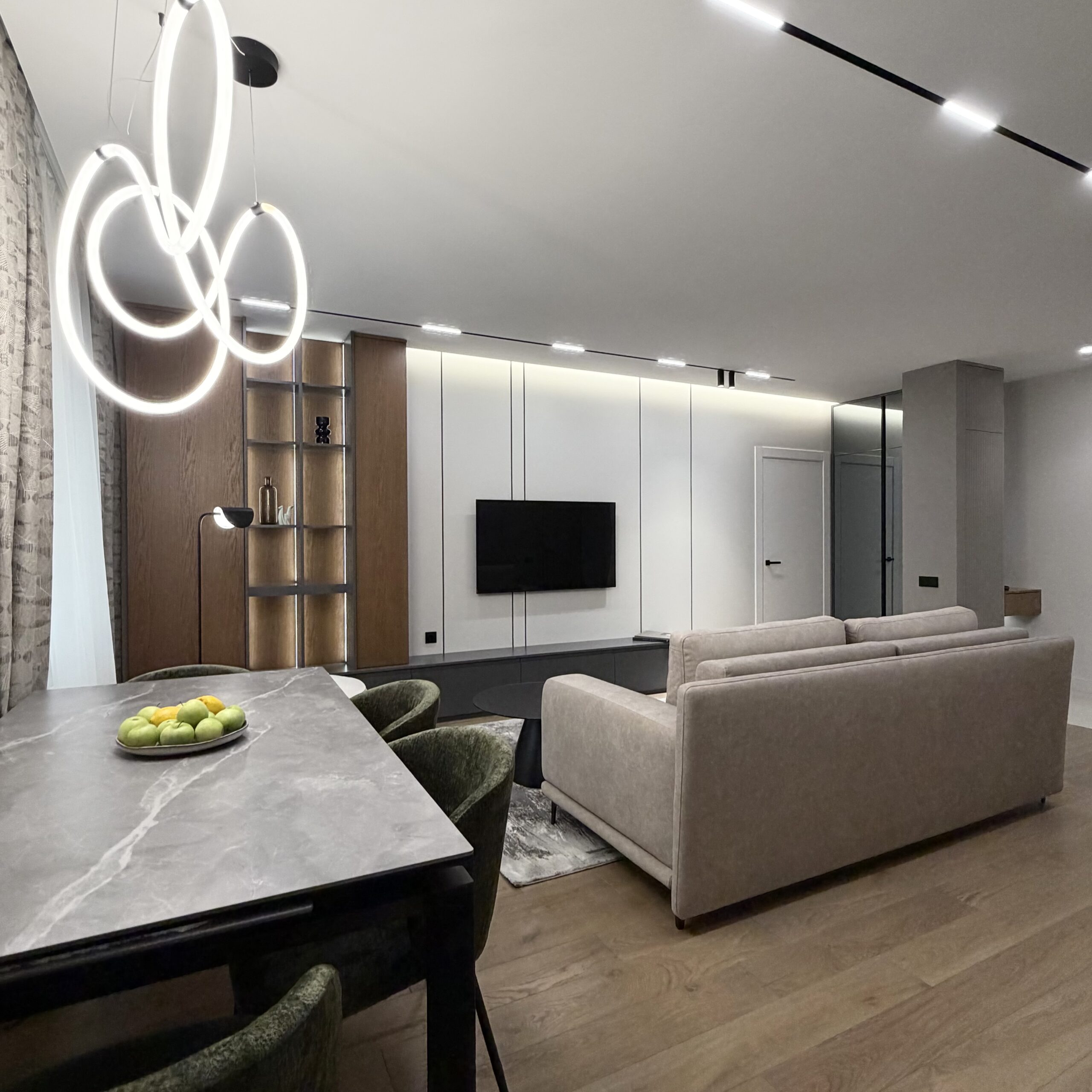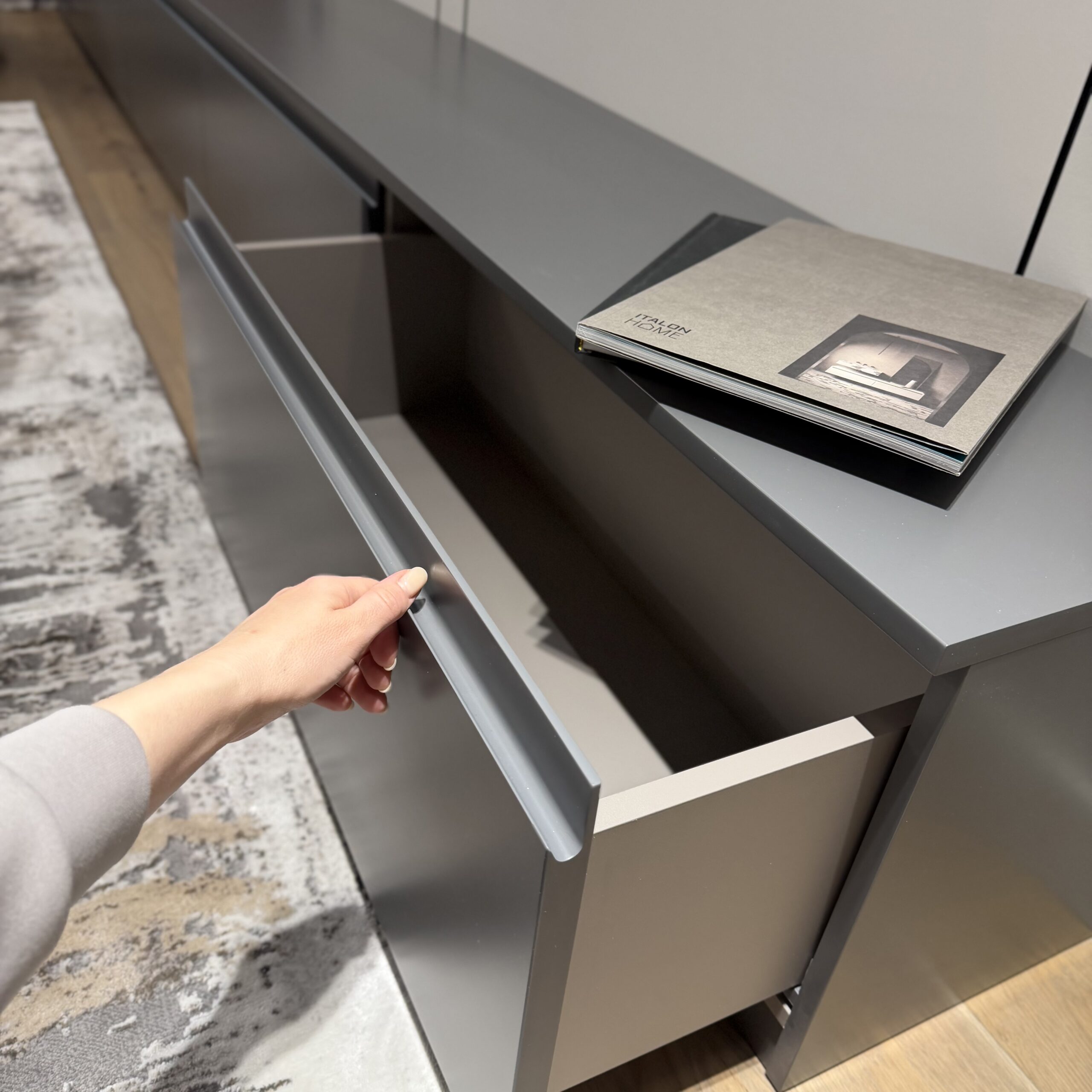 Гостиная выстроена как единая система хранения и медиа-зона, где всё подчинено чистоте композиции и продуманной функциональности. Тумба под ТВ и боковой шкаф образуют цельный объём, в котором сочетаются МДФ в шпоне и МДФ в эмали — баланс тепла натуральной текстуры и гладкой, современной поверхности.
