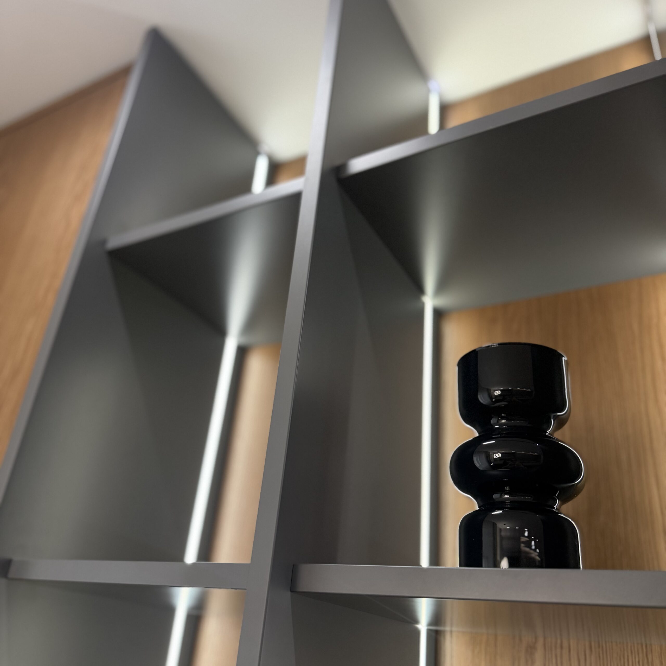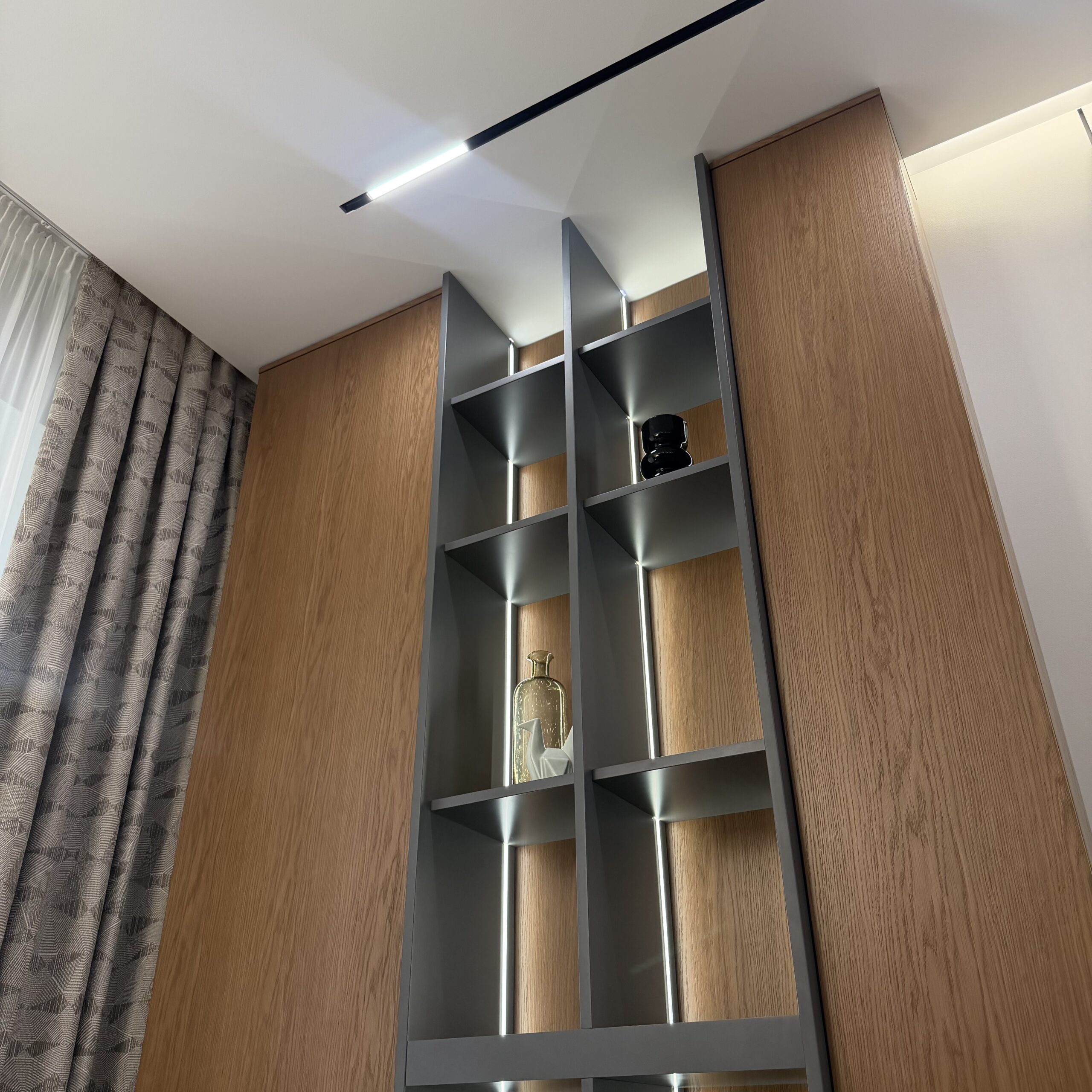 Боковой шкаф с открытой частью фасадов дополнен мягкой подсветкой, создающей глубину и аккуратные световые акценты. В нижних фасадах тумбы скрыты все внутренние коммуникации, благодаря чему пространство остаётся визуально чистым и собранным.
