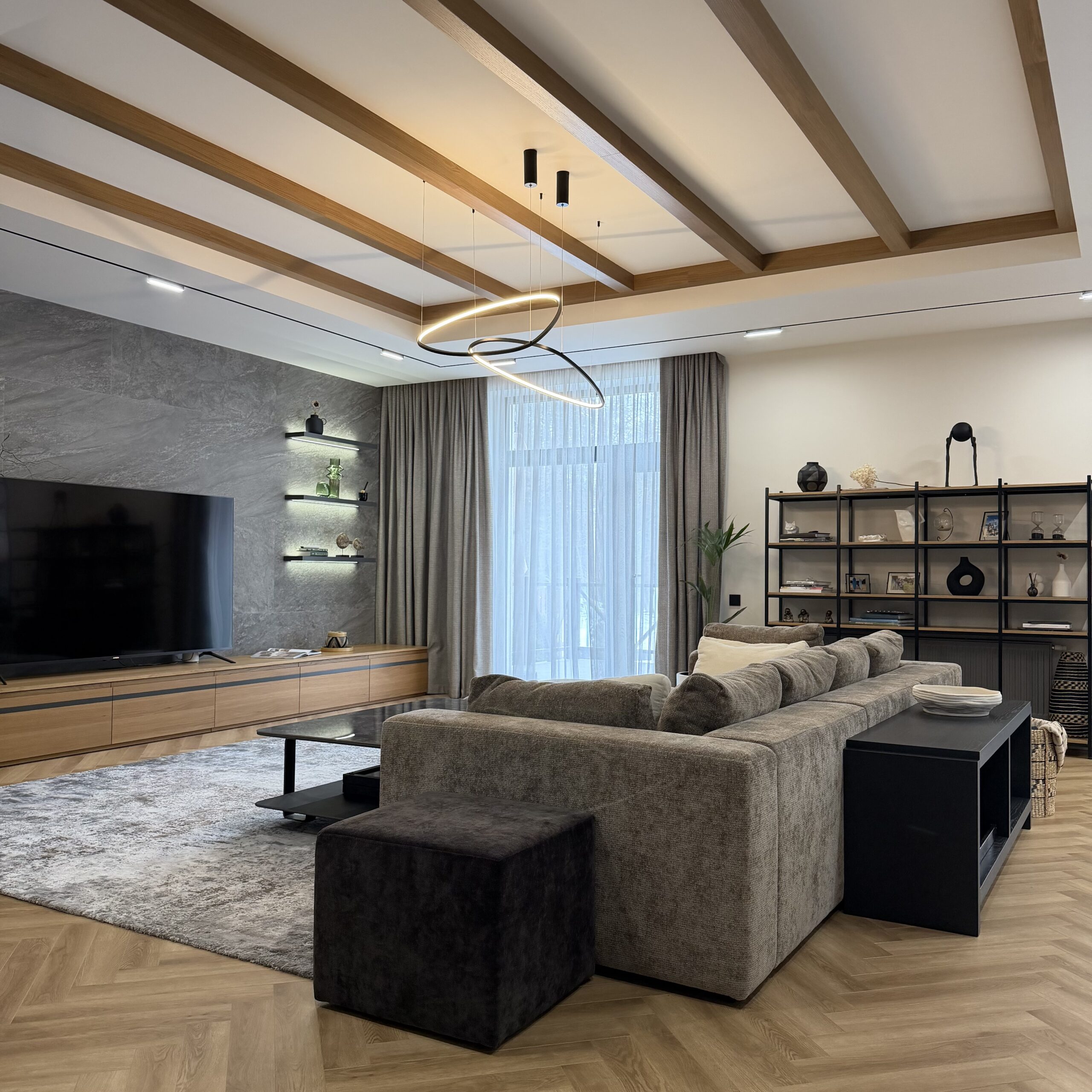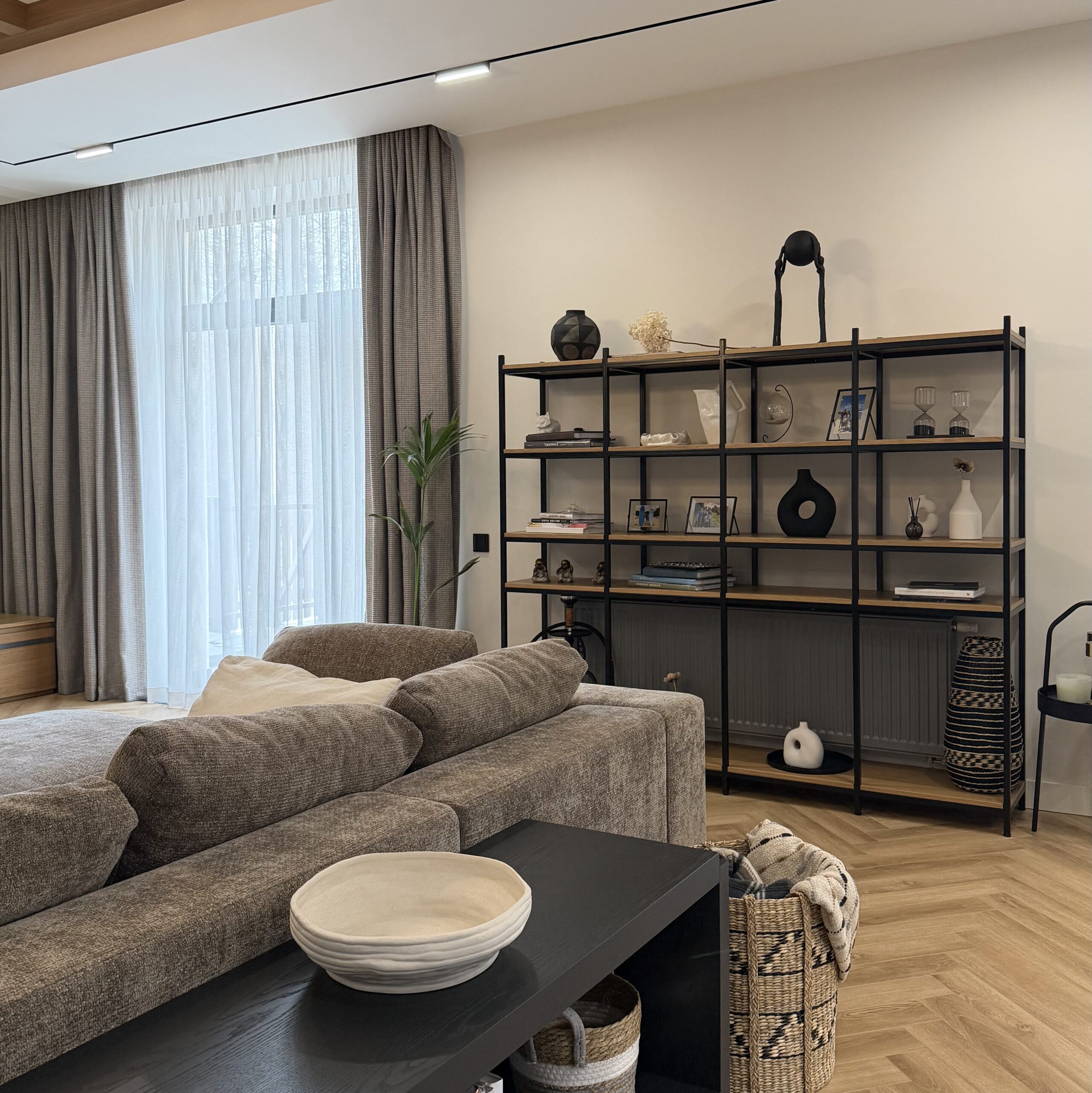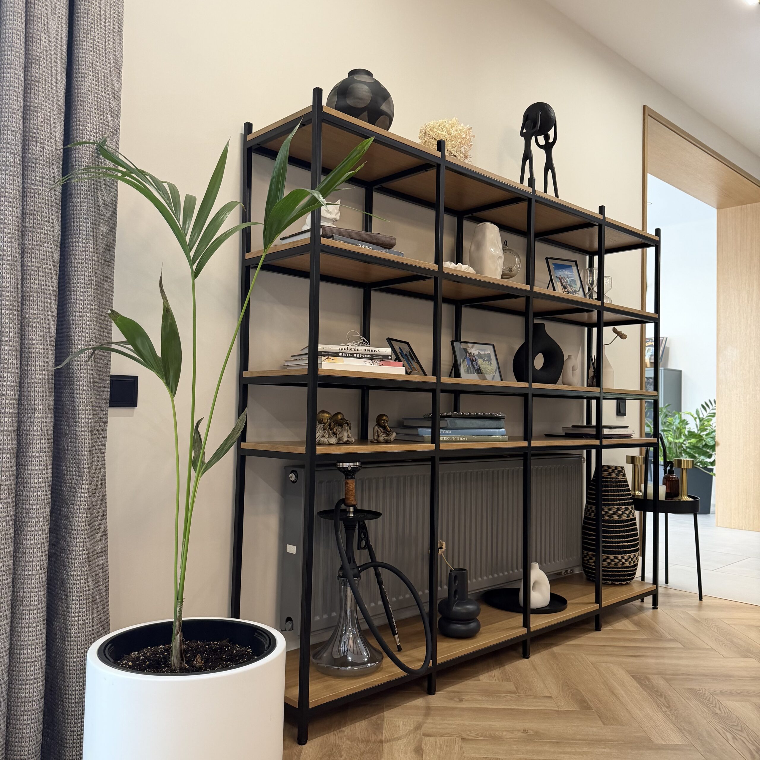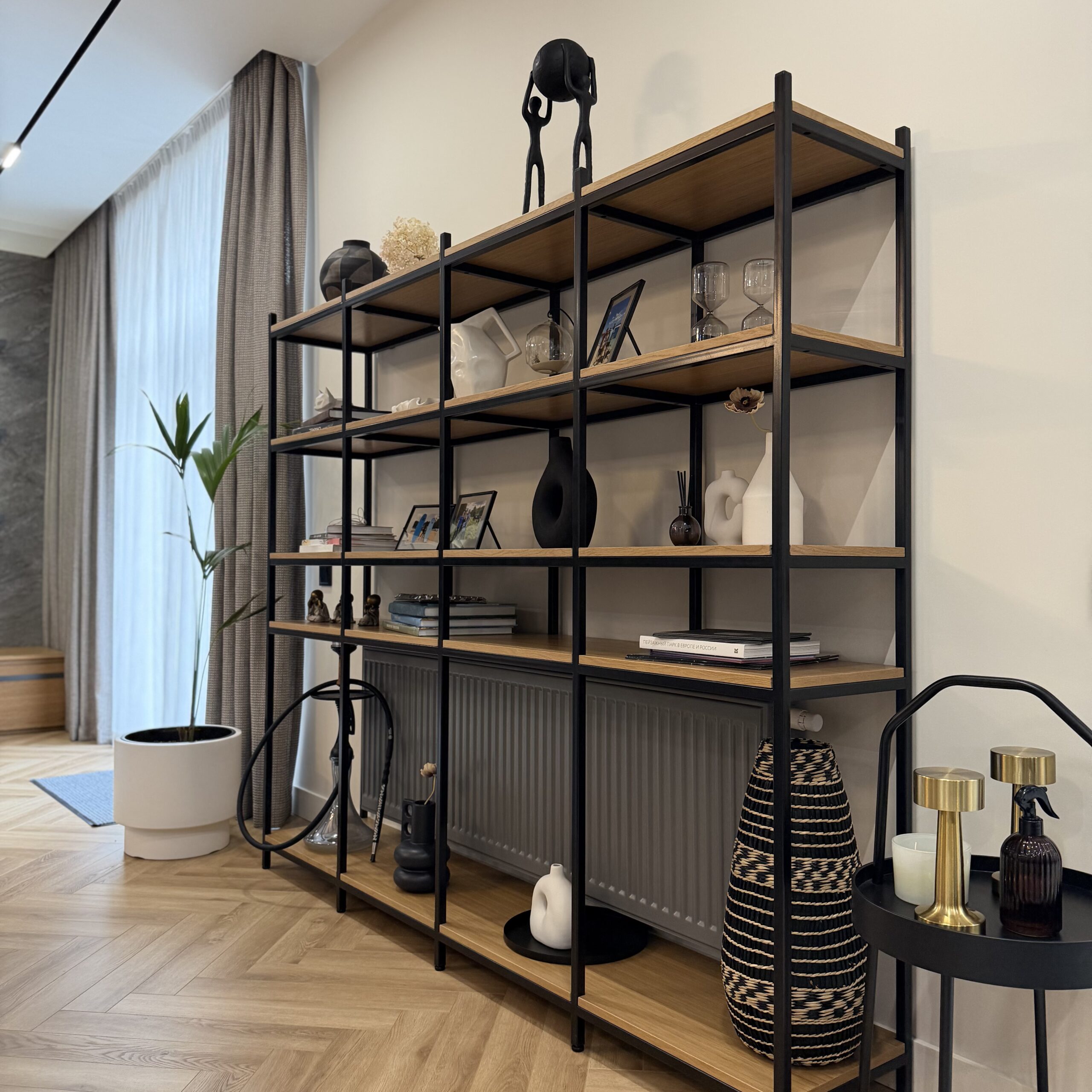 Открытая конструкция сохраняет воздух и прозрачность, не перегружая интерьер. Предметы на полках становятся частью композиции, формируя индивидуальный сценарий пространства.