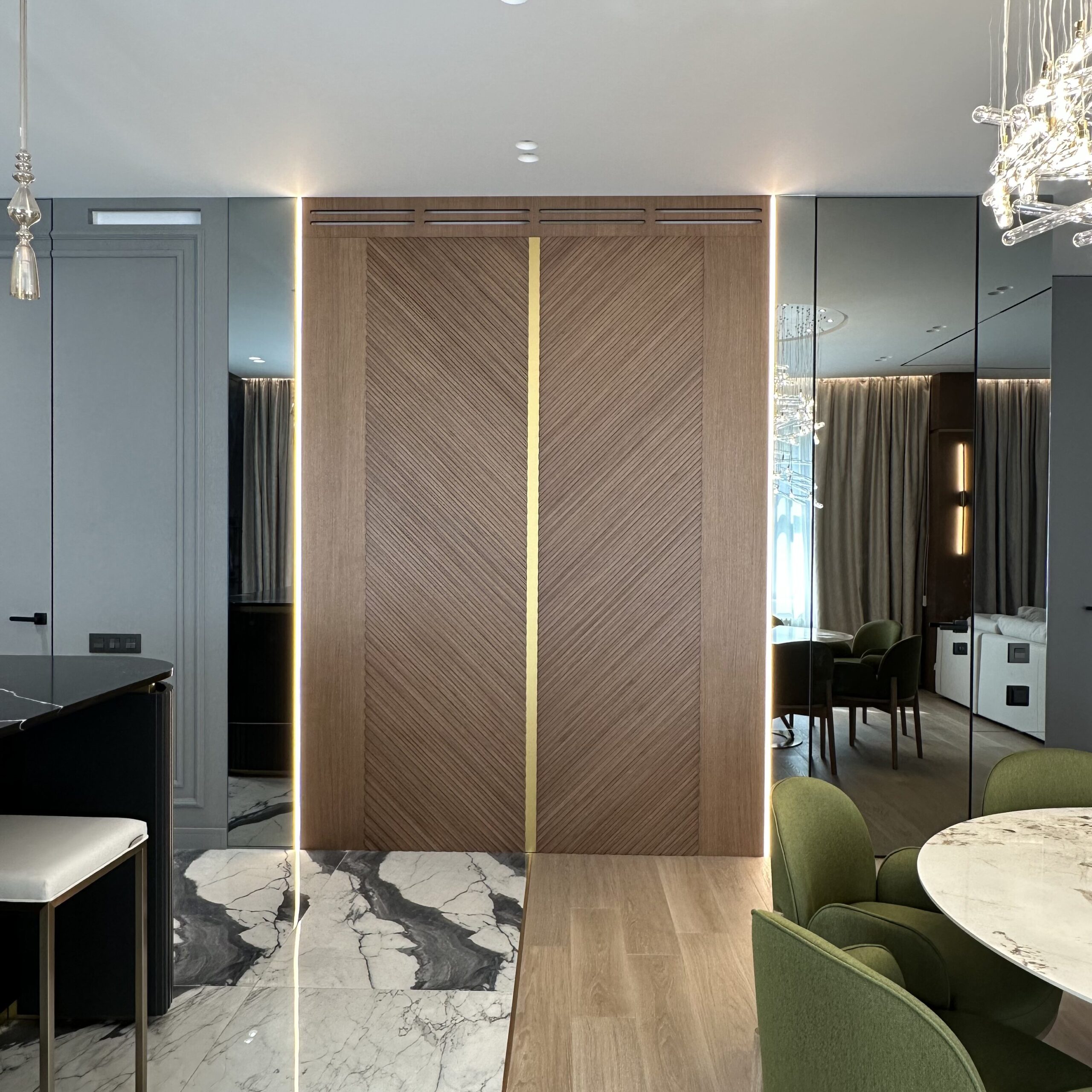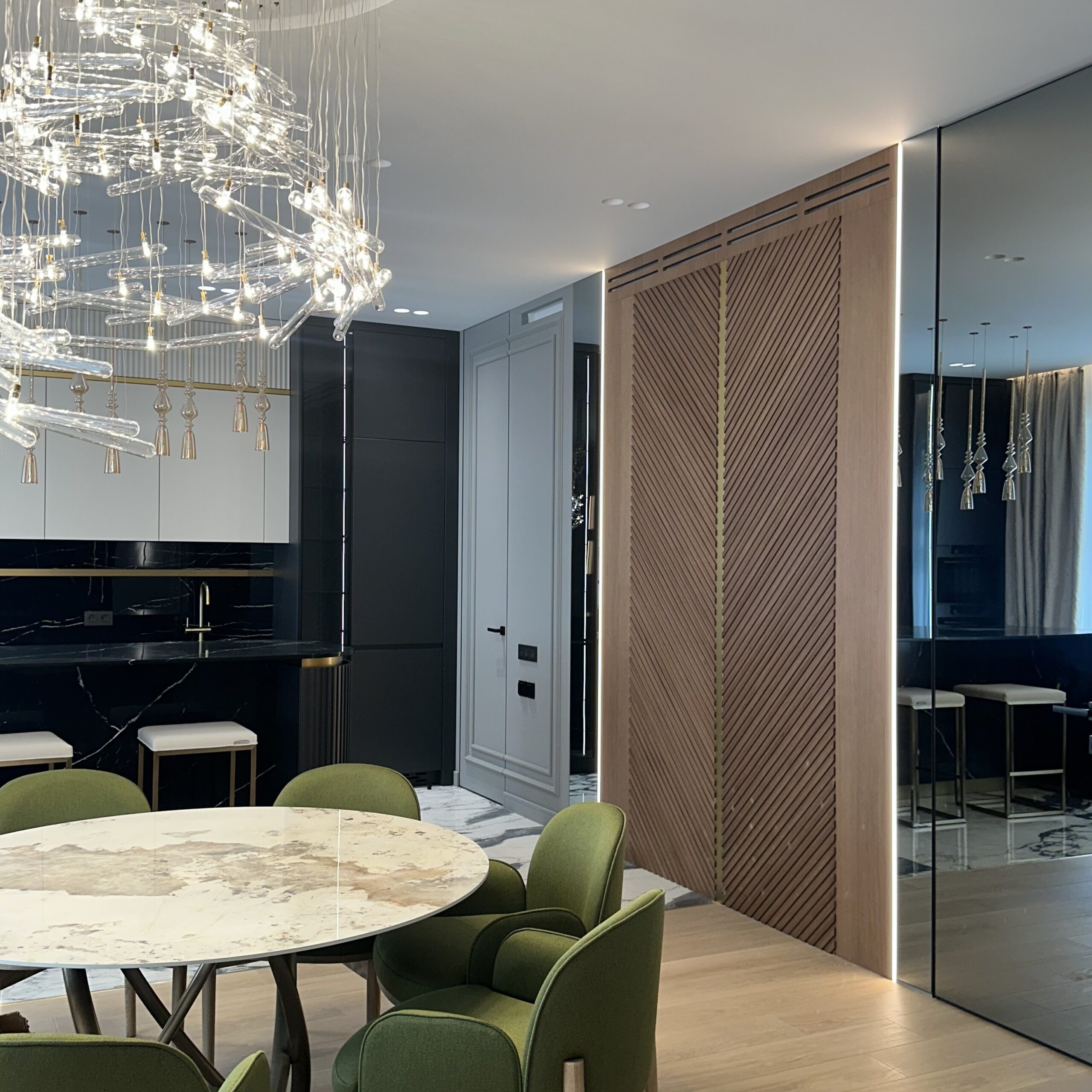 Тёплое освещение деликатно подчёркивает каждую деталь, наполняя помещение мягким сиянием и создавая атмосферу уюта. Утончённые декоративные элементы и продуманные до мелочей решения формируют особую атмосферу, где функциональность и эстетика находятся в совершенной гармонии. Интерьер превращается в пространство, где каждая линия, каждый элемент работает на создание целостного образа — изысканного, комфортного и наполненного стилем.