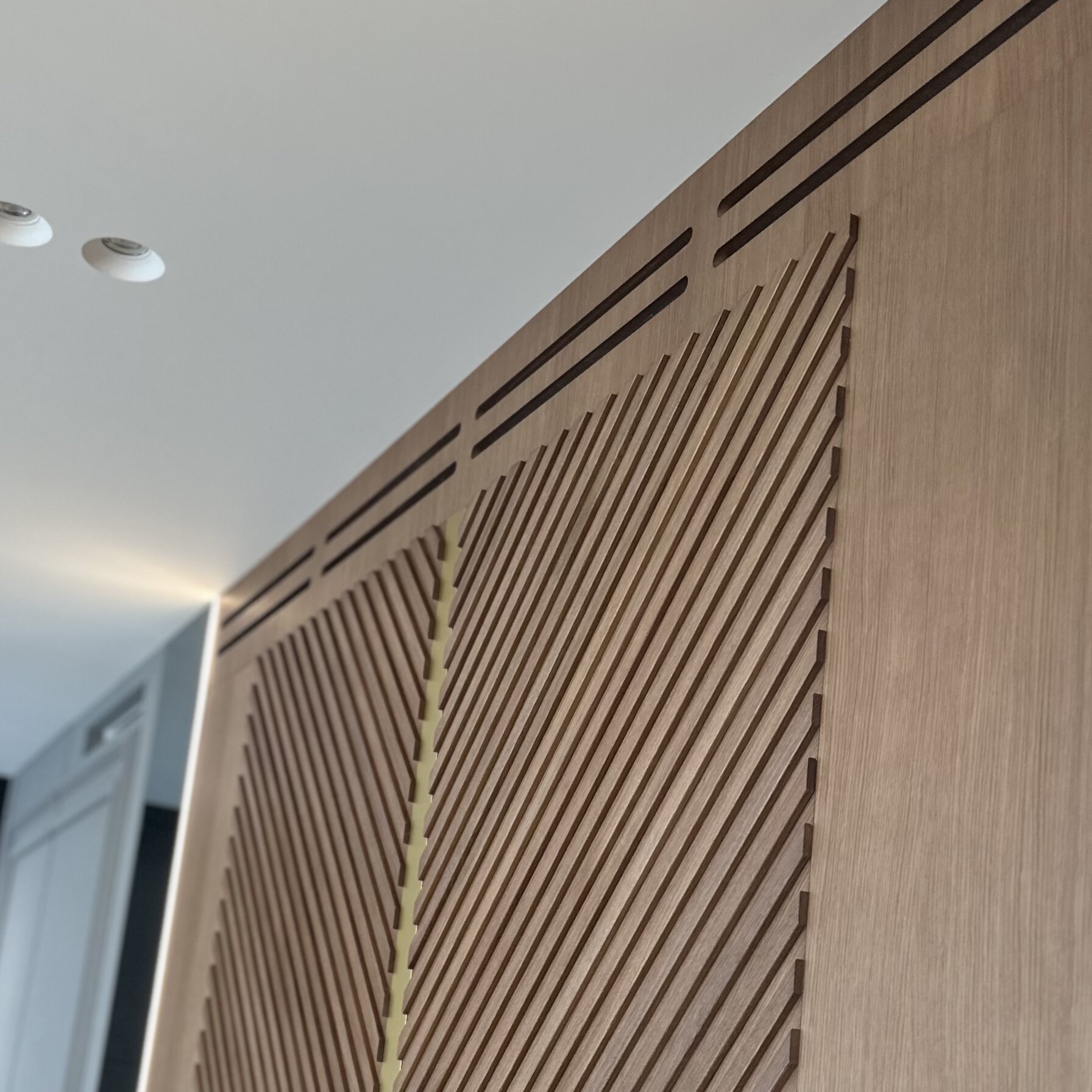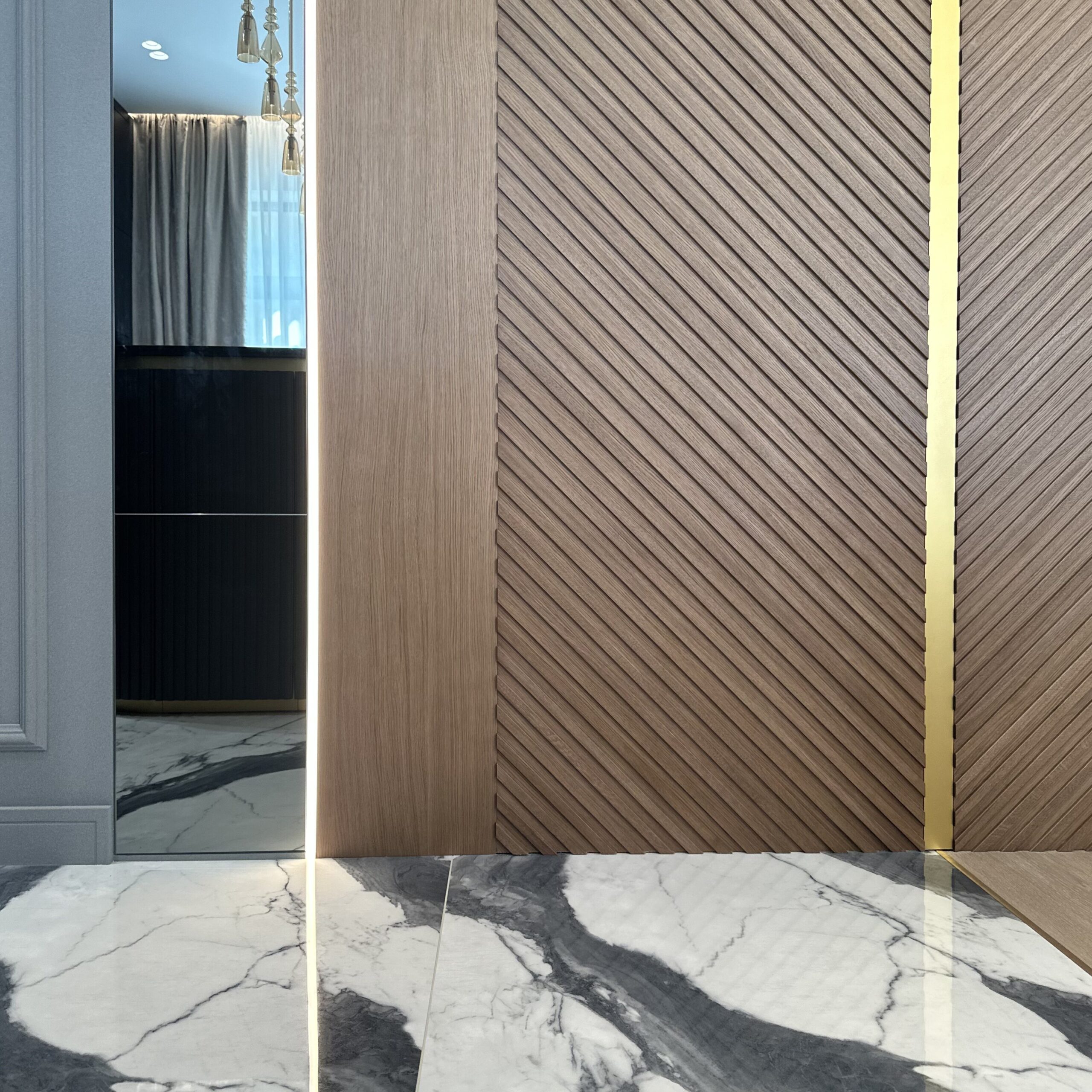 В центре композиции — роскошный тандем из шпонированной панели и овального зеркала в благородной металлической раме, который притягивает взгляд и задаёт тон всему интерьеру. Элегантная подвесная тумба с интегрированными ручками и изысканной фрезеровкой дополняет ансамбль, привнося в пространство современный характер без излишней массивности. Гармоничное сочетание мягких линий шпона и строгой геометрии металлической оправы создаёт удивительный баланс между природной теплотой и урбанистической эстетикой.
