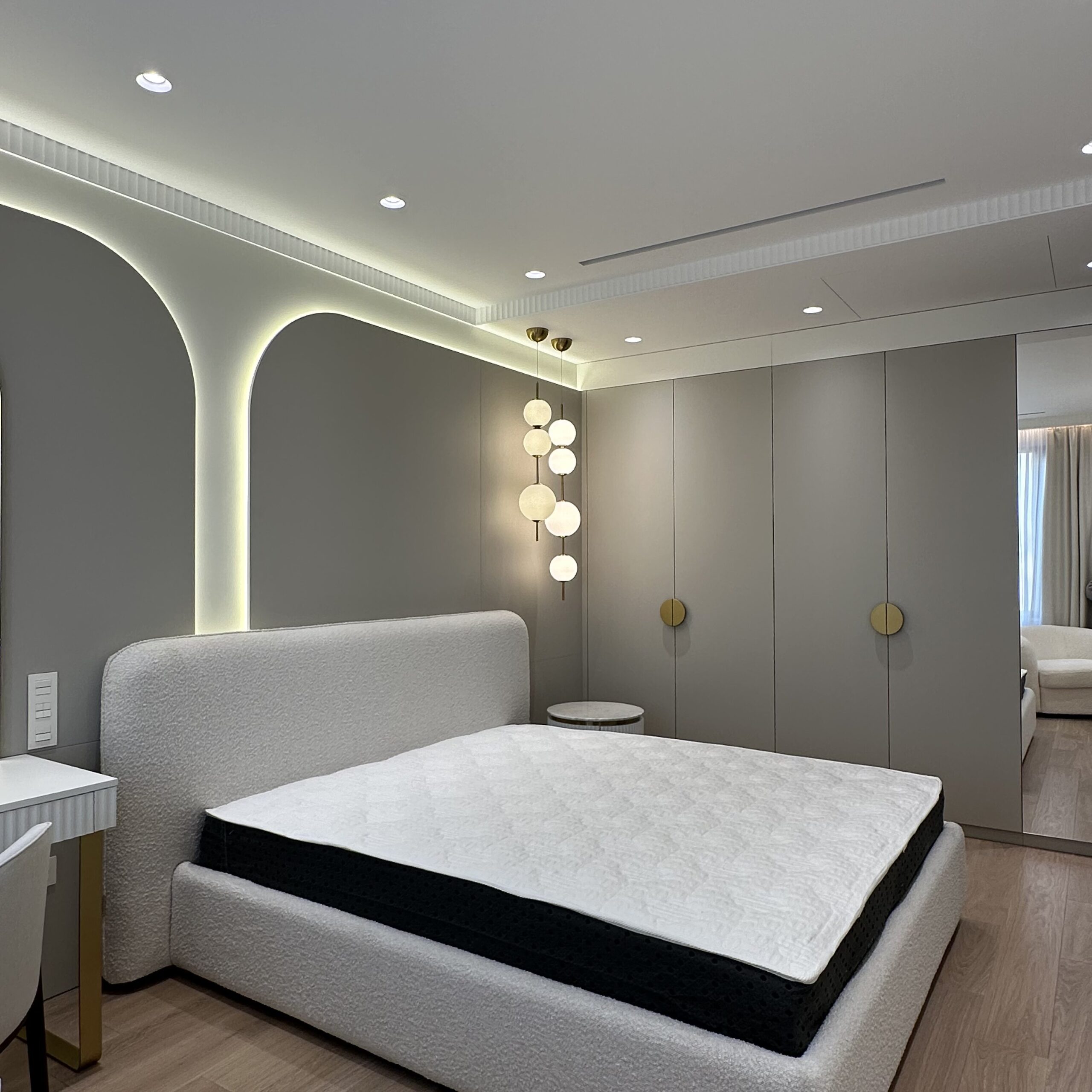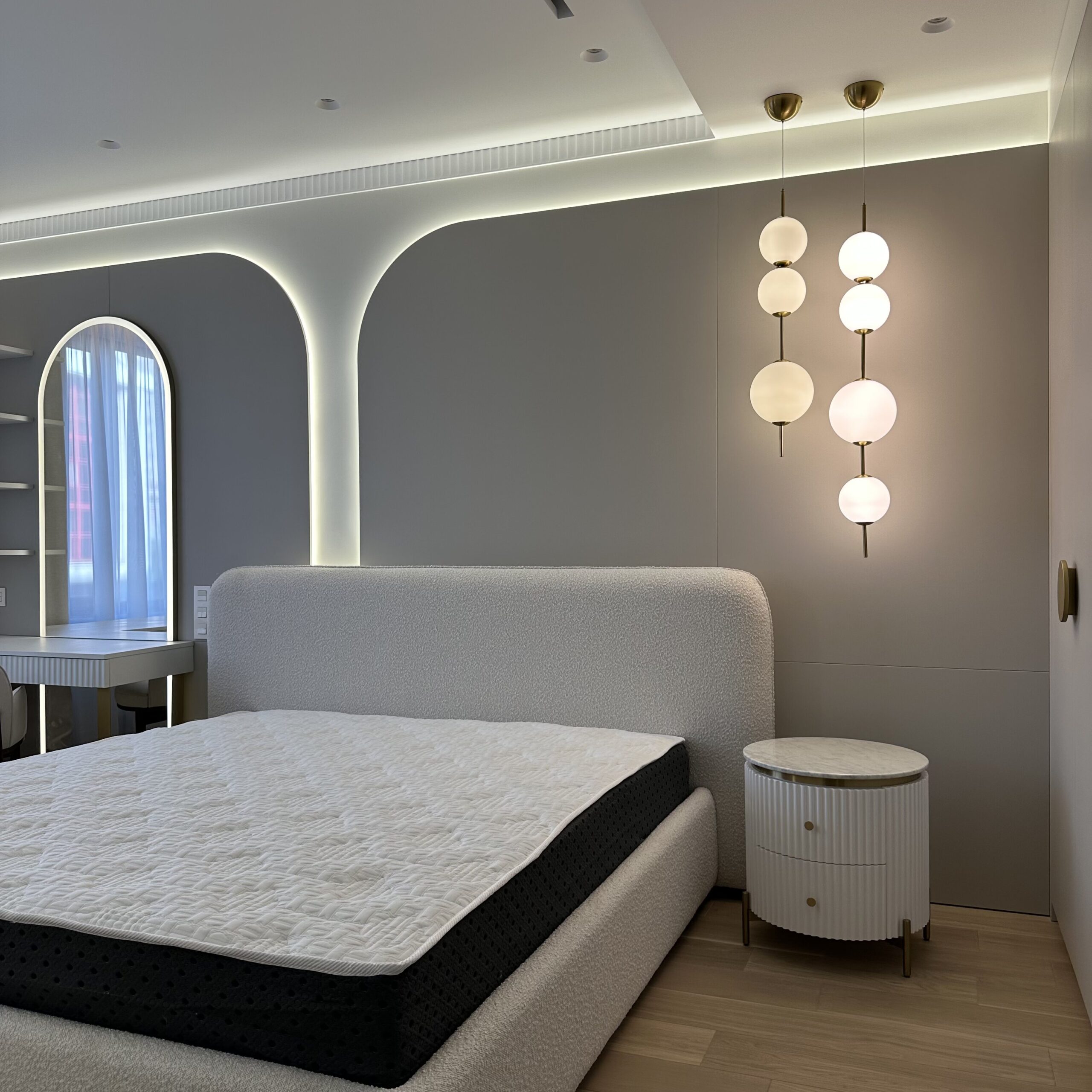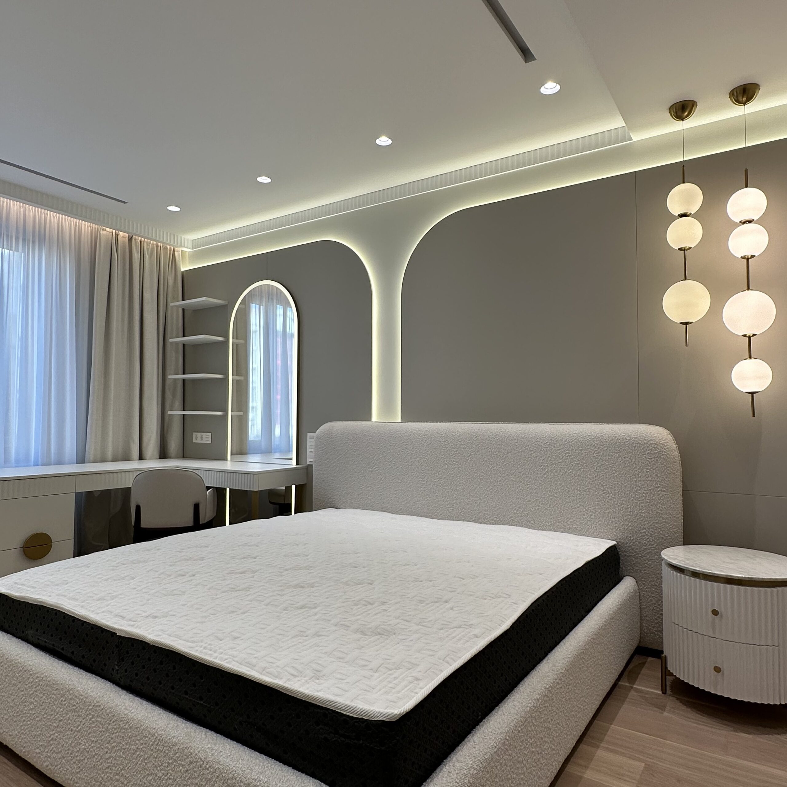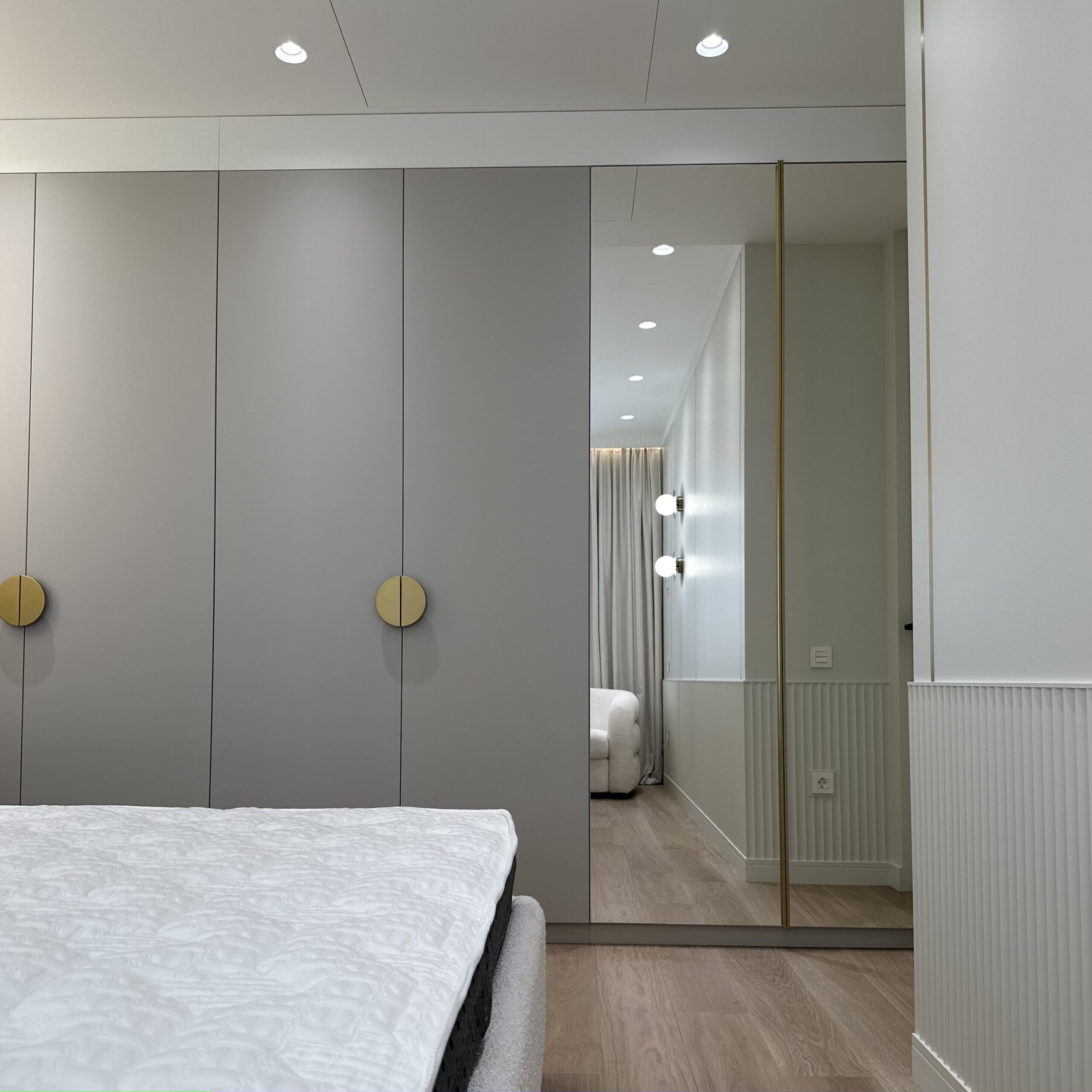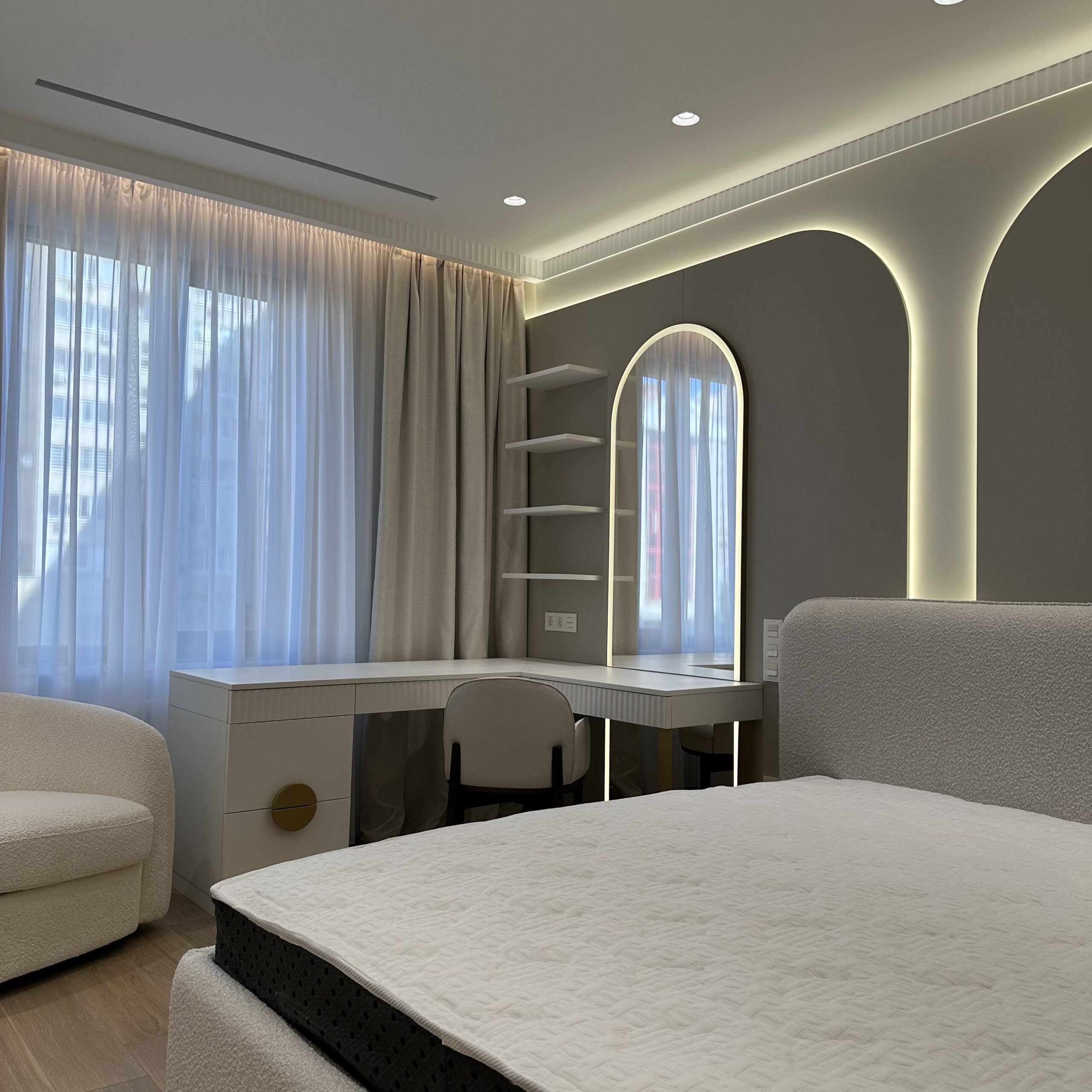 Изысканная конструкция, объединяющая панель и встроенный шкаф, создаёт современный и элегантный интерьер детской комнаты. Интегрированная подсветка мягко очерчивает контуры мебели, придавая пространству глубину и таинственность. Зеркальные фасады с безупречной полировкой визуально расширяют границы комнаты, играя со светом и создавая множество отражений. Особую утончённость композиции придают круглые латунные ручки, которые, словно ювелирные украшения, добавляют мебели благородства и стиля.