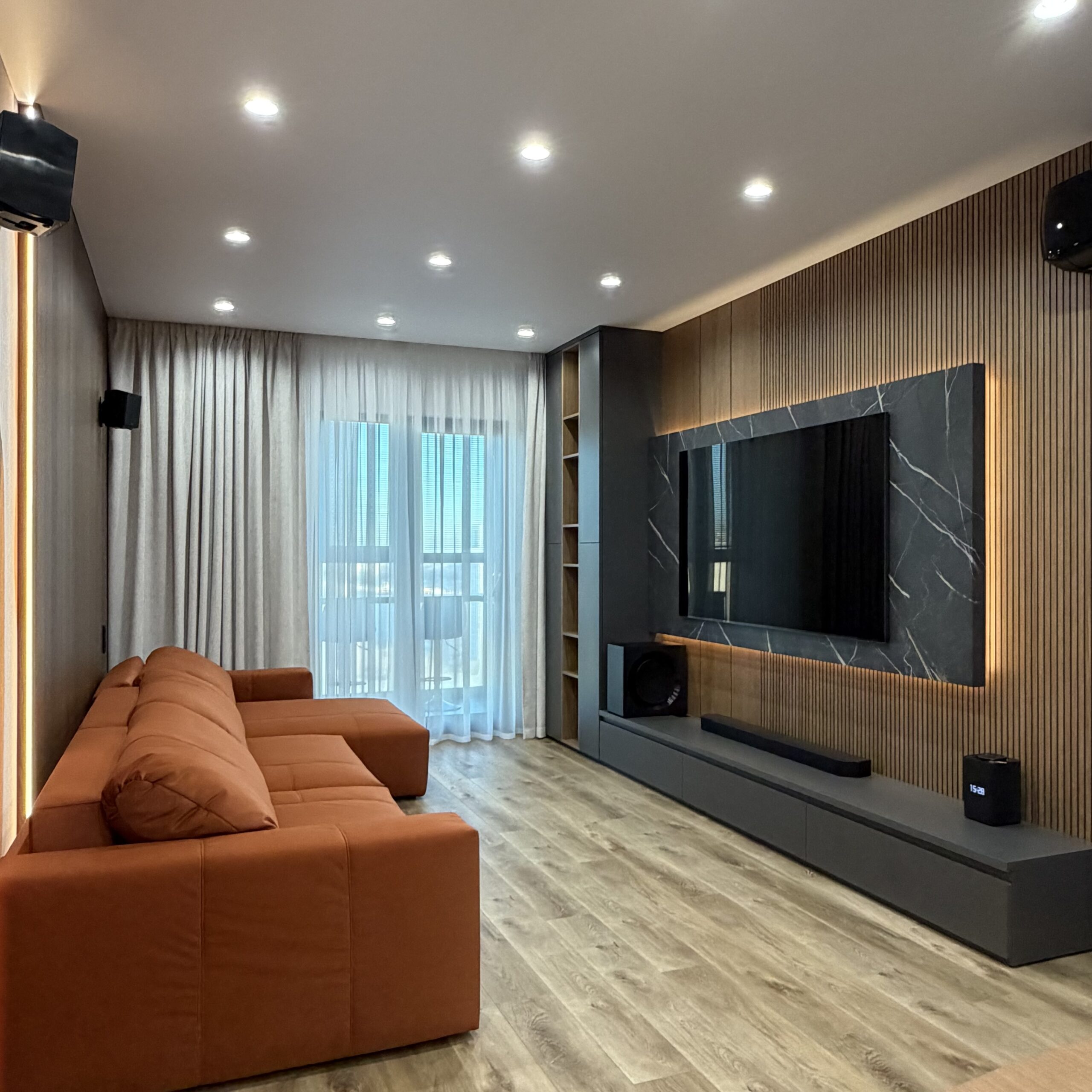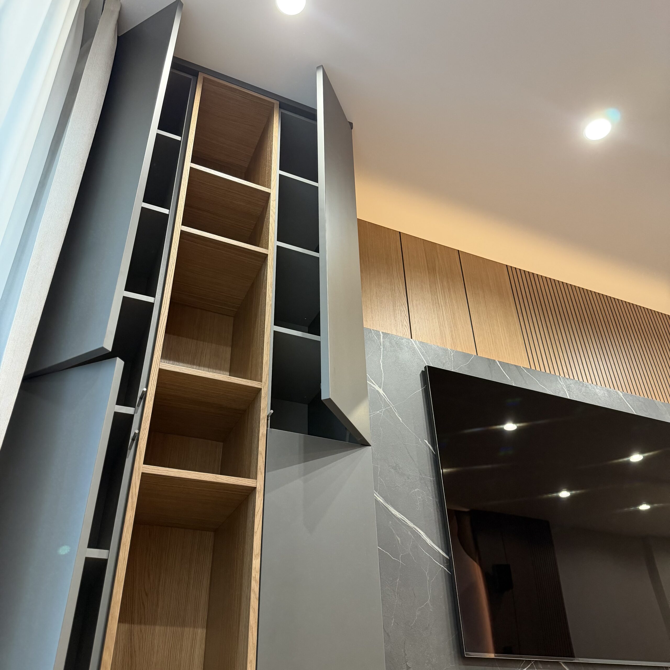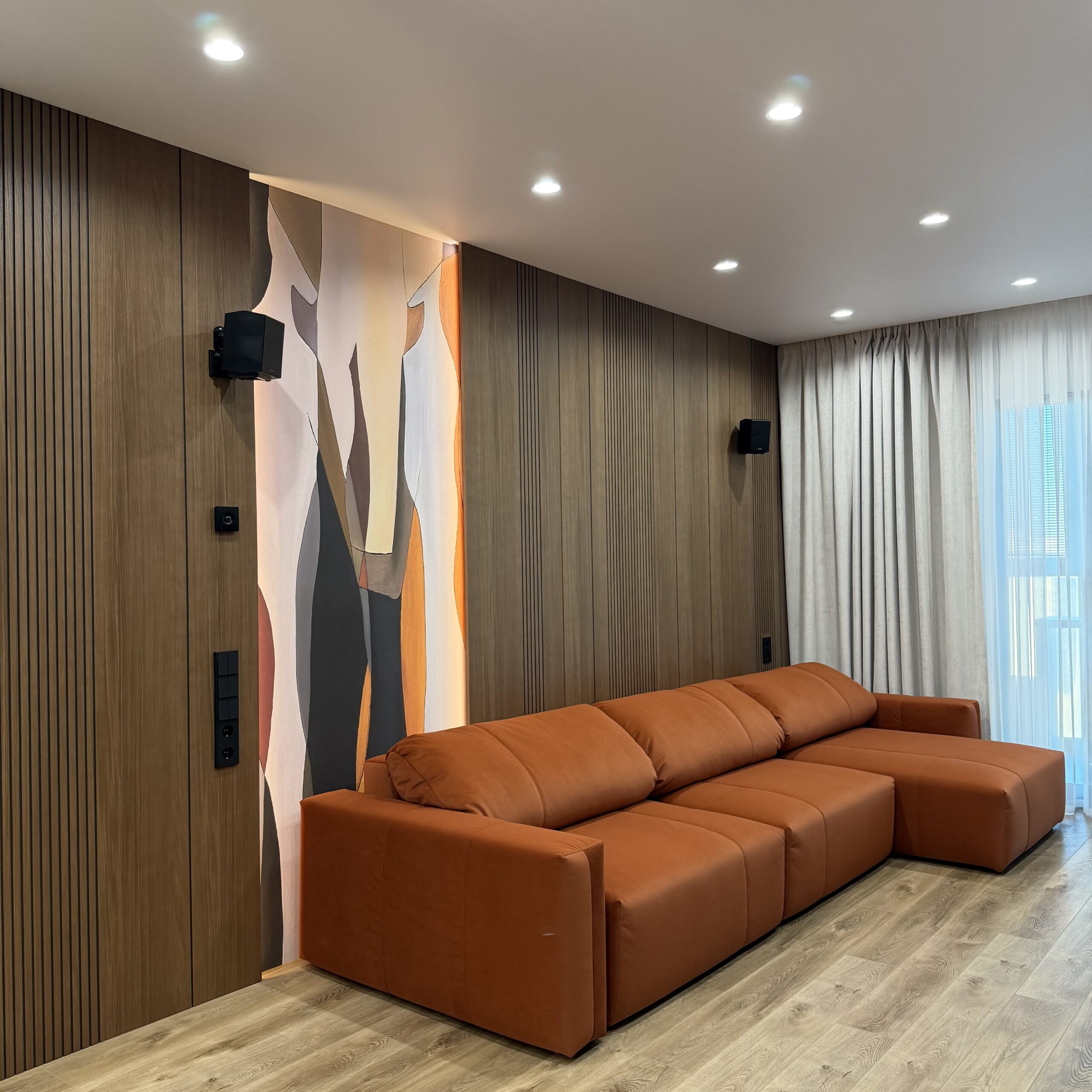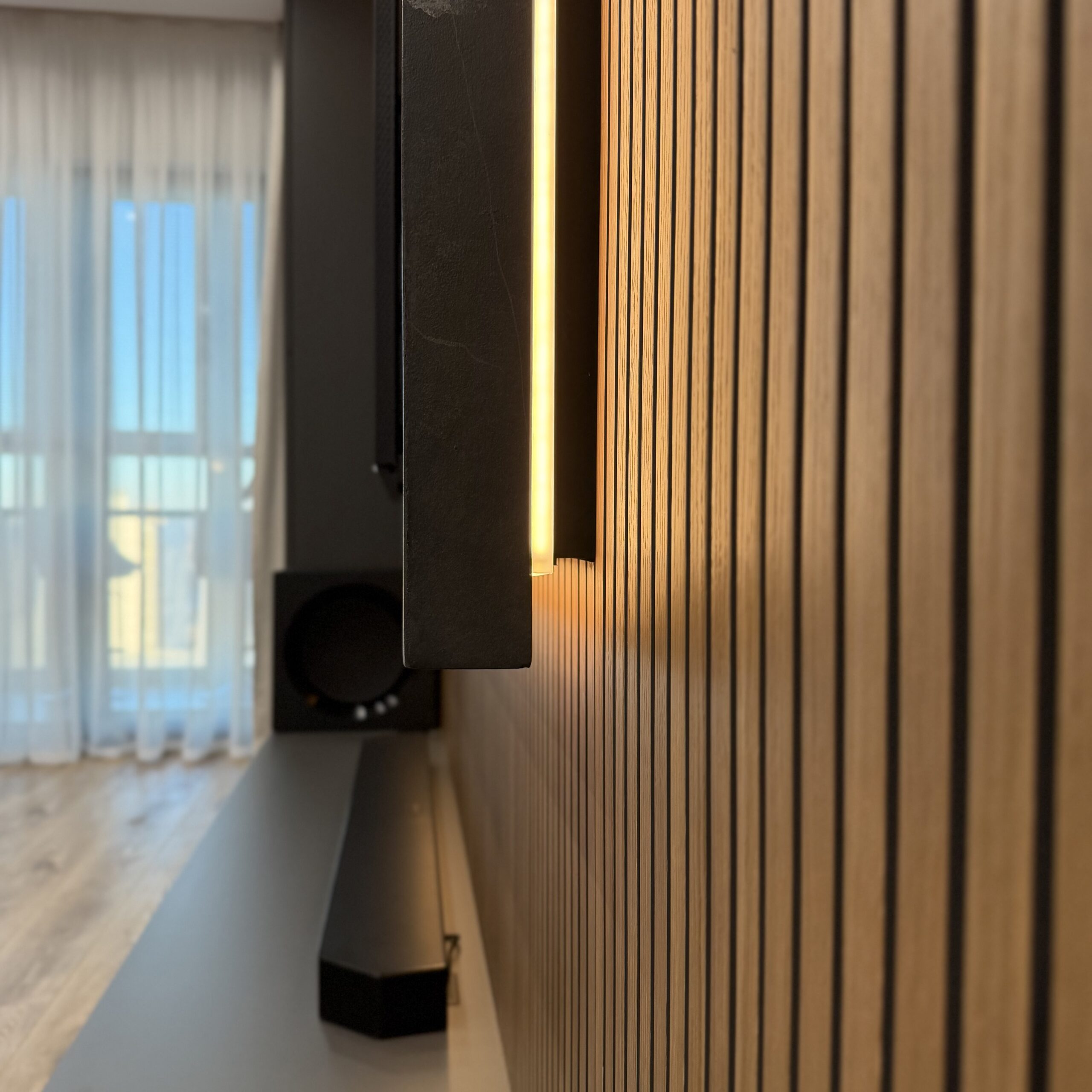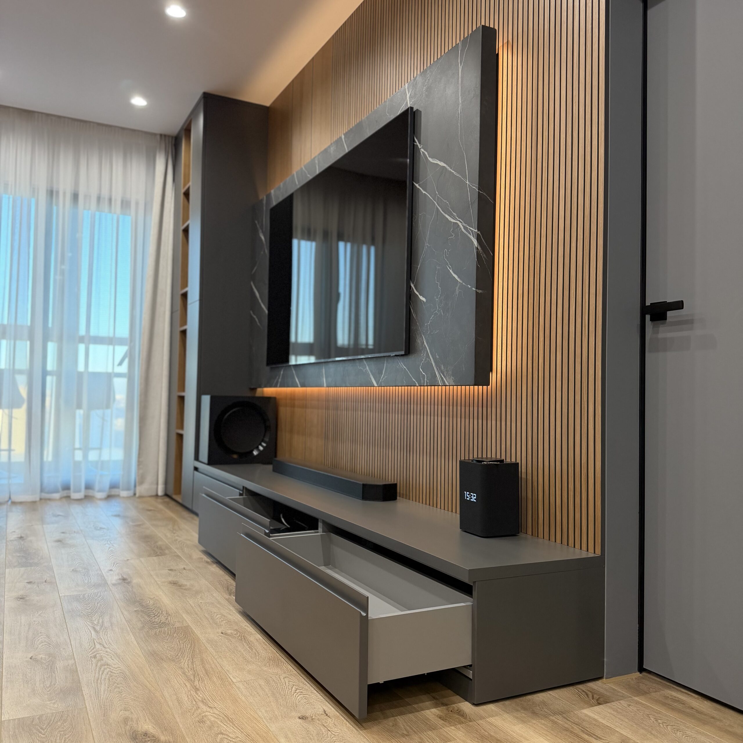 Цельная композиция, которая объединяет пространство с двух сторон. Со стороны ТВ — панель с интегрированными тумбами и витриной, со стороны дивана — продолжение в виде декоративной отделки из шпона, формирующей тёплый, спокойный фон для зоны отдыха. Всё собрано в единый объём без разрывов и лишних деталей.