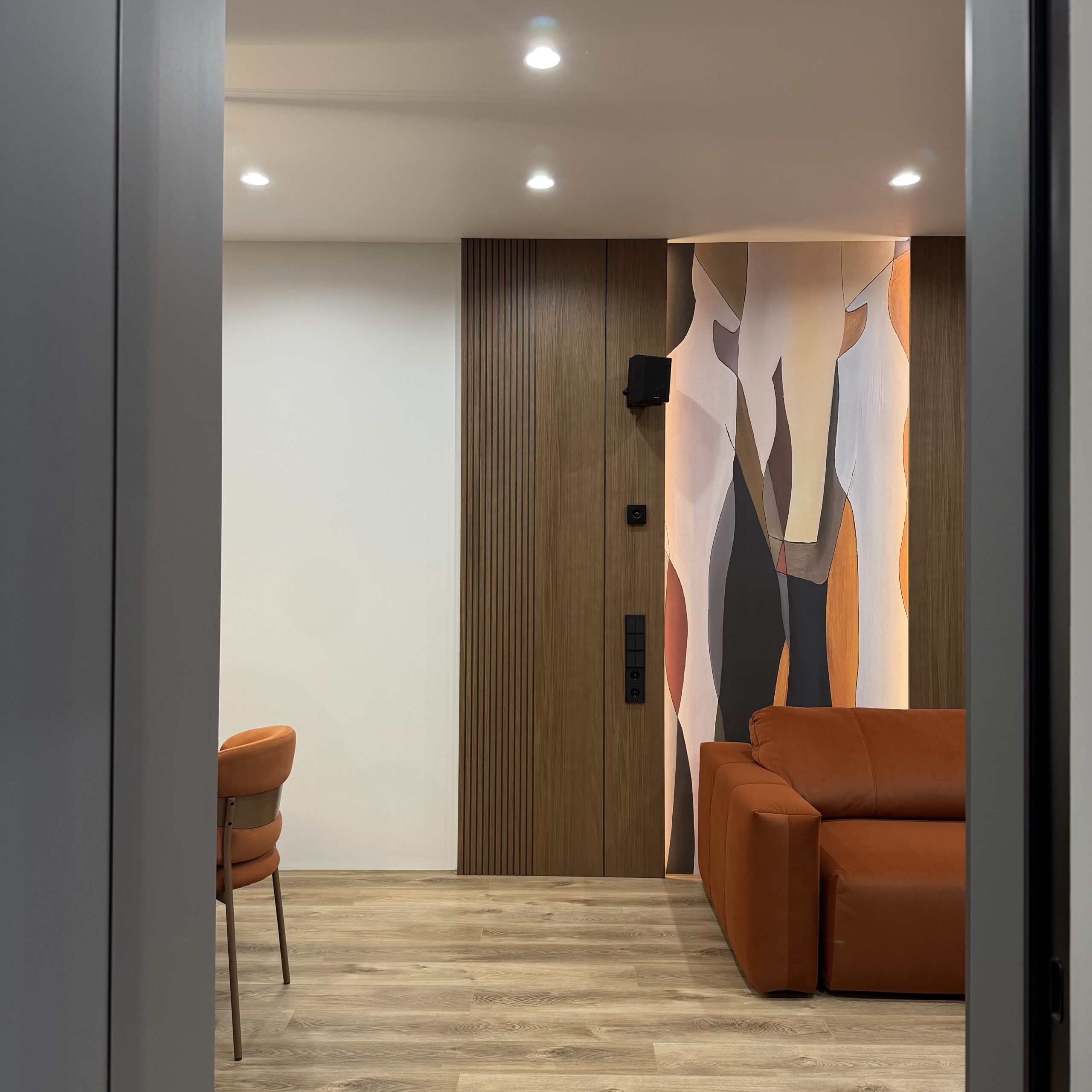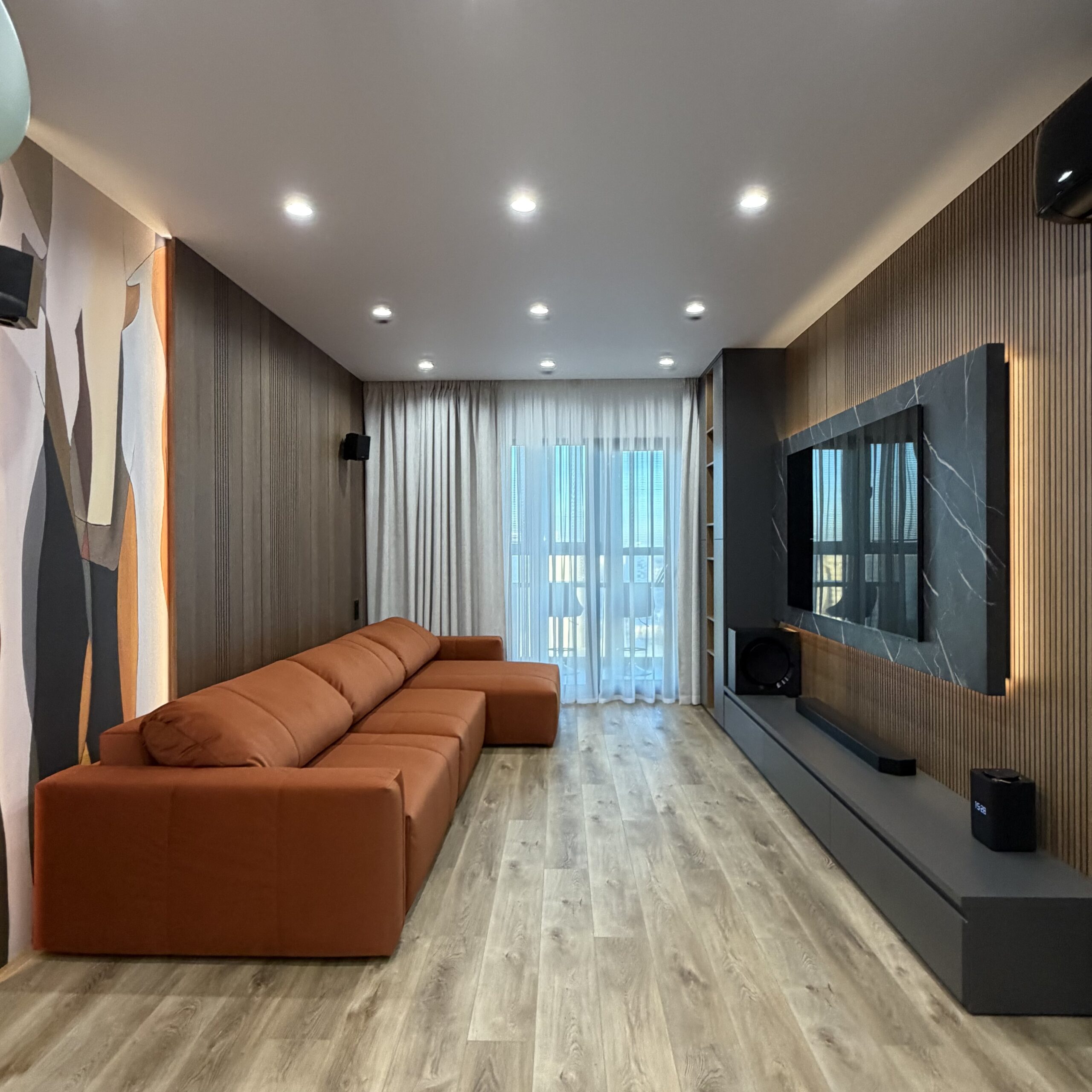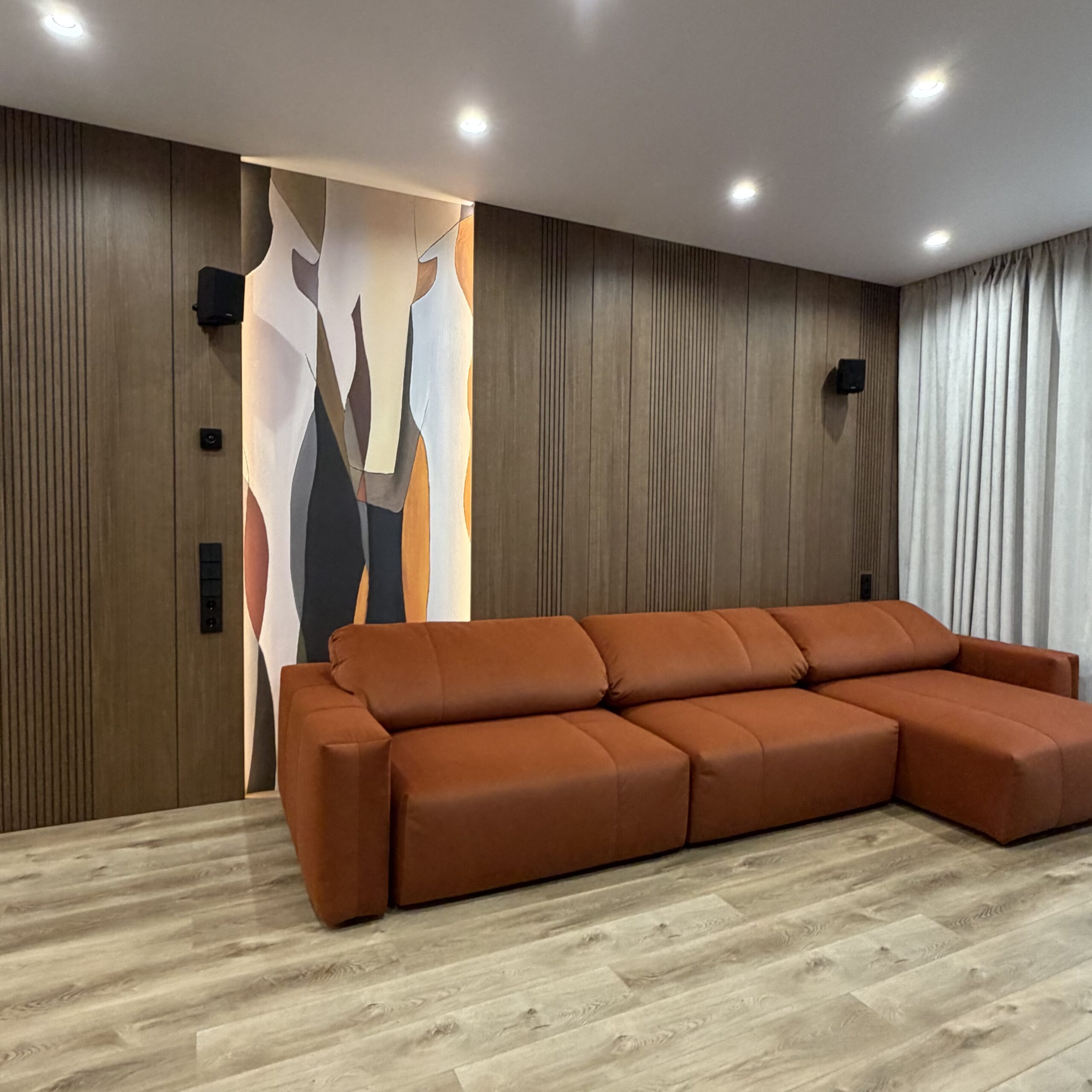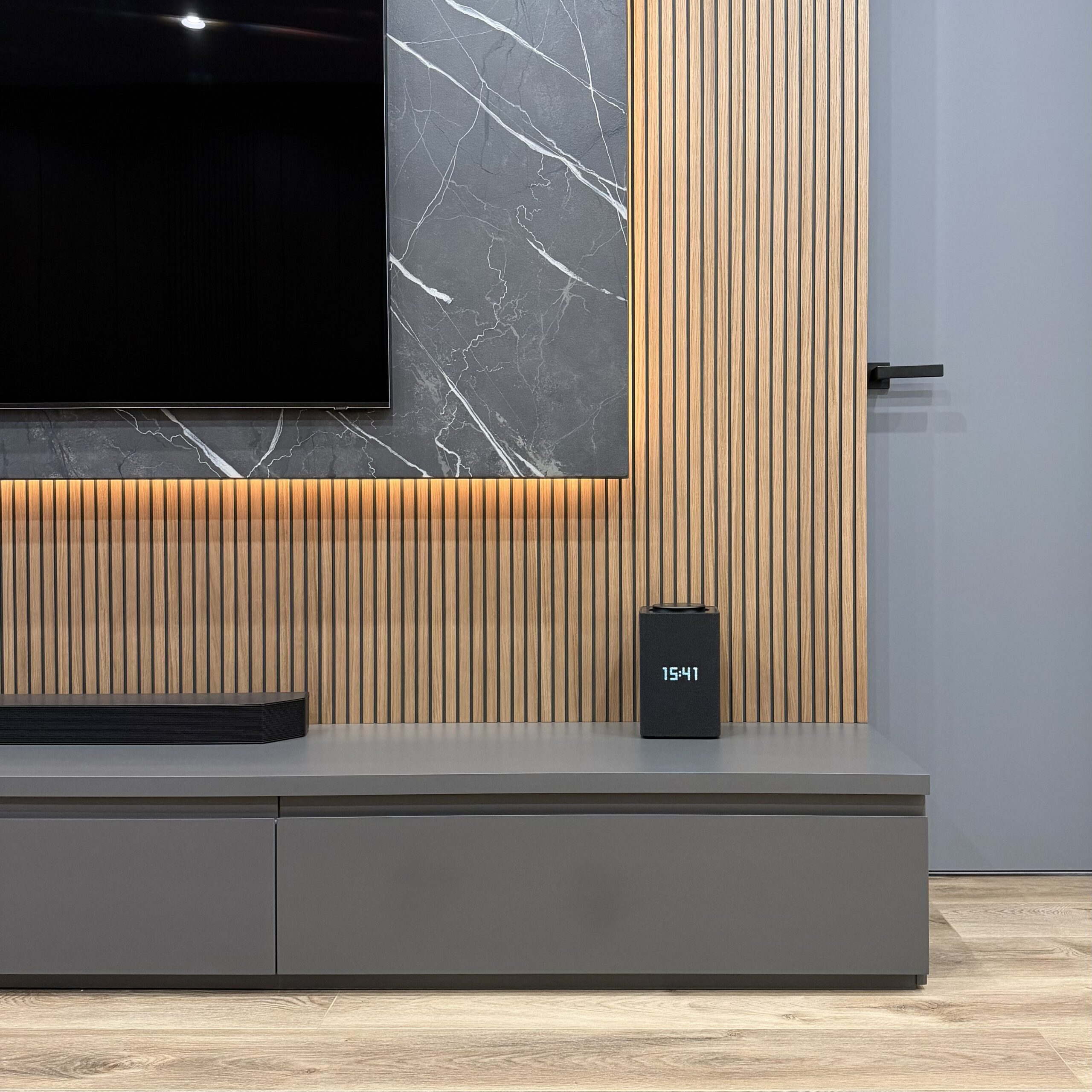 Цельная композиция, которая объединяет пространство с двух сторон. Со стороны ТВ — панель с интегрированными тумбами и витриной, со стороны дивана — продолжение в виде декоративной отделки из шпона, формирующей тёплый, спокойный фон для зоны отдыха. Всё собрано в единый объём без разрывов и лишних деталей.