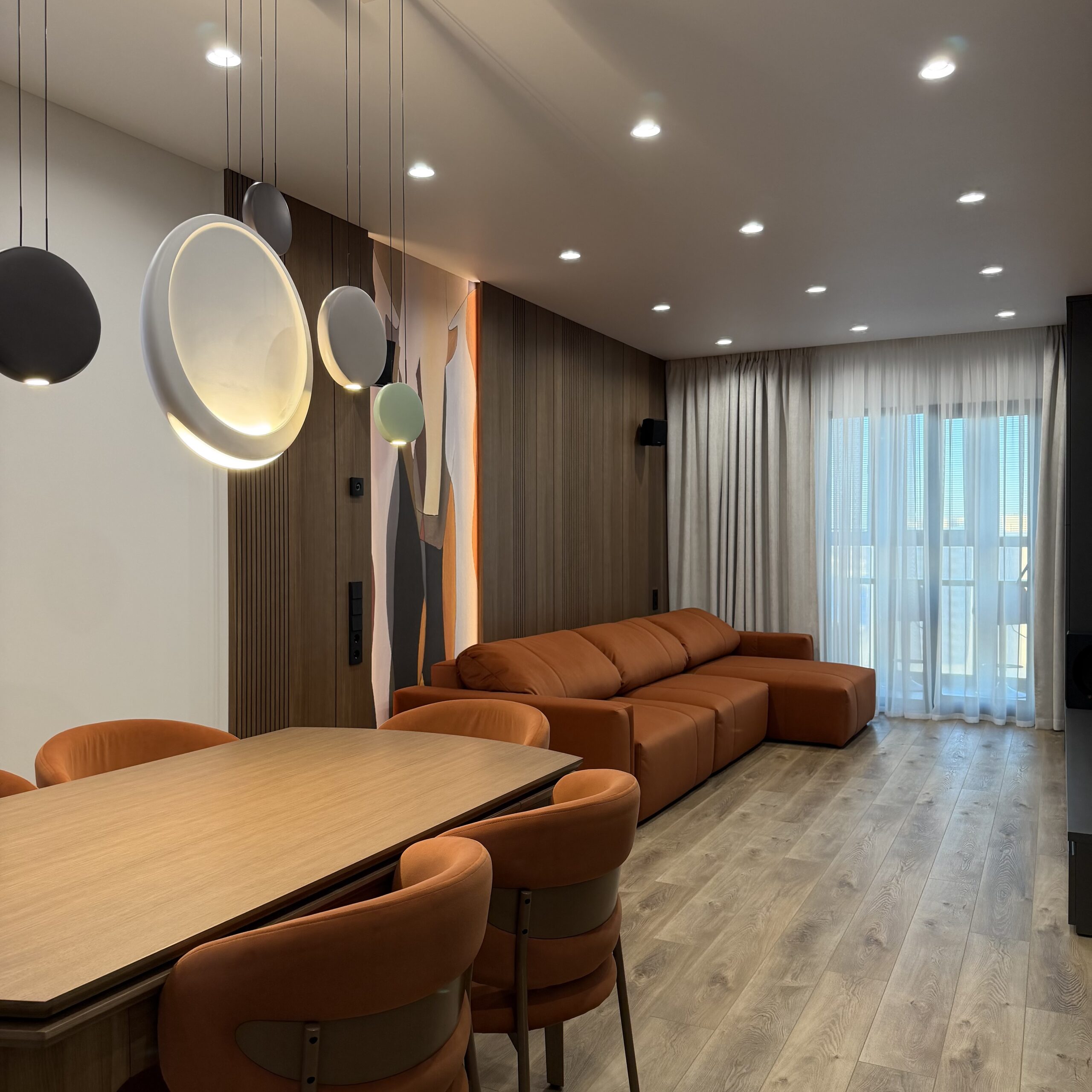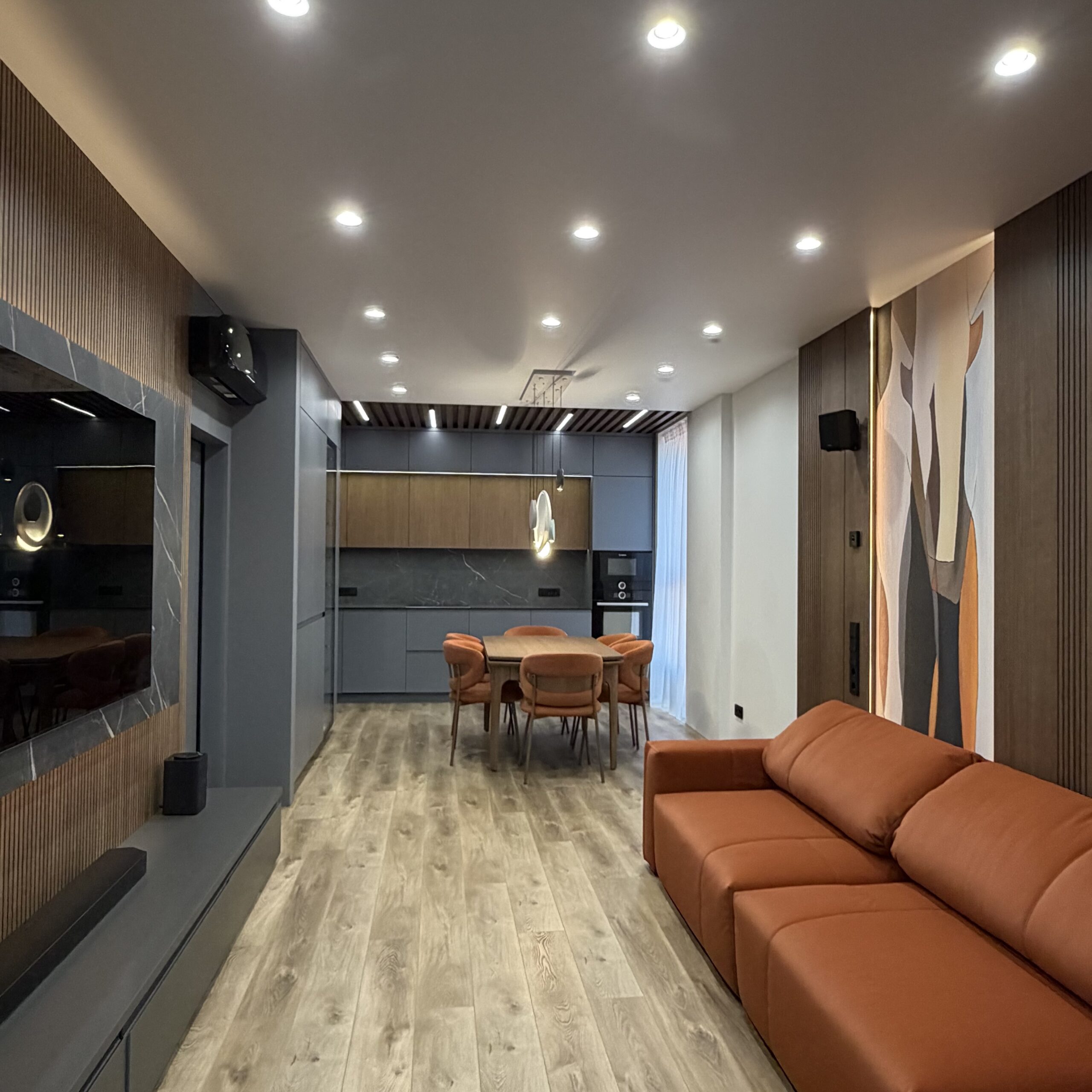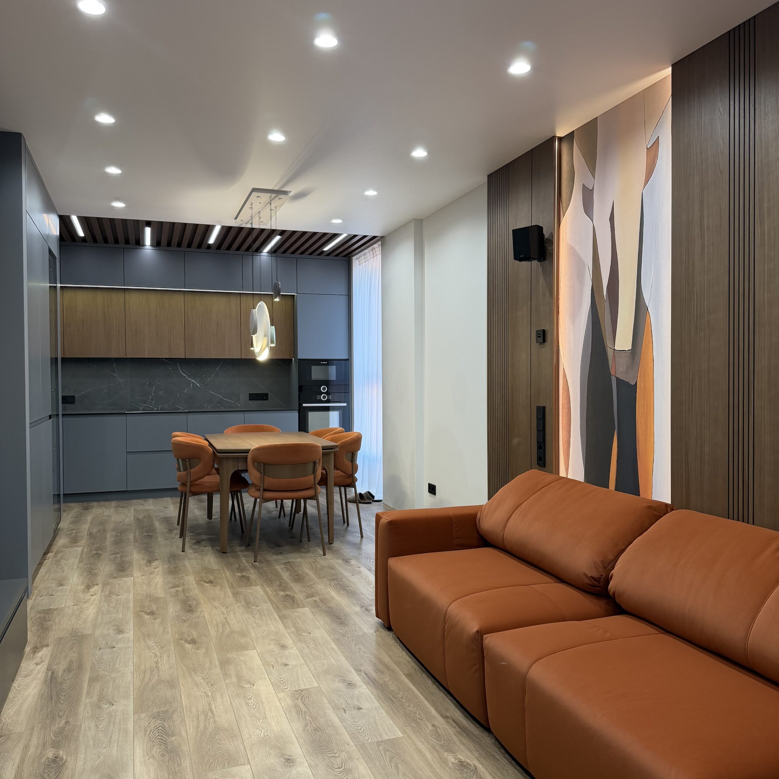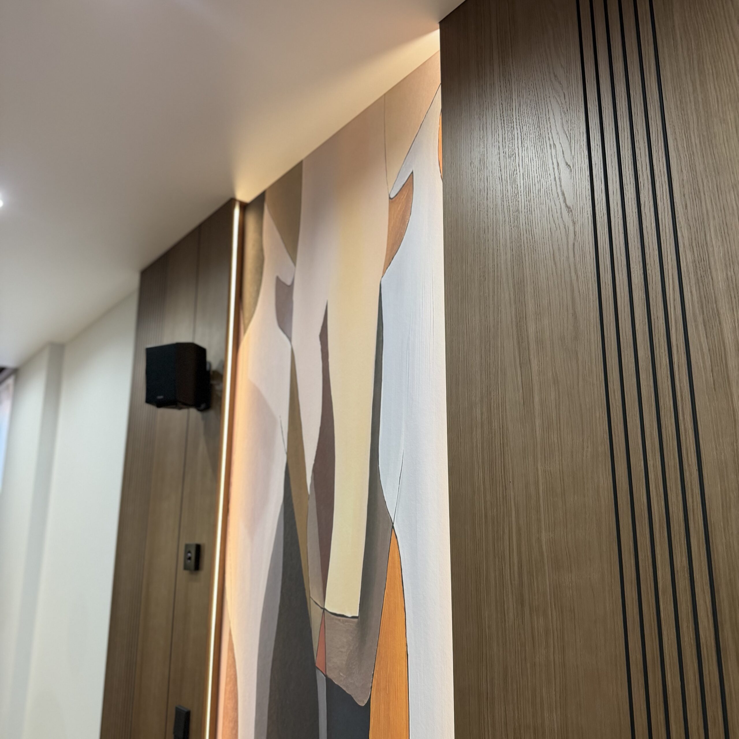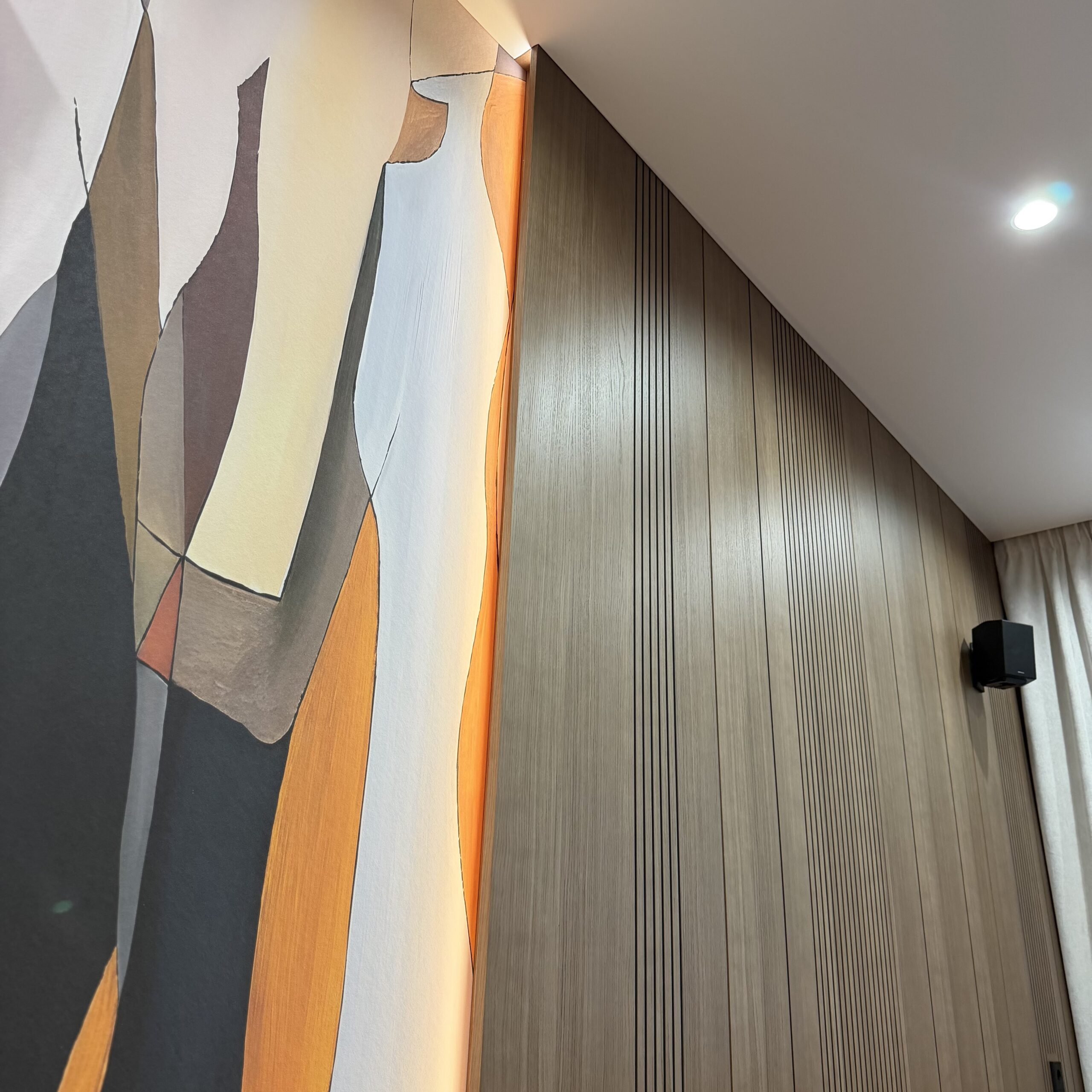 Цельная композиция, которая объединяет пространство с двух сторон. Со стороны ТВ — панель с интегрированными тумбами и витриной, со стороны дивана — продолжение в виде декоративной отделки из шпона, формирующей тёплый, спокойный фон для зоны отдыха. Всё собрано в единый объём без разрывов и лишних деталей.