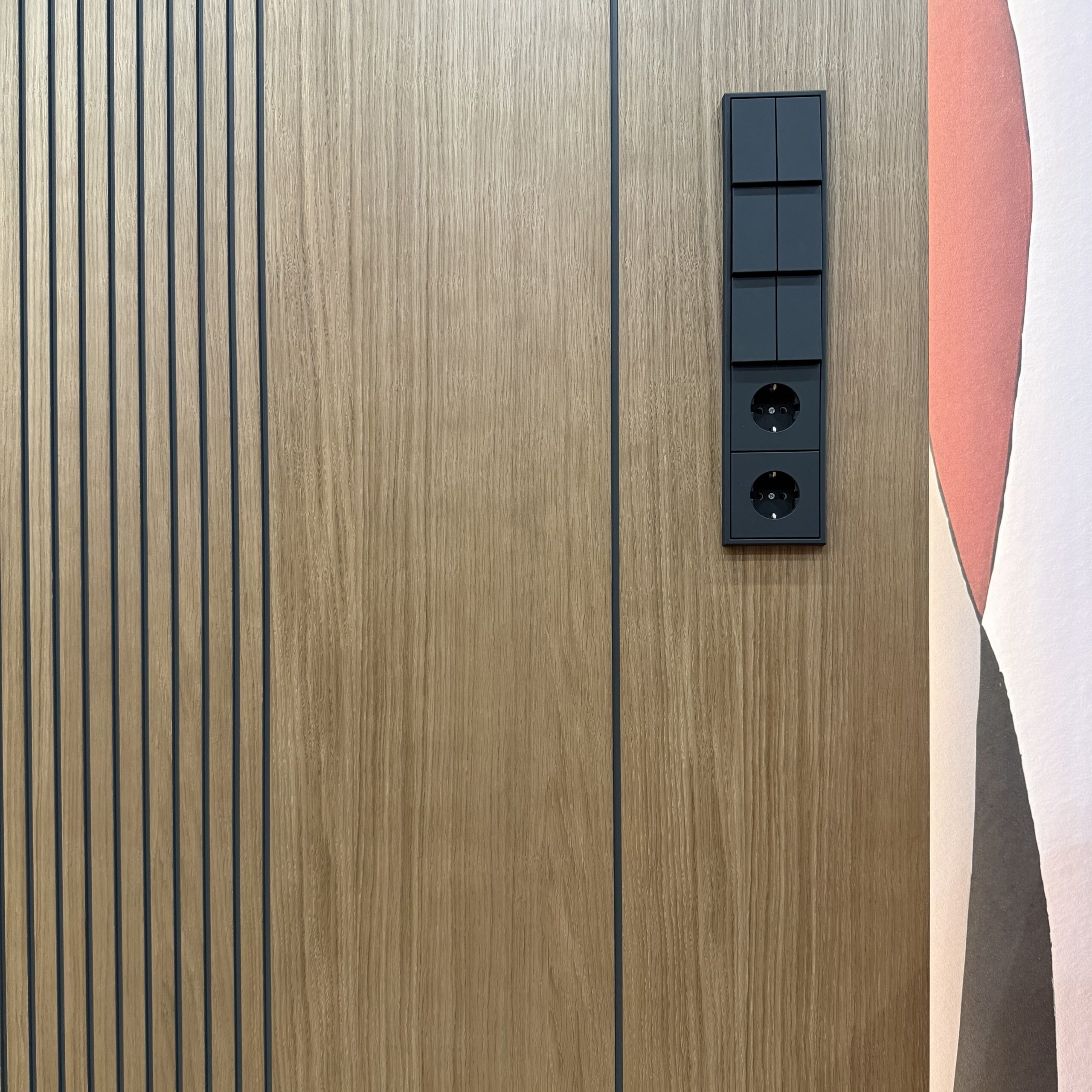 Сочетание шпона с выразительной текстурой и матовых фасадов создаёт сдержанный, дорогой контраст. Подсветка встроена в панель и мягко подчёркивает рельеф, добавляя глубину и атмосферу. Система хранения скрыта, визуально остаётся только чистота линий и цельность решения.
