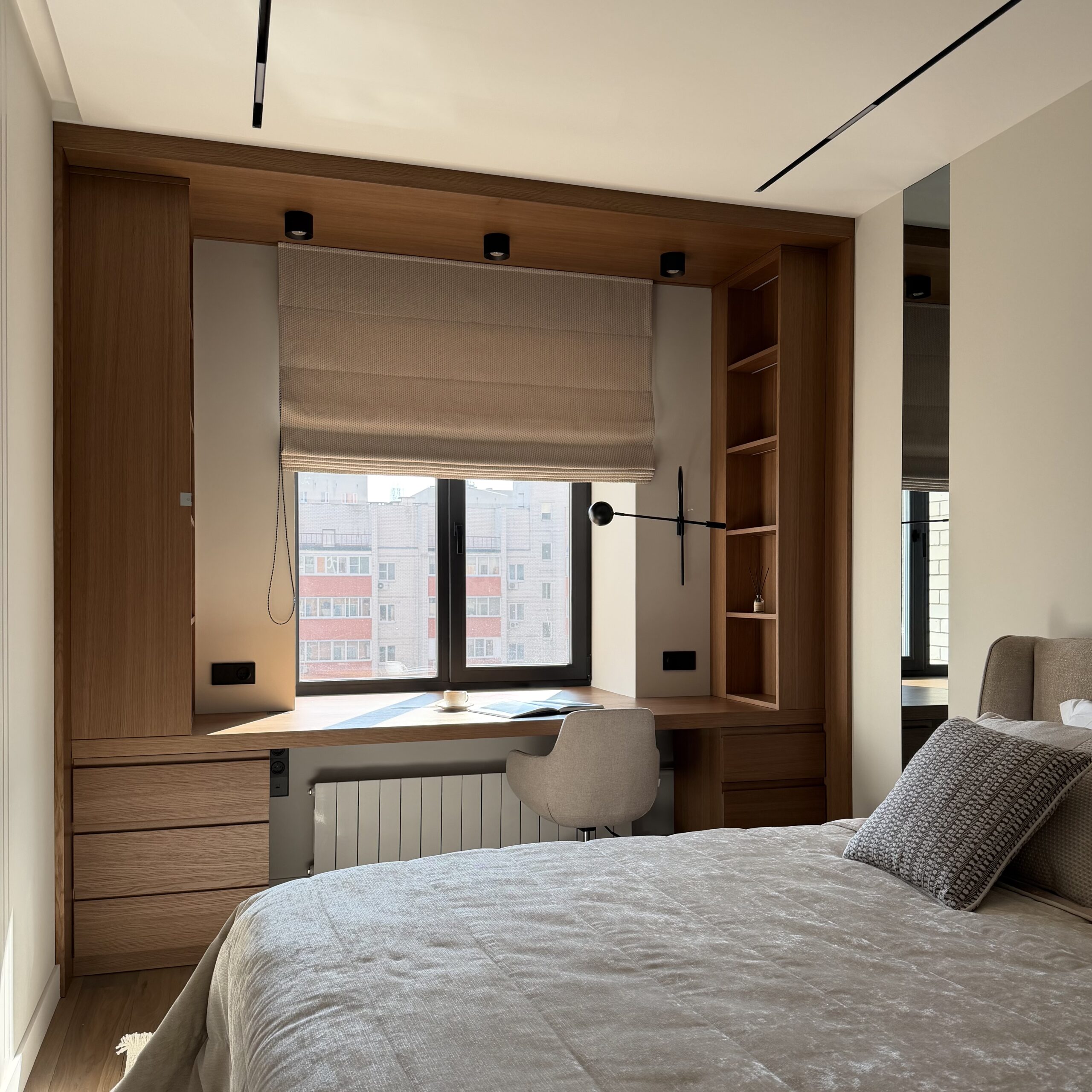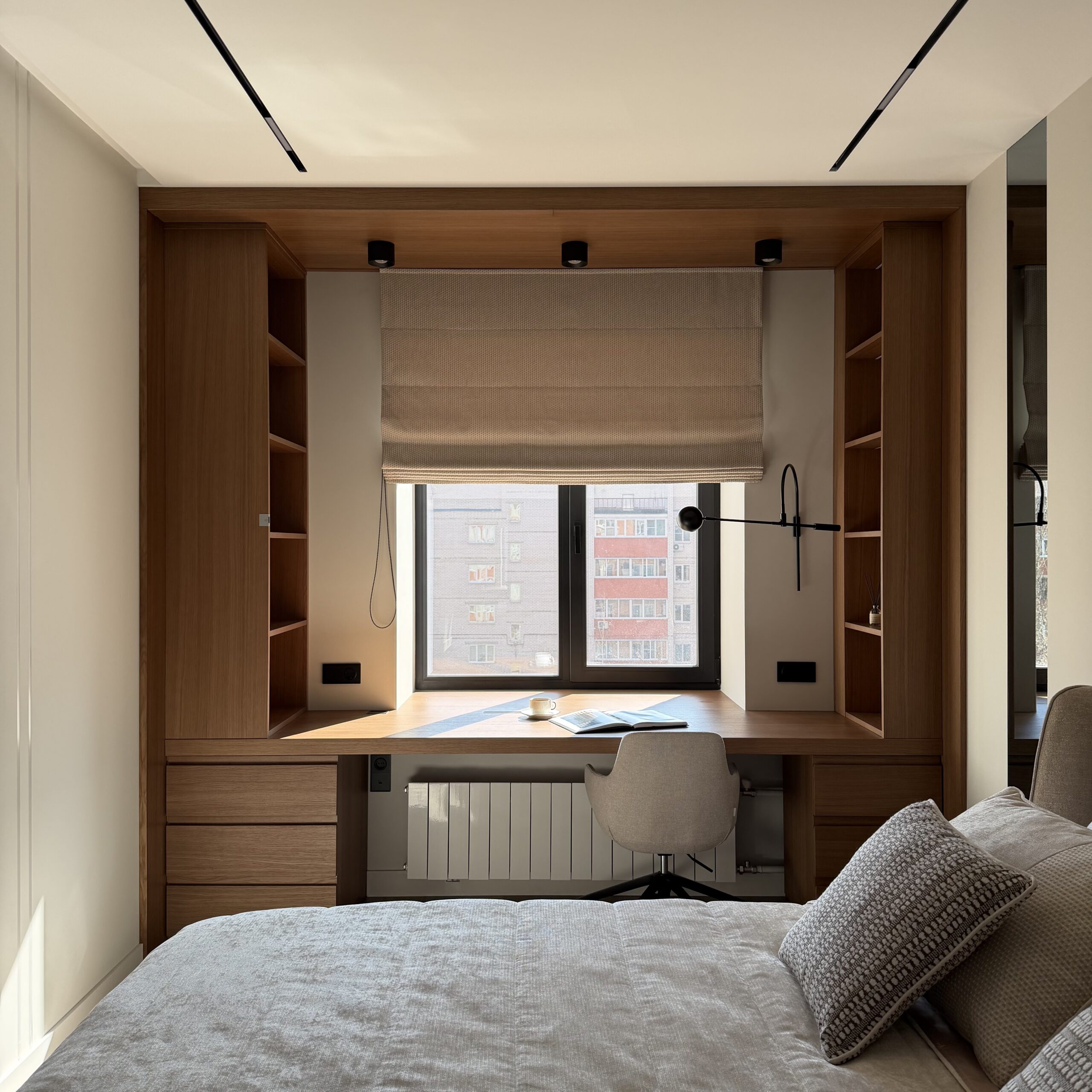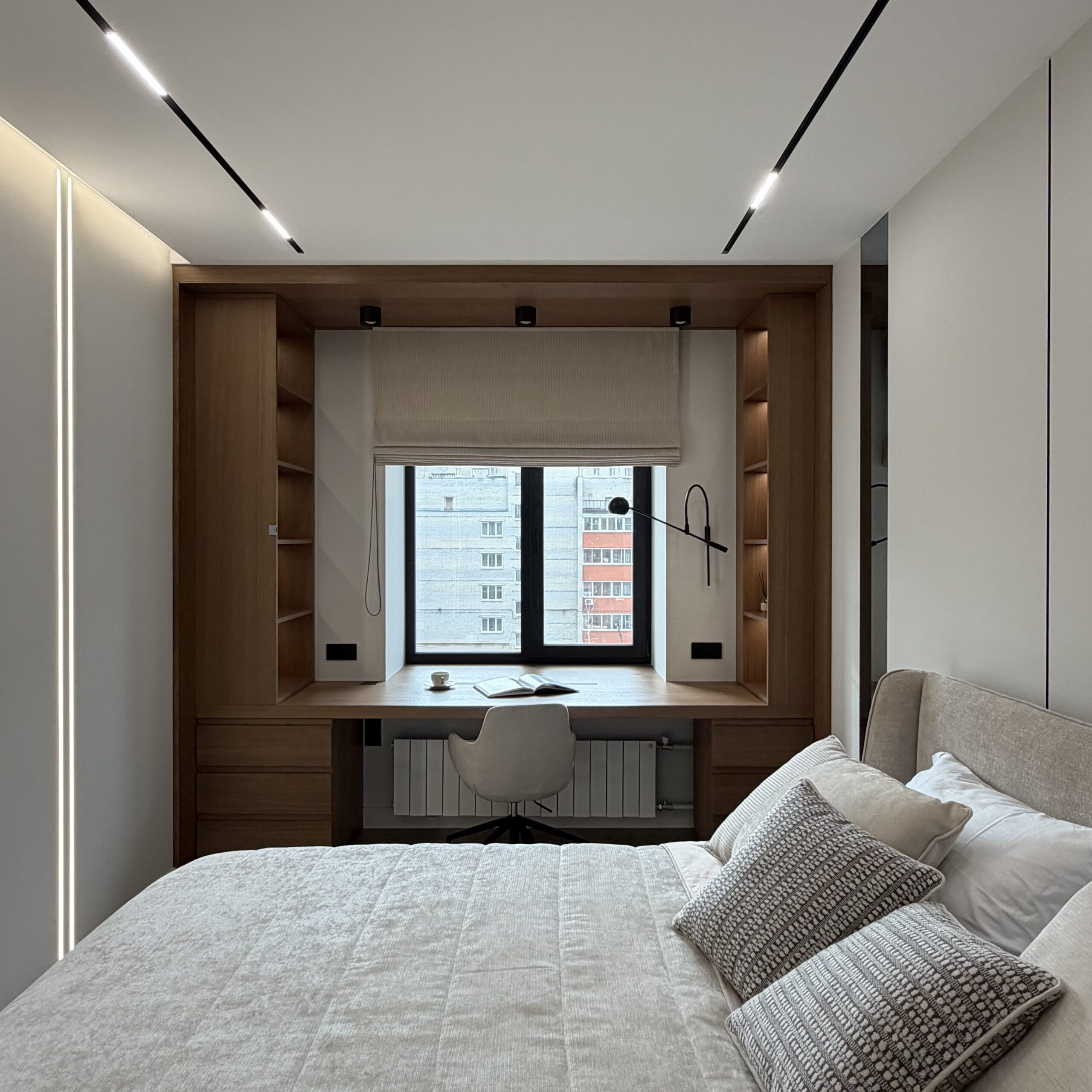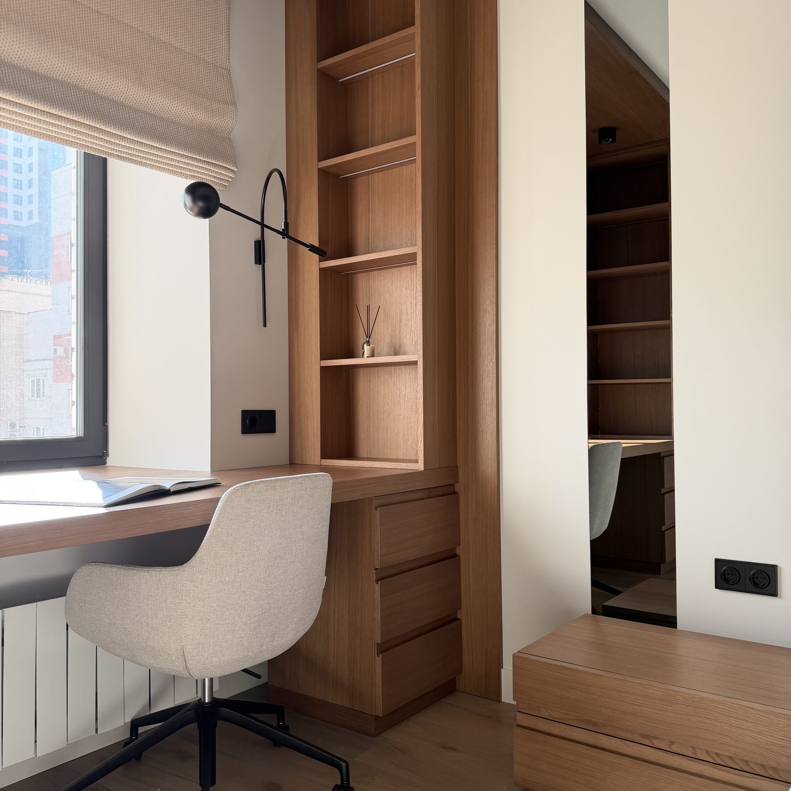 Рабочее место, интегрированное в архитектуру пространства. Стол переходит в подоконник, формируя цельную поверхность для работы и отдыха. Отделка в шпоне добавляет глубину и тепло, создавая спокойную, собранную атмосферу.