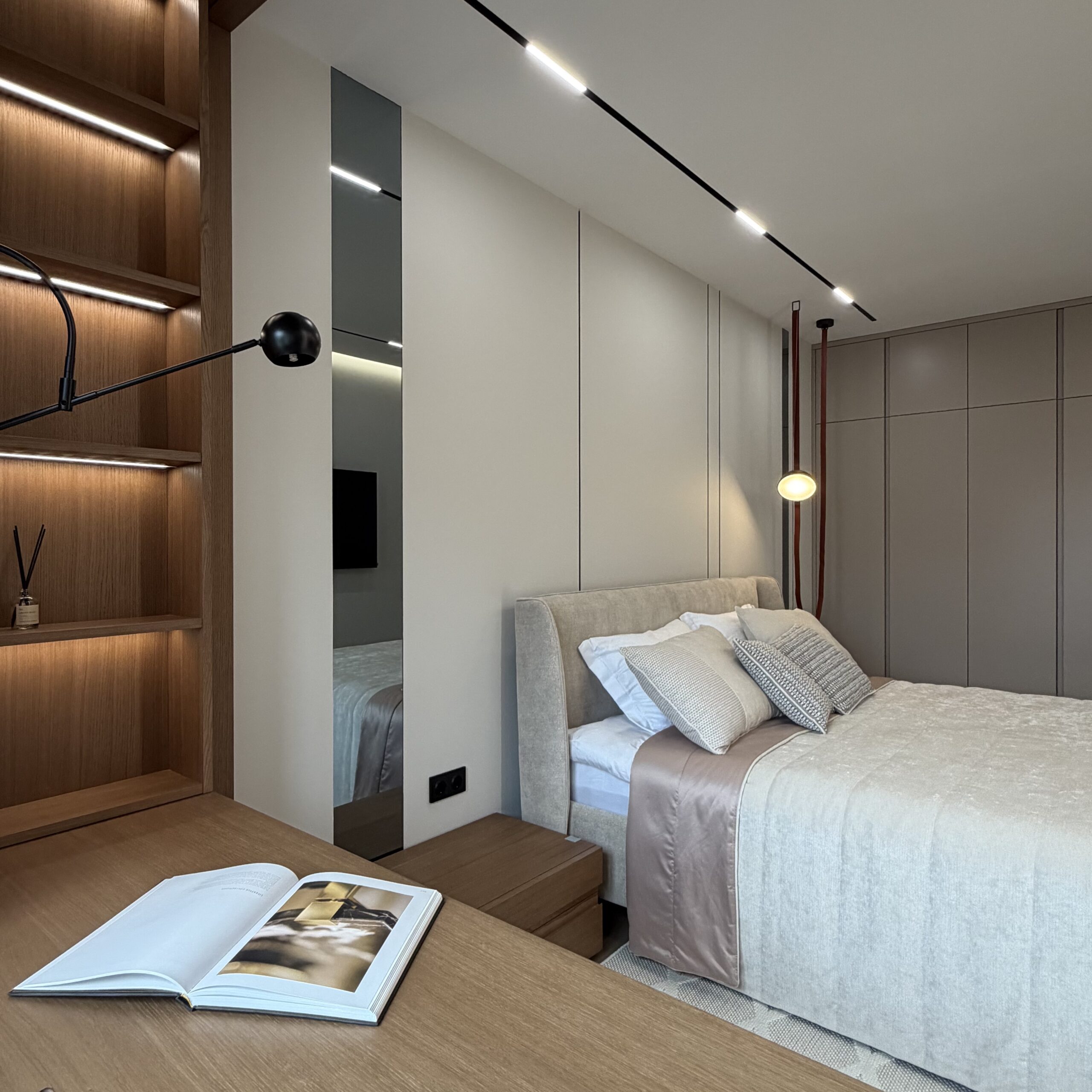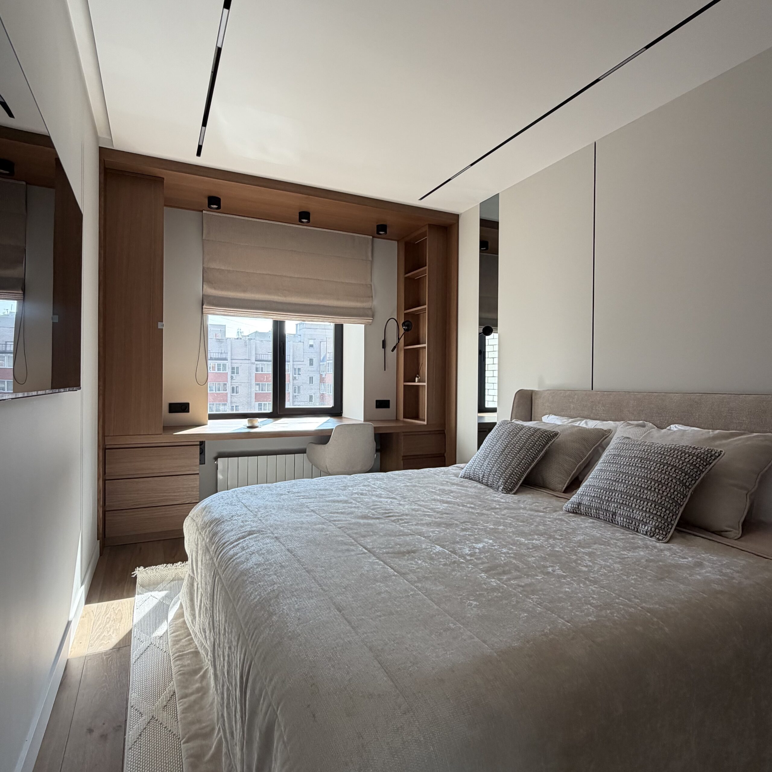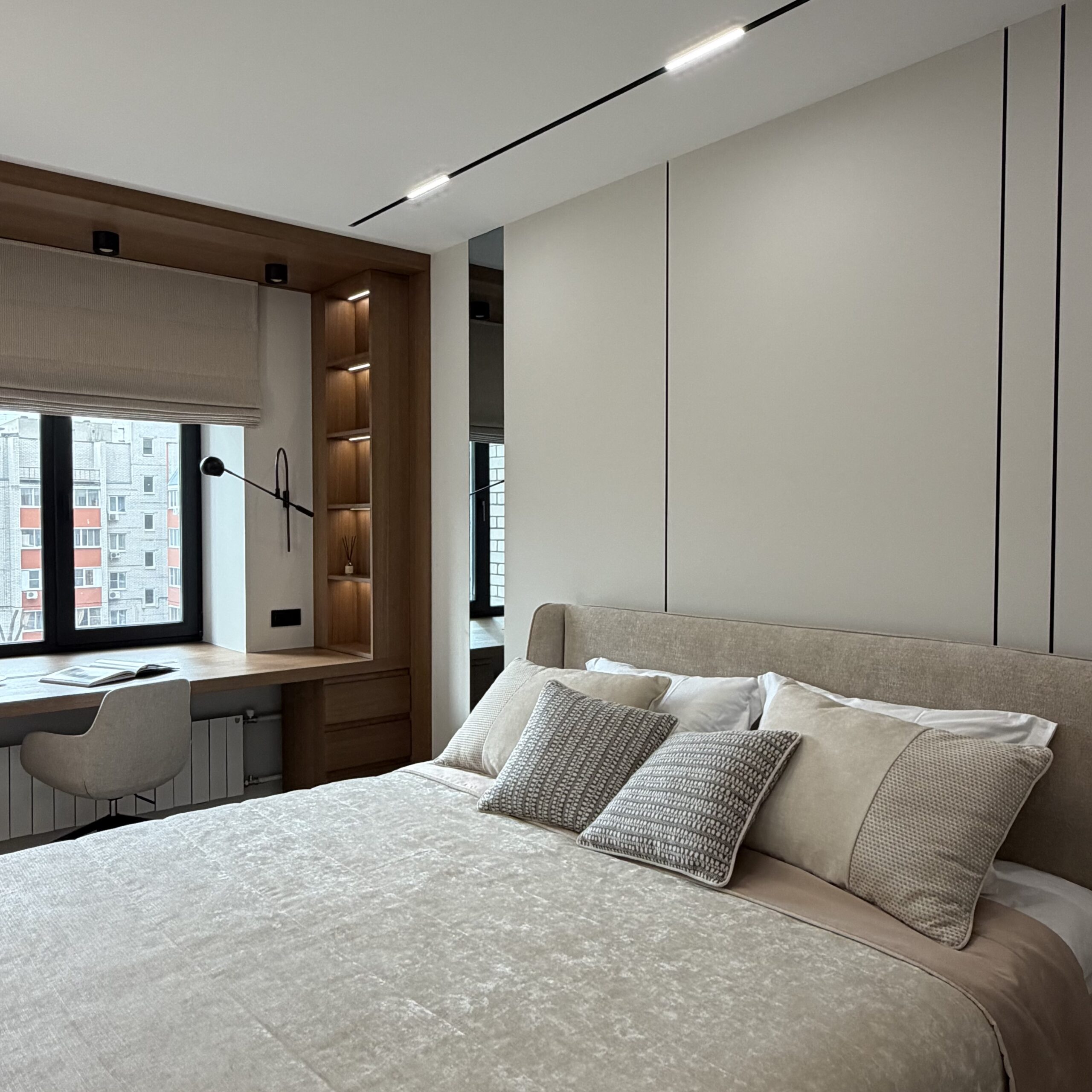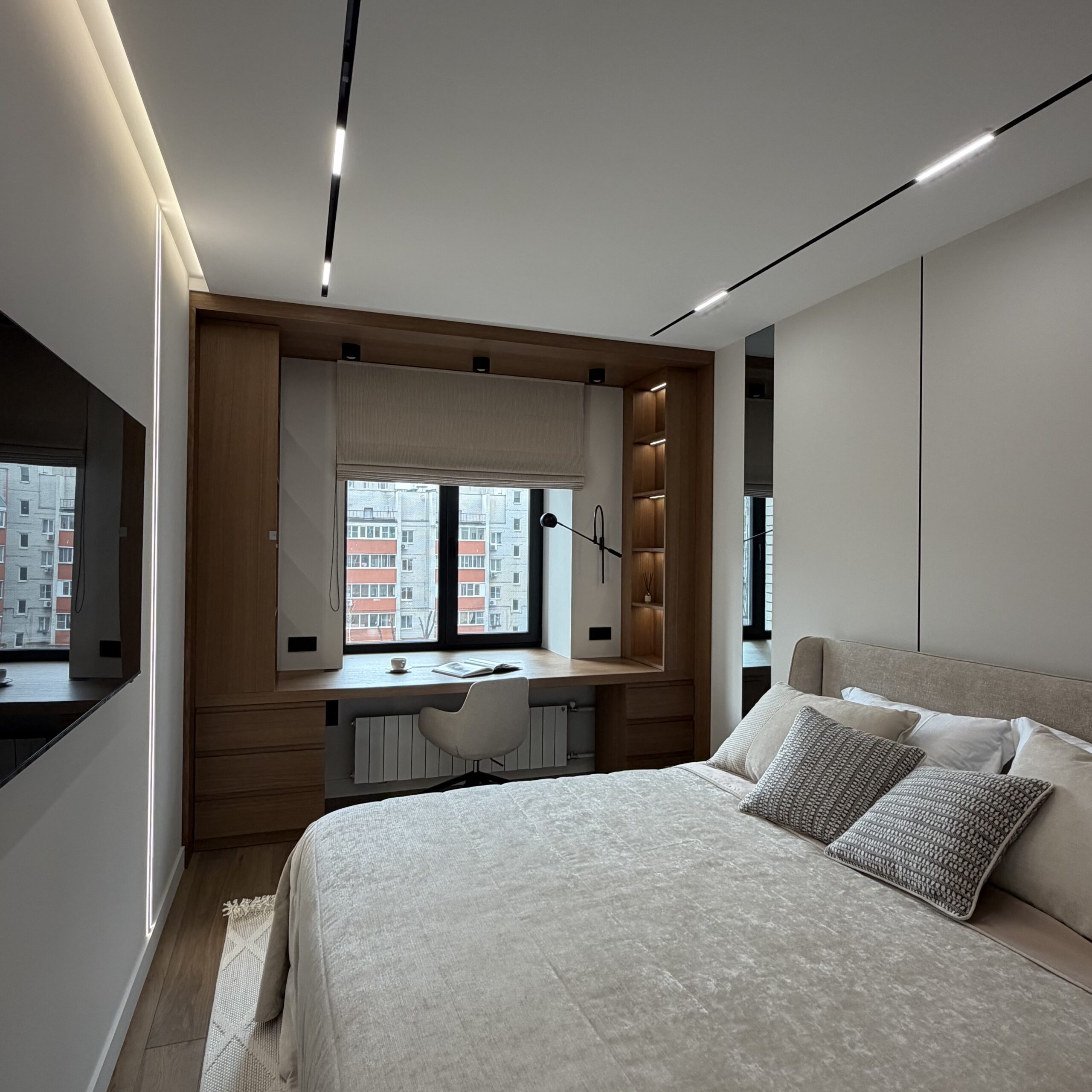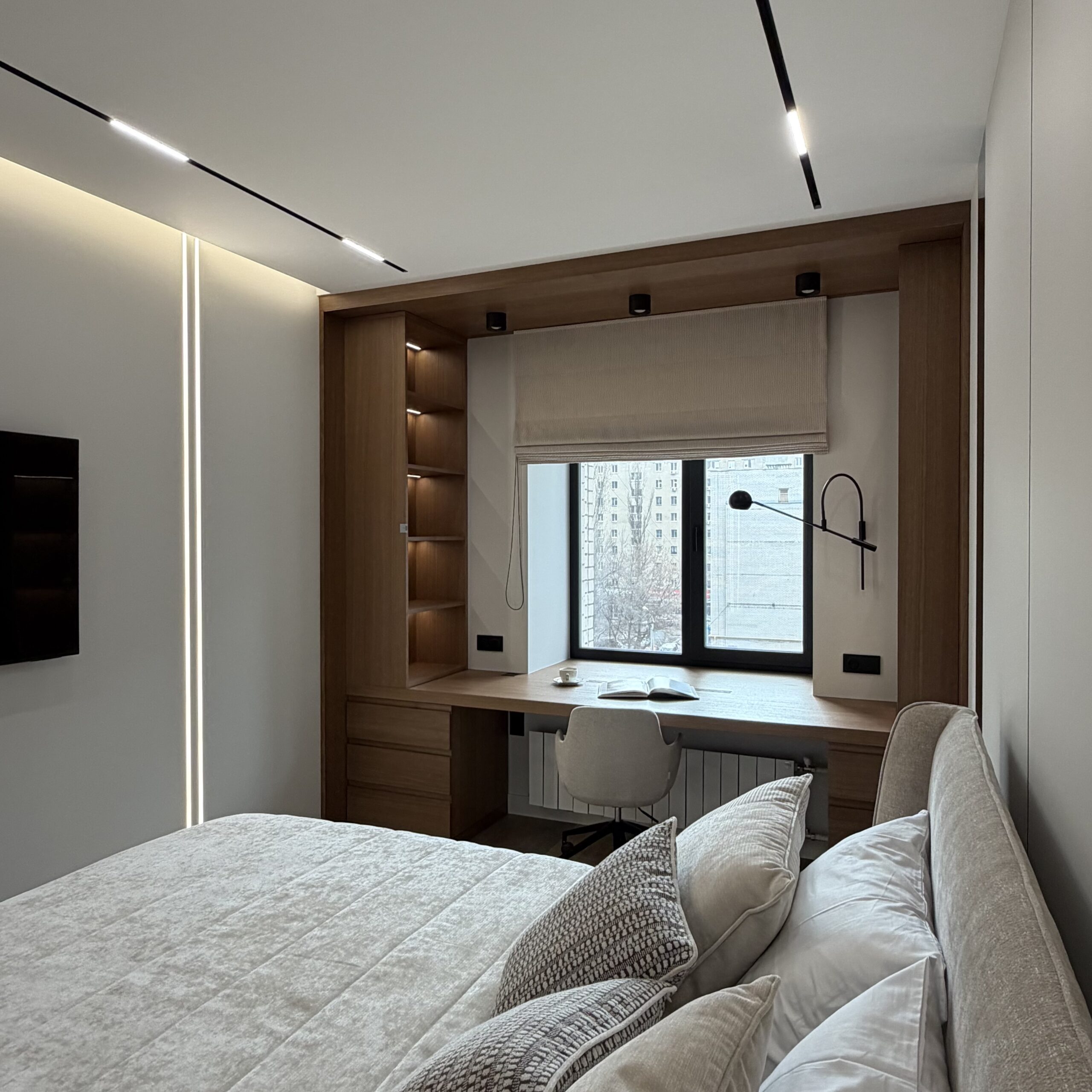 Рабочее место, интегрированное в архитектуру пространства. Стол переходит в подоконник, формируя цельную поверхность для работы и отдыха. Отделка в шпоне добавляет глубину и тепло, создавая спокойную, собранную атмосферу.