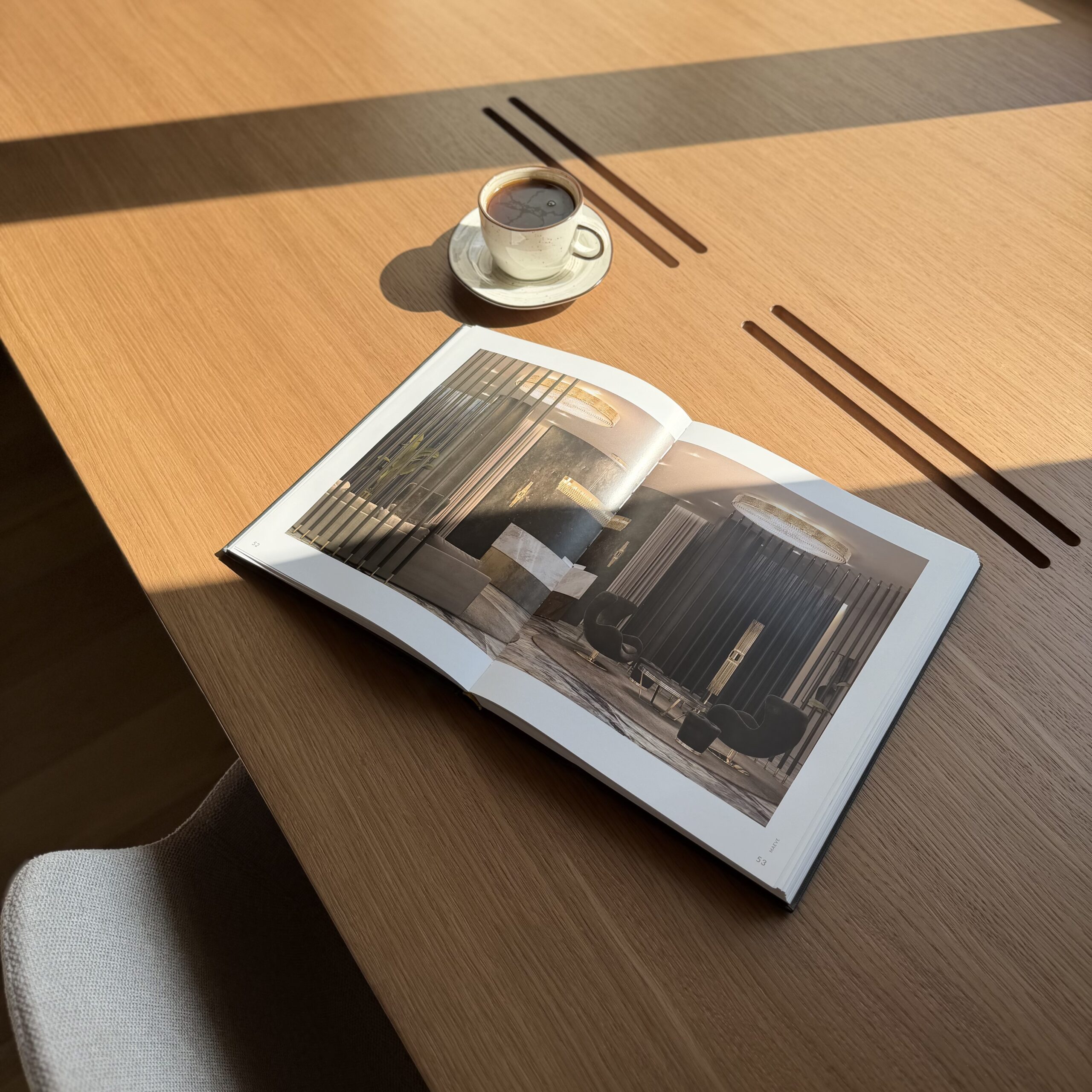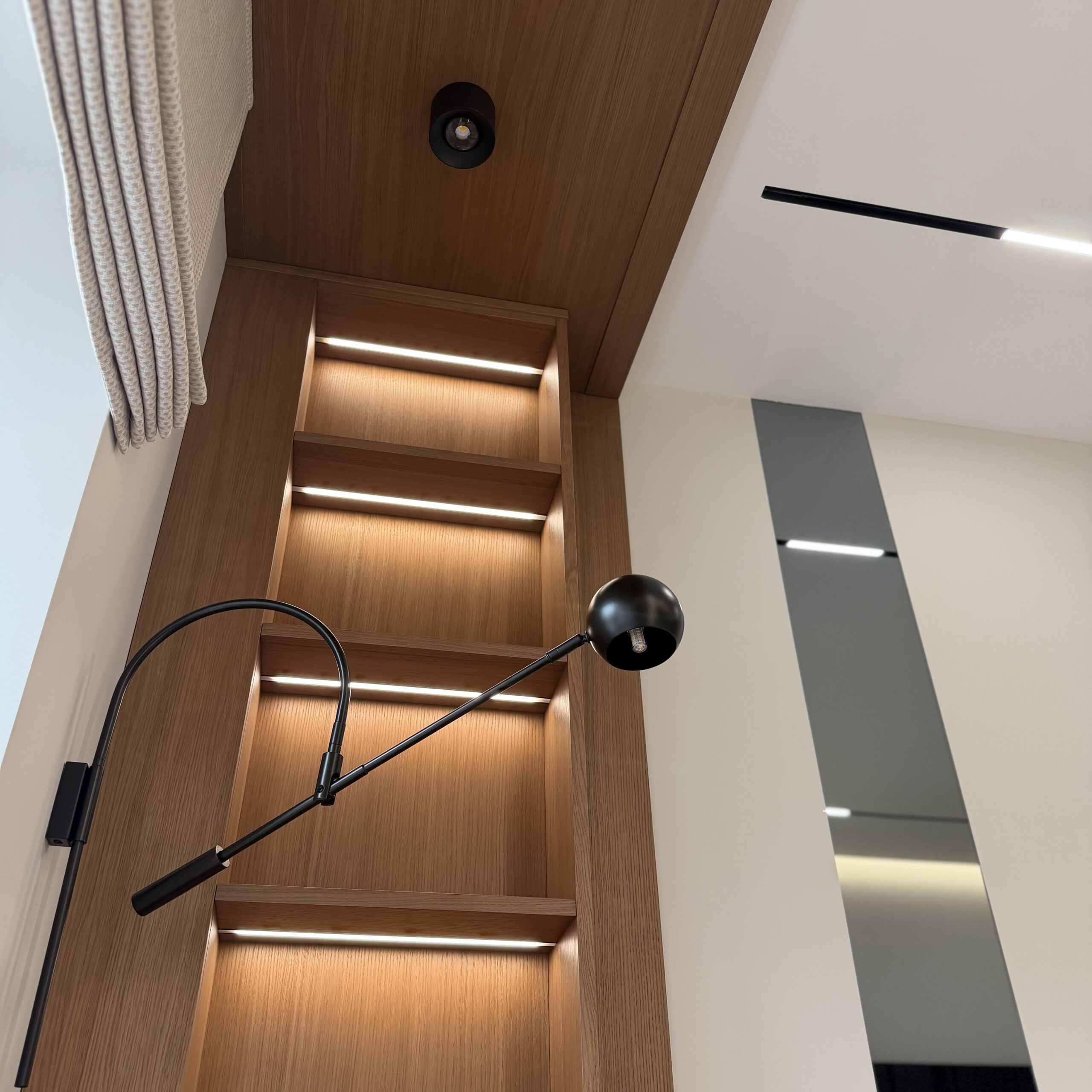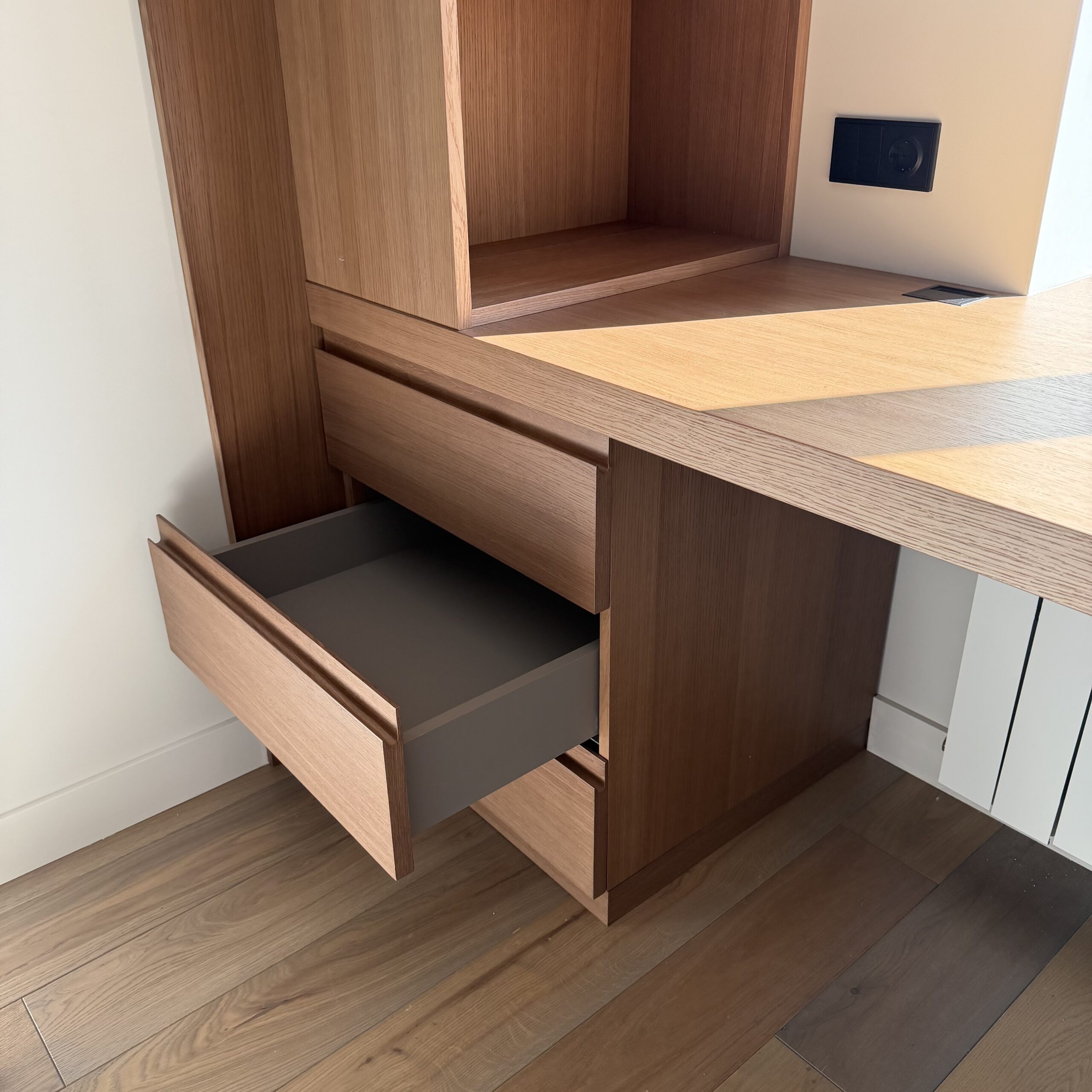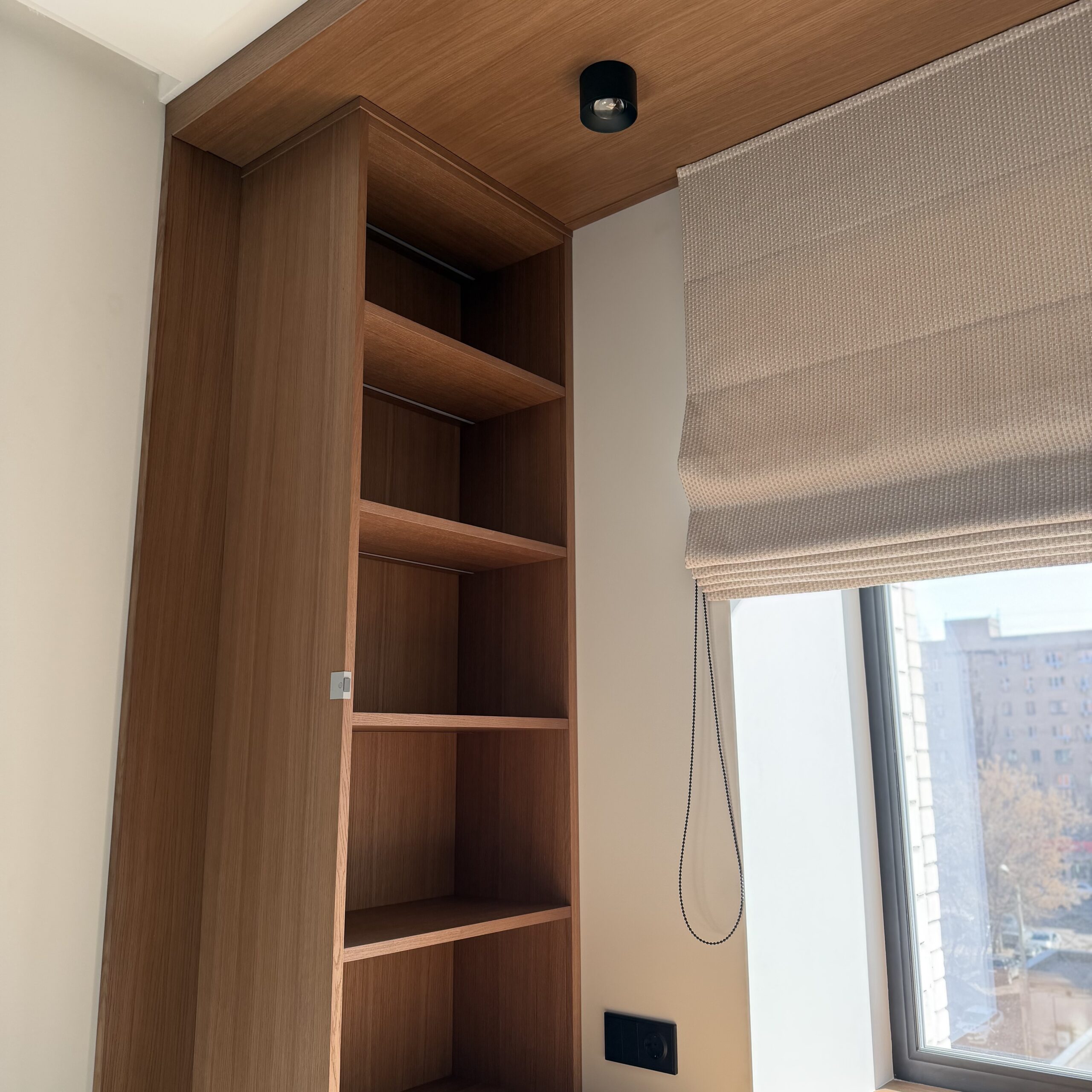 Рабочее место, интегрированное в архитектуру пространства. Стол переходит в подоконник, формируя цельную поверхность для работы и отдыха. Отделка в шпоне добавляет глубину и тепло, создавая спокойную, собранную атмосферу.
