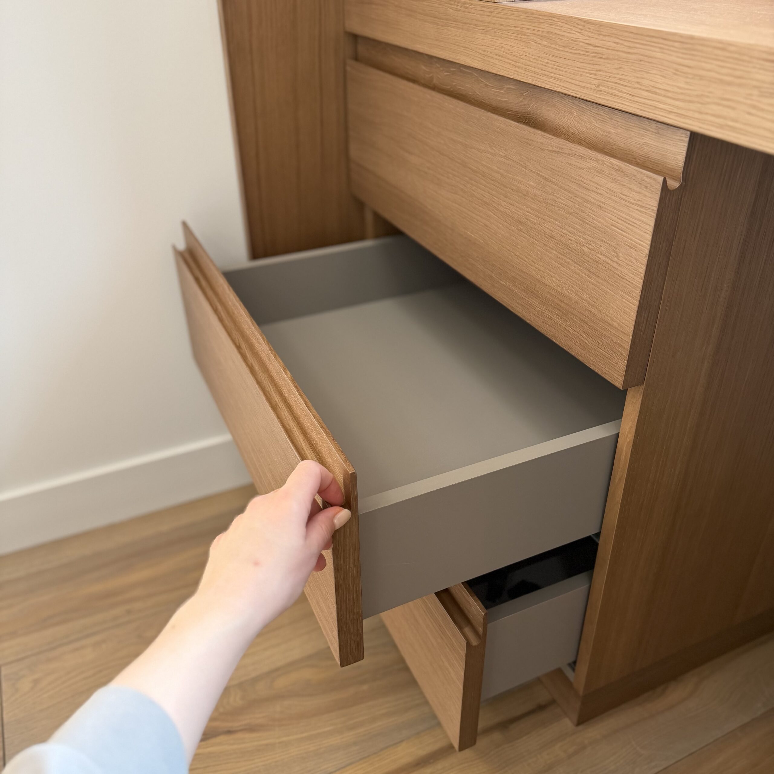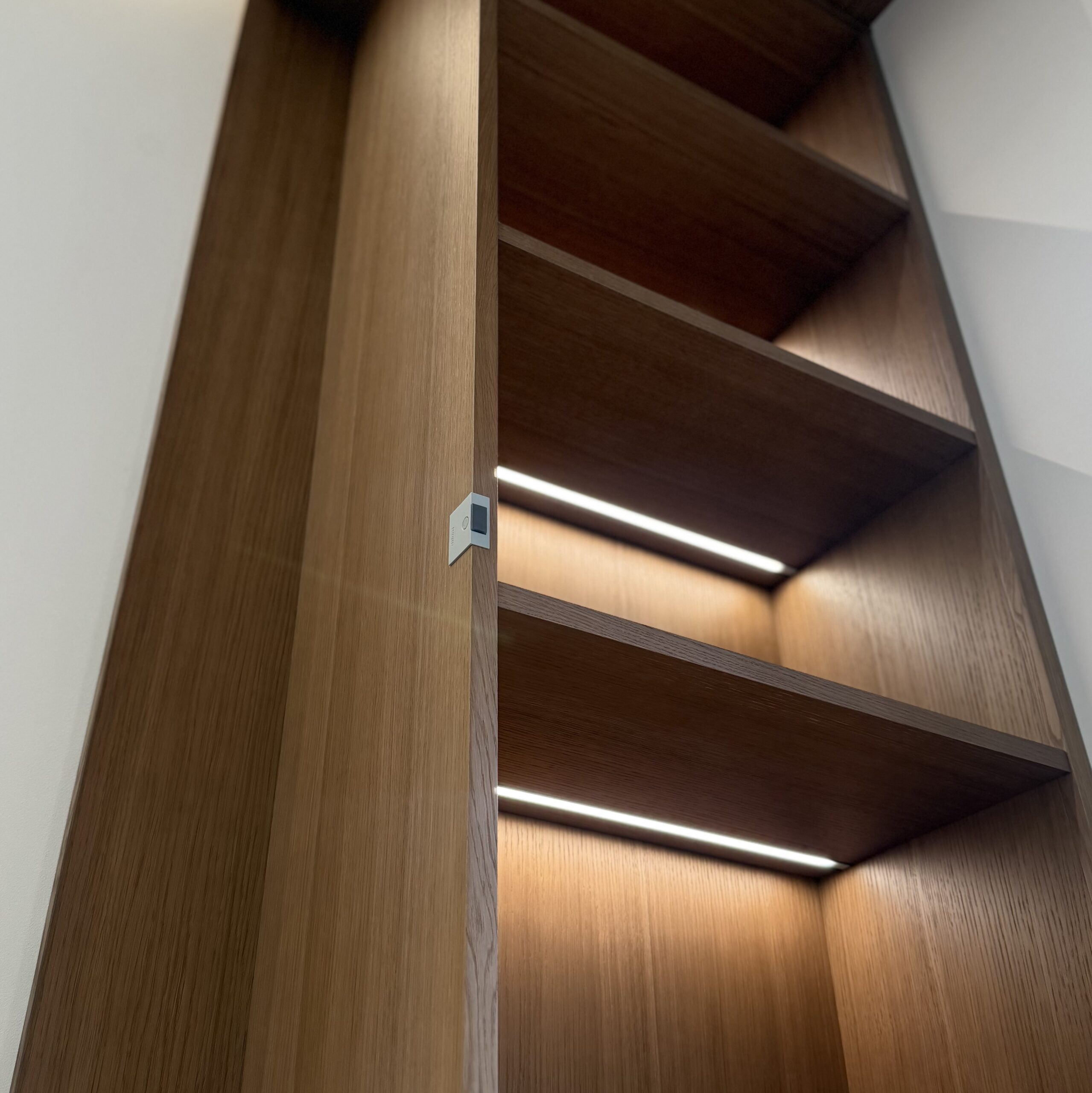 По бокам — встроенные системы хранения: открытые полки и закрытые секции для всего необходимого. Подсветка интегрирована именно в боковые полки — мягкий свет подчёркивает фактуру и добавляет глубину композиции, не отвлекая от работы. Всё организовано точно и удобно, без лишних деталей.