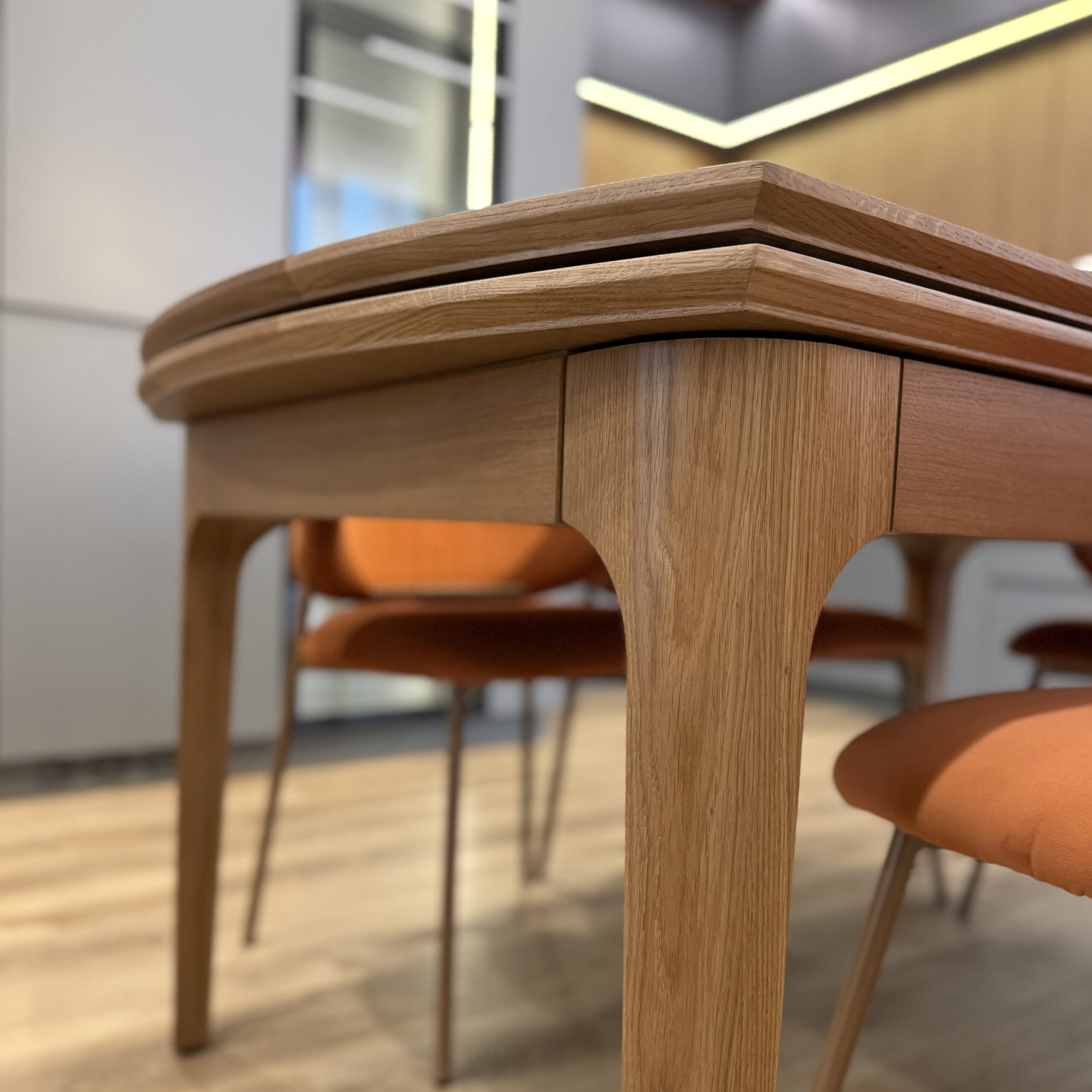 Массив дуба раскрывается в глубокой живой текстуре, которая со временем становится только выразительнее. Поверхность выглядит спокойно, ощущается основательно и уверенно держит повседневную нагрузку, сохраняя аккуратный внешний вид.