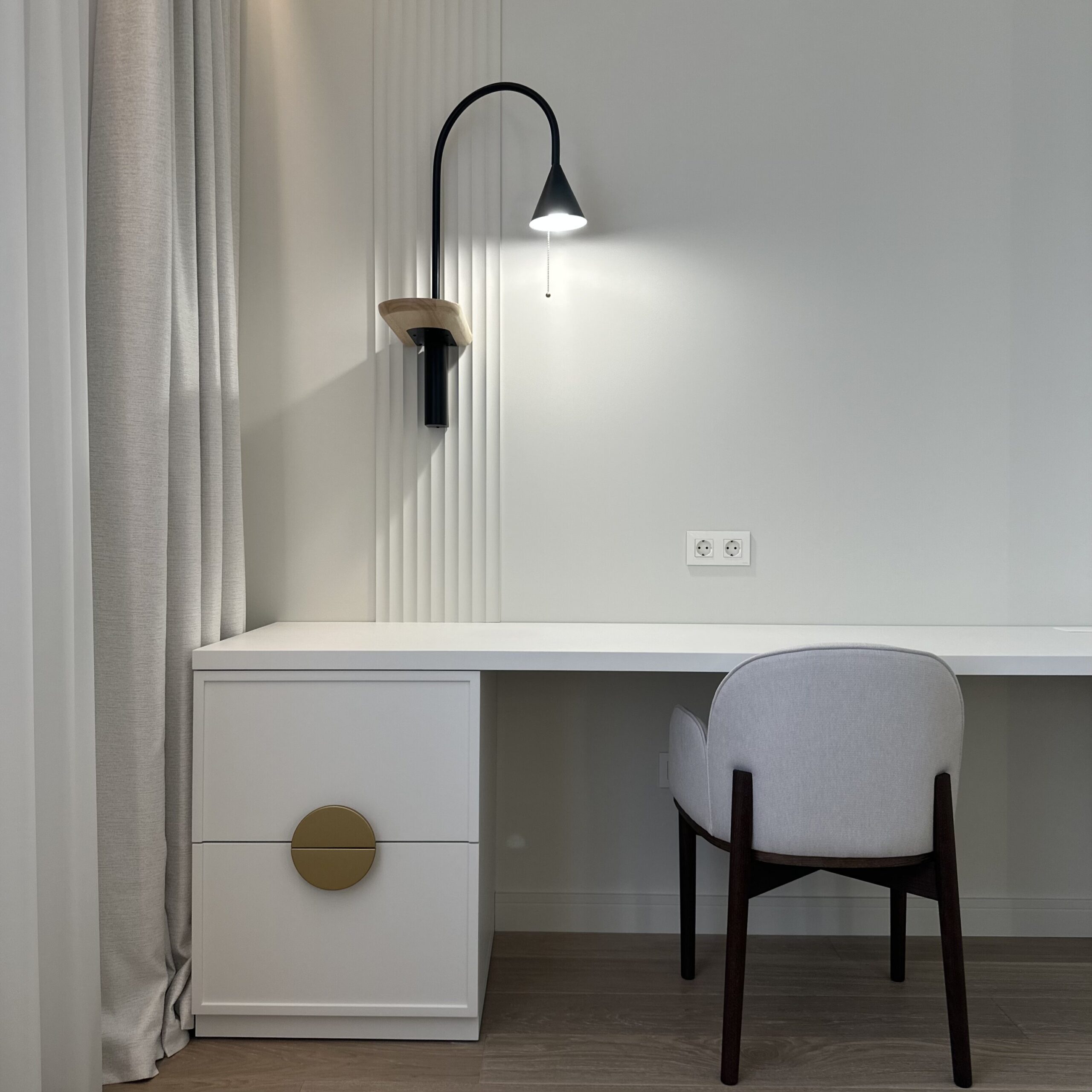 Элегантная композиция из письменного стола и шкафа создаёт идеальное рабочее пространство, где каждая деталь продумана до мельчайших нюансов. Изящные фасады с деликатной рамкой и утончённой фрезеровкой наполняют интерьер лёгкостью и воздушностью, а современное исполнение придаёт ансамблю современный характер. Встроенная подсветка, мягко очерчивающая контуры мебели, создаёт атмосферу уюта и способствует комфортной работе в любое время суток. Практичные ниши и продуманные системы хранения обеспечивают удобное размещение всех необходимых предметов, от канцелярских принадлежностей до творческих материалов.