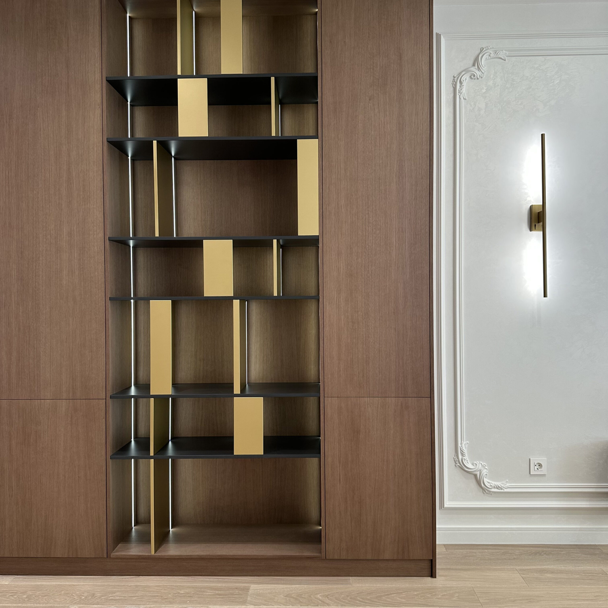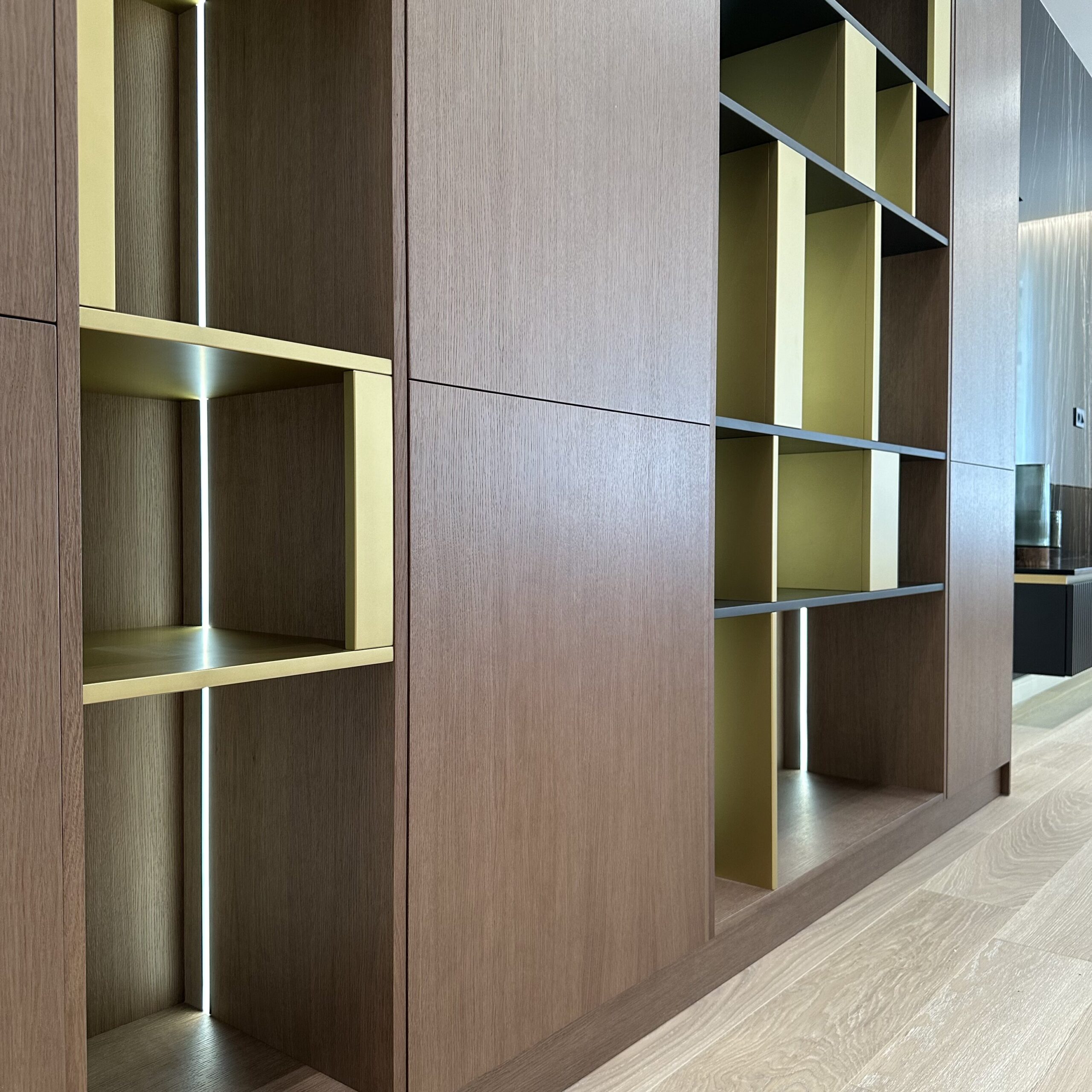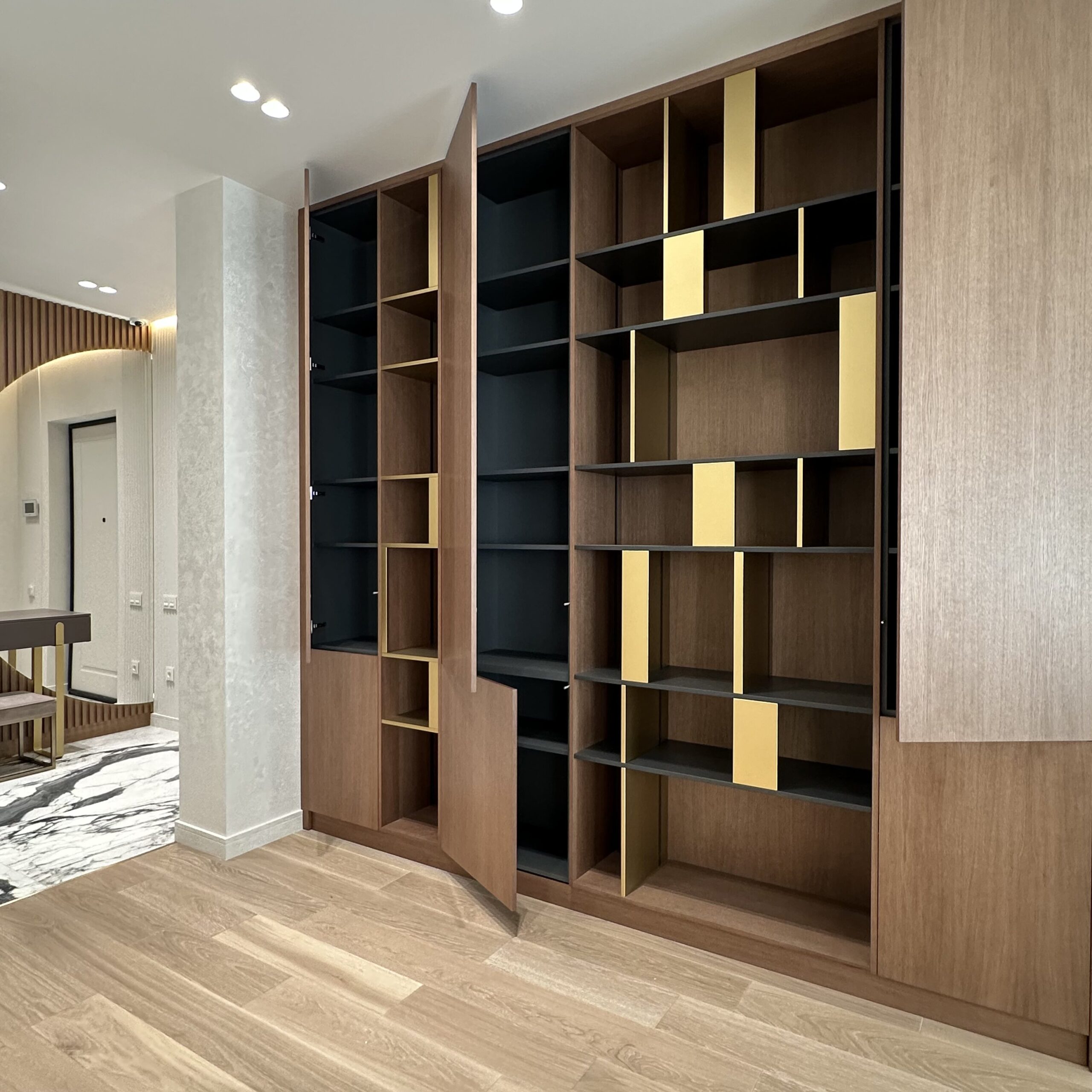 Благородный шкаф со шпонированными фасадами представляет собой настоящее произведение мебельного искусства, где каждая деталь продумана до мелочей. Гармоничное сочетание натуральных текстур шпона и открытых полок создаёт уникальную игру света и тени, наполняя пространство особой атмосферой уюта и элегантности. Особого внимания заслуживают изящные латунные вставки, которые не просто выполняют декоративную функцию, но и становятся настоящим украшением композиции, придавая ей элегантный характер и утончённую роскошь.