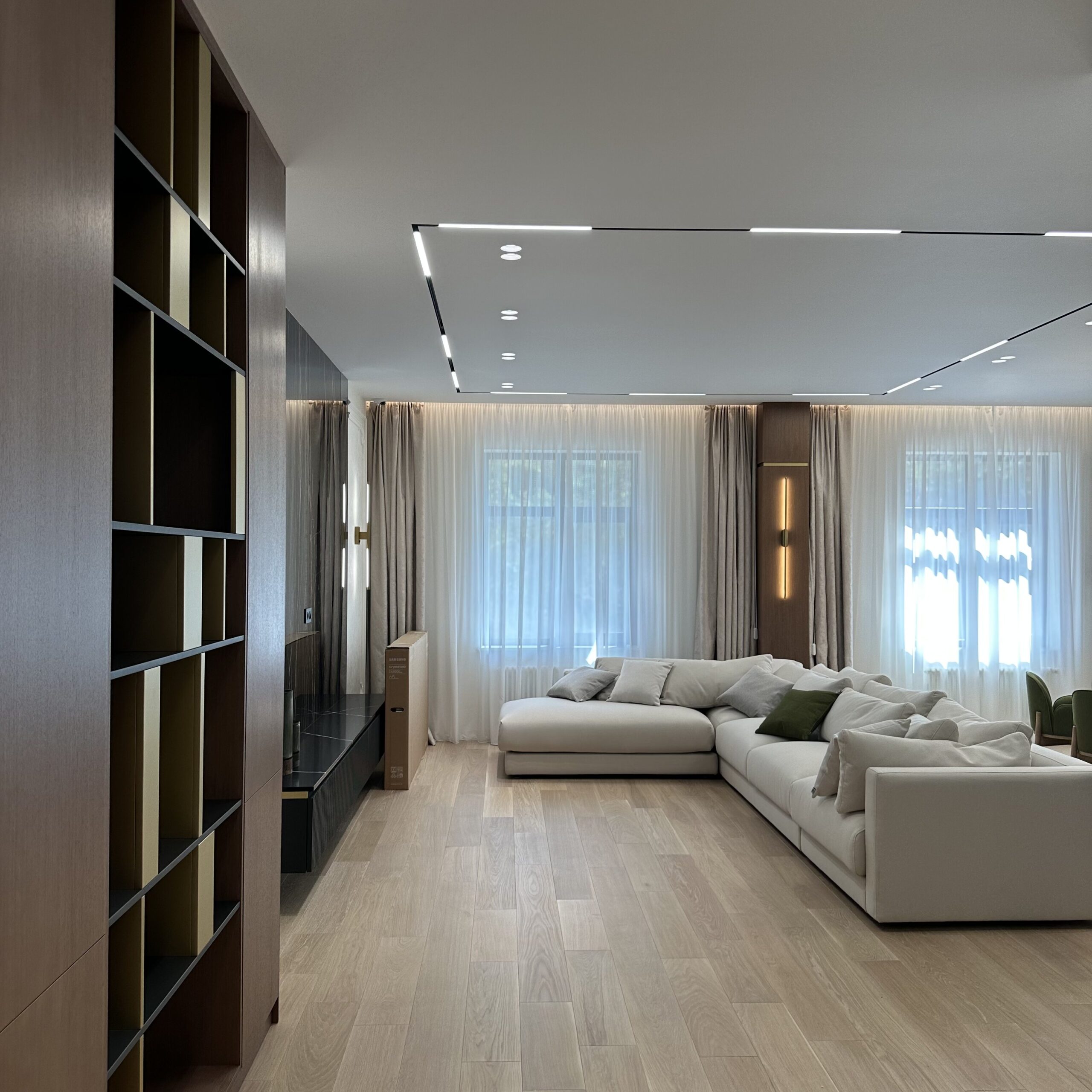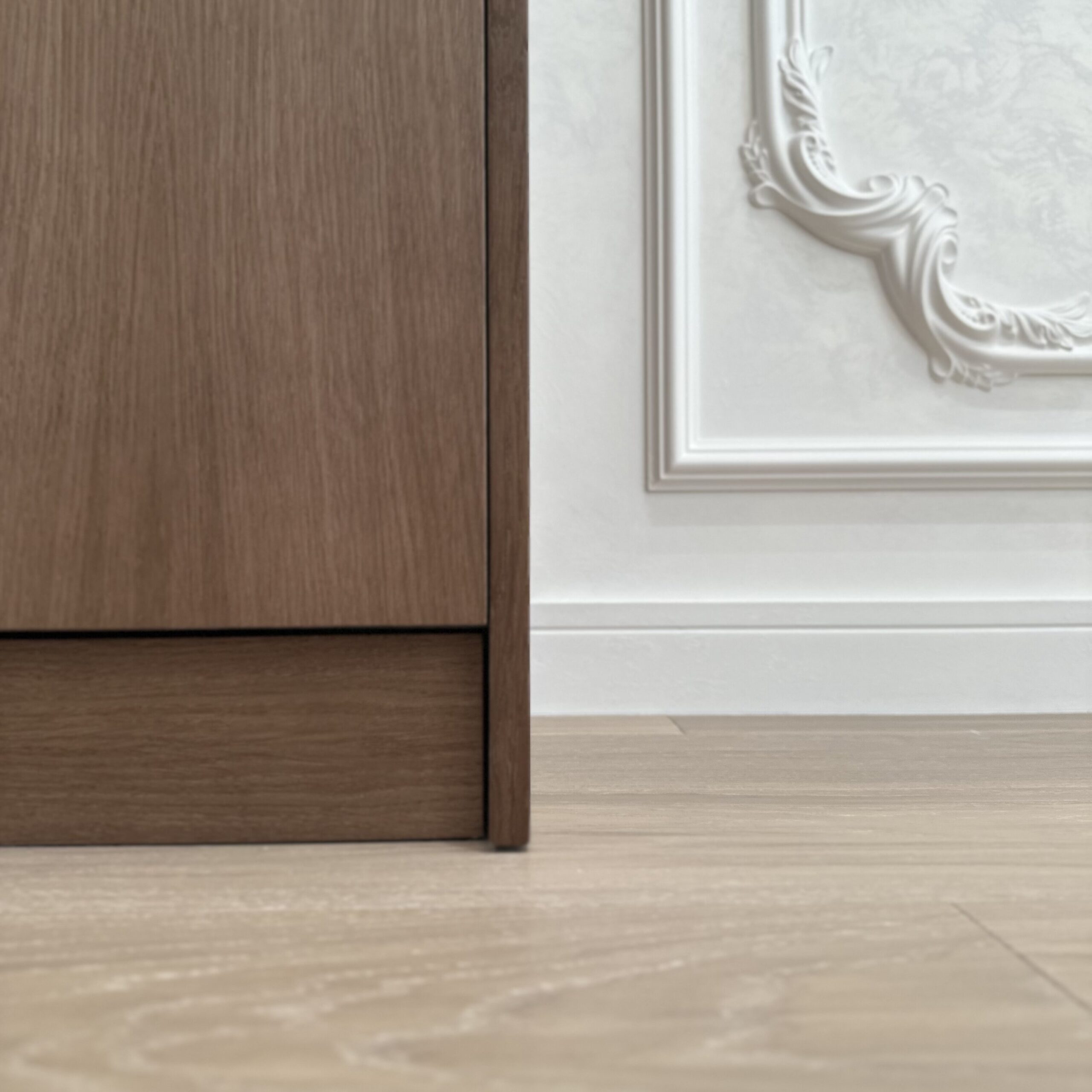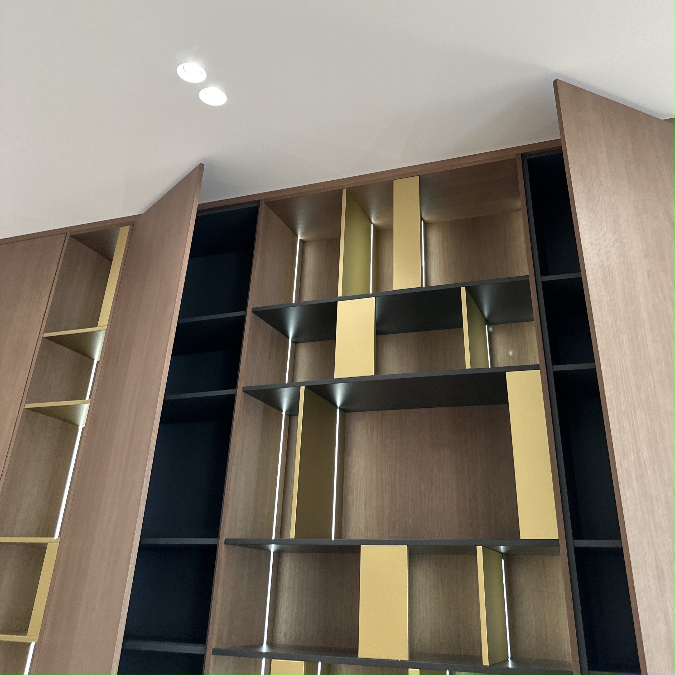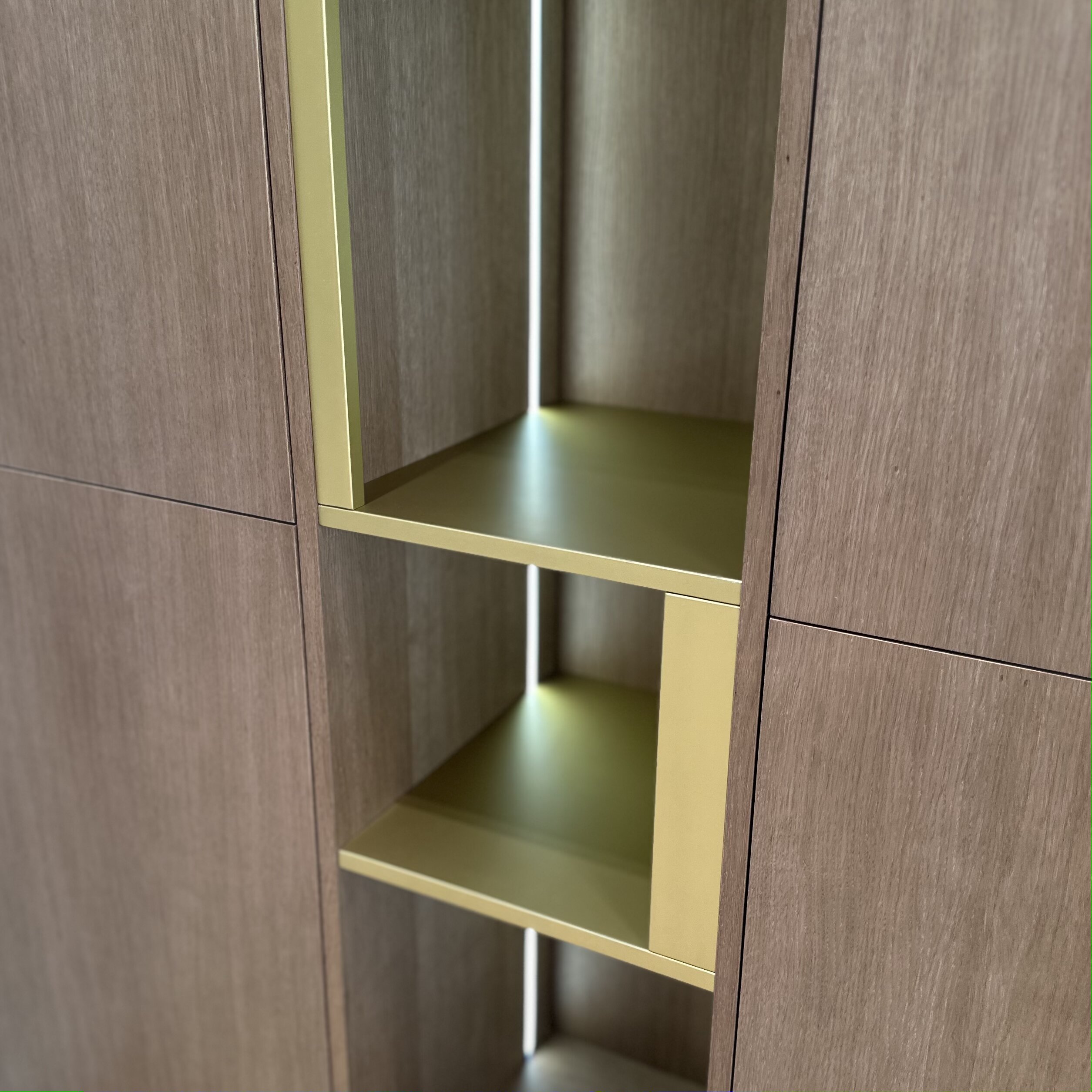 Благородный шкаф со шпонированными фасадами представляет собой настоящее произведение мебельного искусства, где каждая деталь продумана до мелочей. Гармоничное сочетание натуральных текстур шпона и открытых полок создаёт уникальную игру света и тени, наполняя пространство особой атмосферой уюта и элегантности. Особого внимания заслуживают изящные латунные вставки, которые не просто выполняют декоративную функцию, но и становятся настоящим украшением композиции, придавая ей элегантный характер и утончённую роскошь.